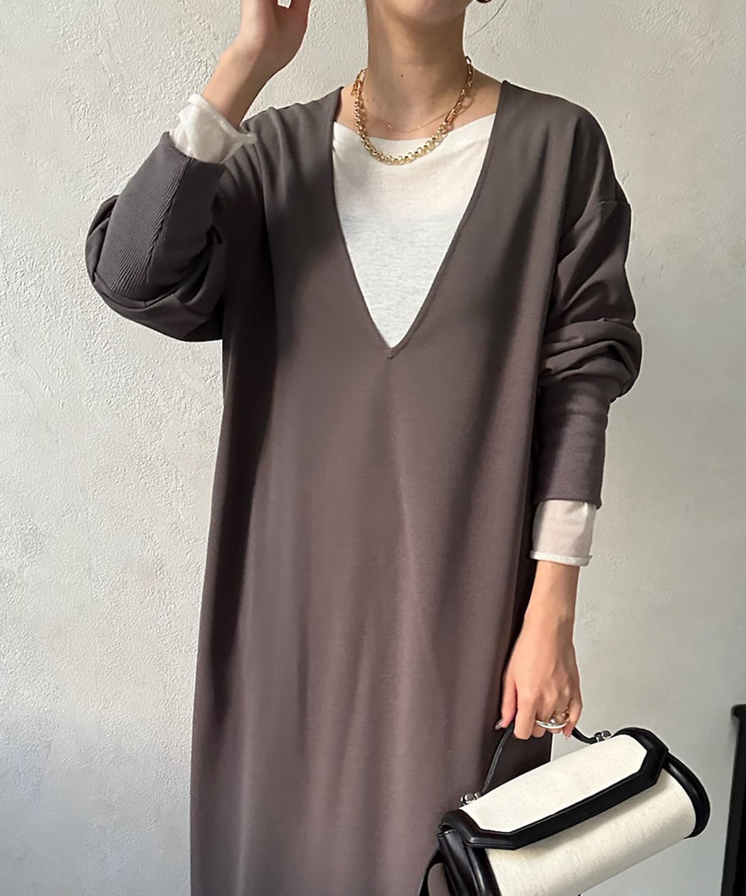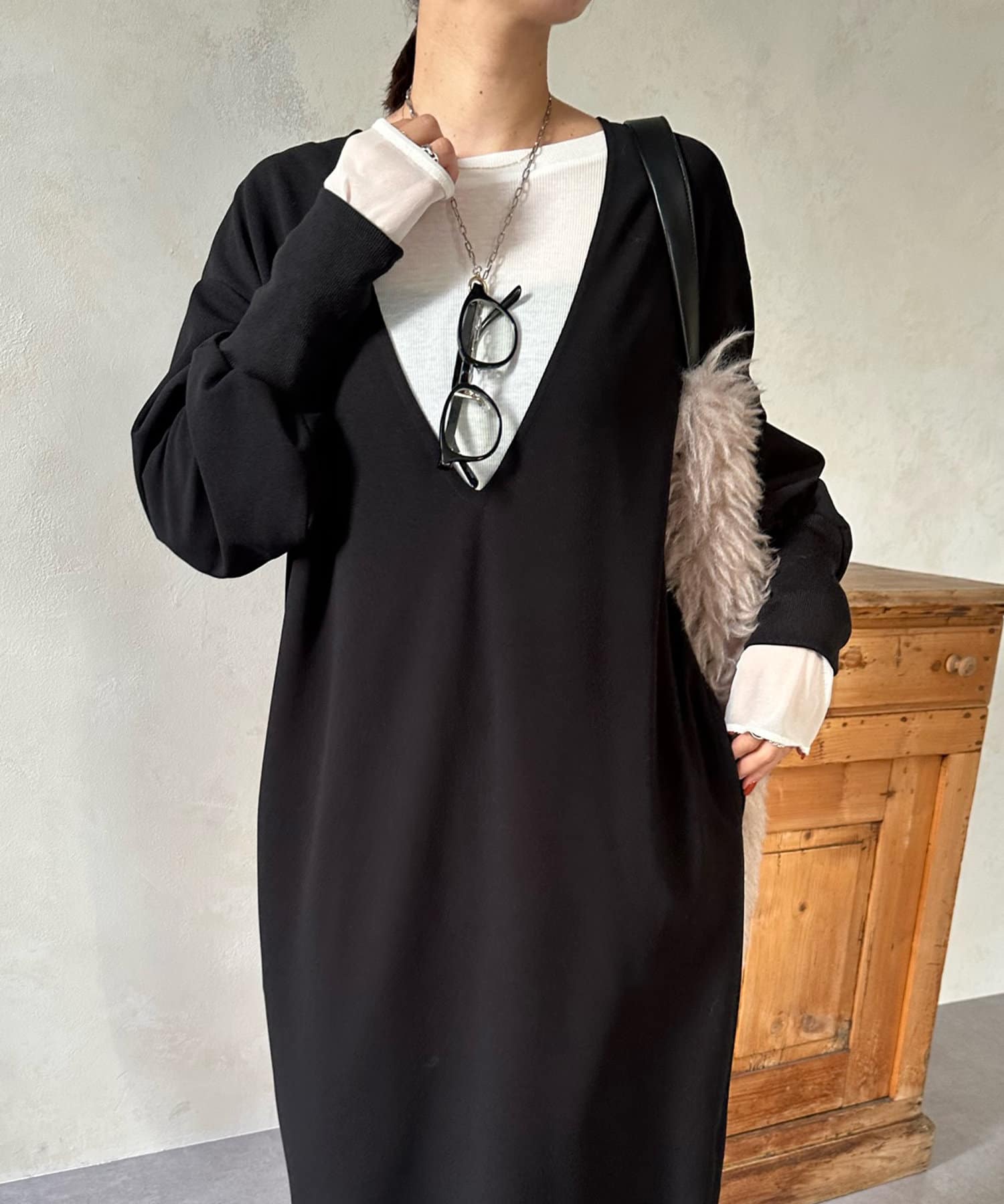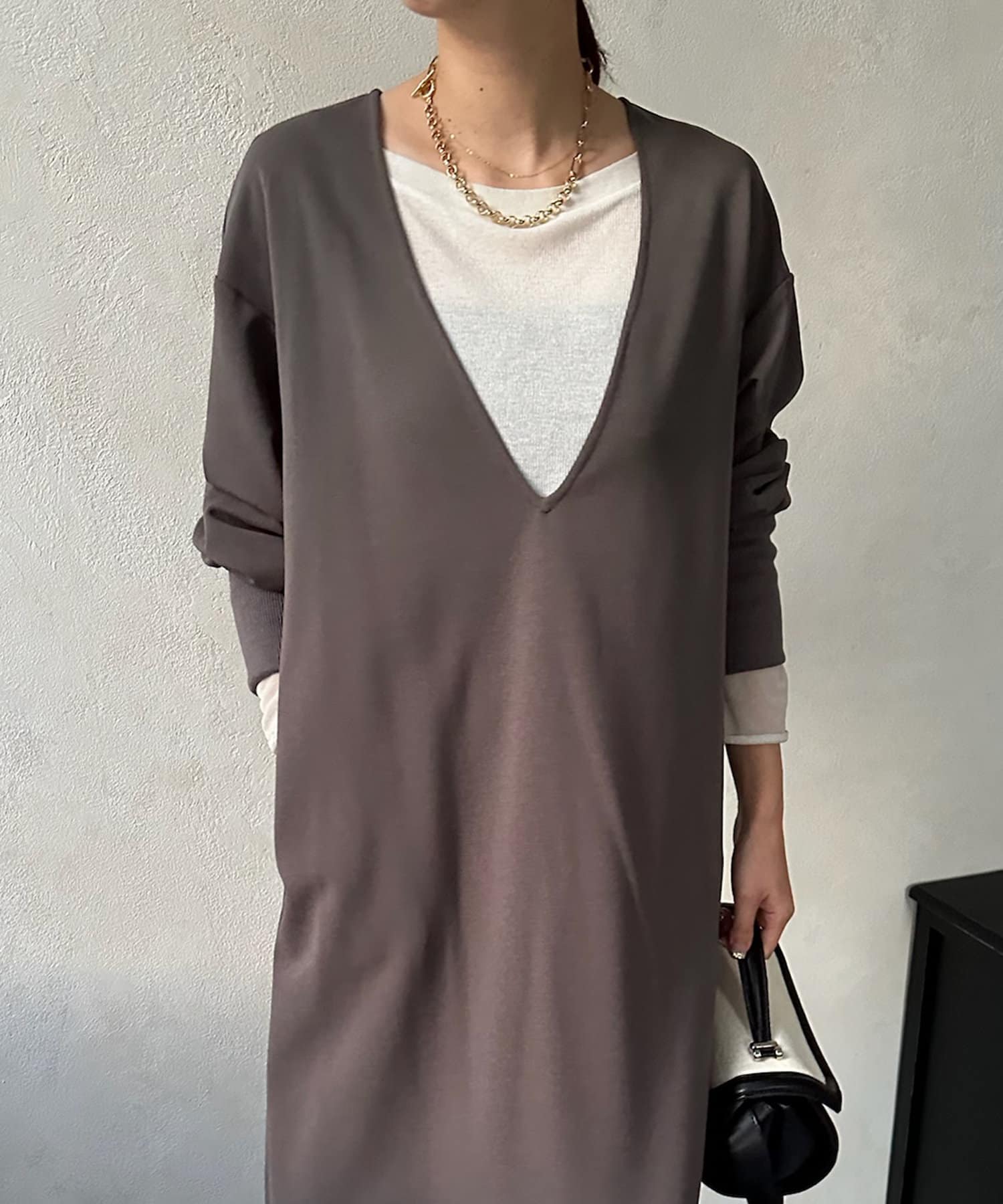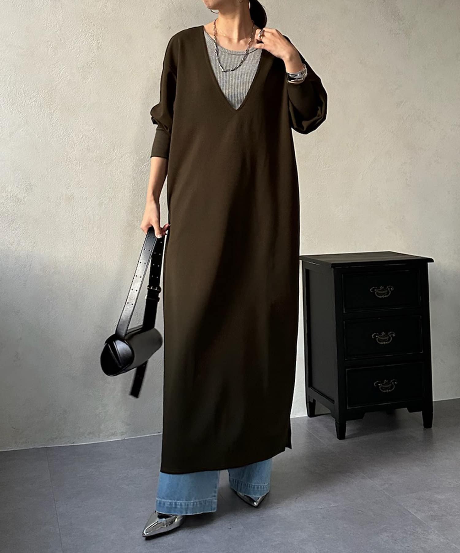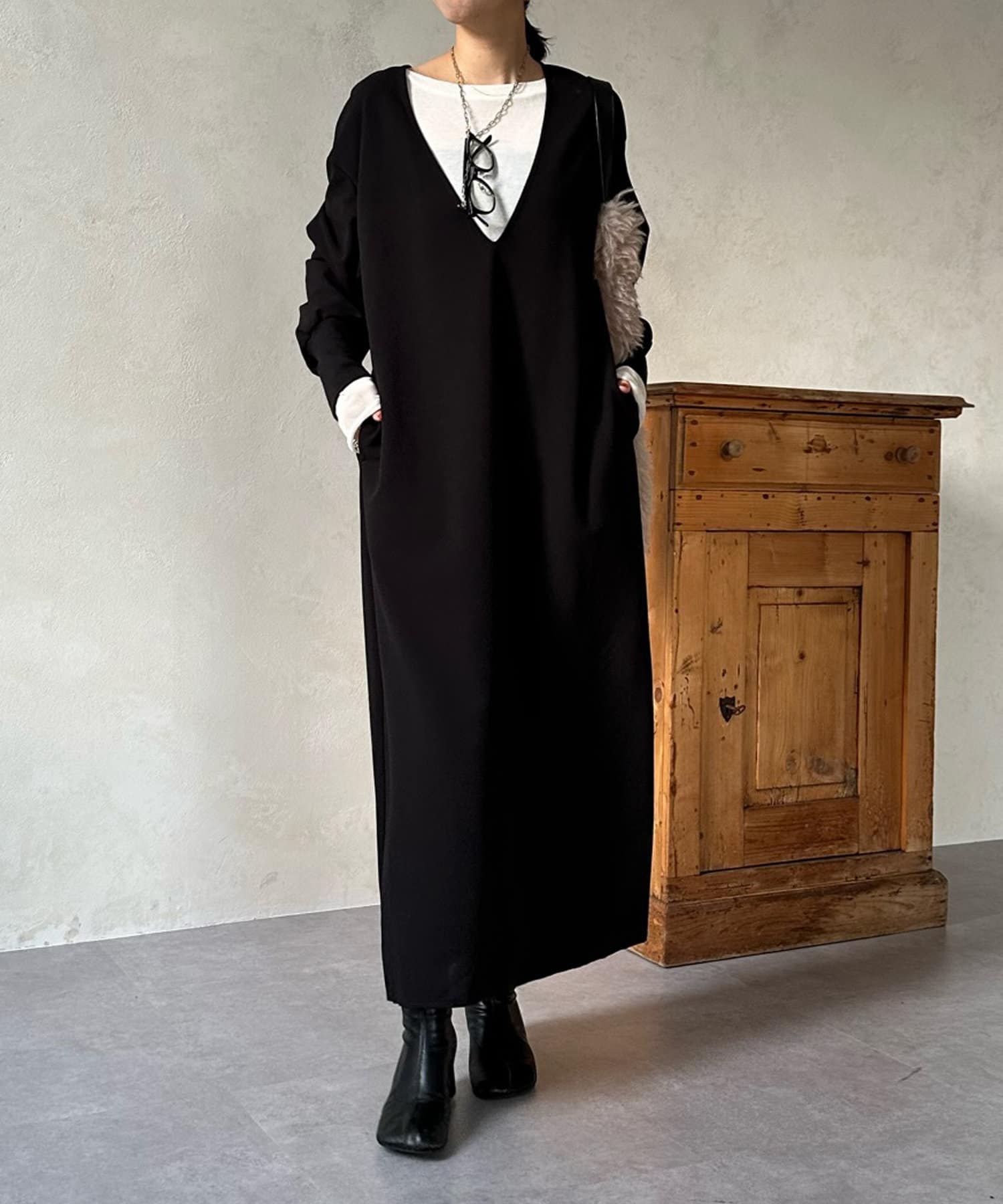 ざっくりと深めのVネックに仕上げたロングワンピース。
