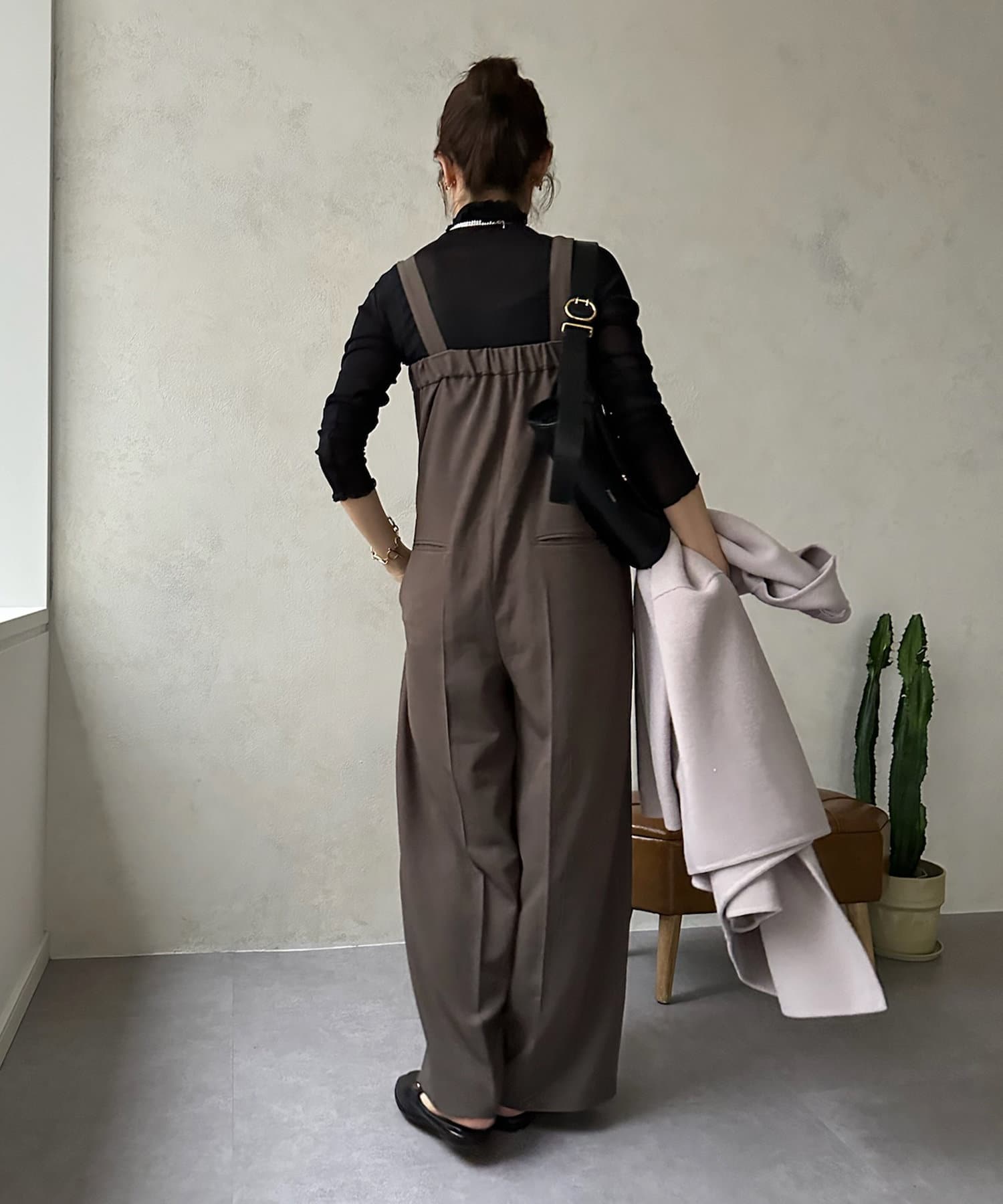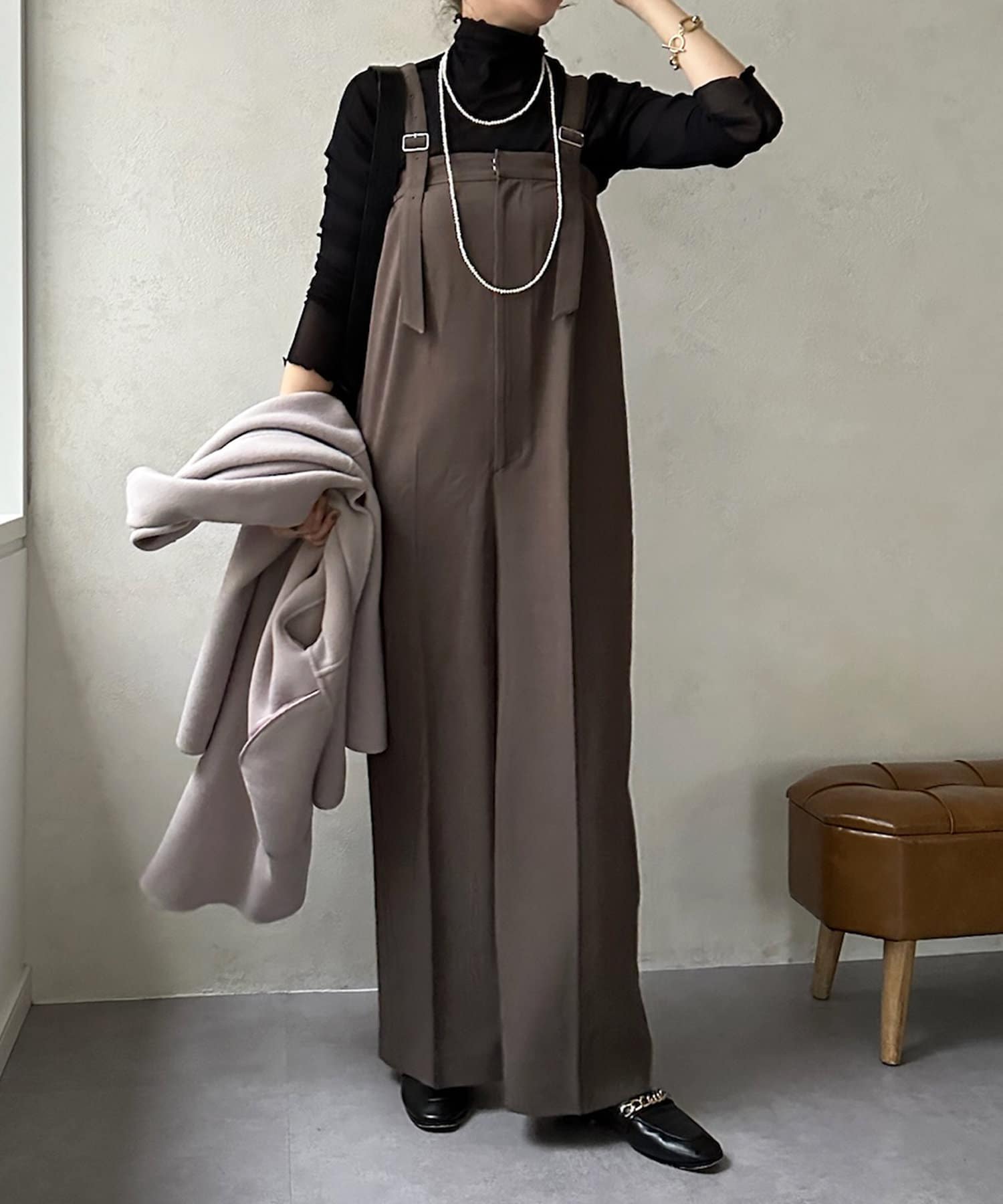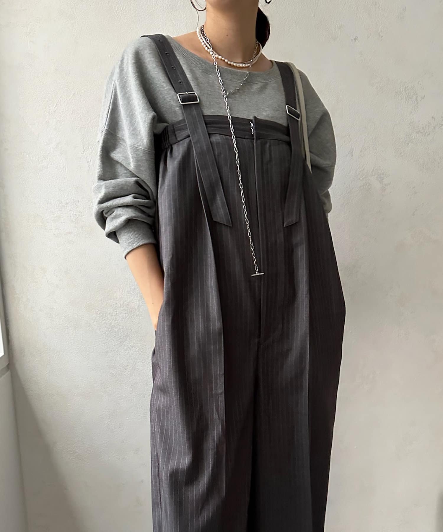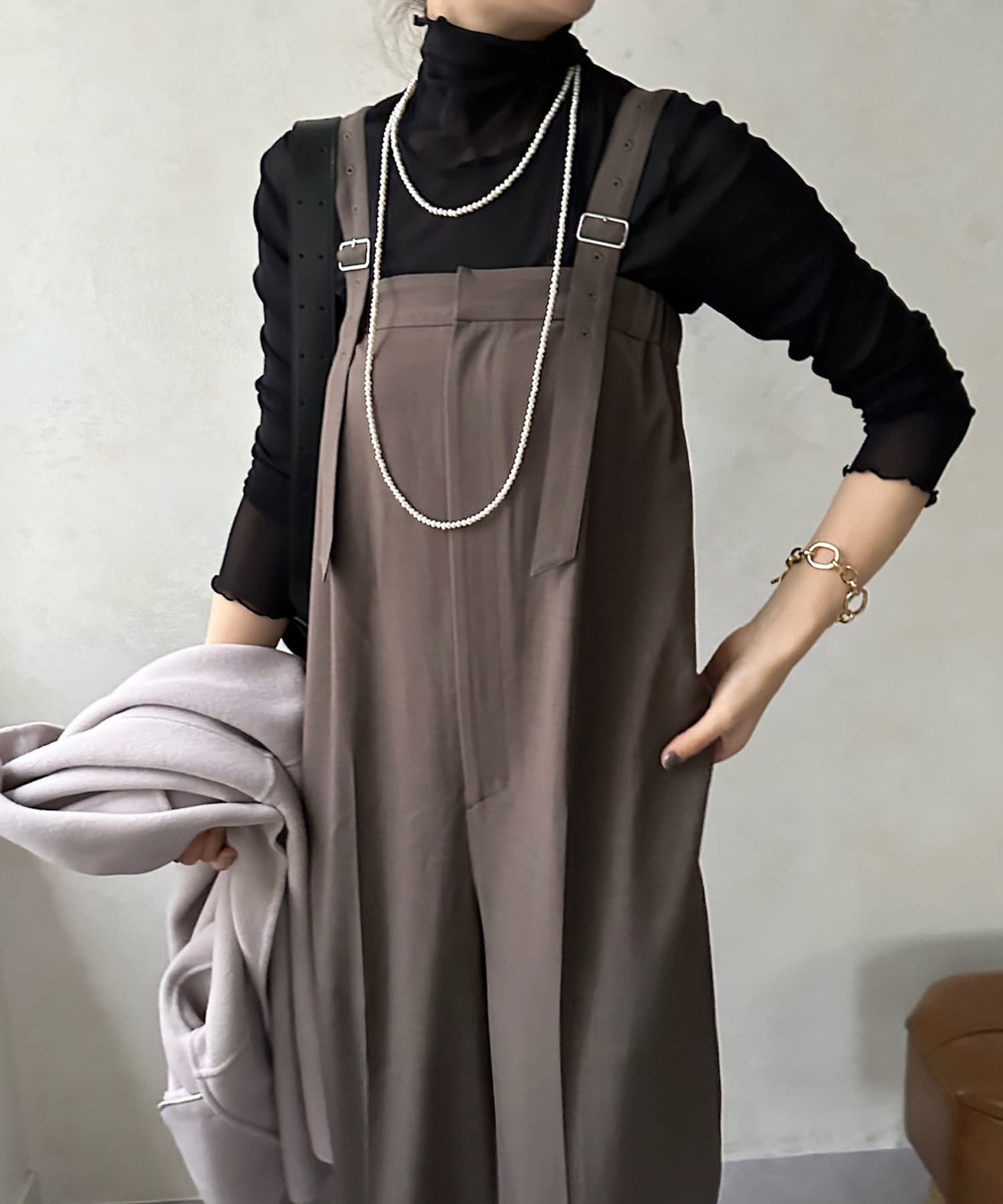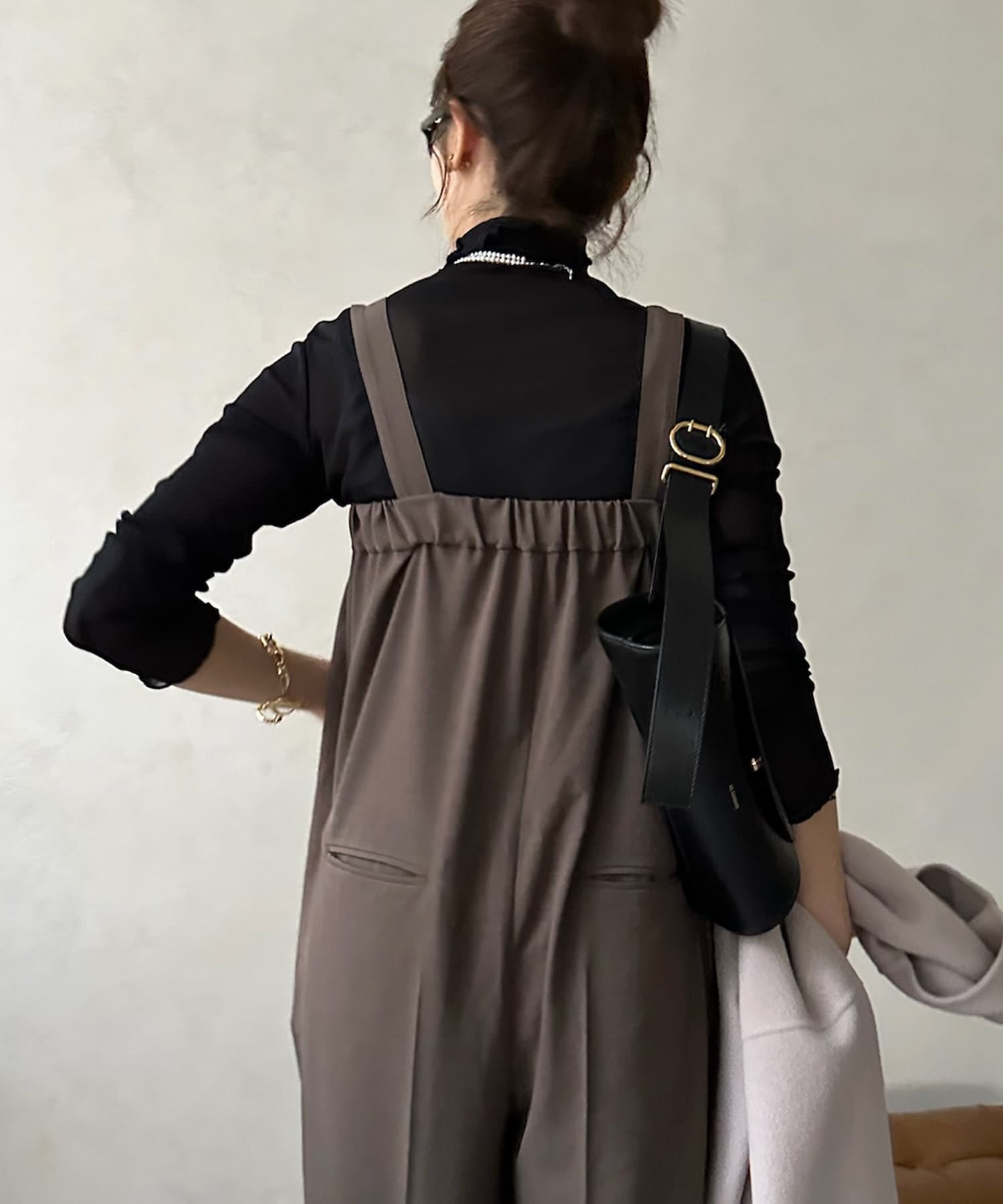 程よいワイドシルエットなので身体のラインを拾いすぎず、肩紐で長さを調整できるのも嬉しいポイントです。