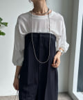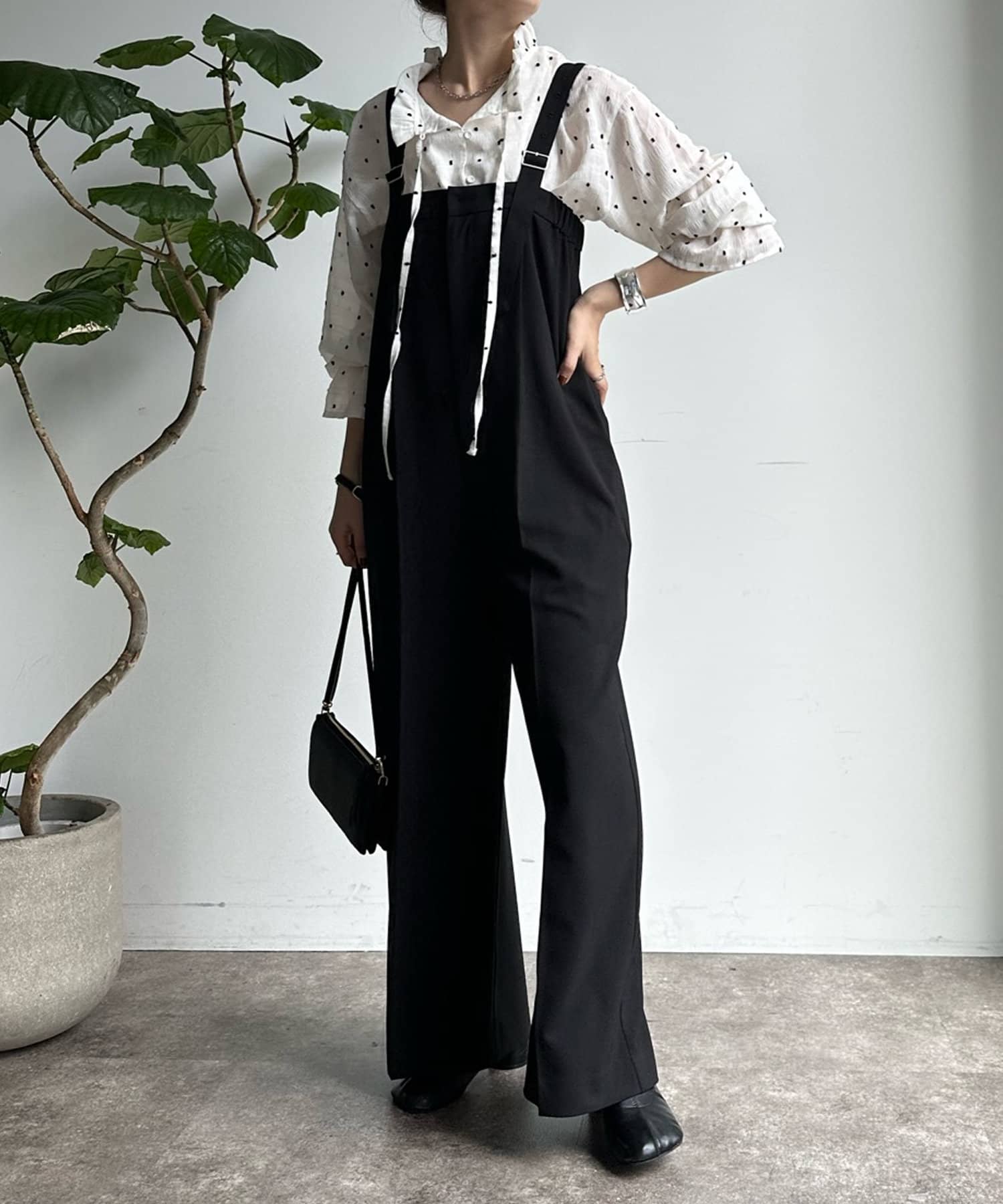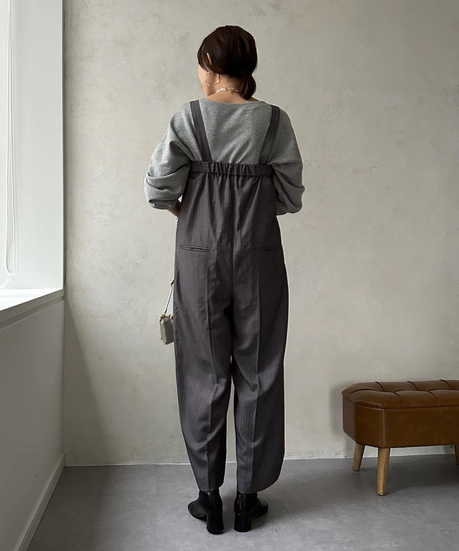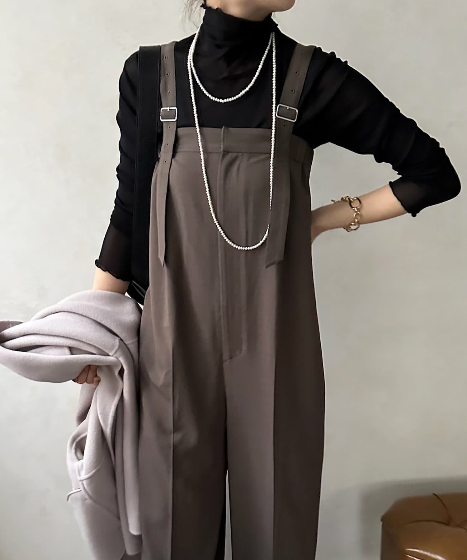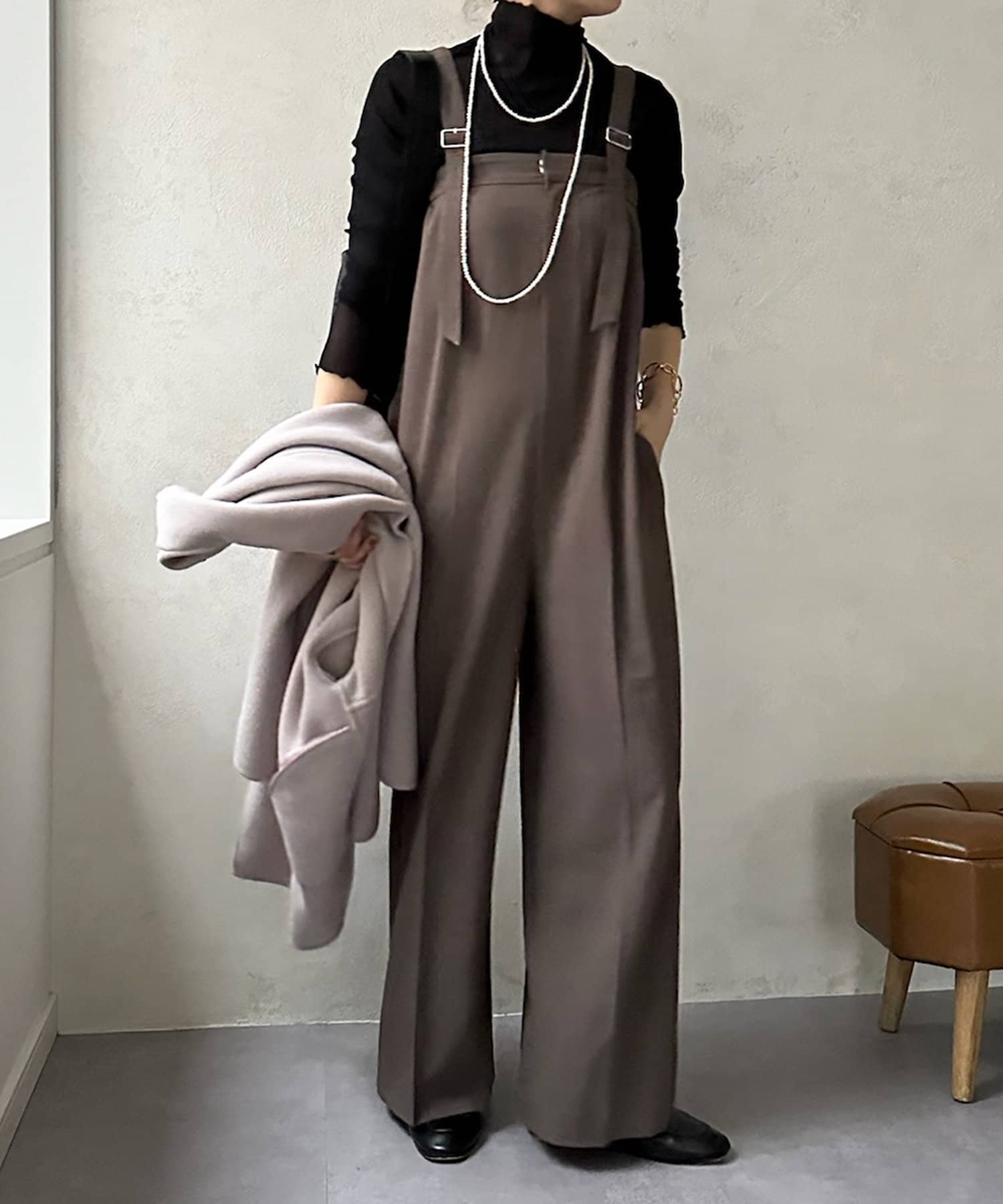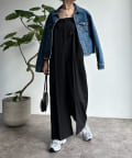 程よいワイドシルエットなので身体のラインを拾いすぎず、肩紐で長さを調整できるのも嬉しいポイントです。