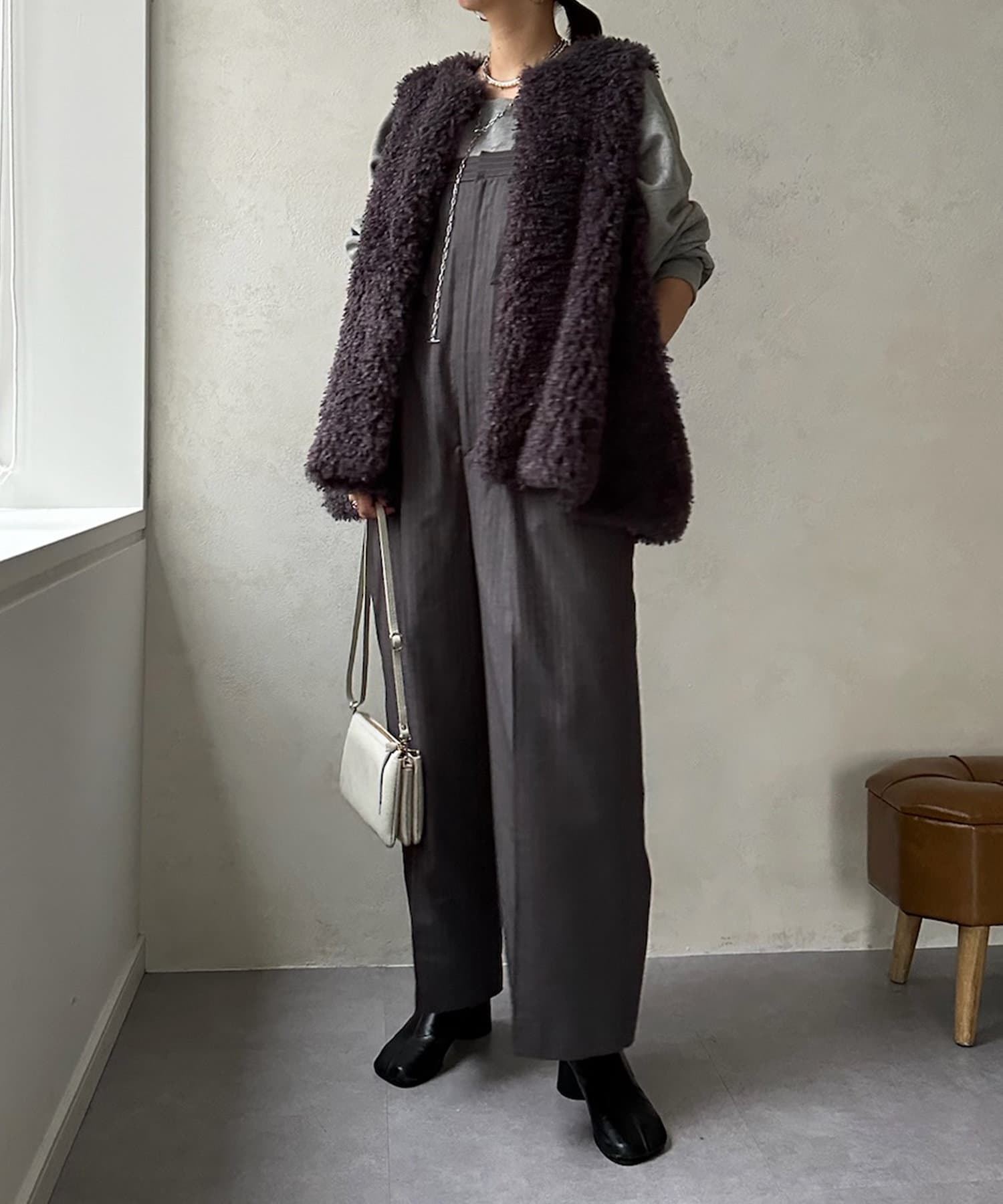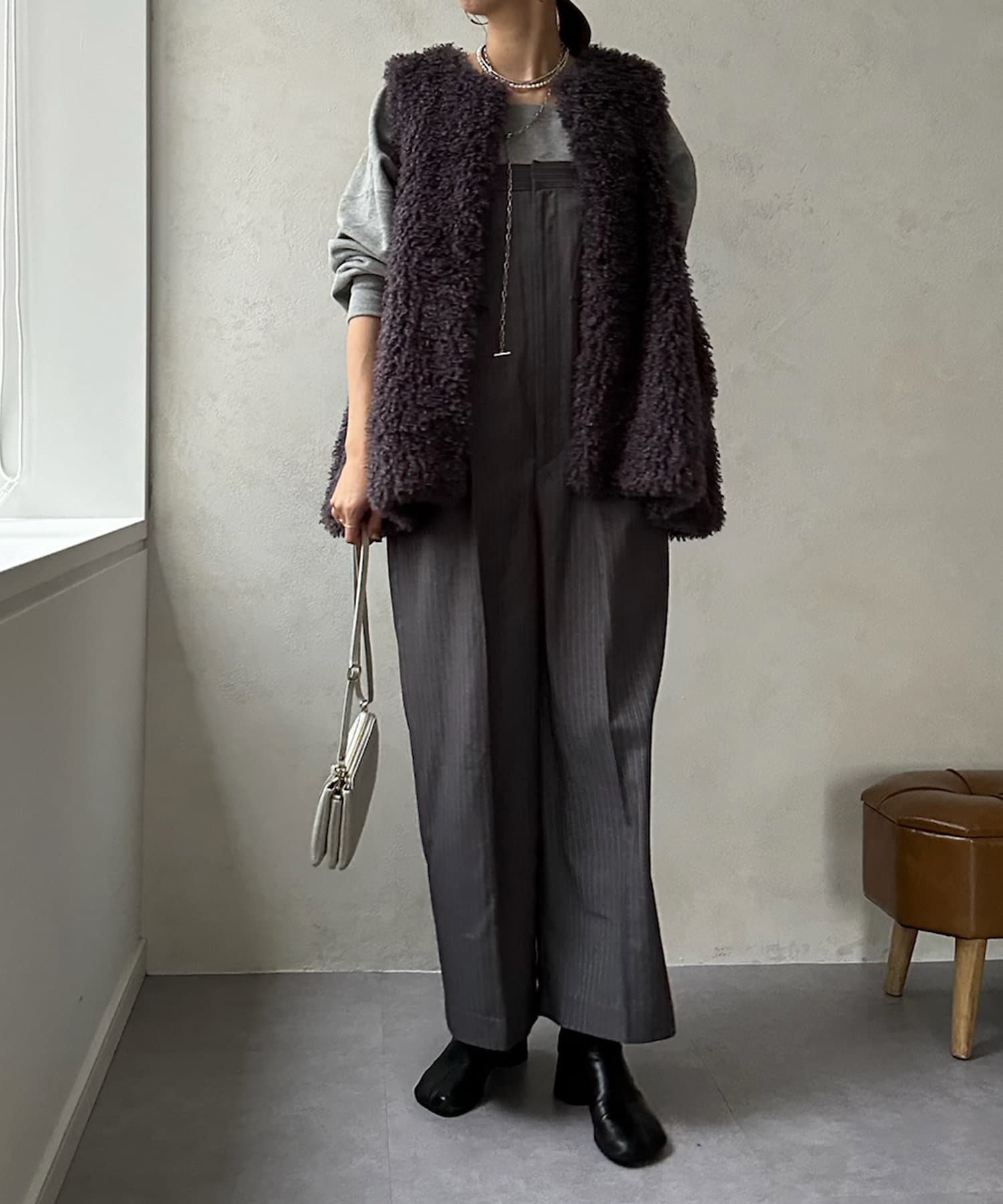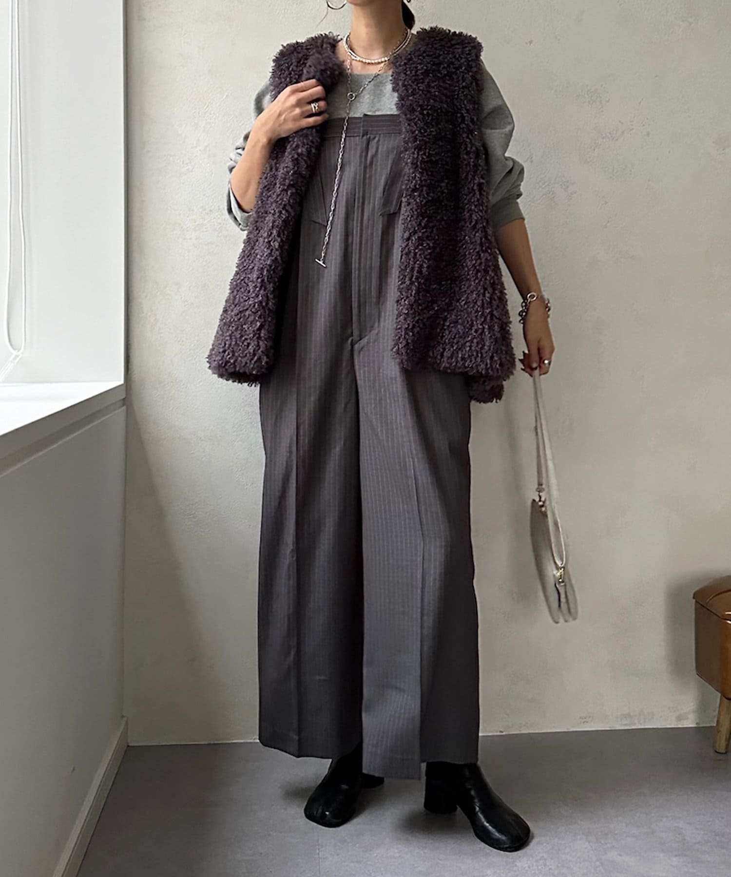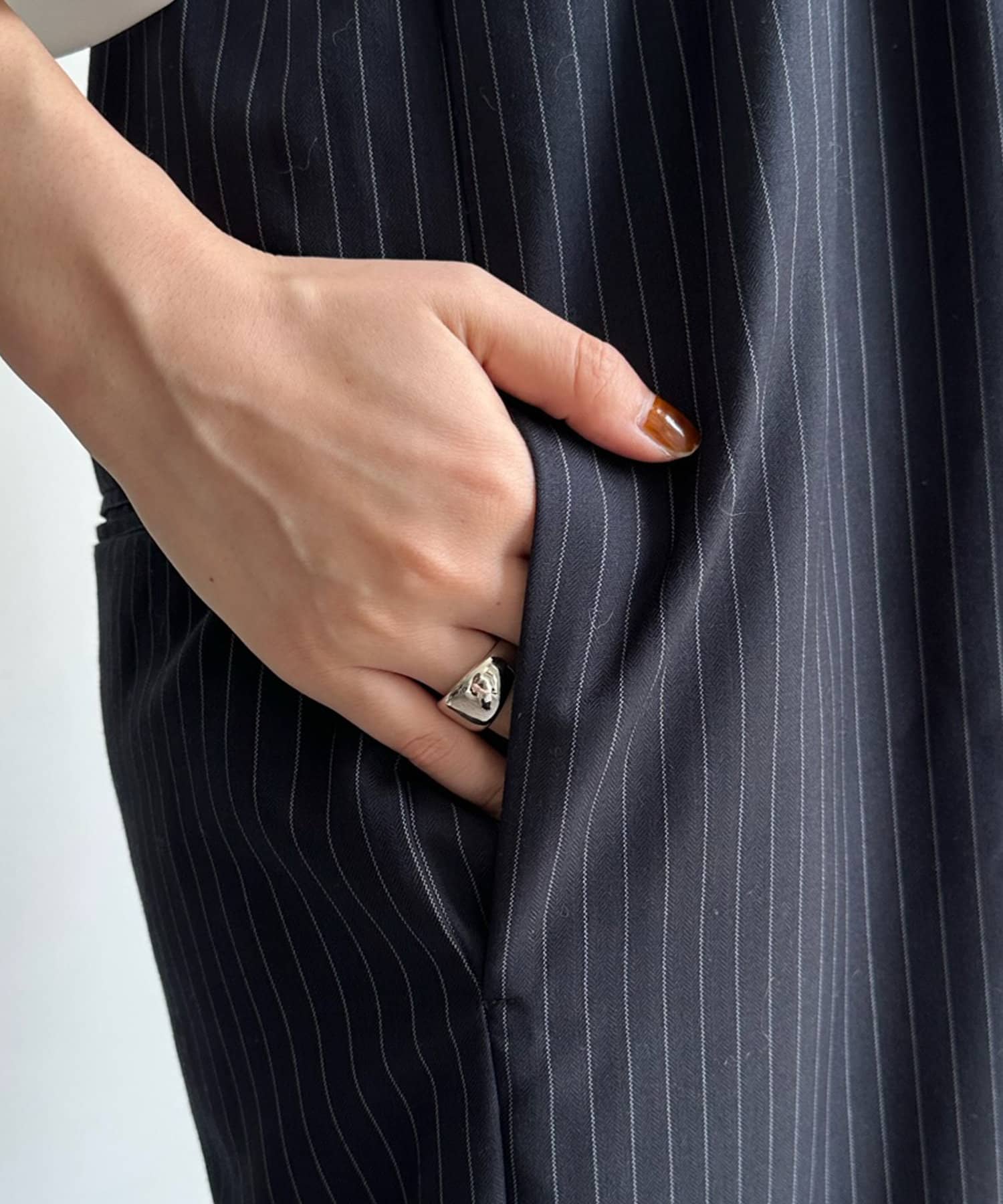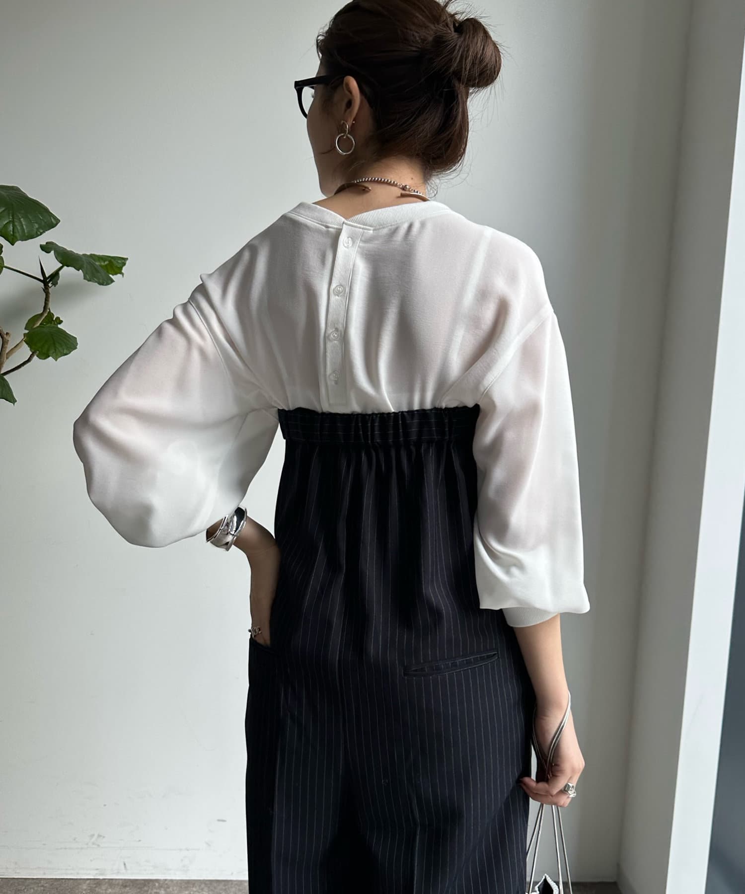 程よいワイドシルエットなので身体のラインを拾いすぎず、肩紐で長さを調整できるのも嬉しいポイントです。