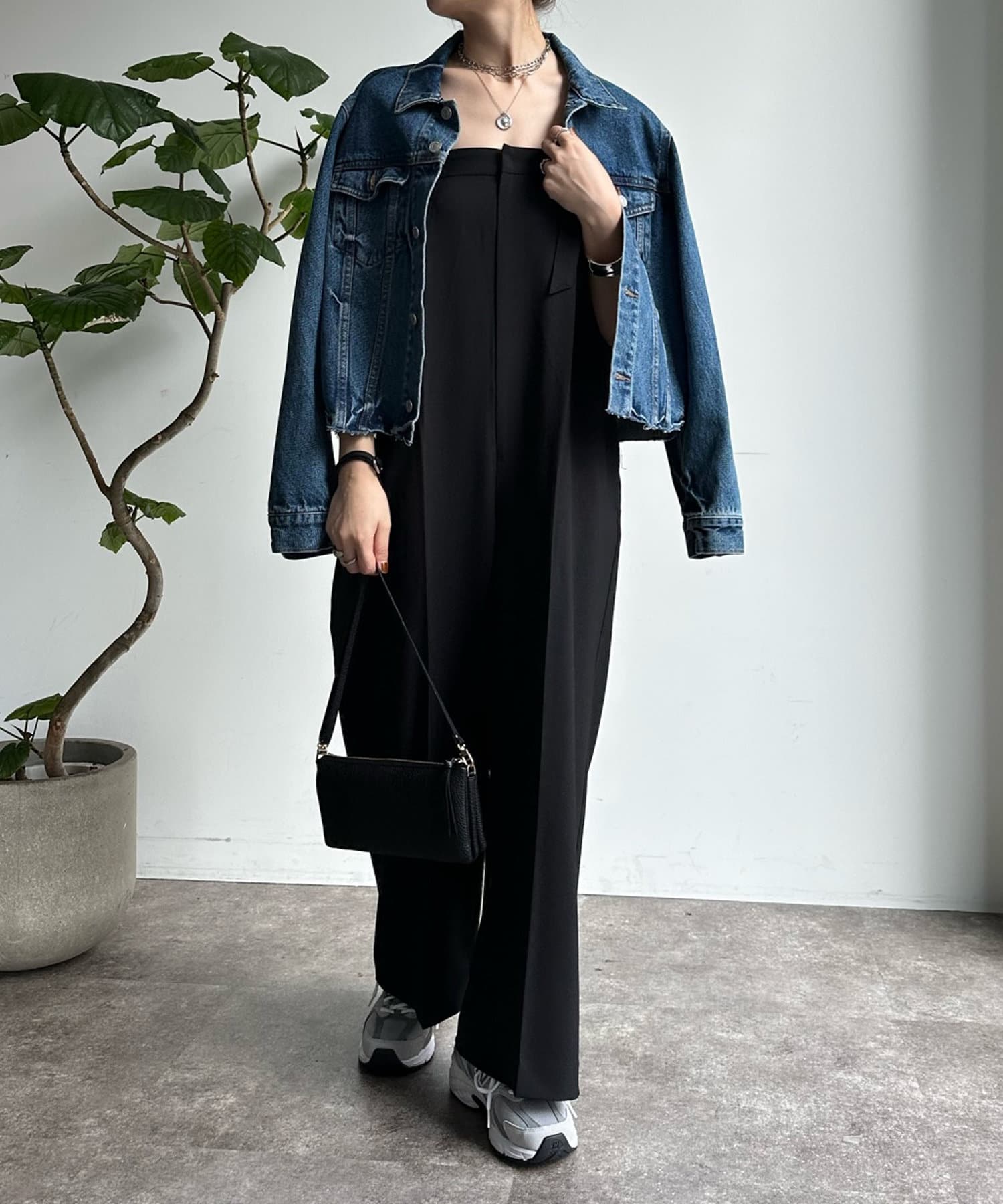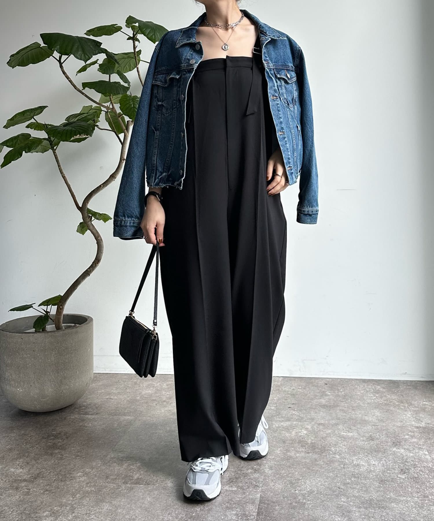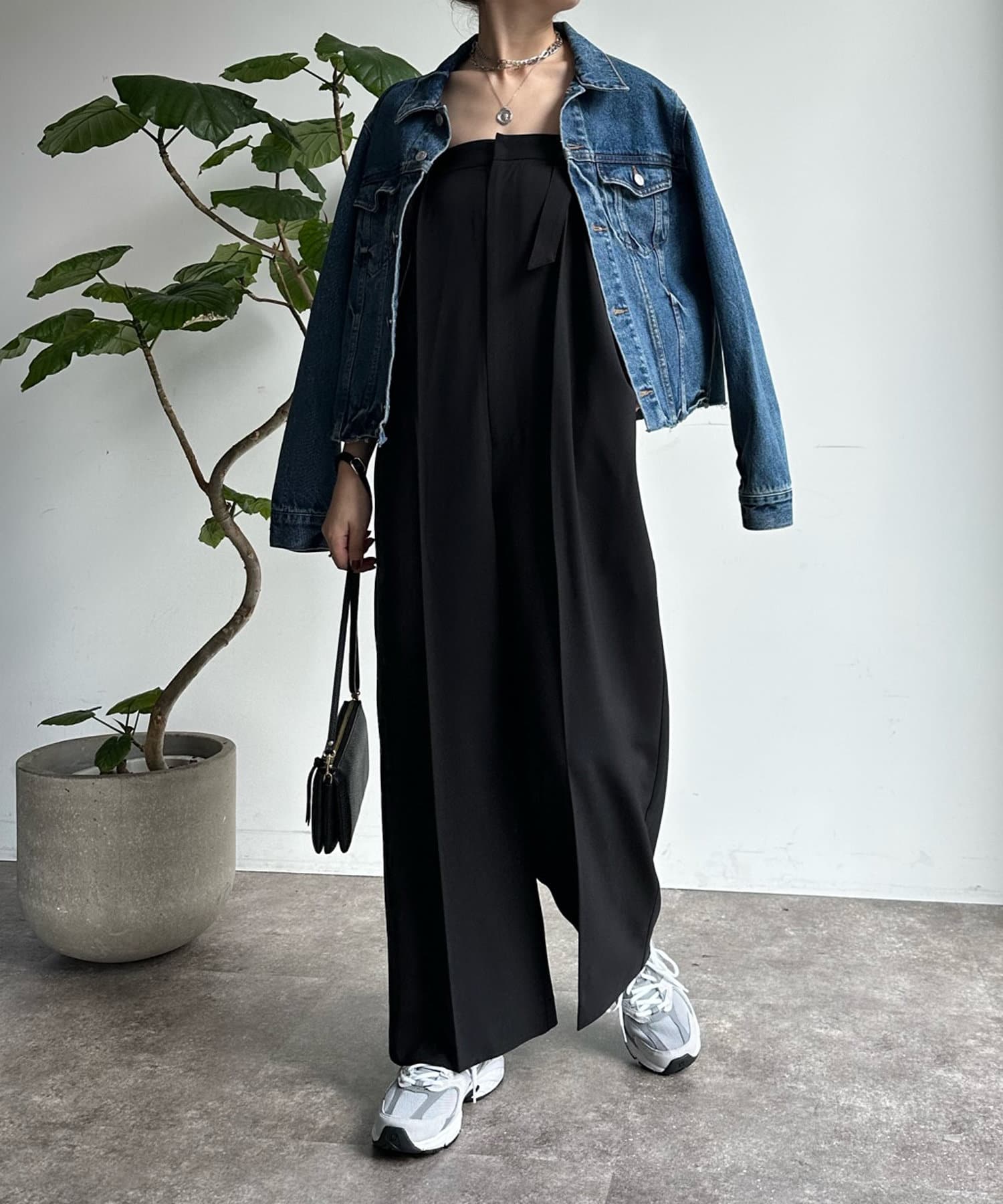 ベアトップとワイドシルエットが印象的なオールインワン。