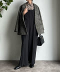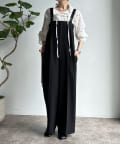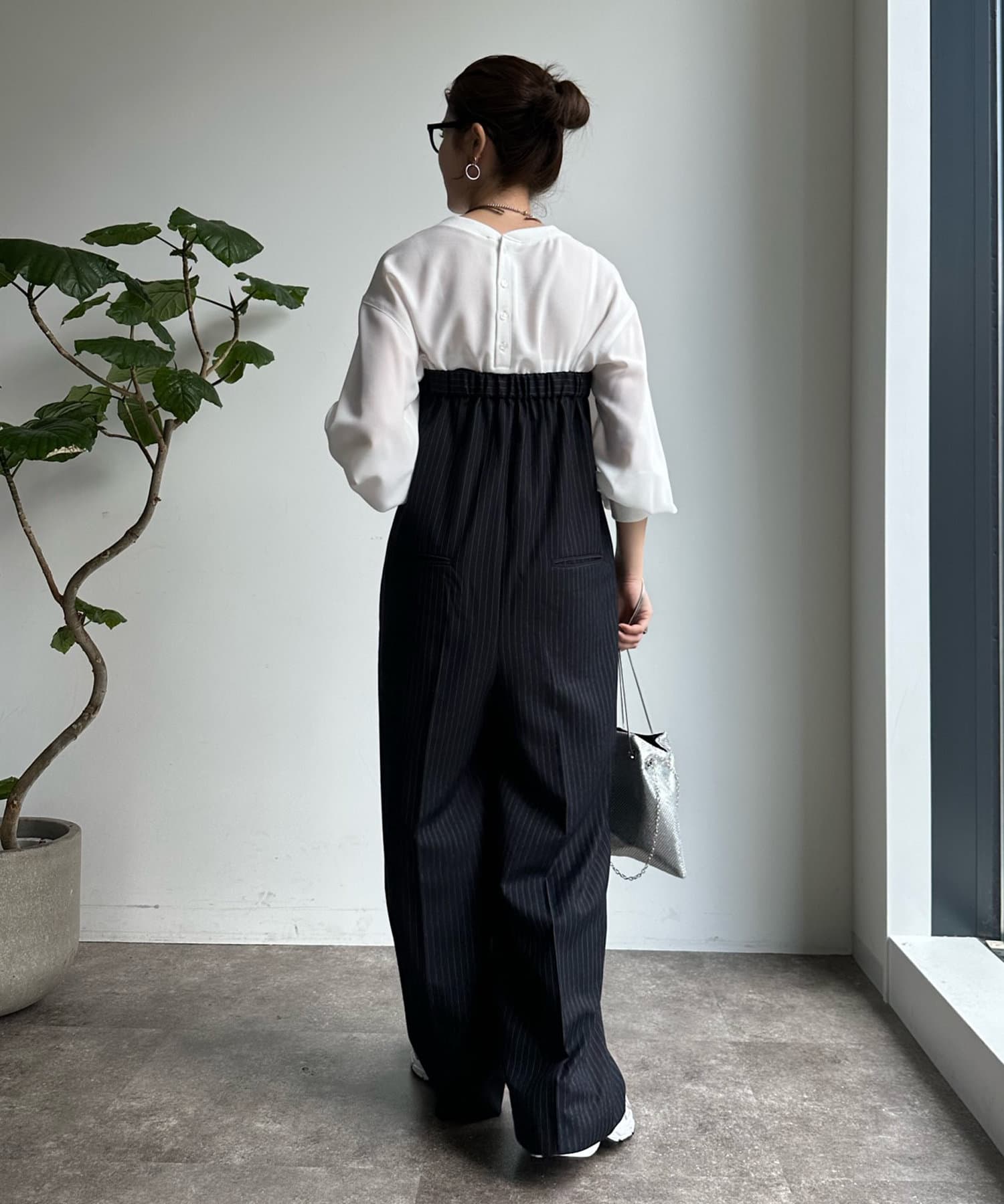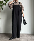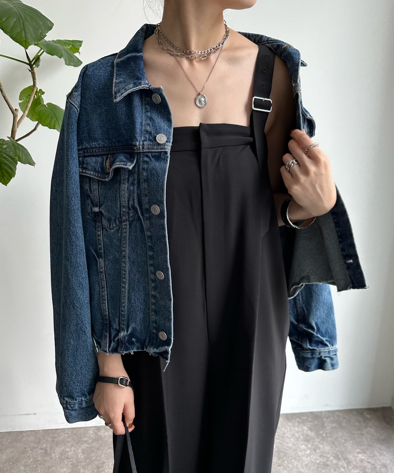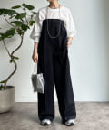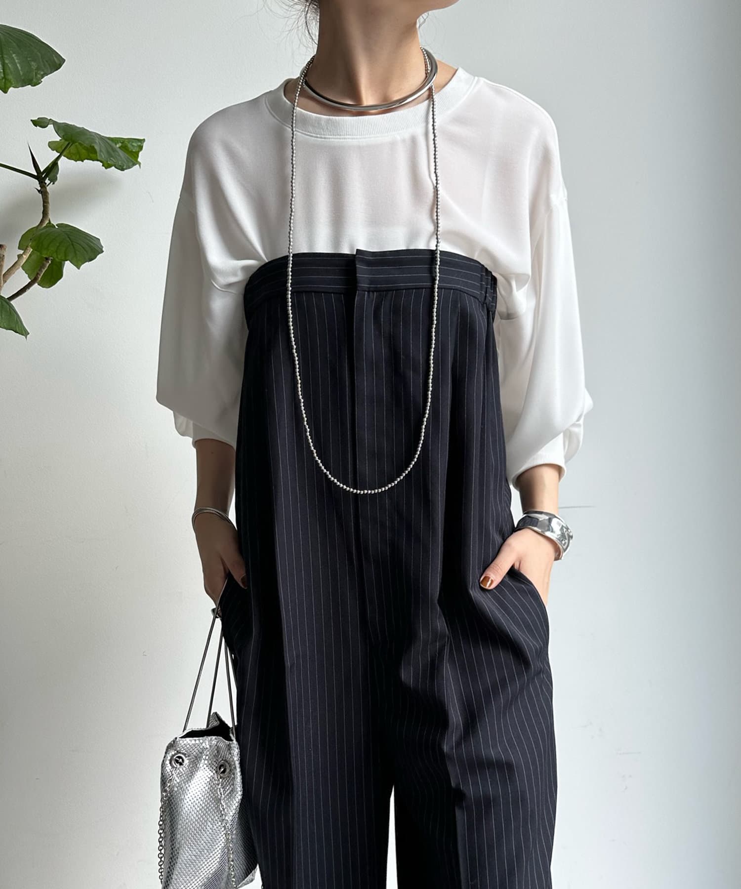 ベアトップとワイドシルエットが印象的なオールインワン。