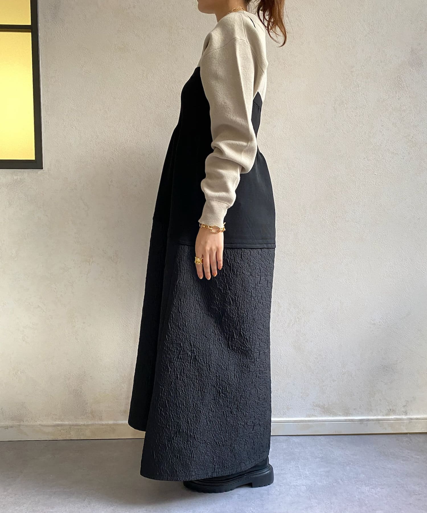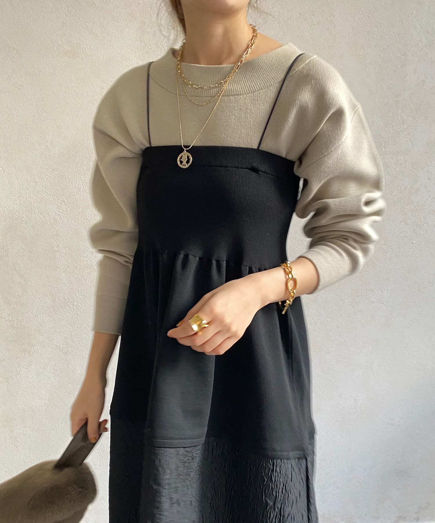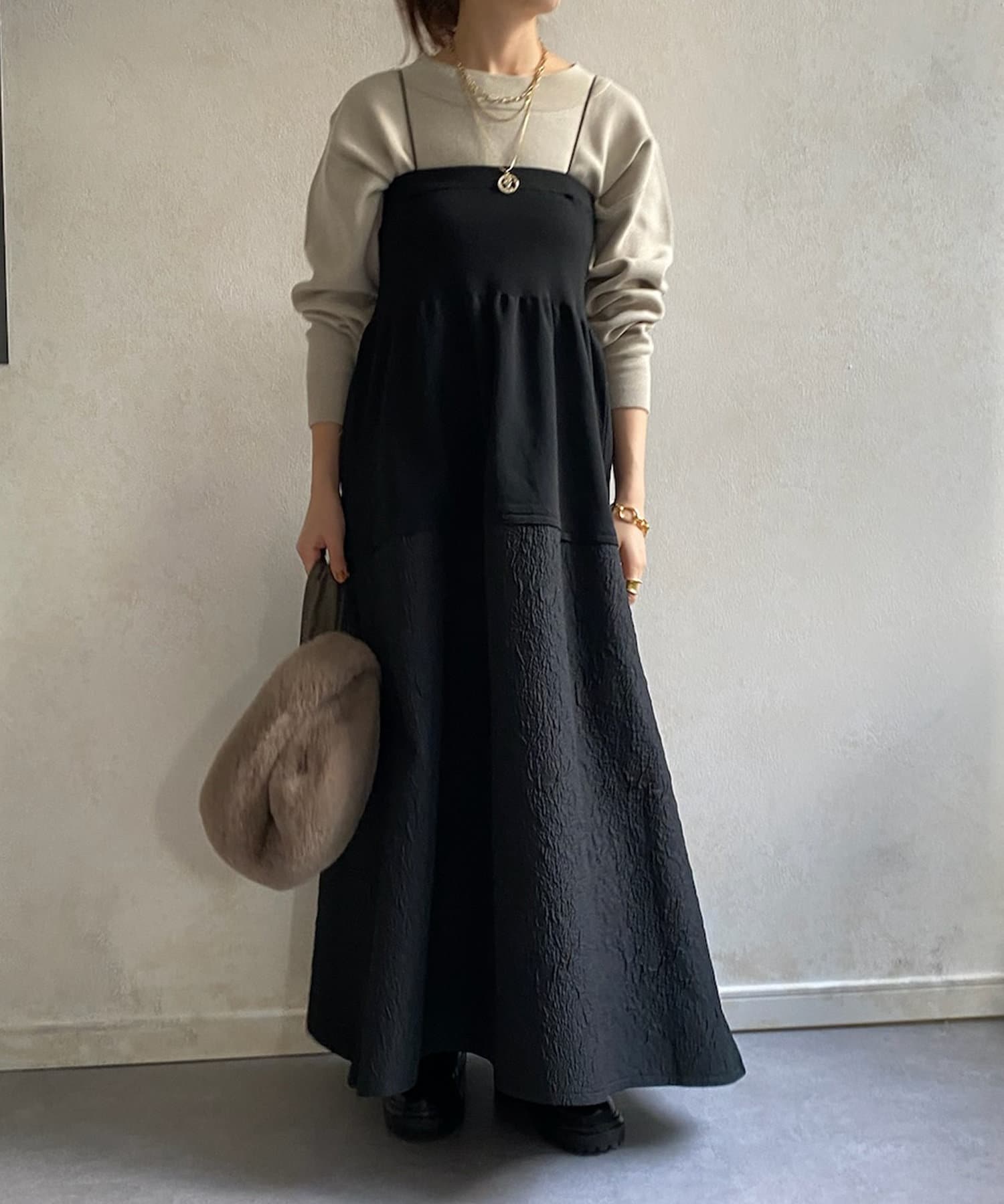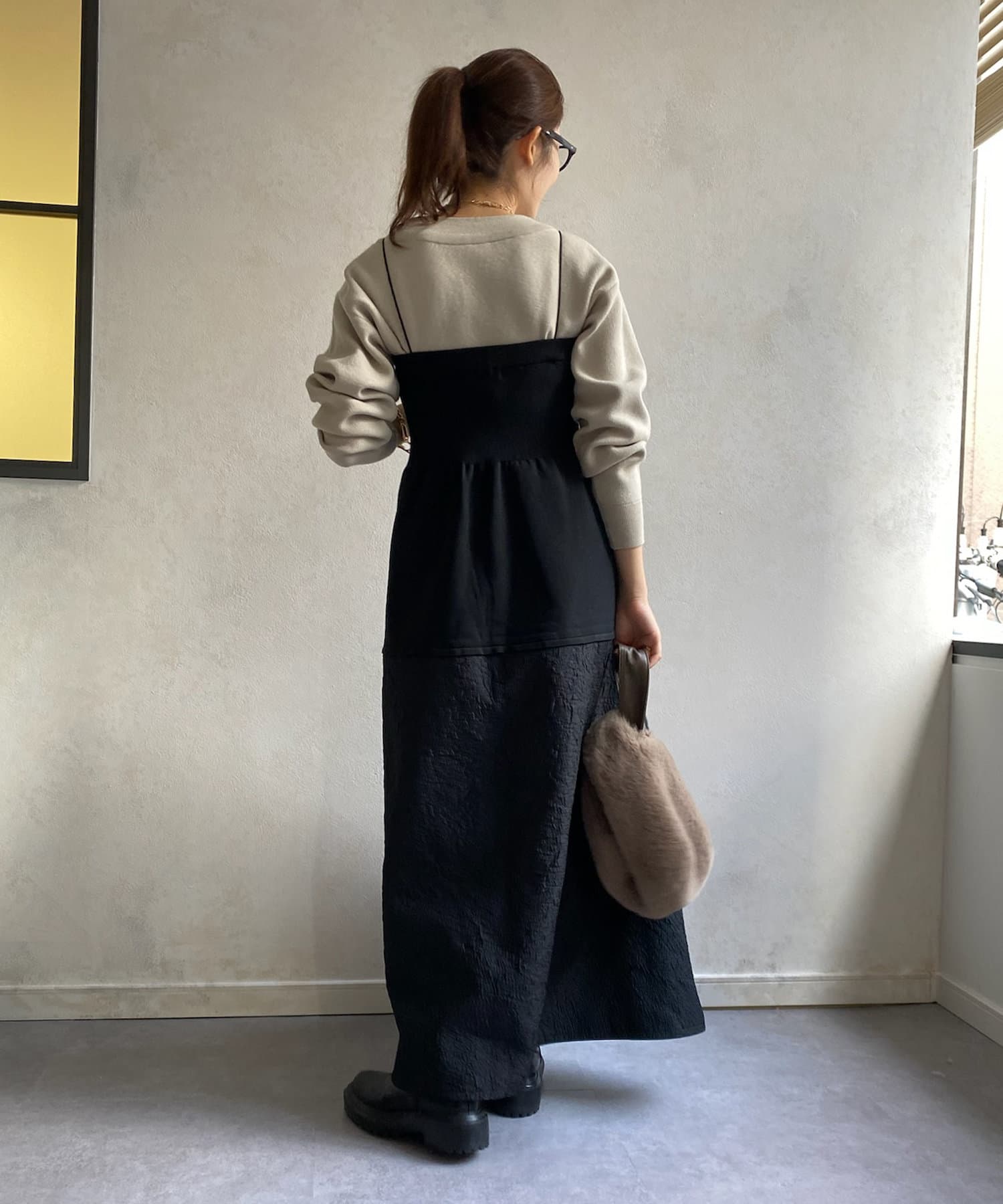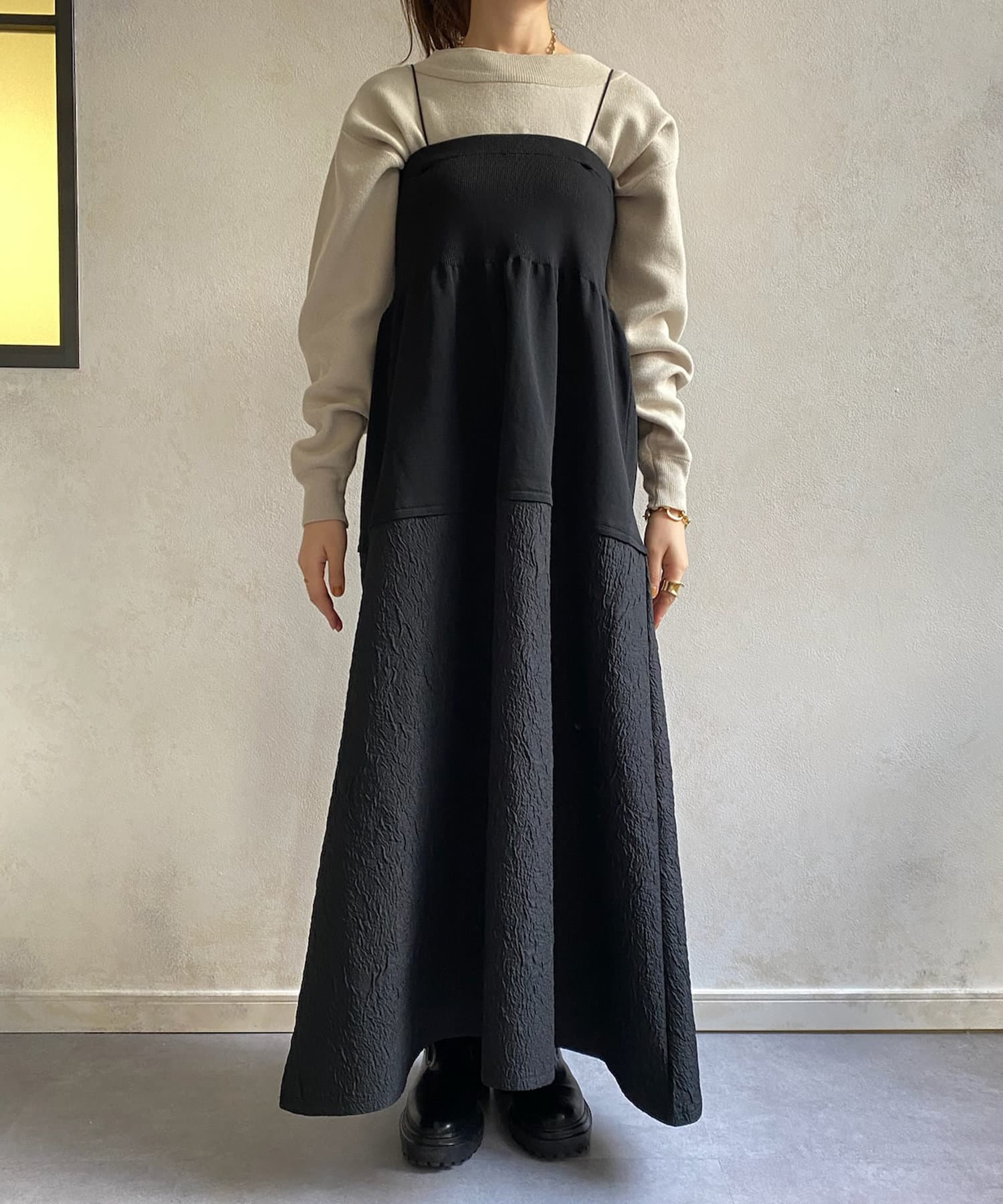 素材の切り替えデザインがポイントのキャミソールワンピース。