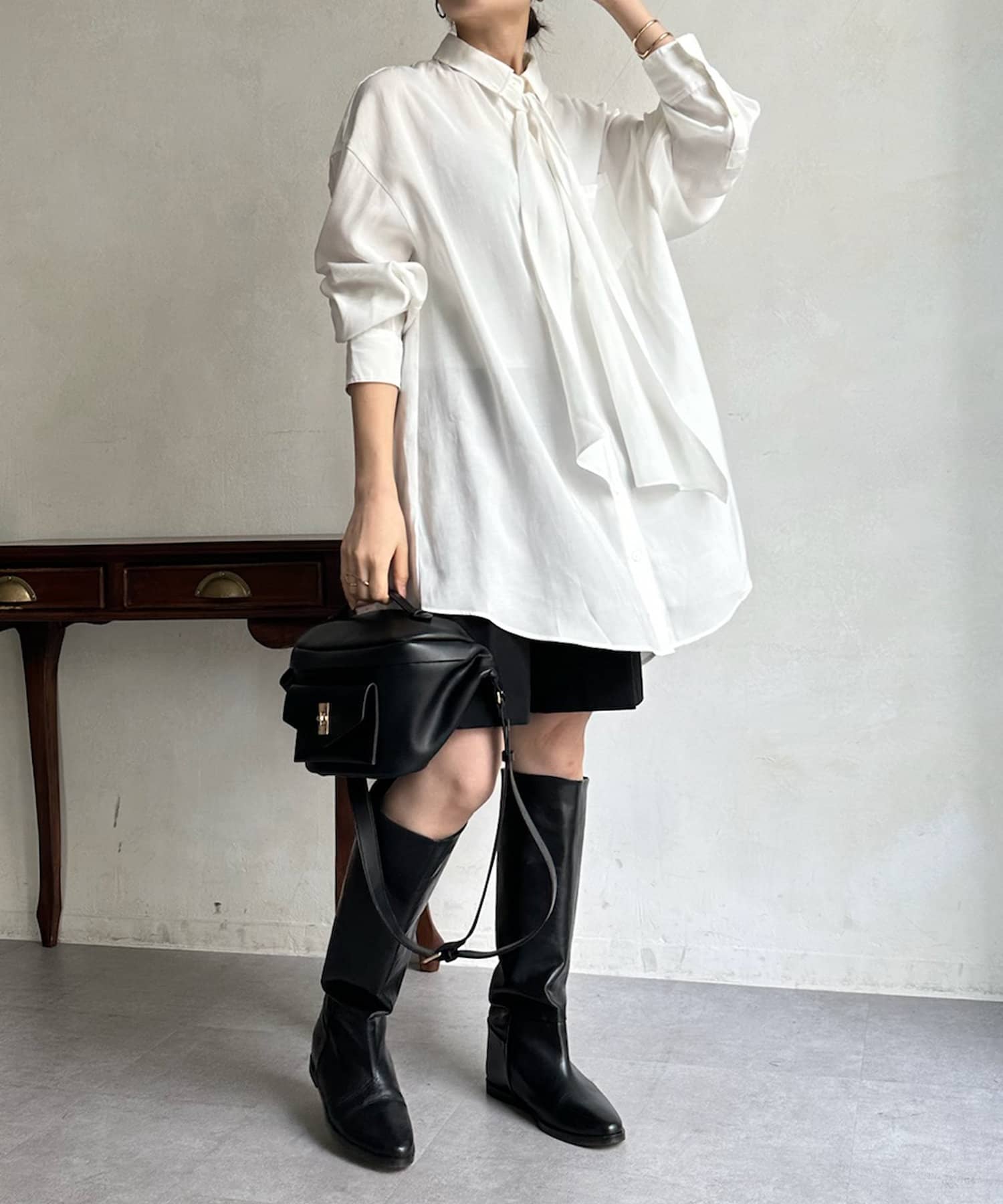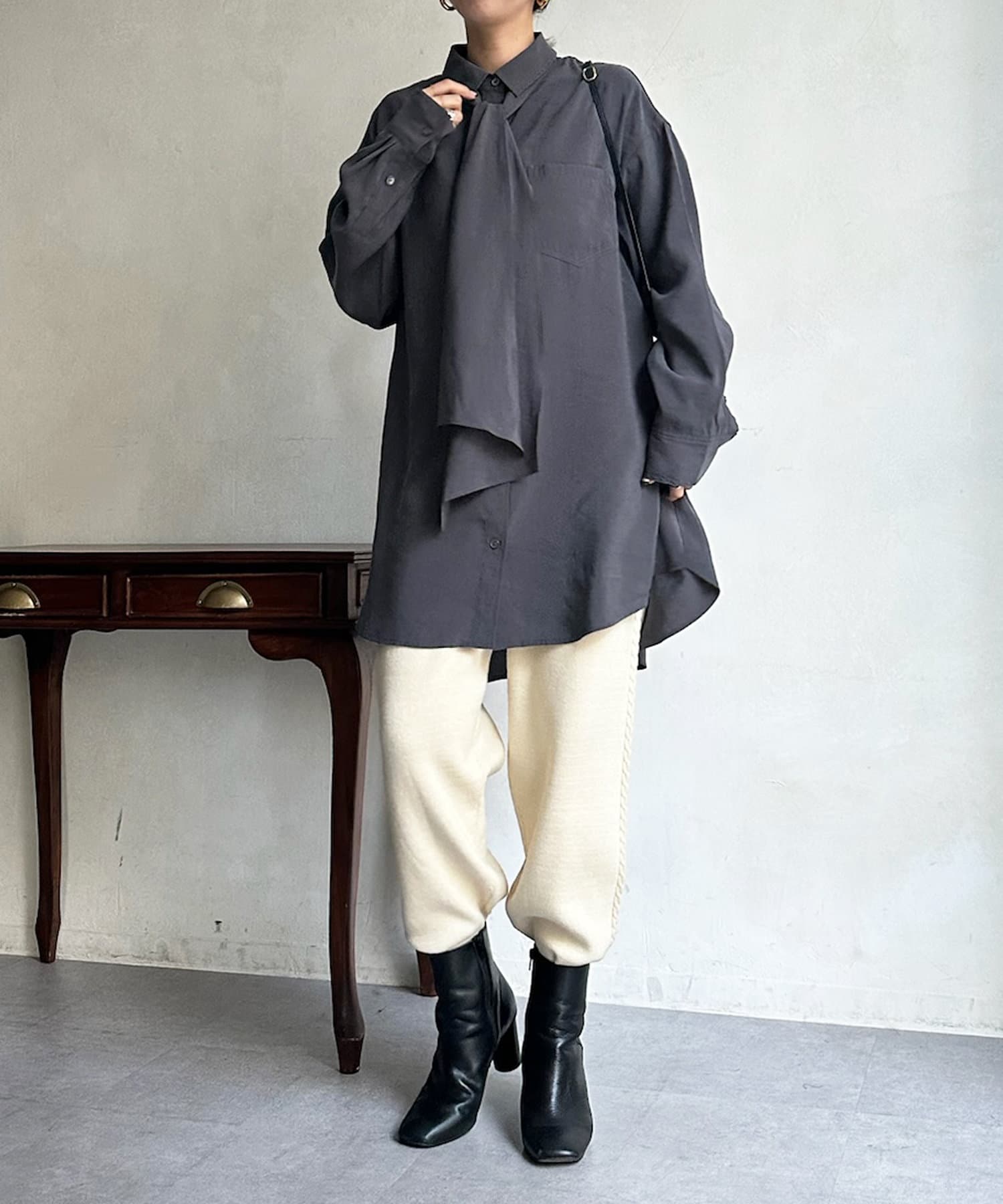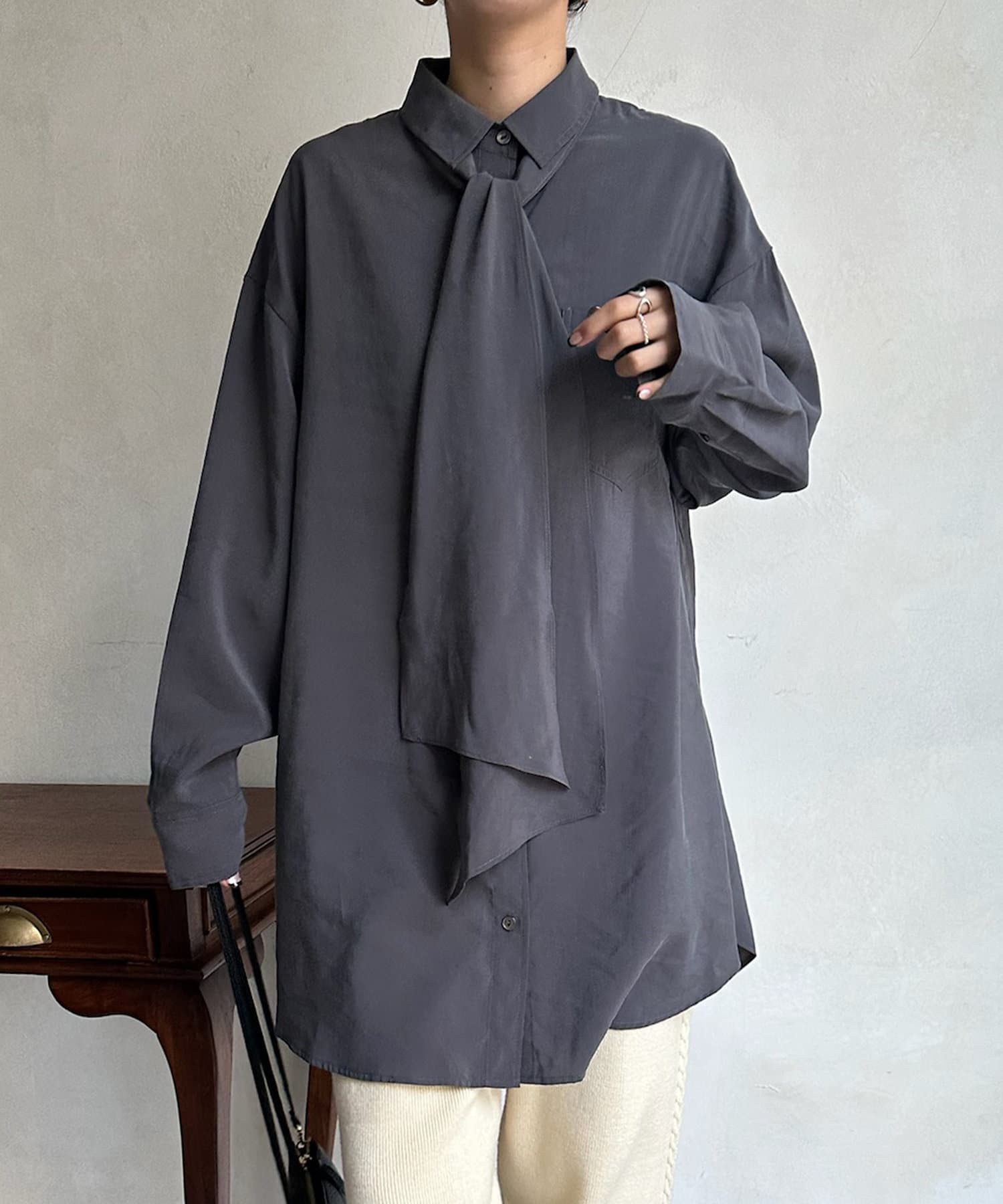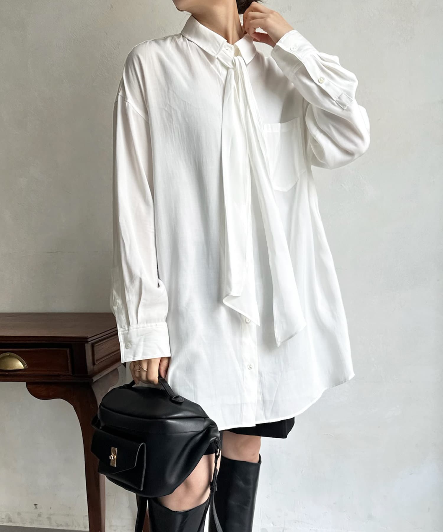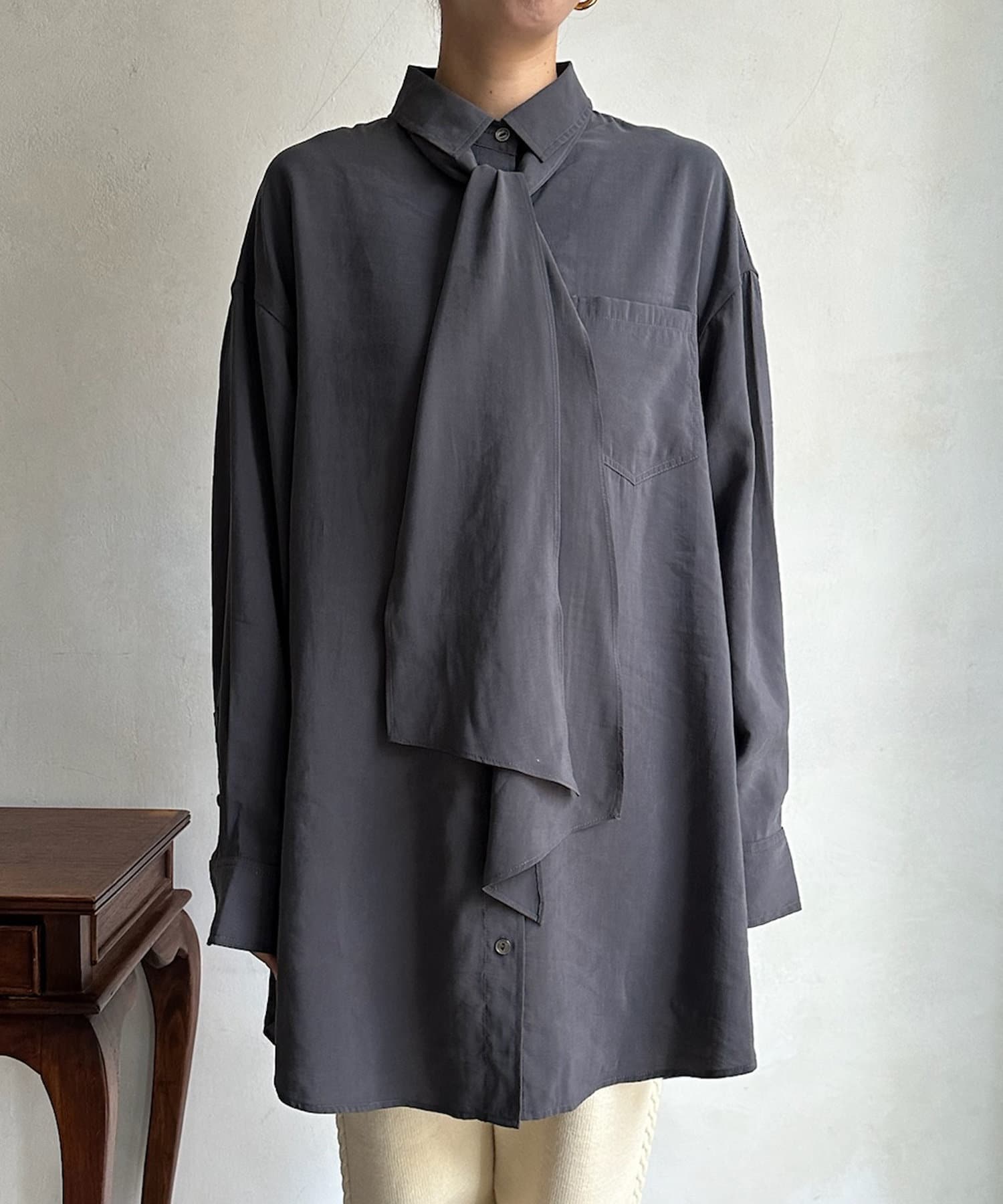 長めのボウタイがアクセントになってくれるブラウス。
