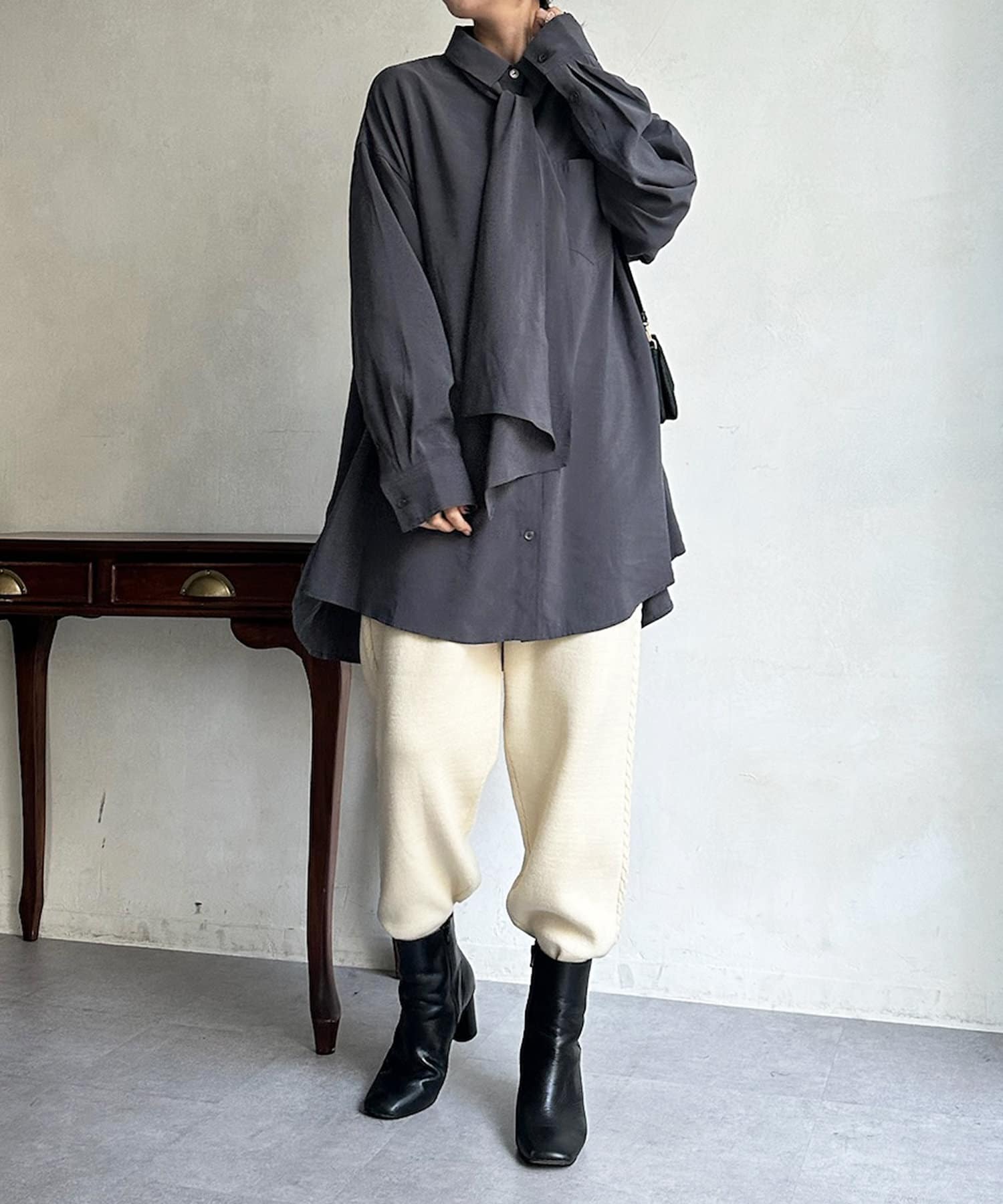 落ち感のある素材が、甘くなりすぎず上品な印象です。