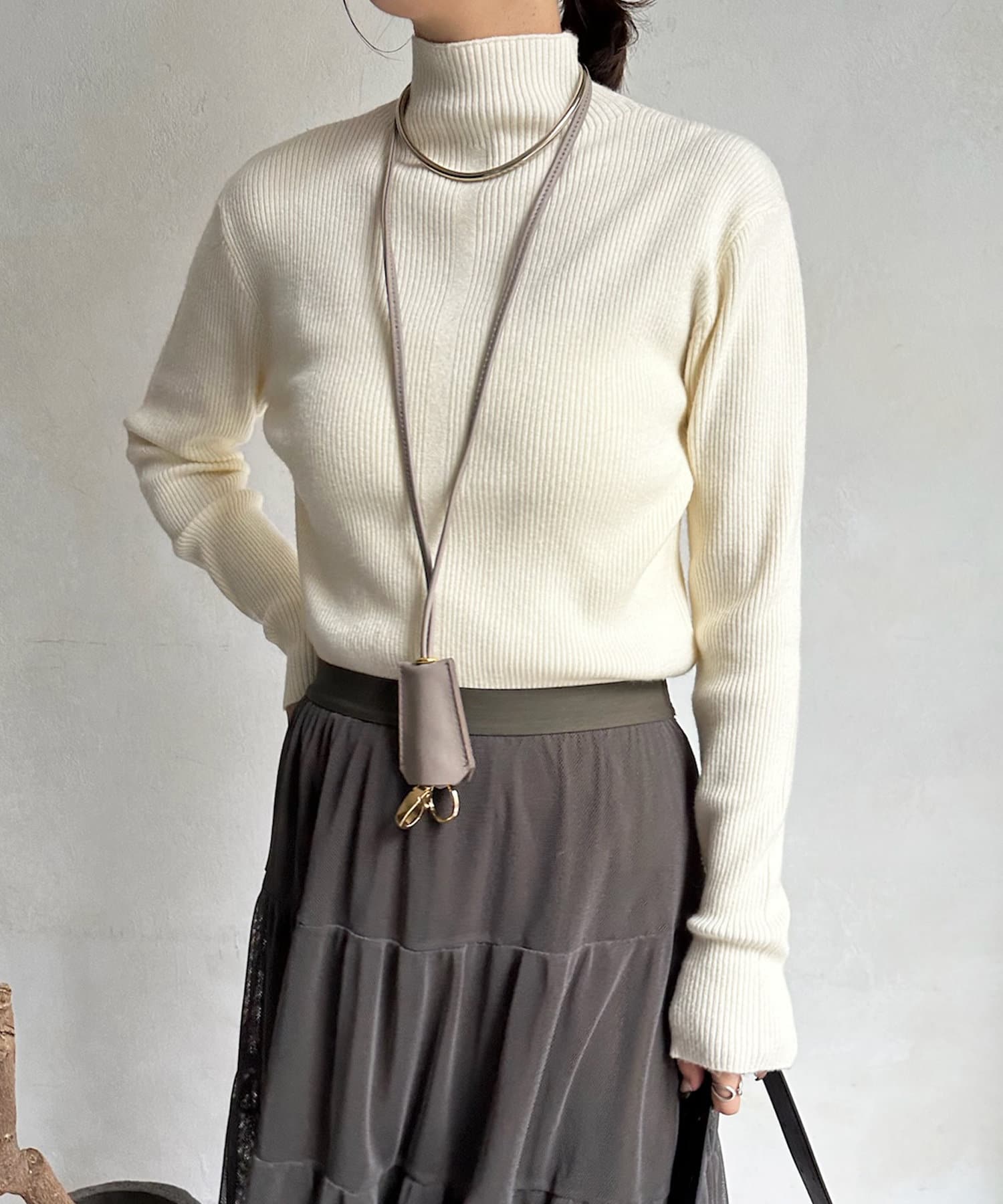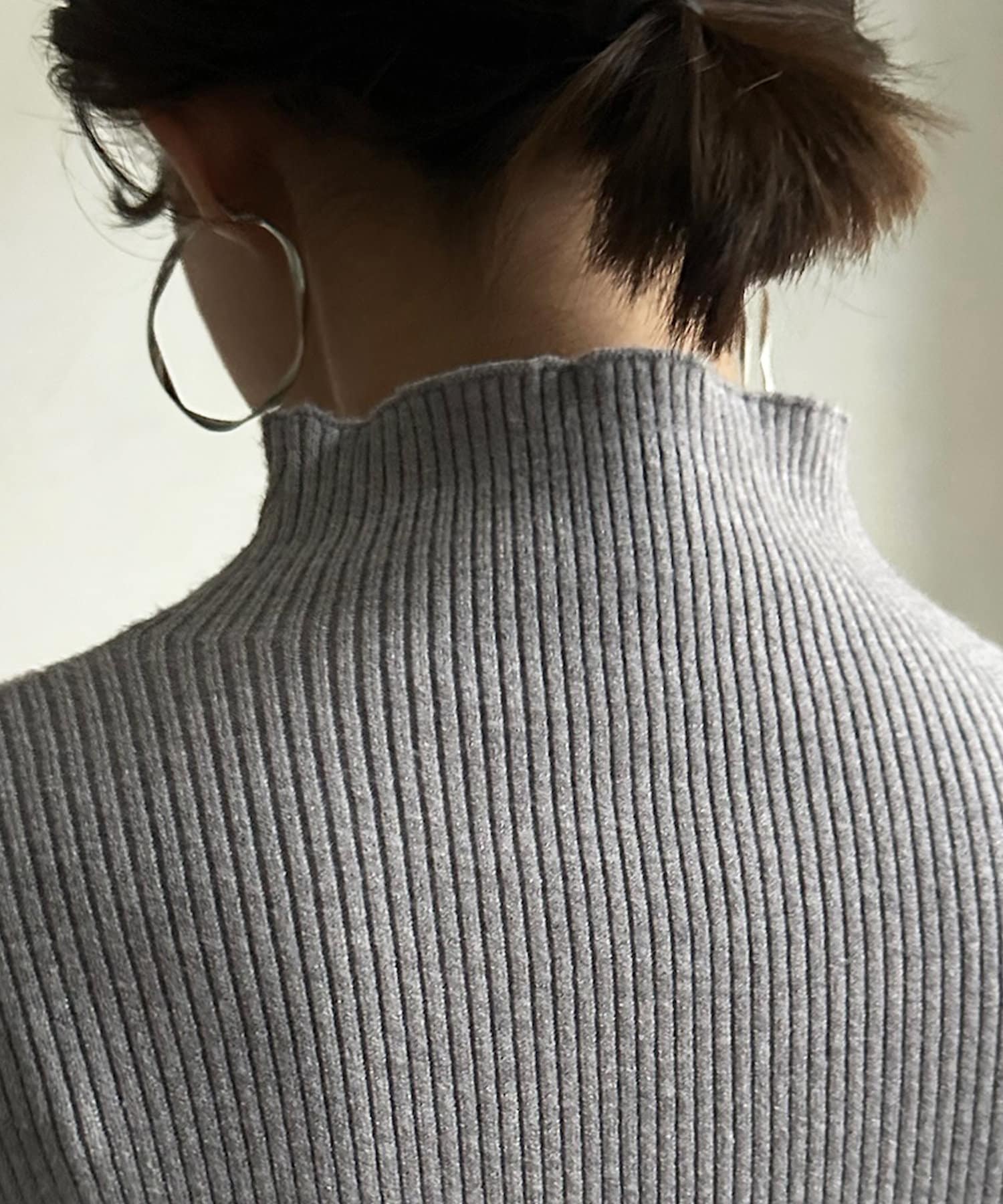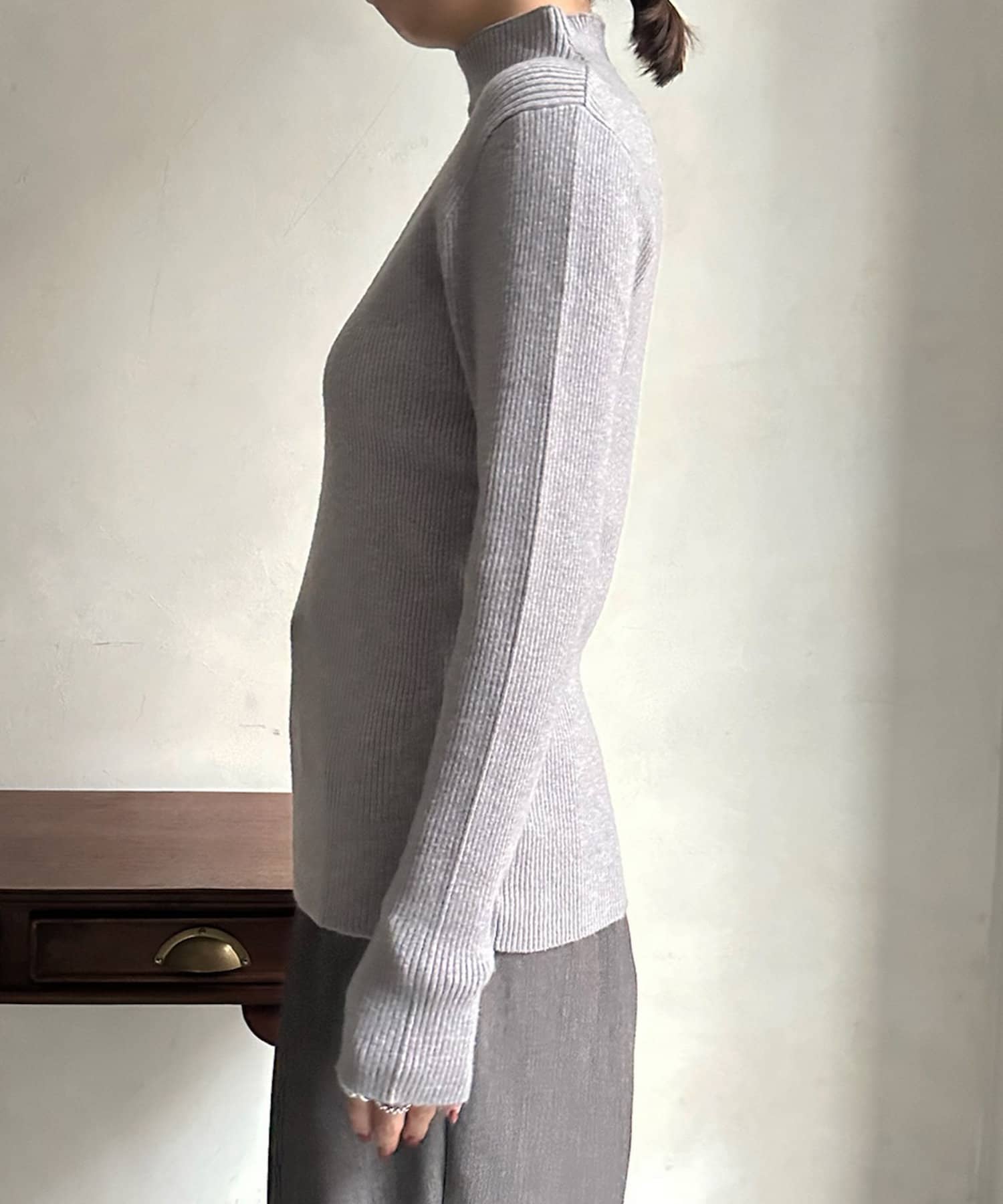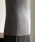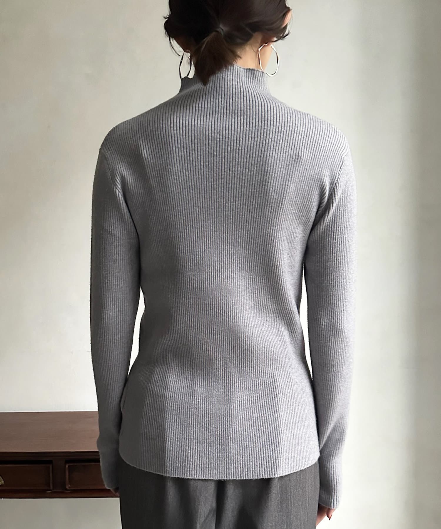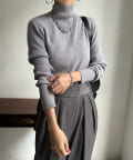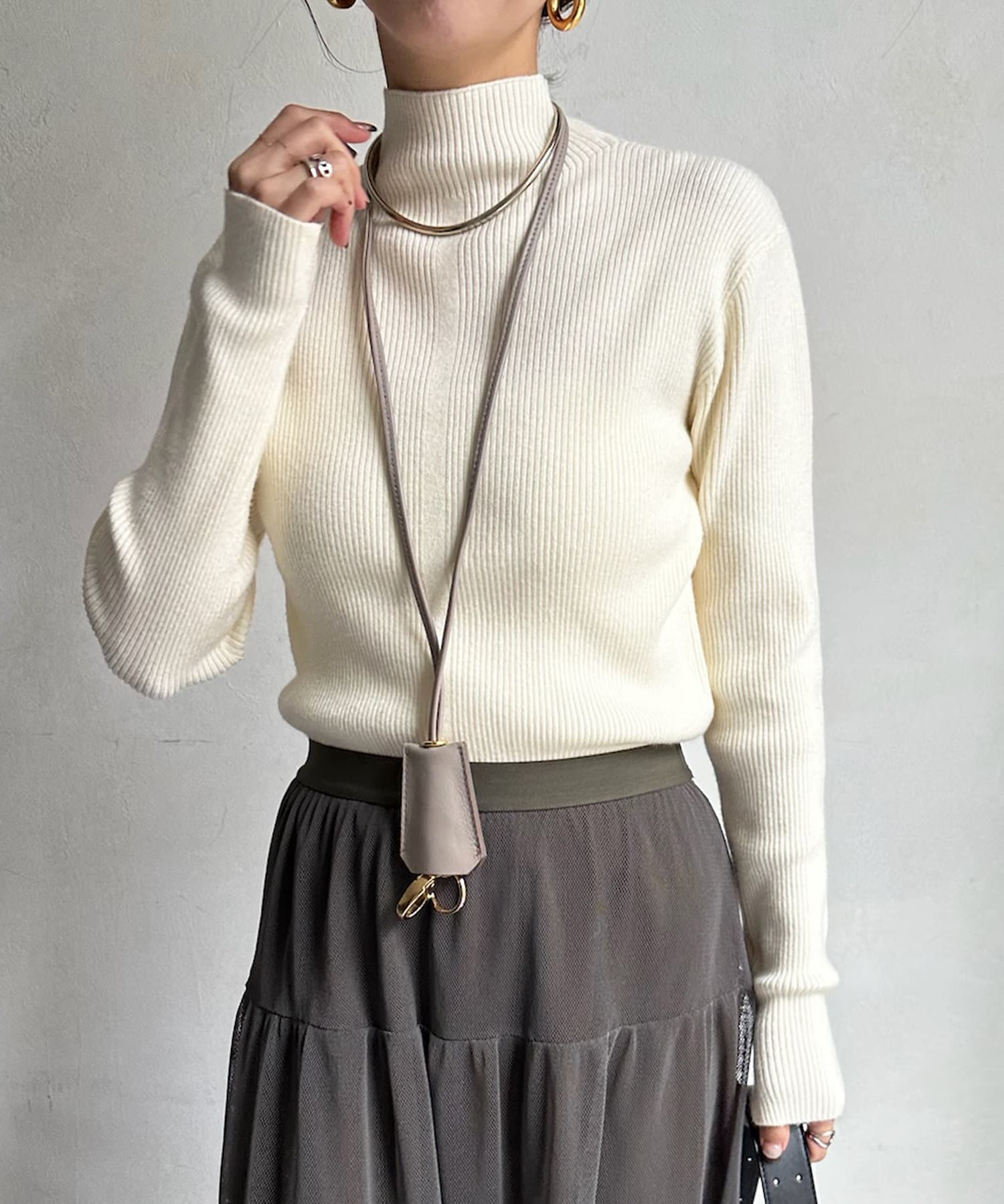 ネック部分を高くしすぎないことで、すっきりと決まるリブニット。