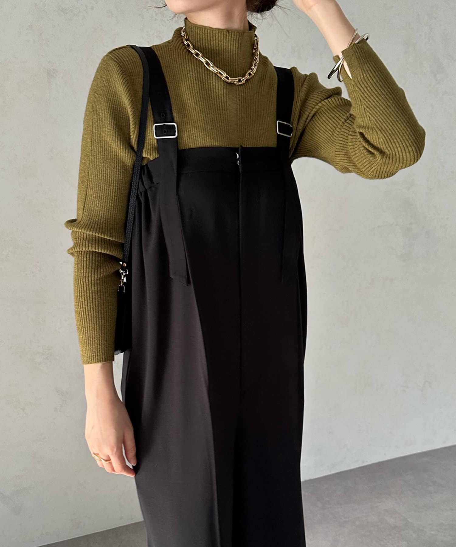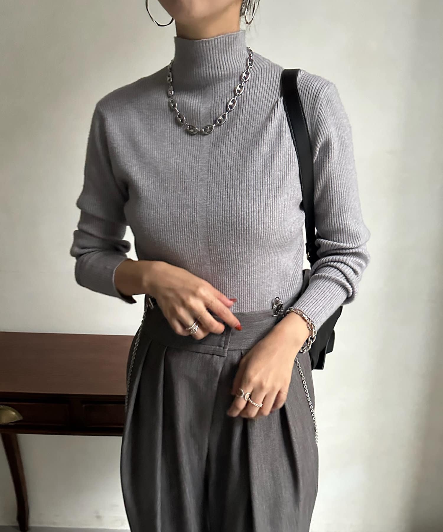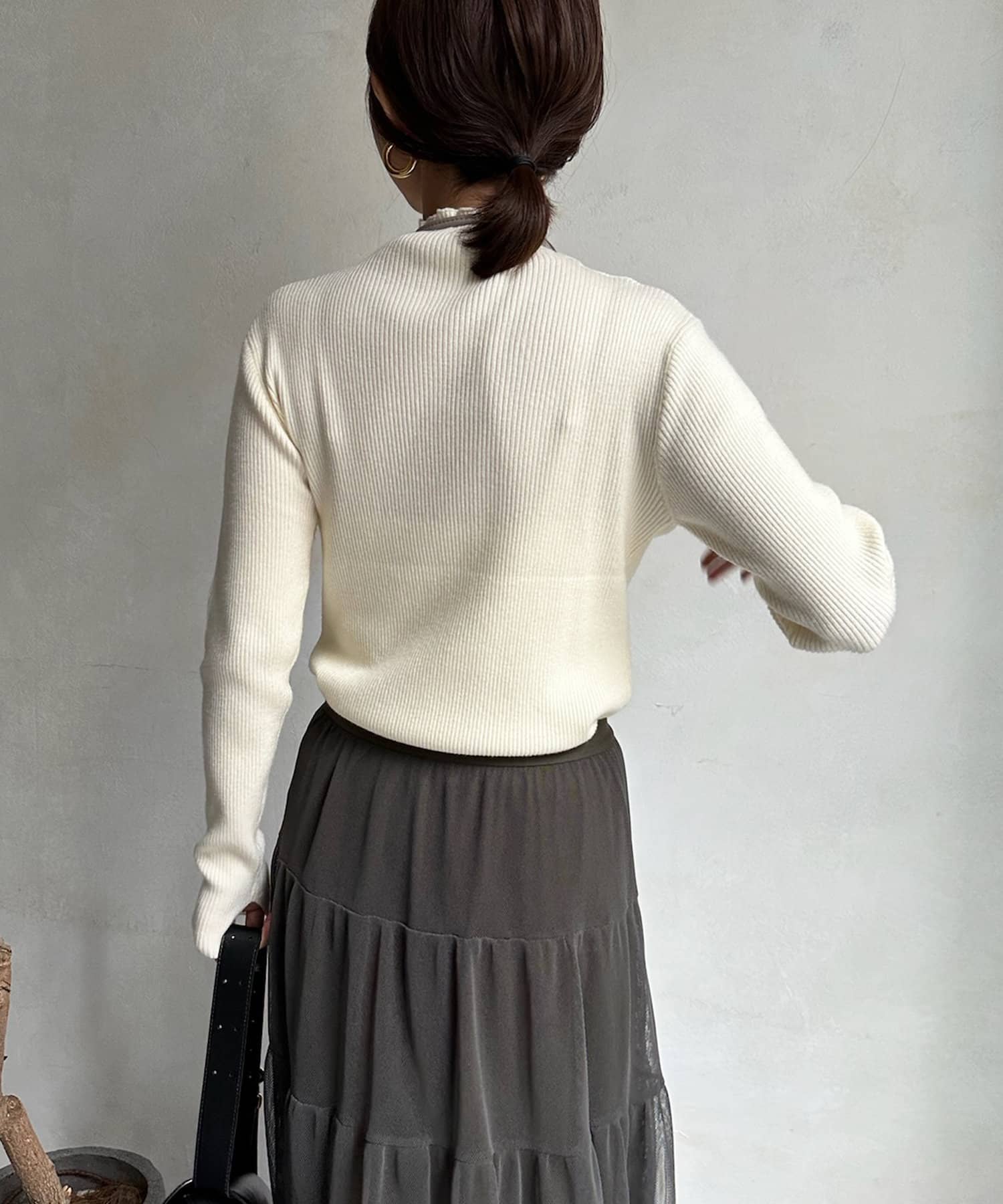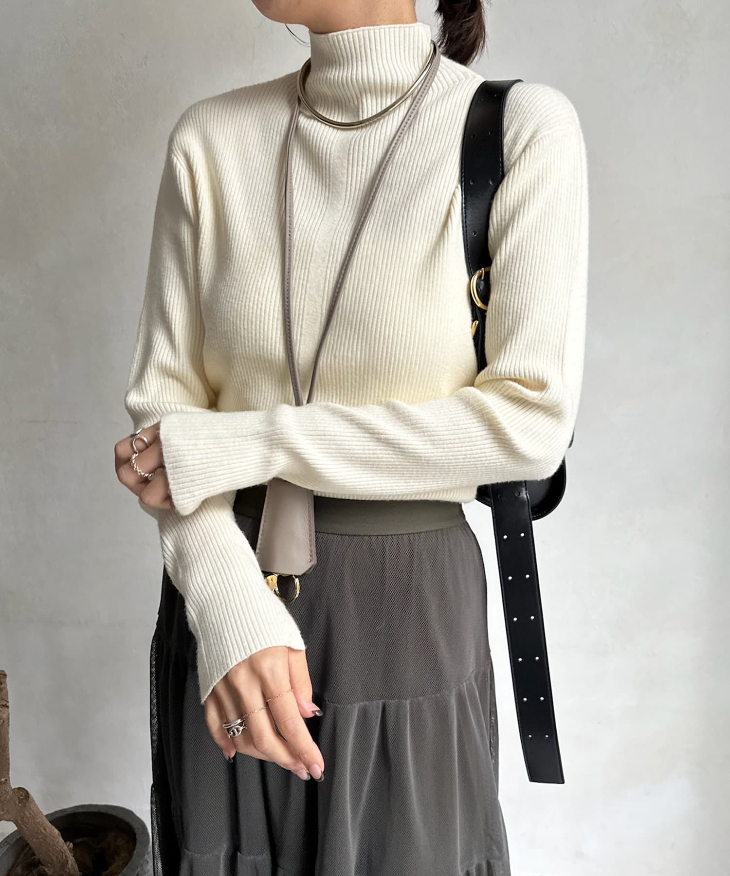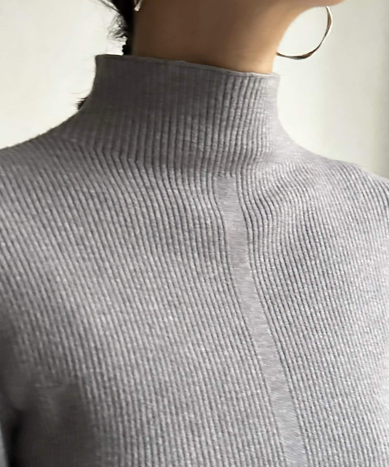 ネック部分を高くしすぎないことで、すっきりと決まるリブニット。