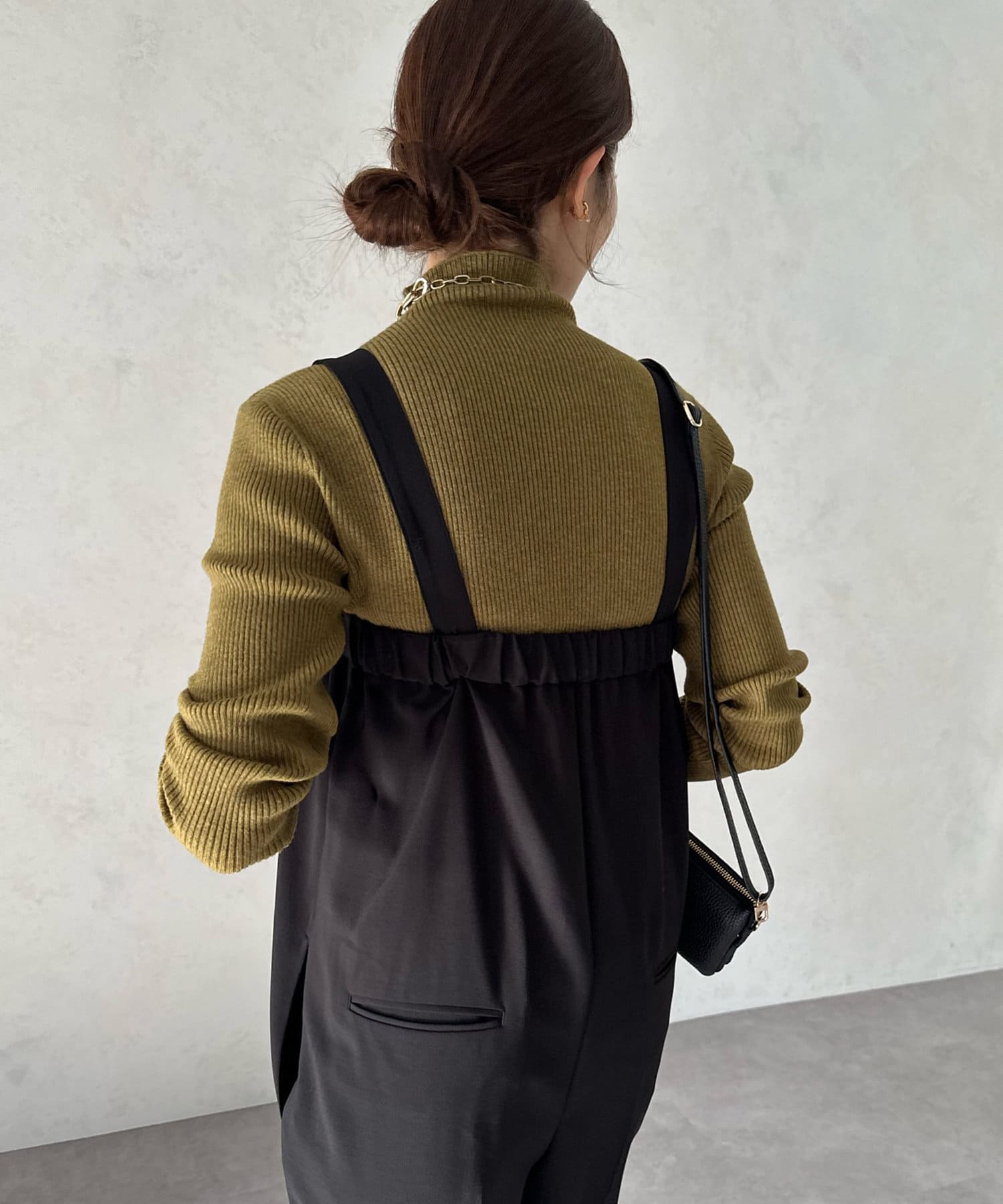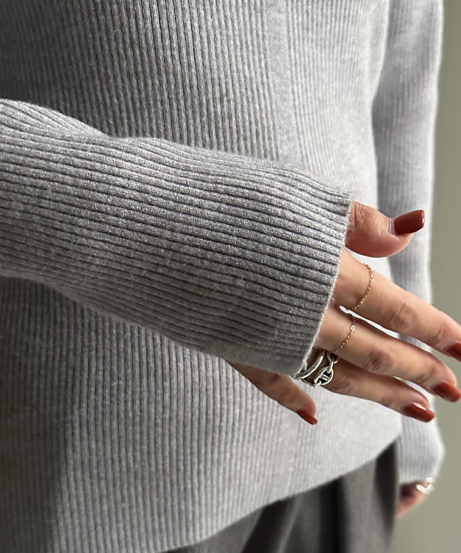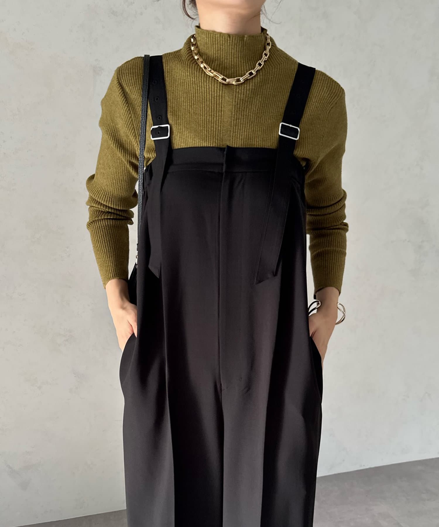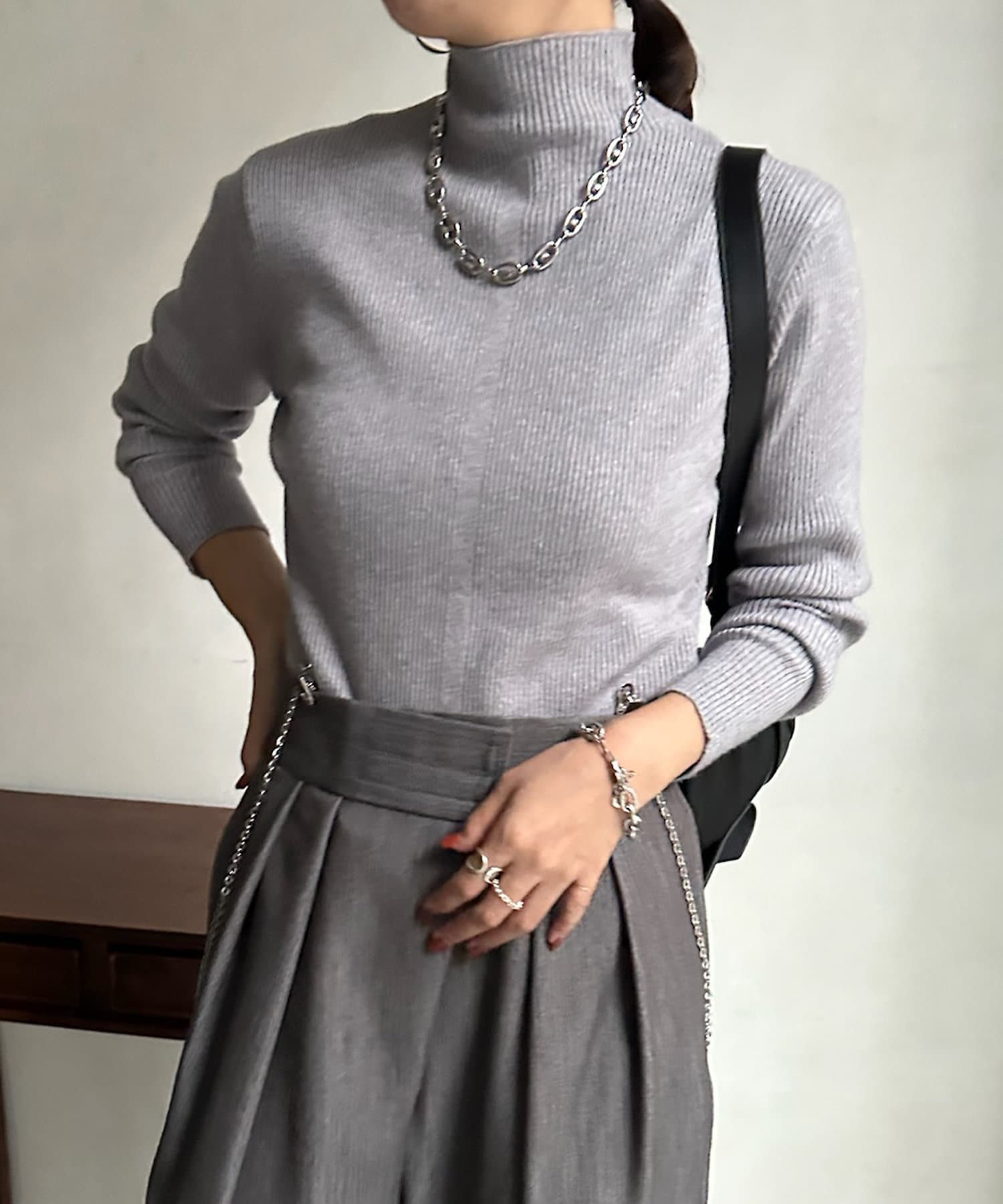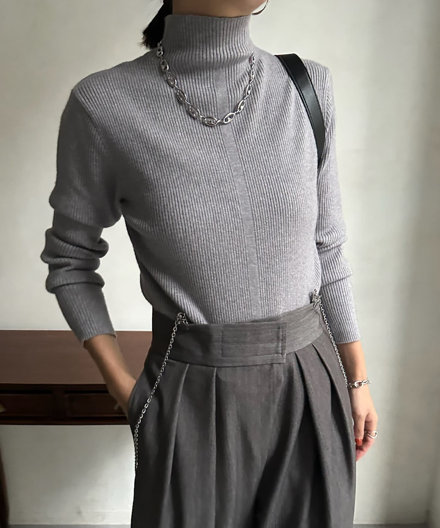 ネック部分を高くしすぎないことで、すっきりと決まるリブニット。