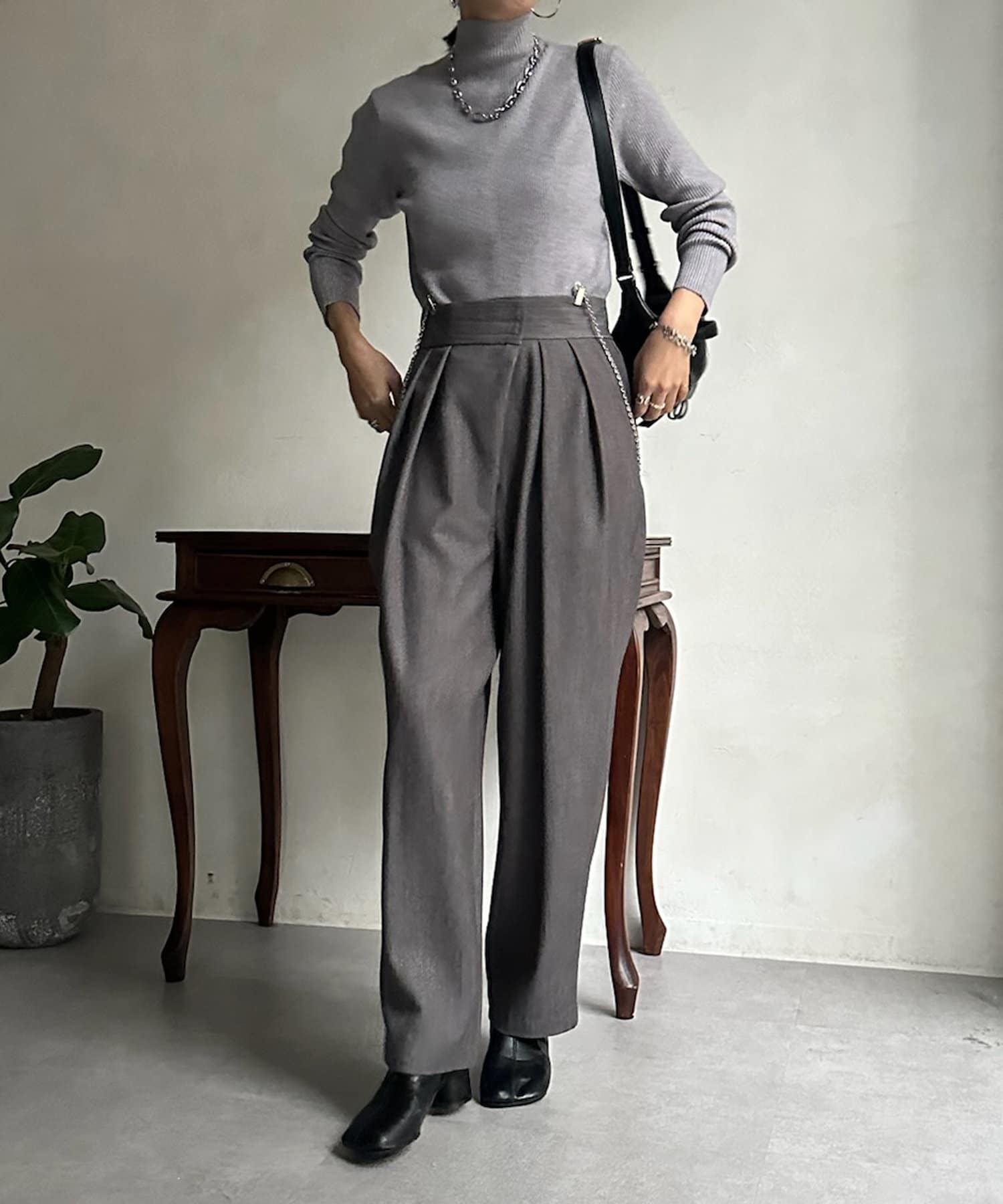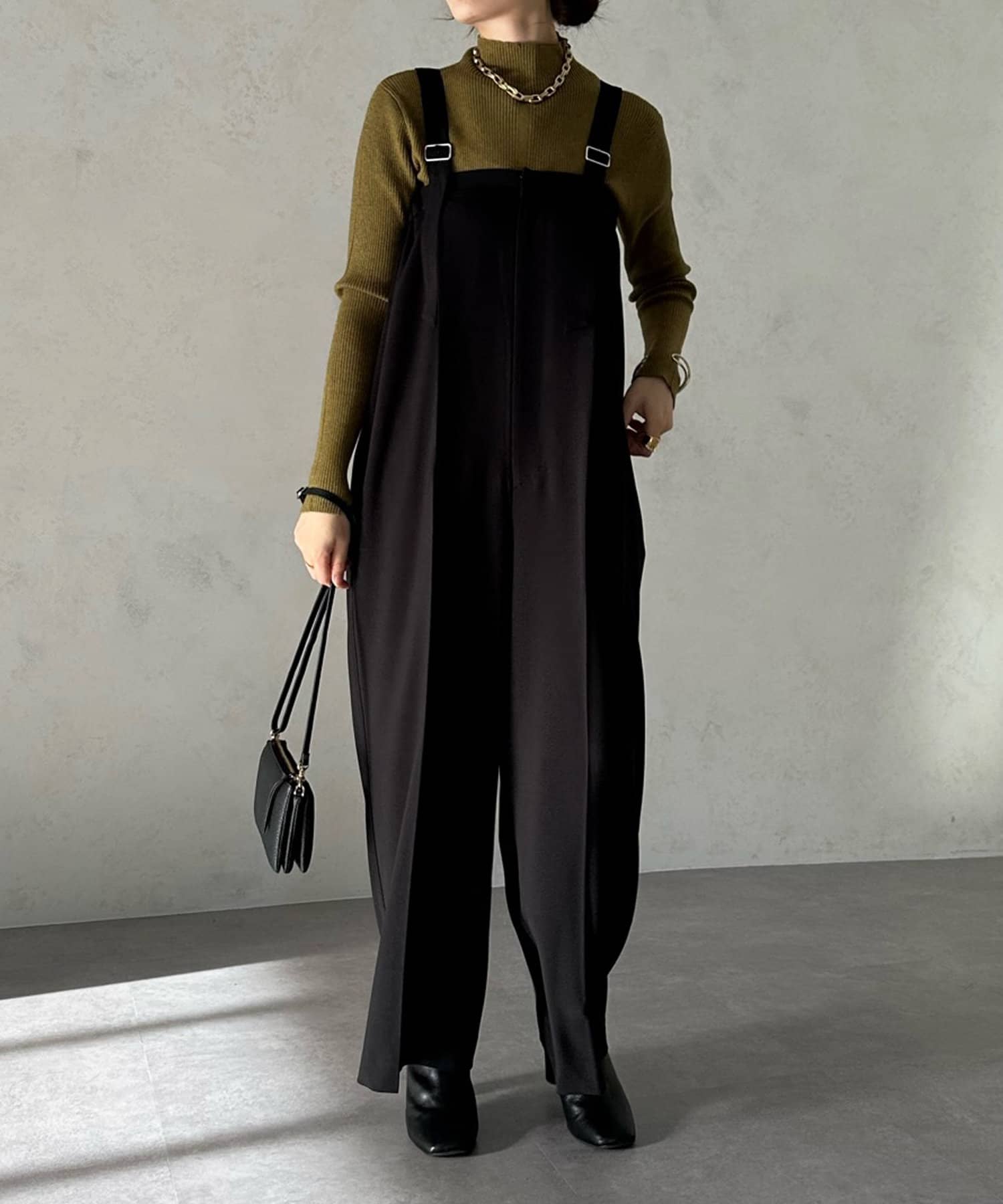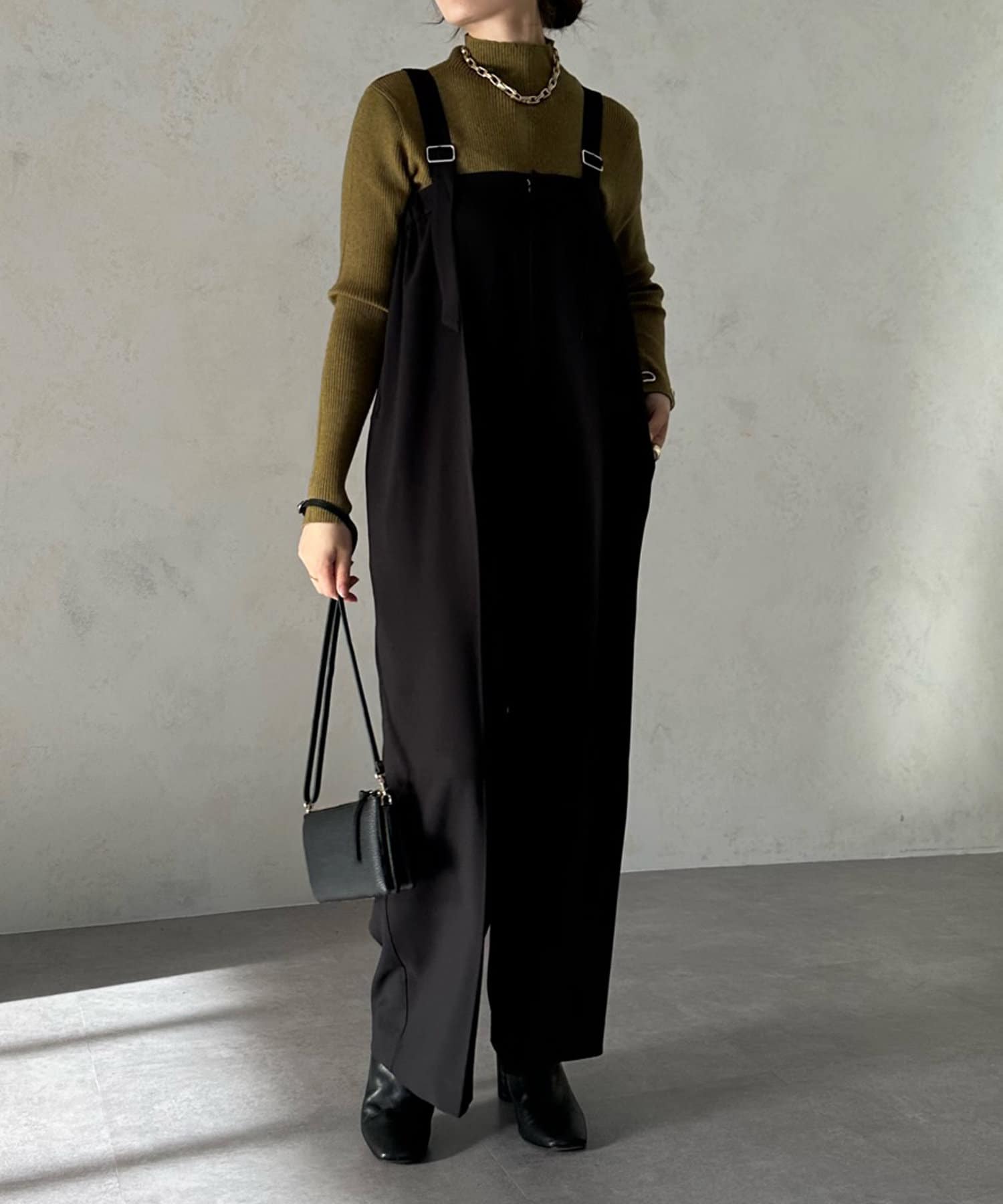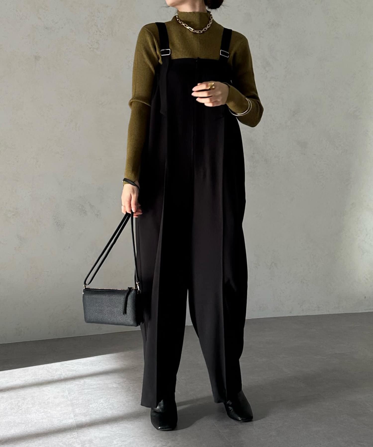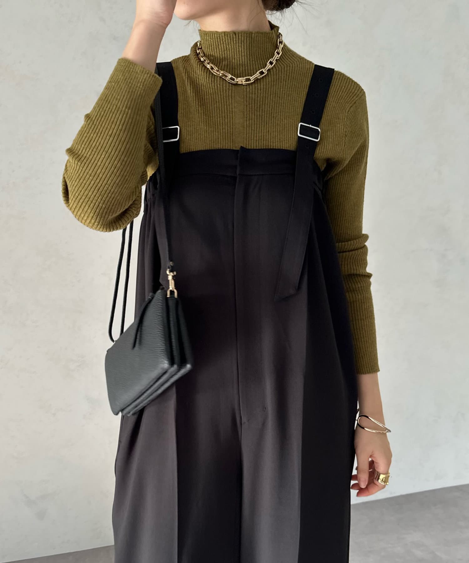 ネック部分を高くしすぎないことで、すっきりと決まるリブニット。