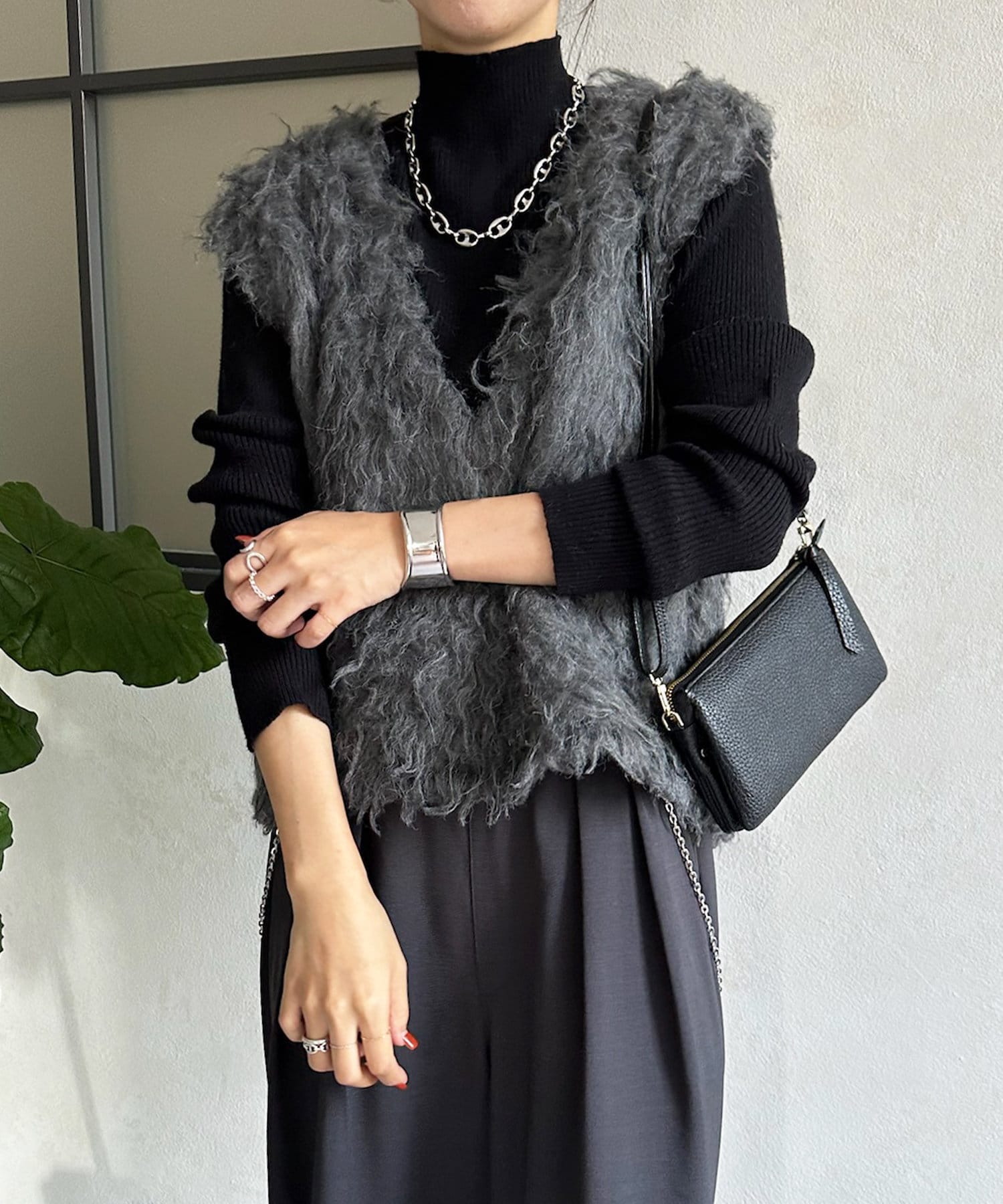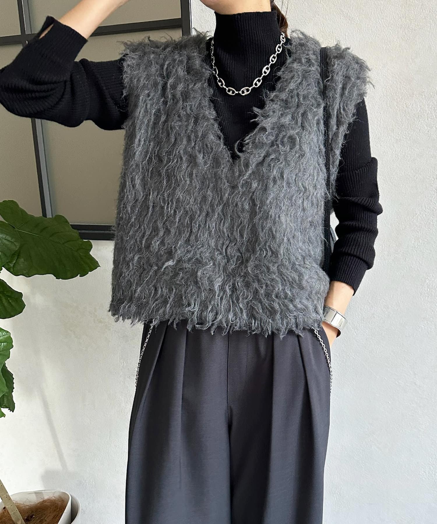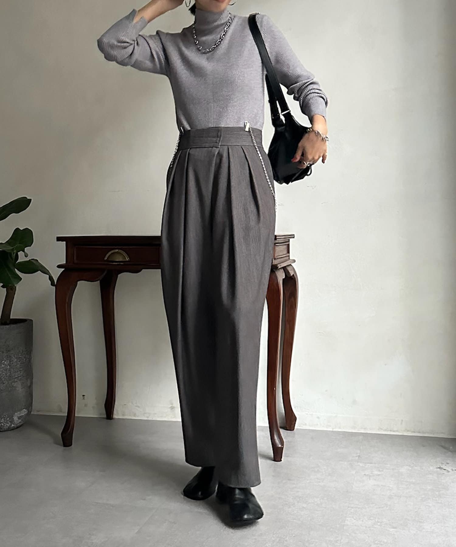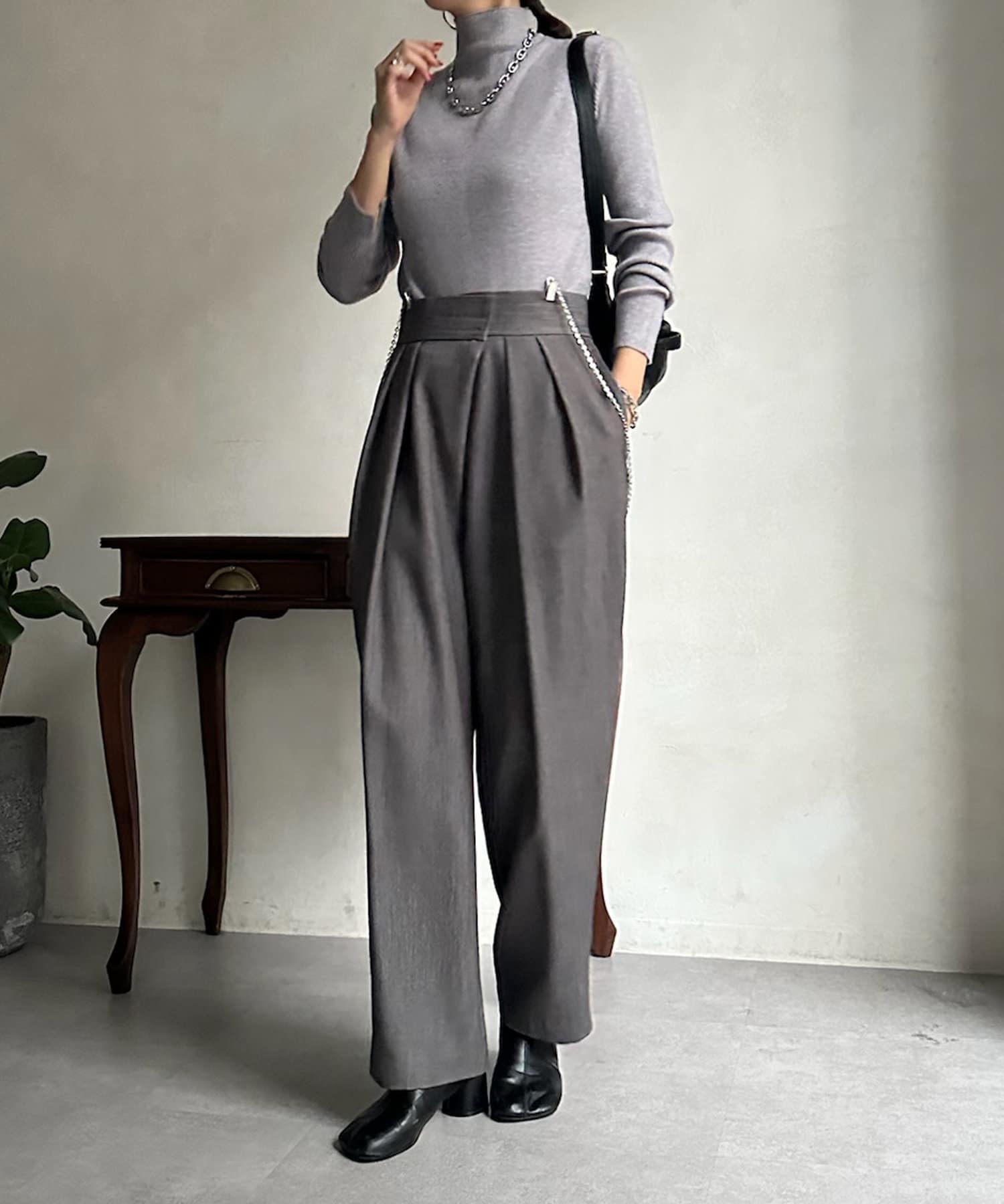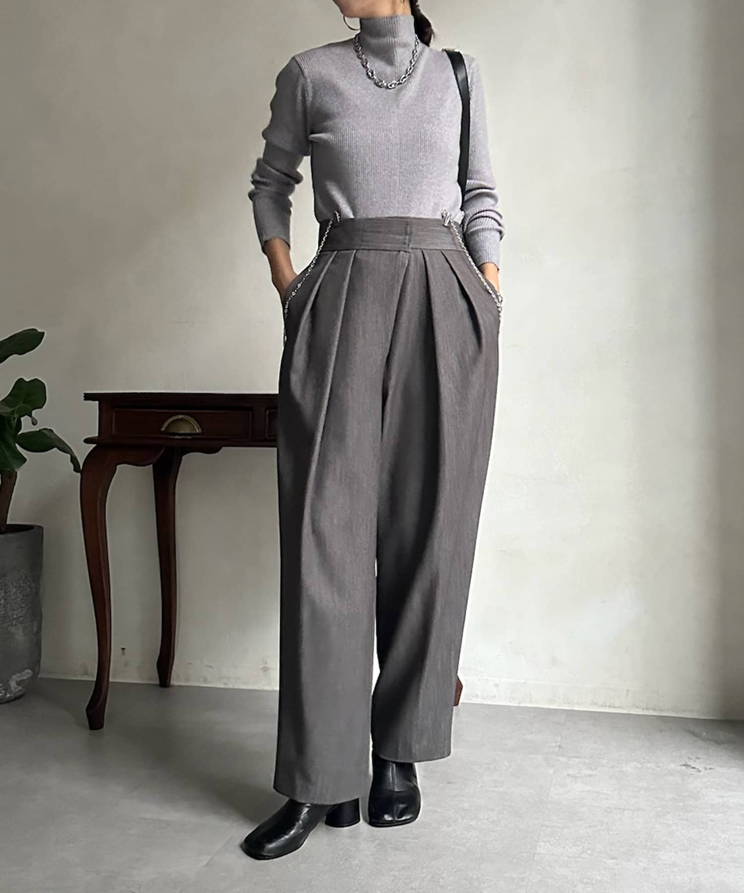 ネック部分を高くしすぎないことで、すっきりと決まるリブニット。