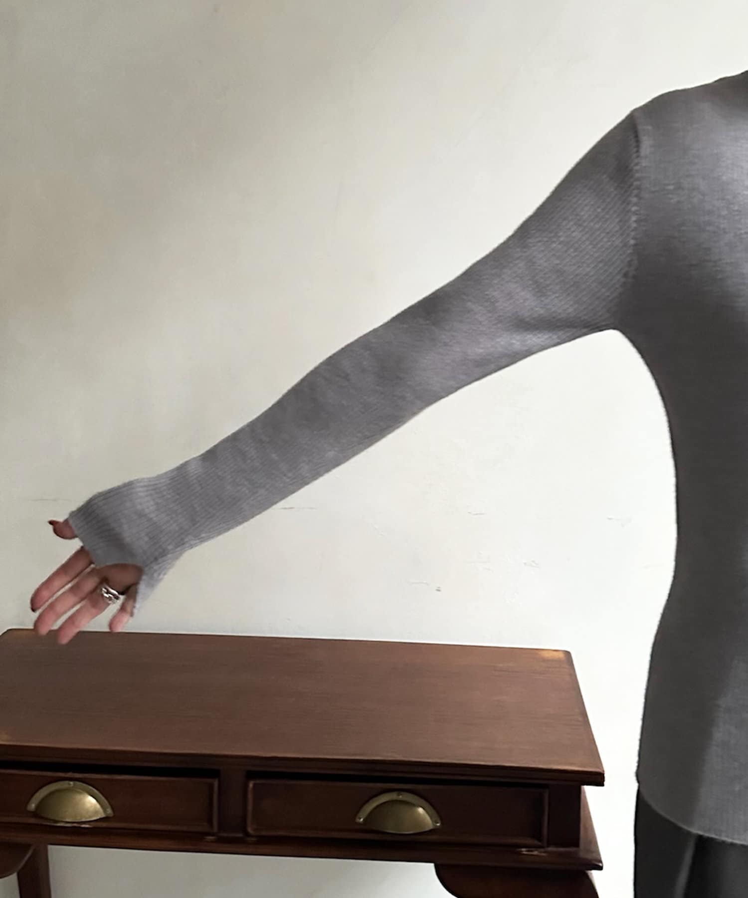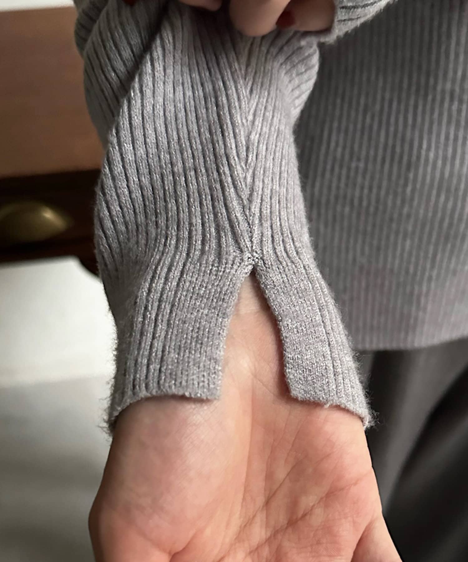 首の高さも絶妙で、身体にもフィットし過ぎず、柔らかい、手の甲までくる袖丈にスリット入りがおしゃれ。色違いで欲しい。