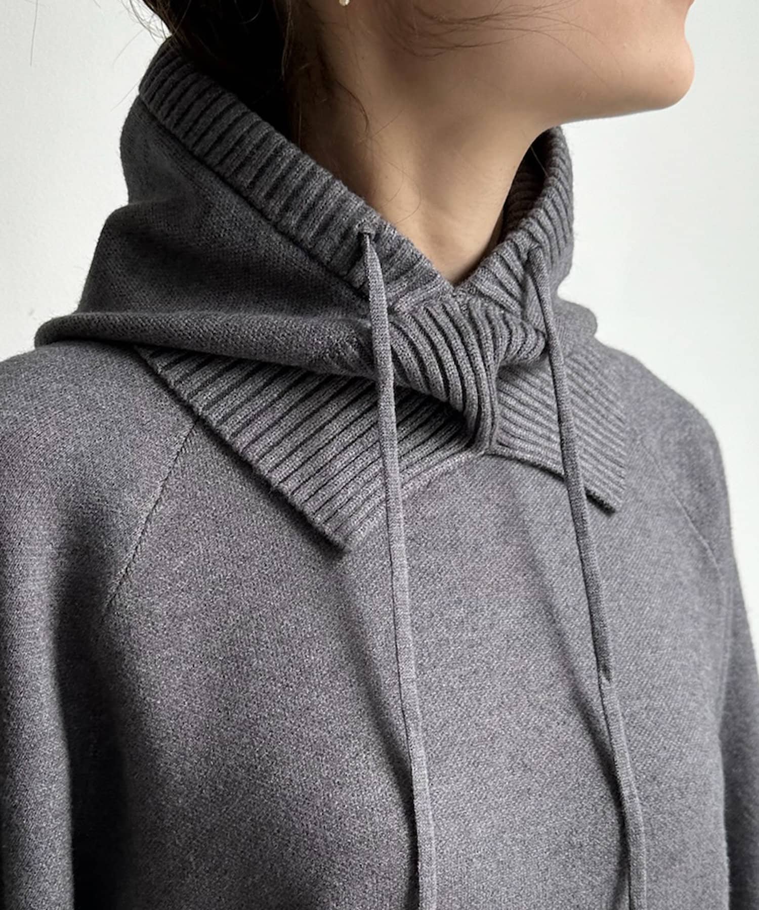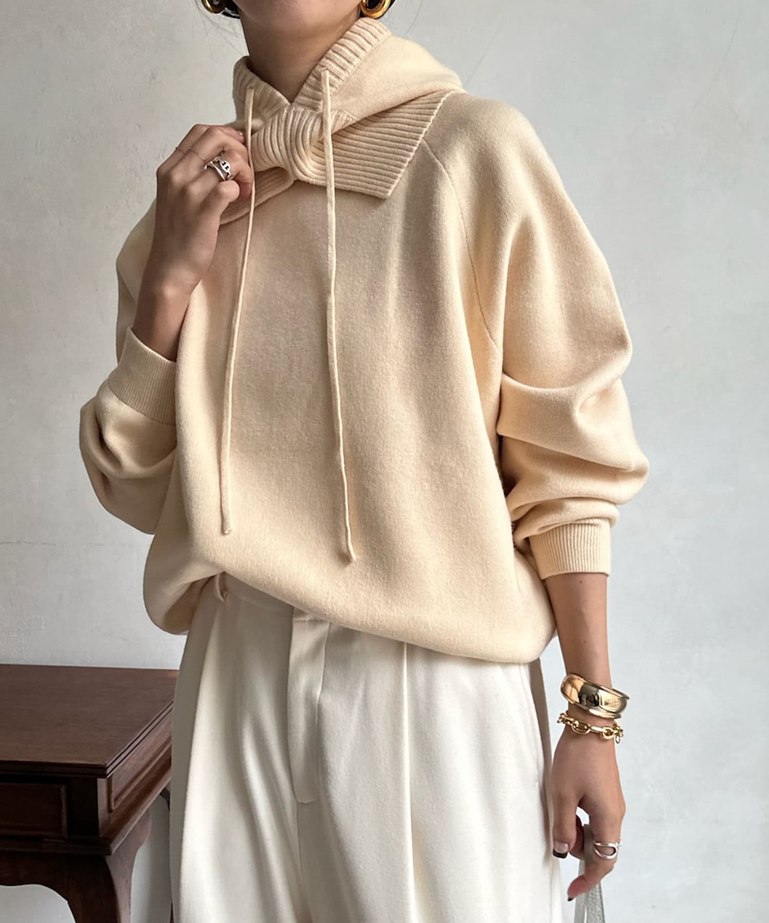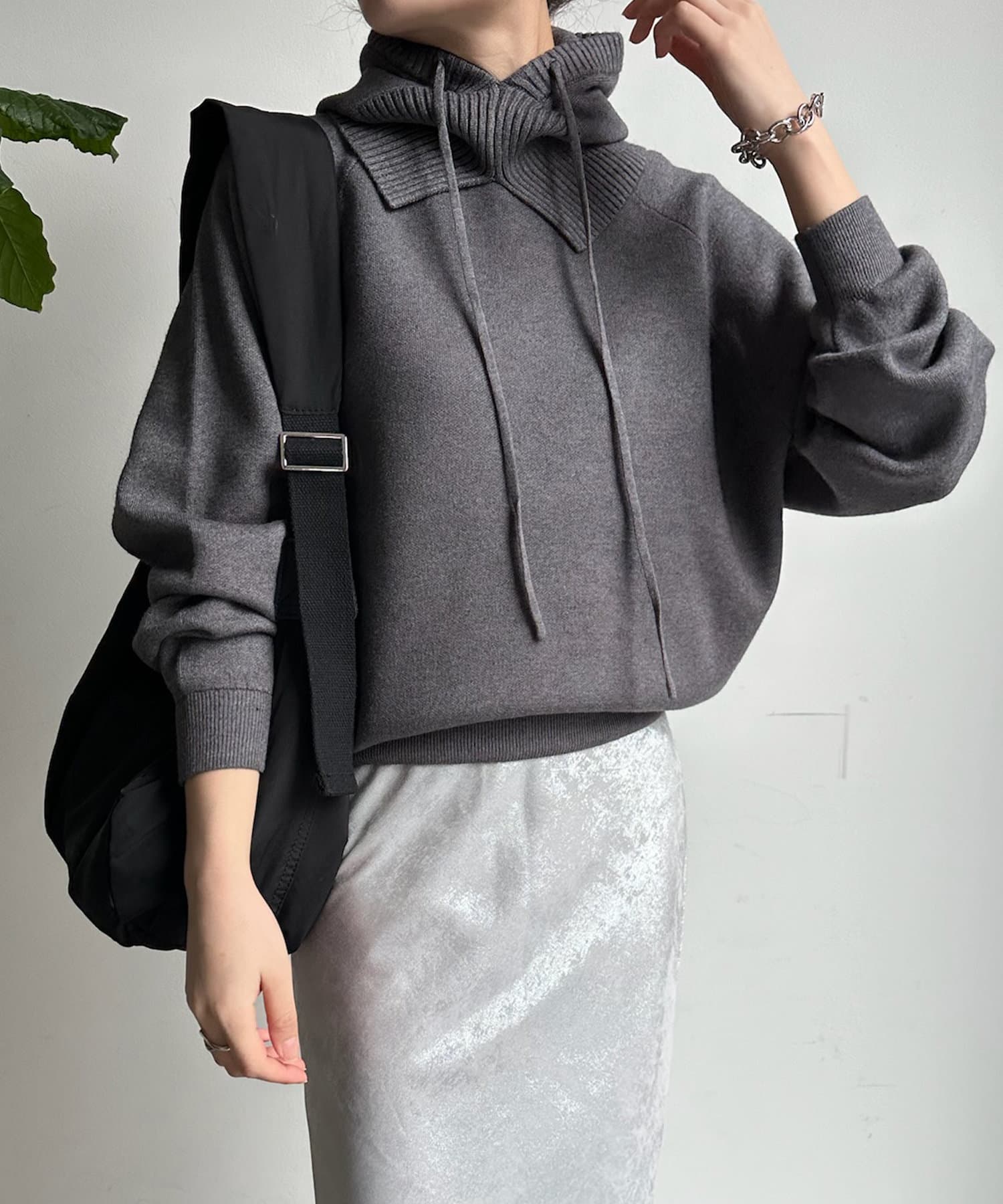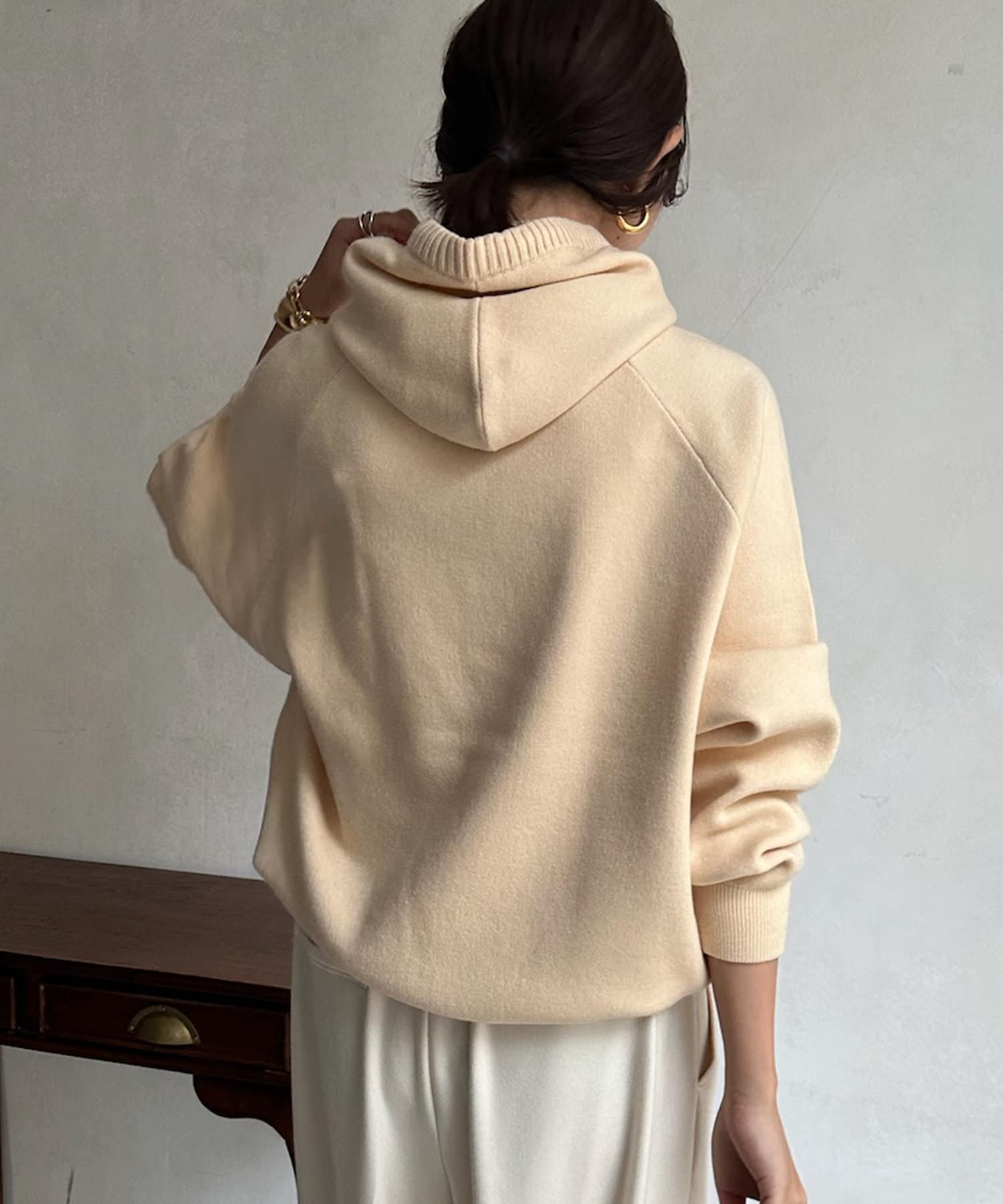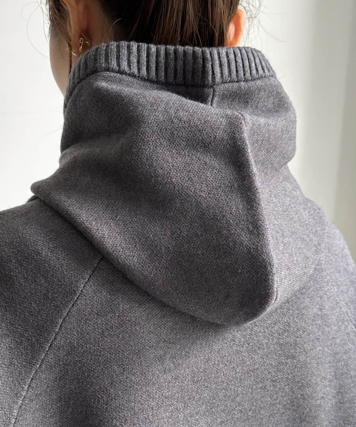 同色・同素材の2つを身に着けるだけで、パーカーのような見え方に。