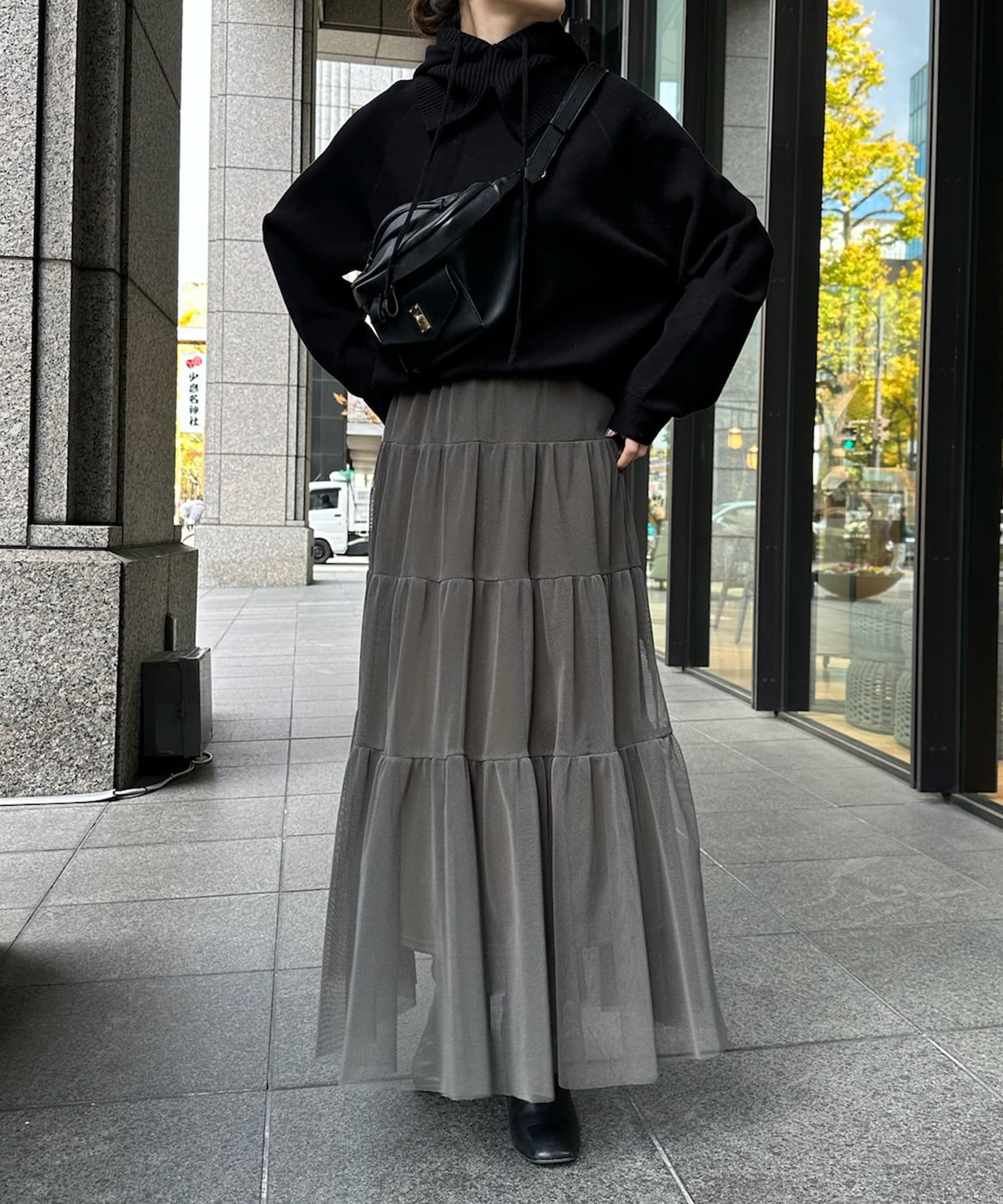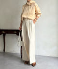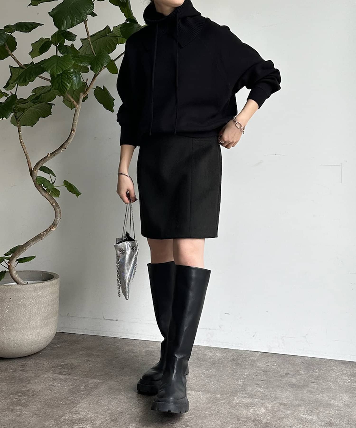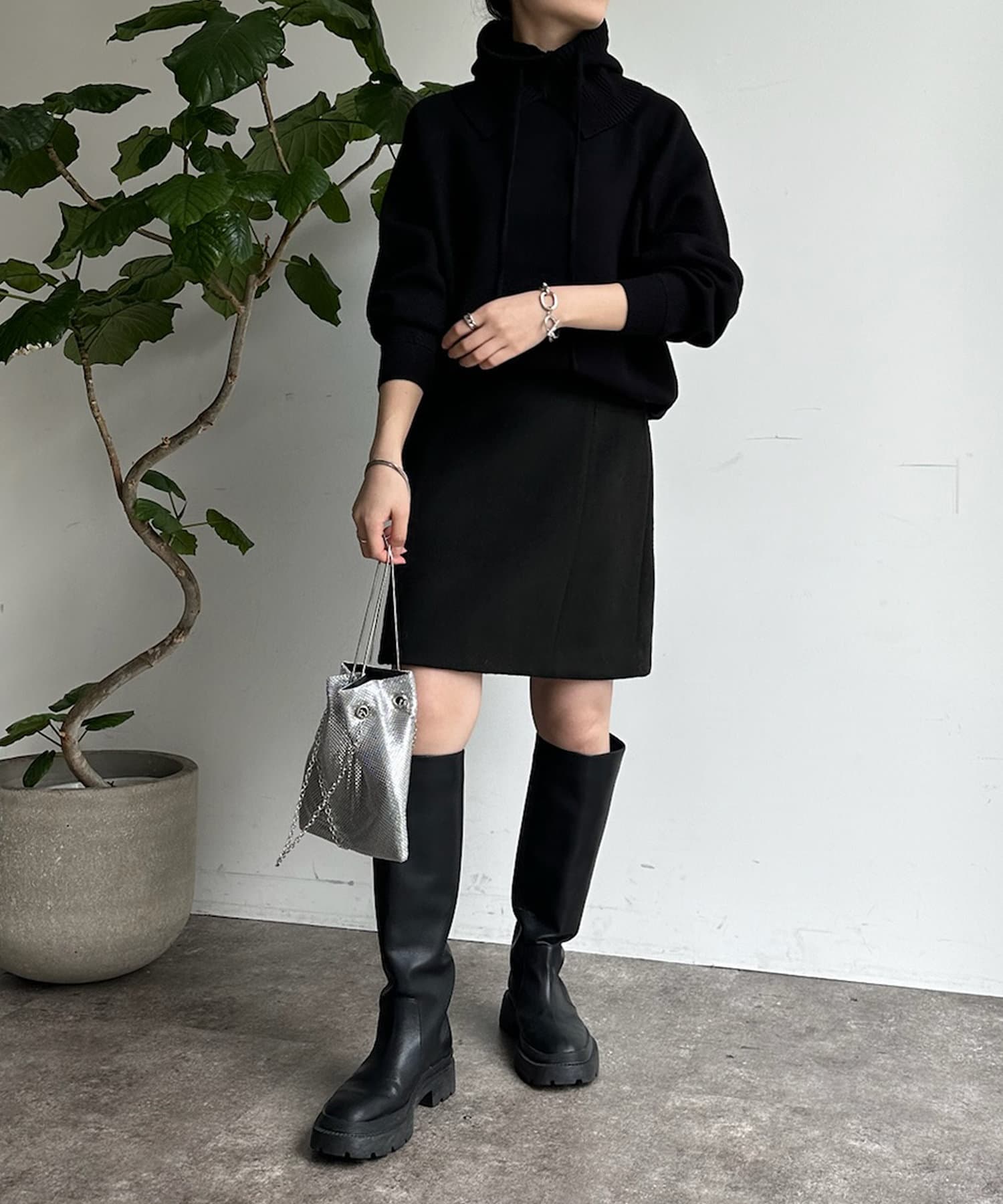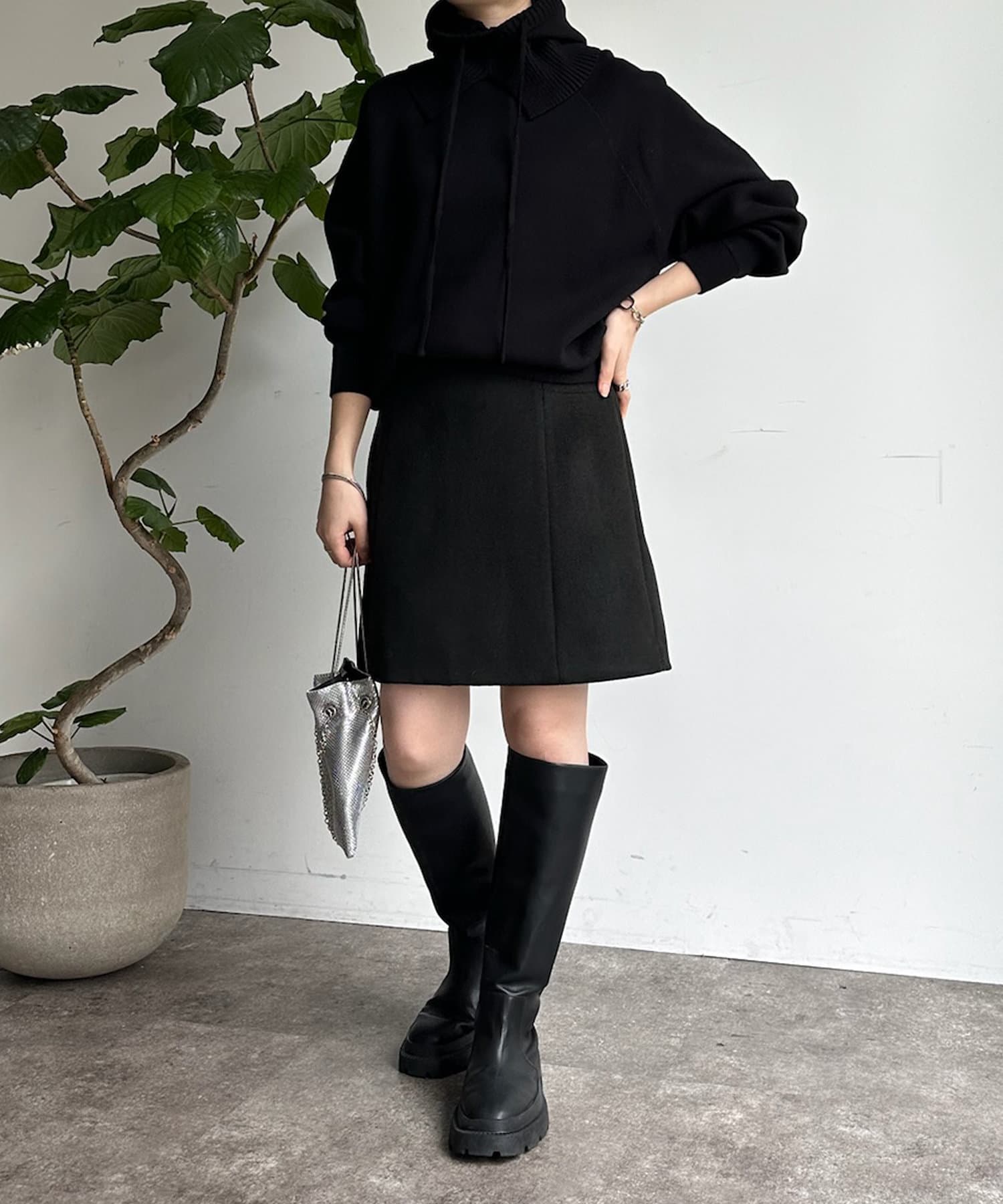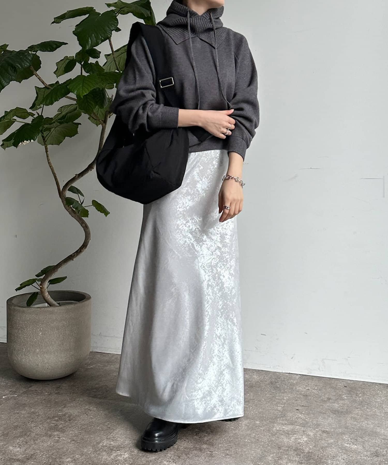同色・同素材の2つを身に着けるだけで、パーカーのような見え方に。