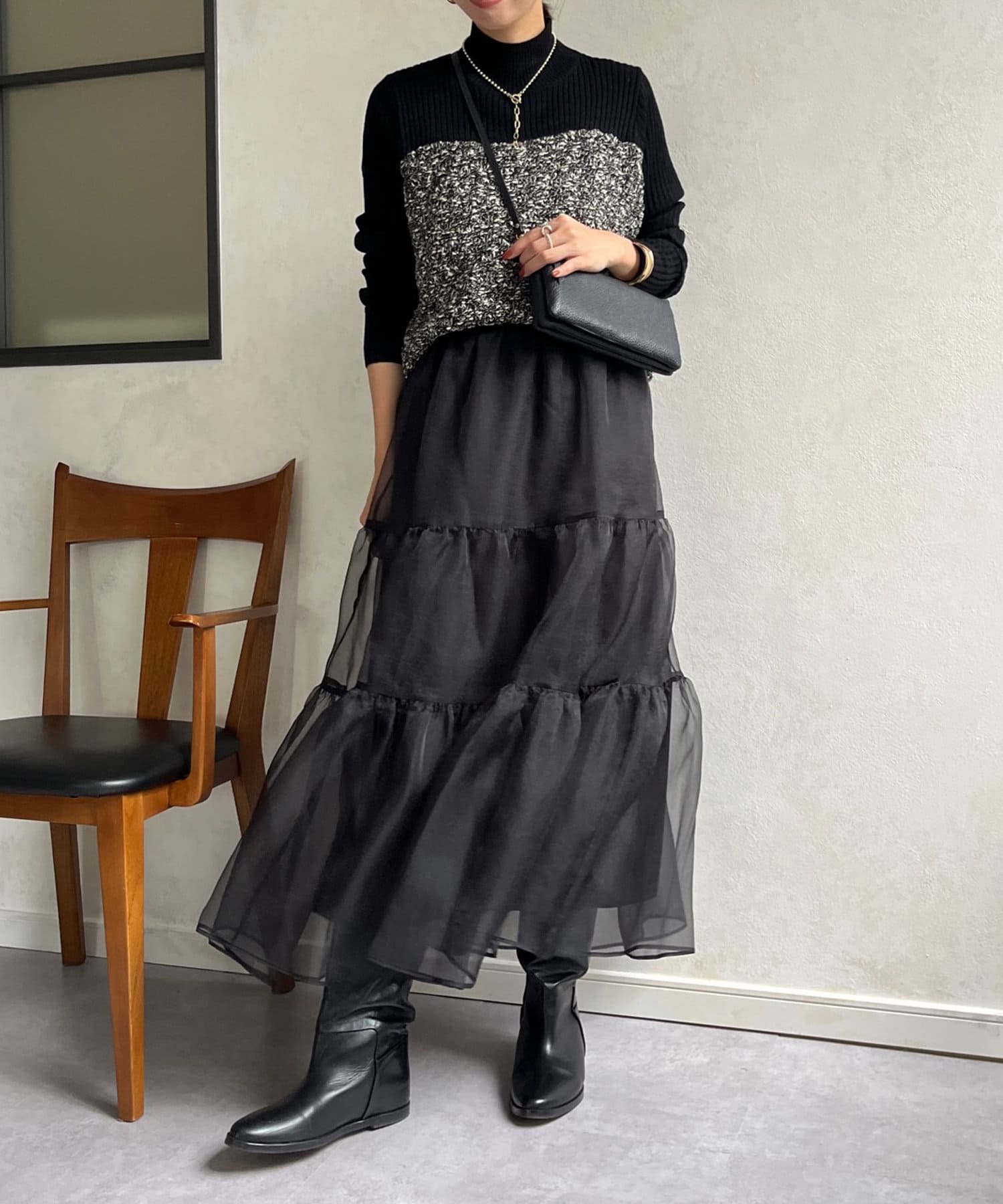 程良くゆとりはありつつ、ビスチェデザインが引き締まった印象に。今年らしいツイード素材で、カジュアルになり過ぎないデザインに仕上げました。