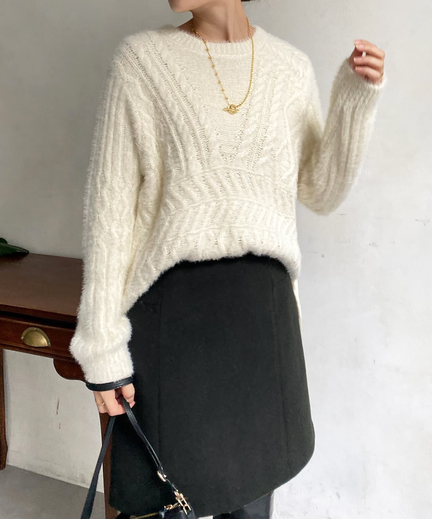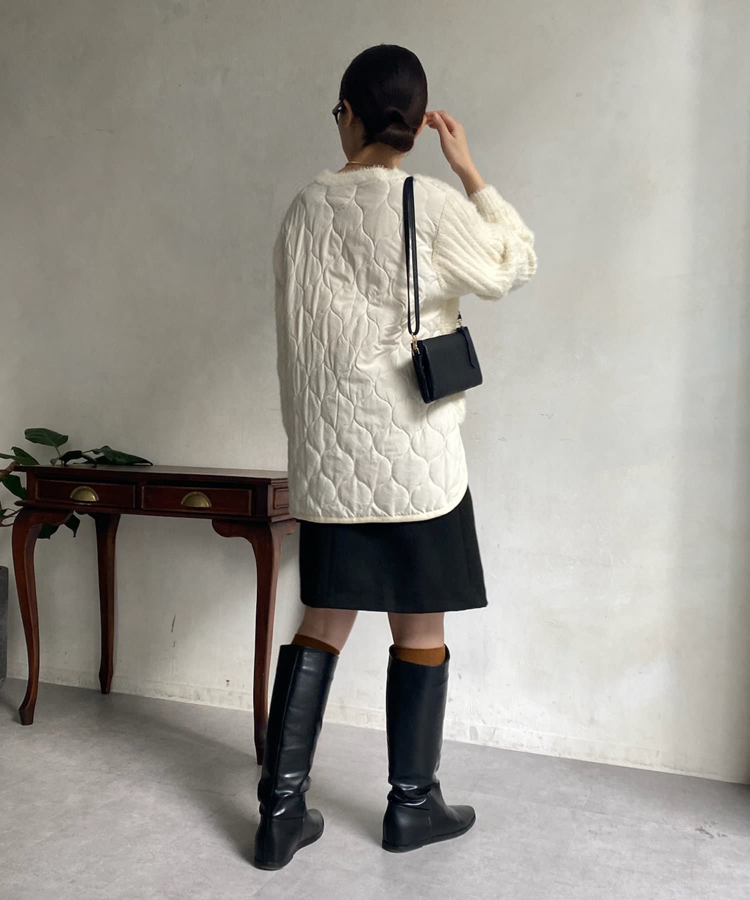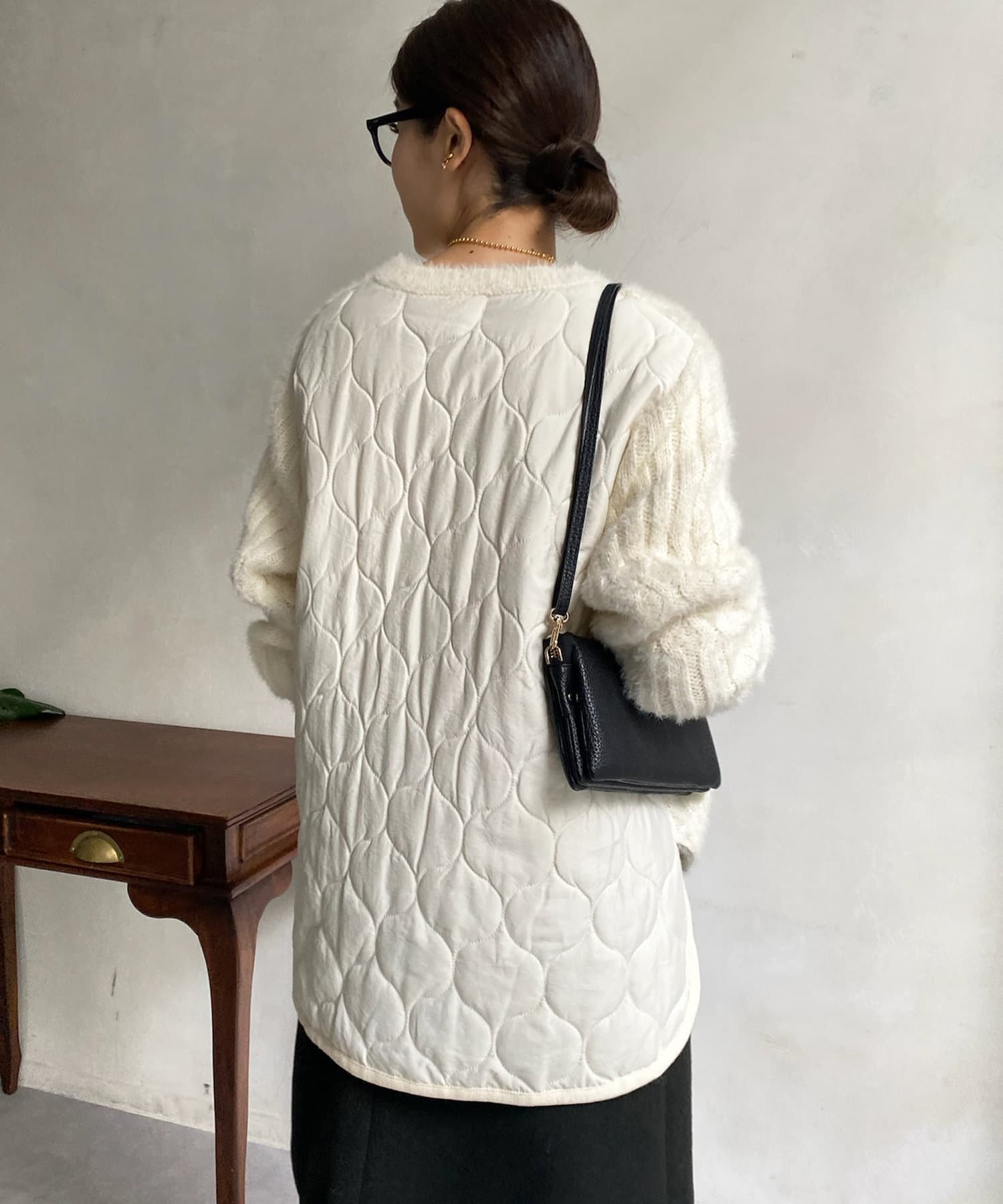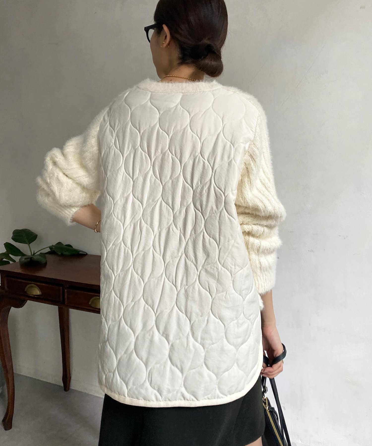 フロントは毛足感のある素材がかわいいニット。バックはキルティングの切り替えたデザインが魅力の1着。