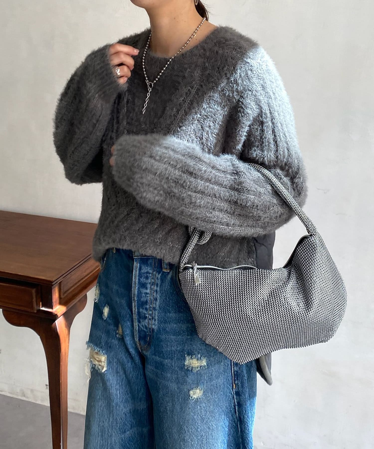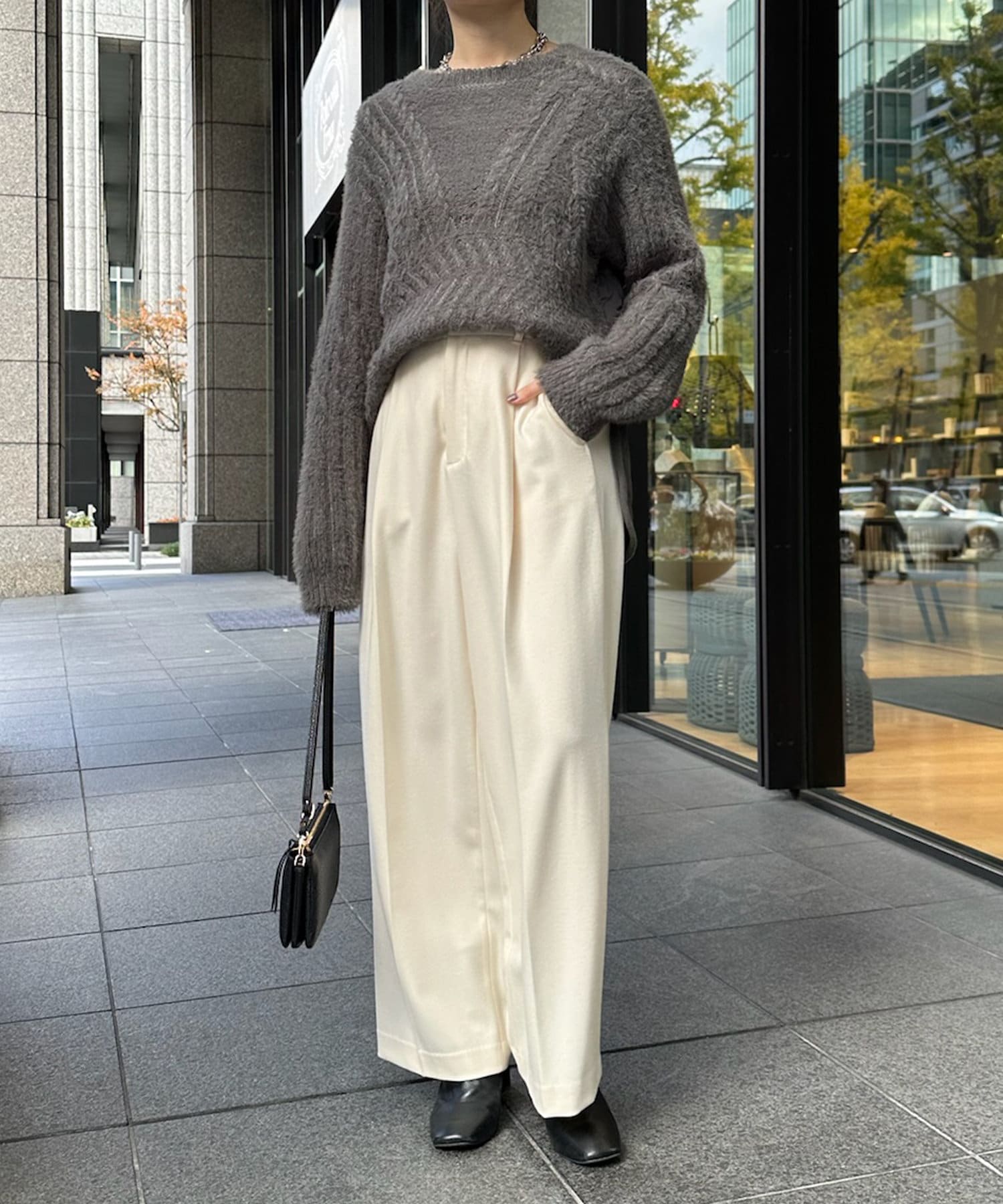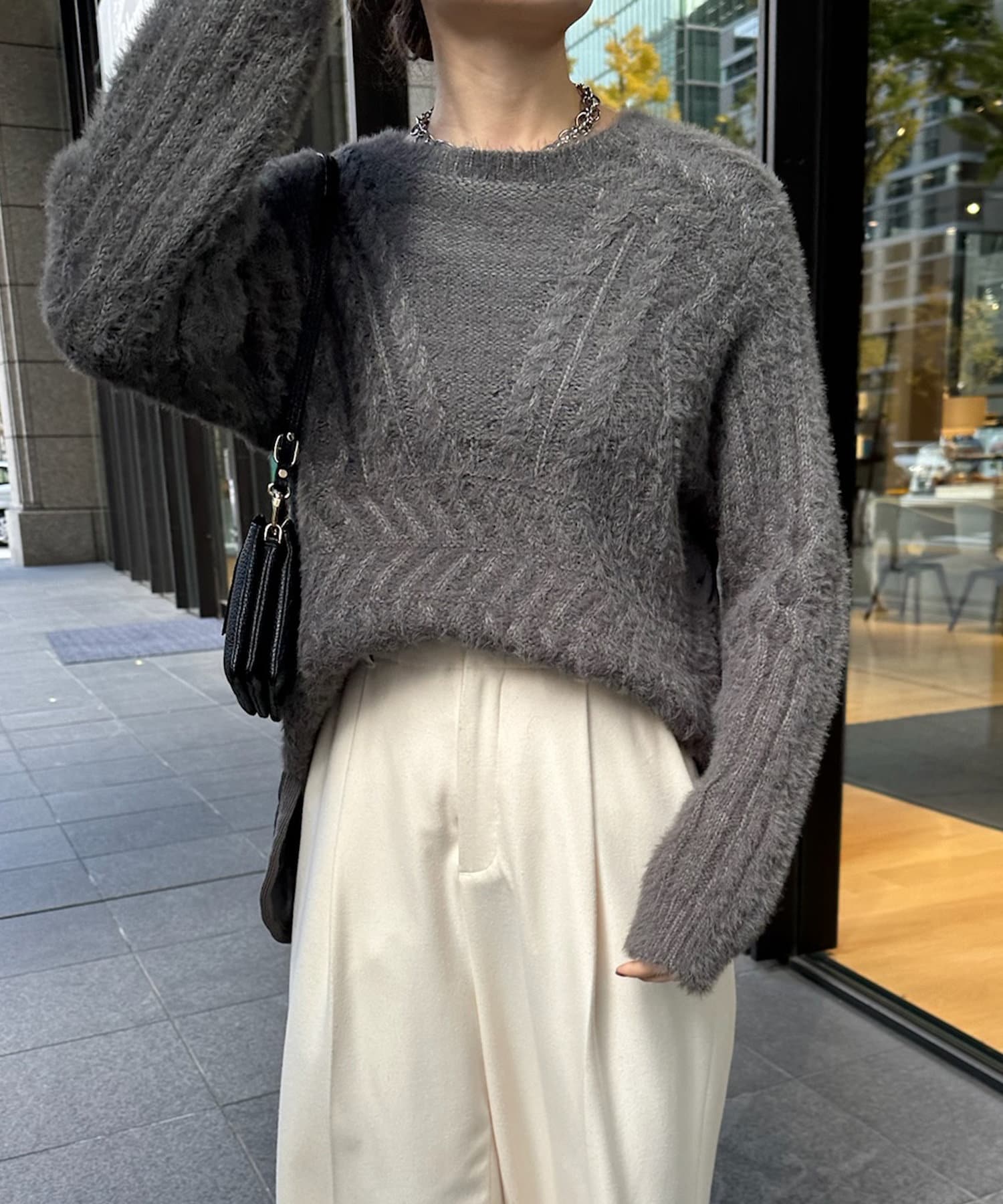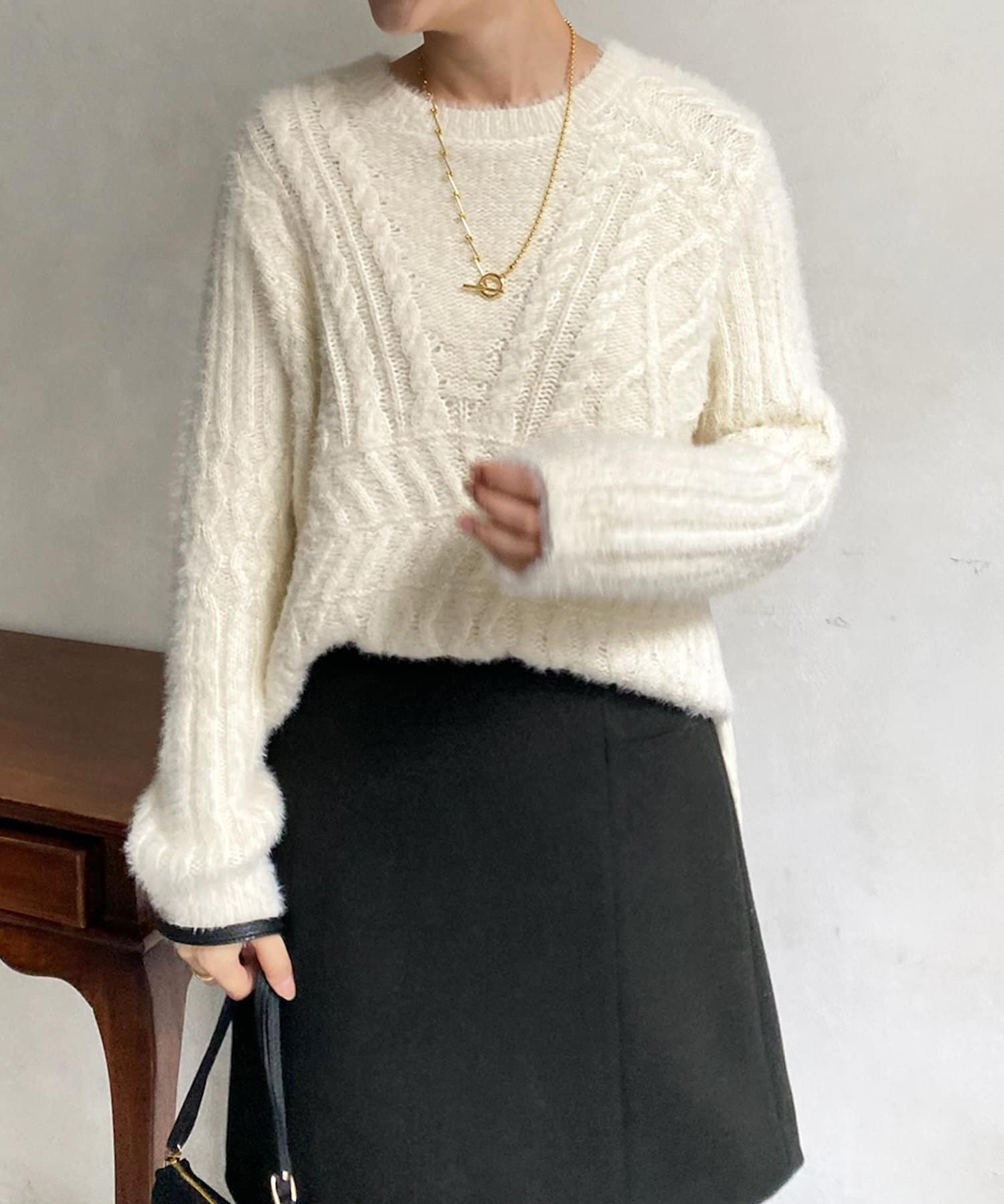 フロントは毛足感のある素材がかわいいニット。バックはキルティングの切り替えたデザインが魅力の1着。