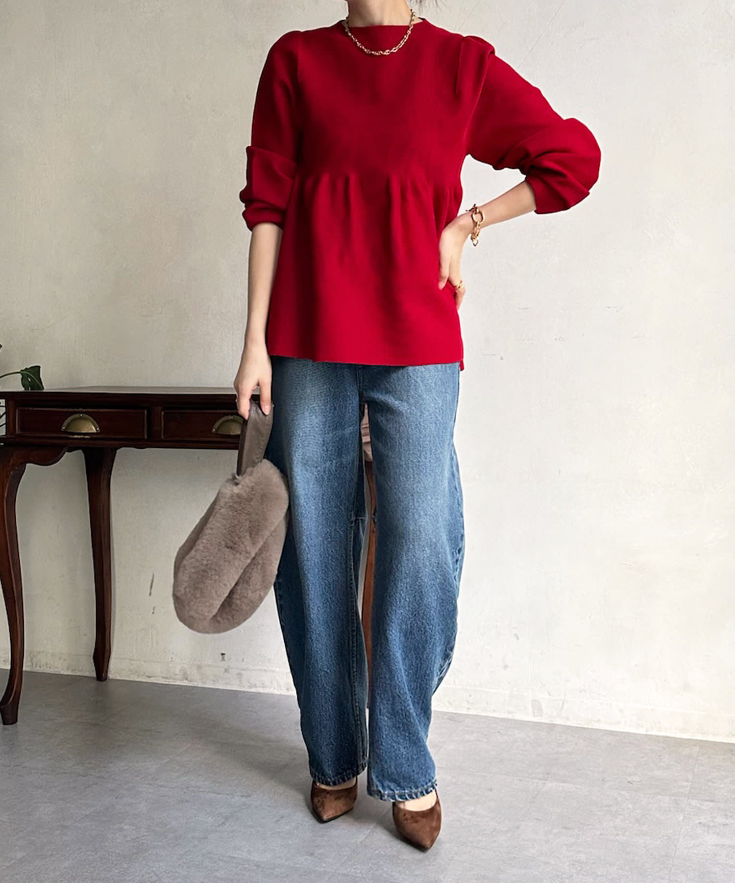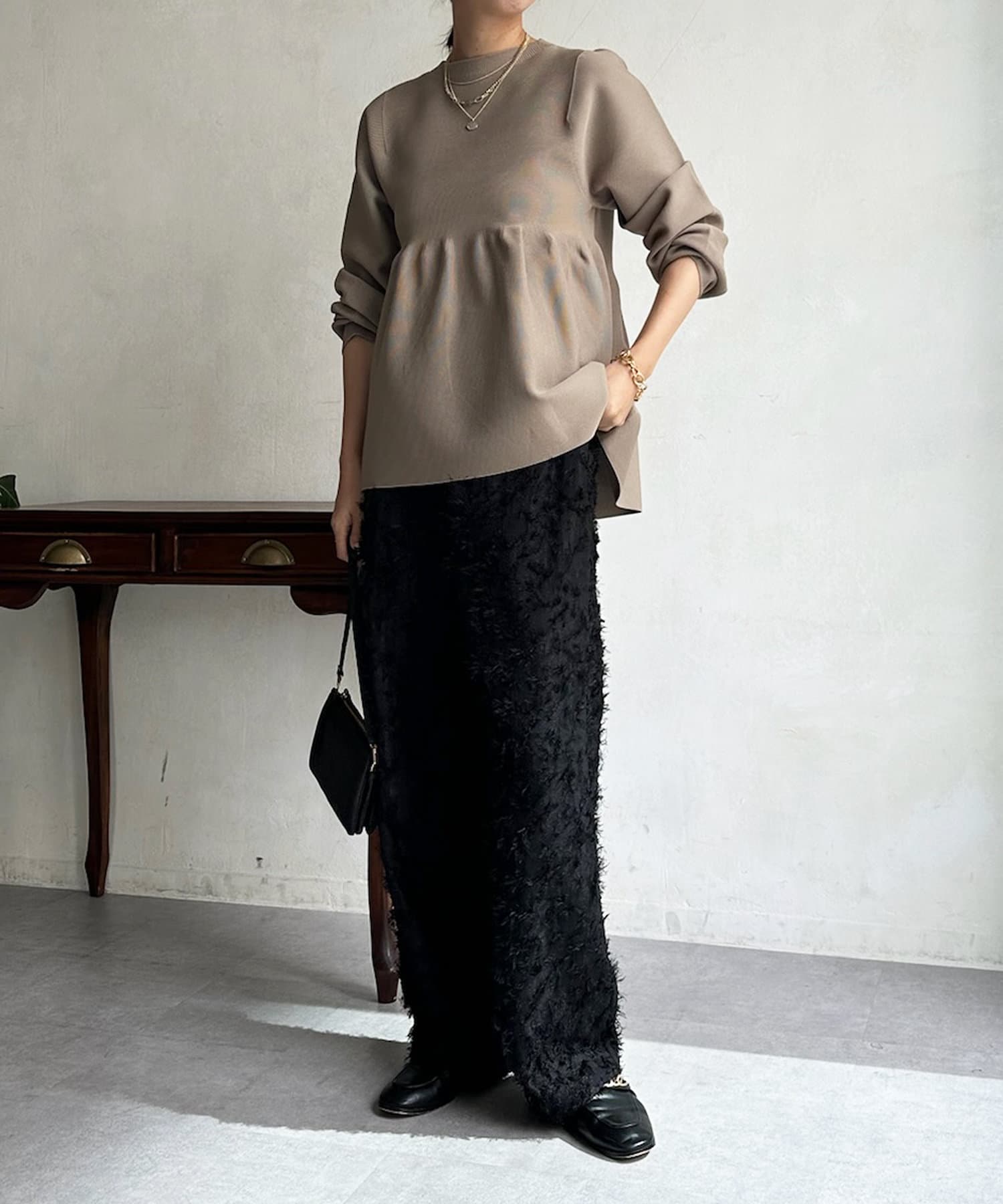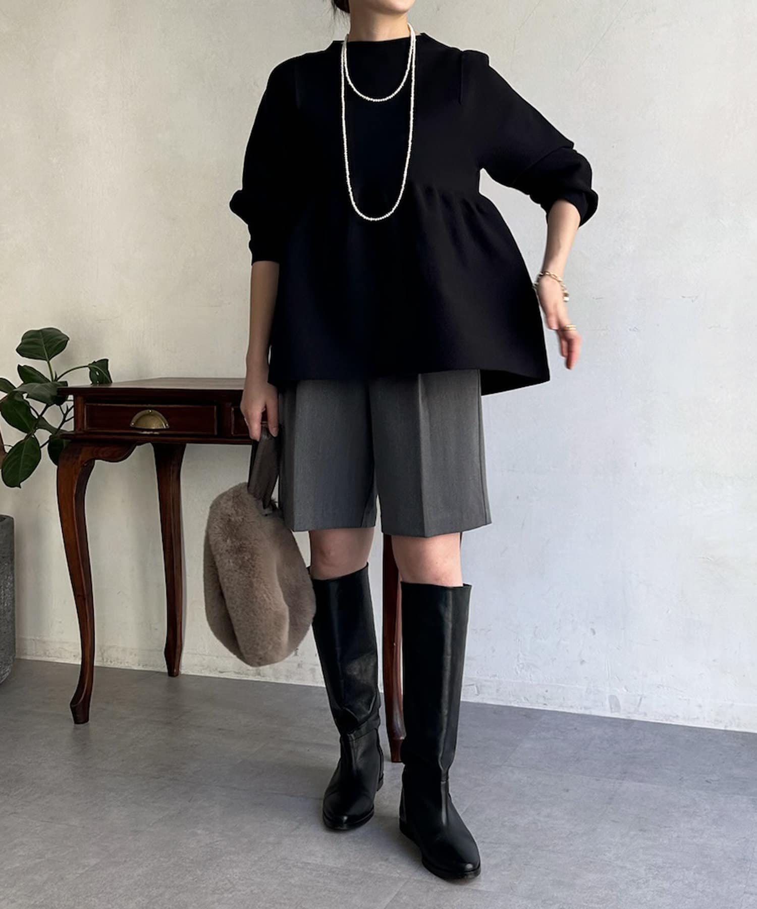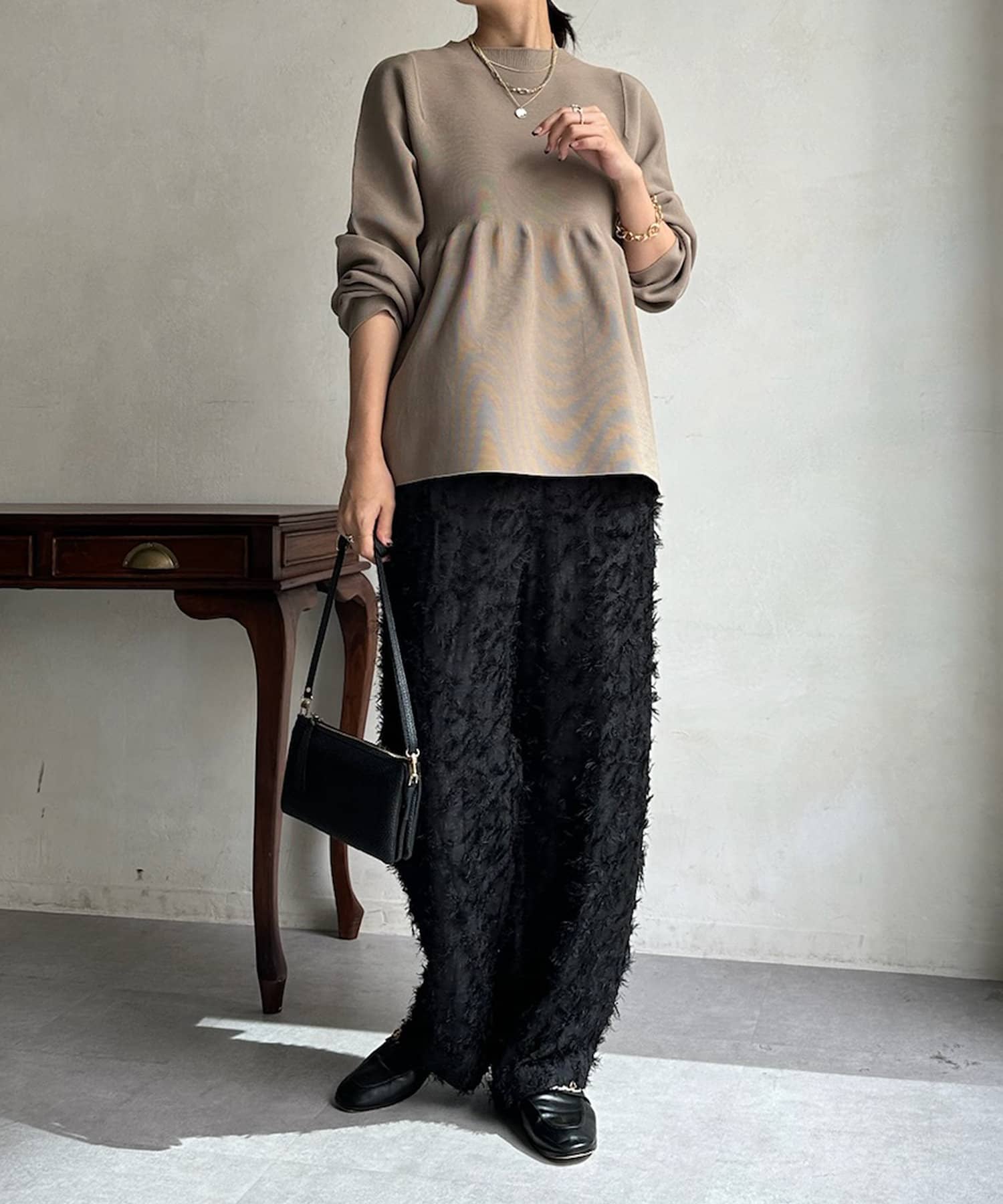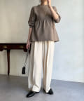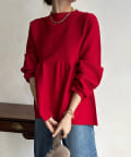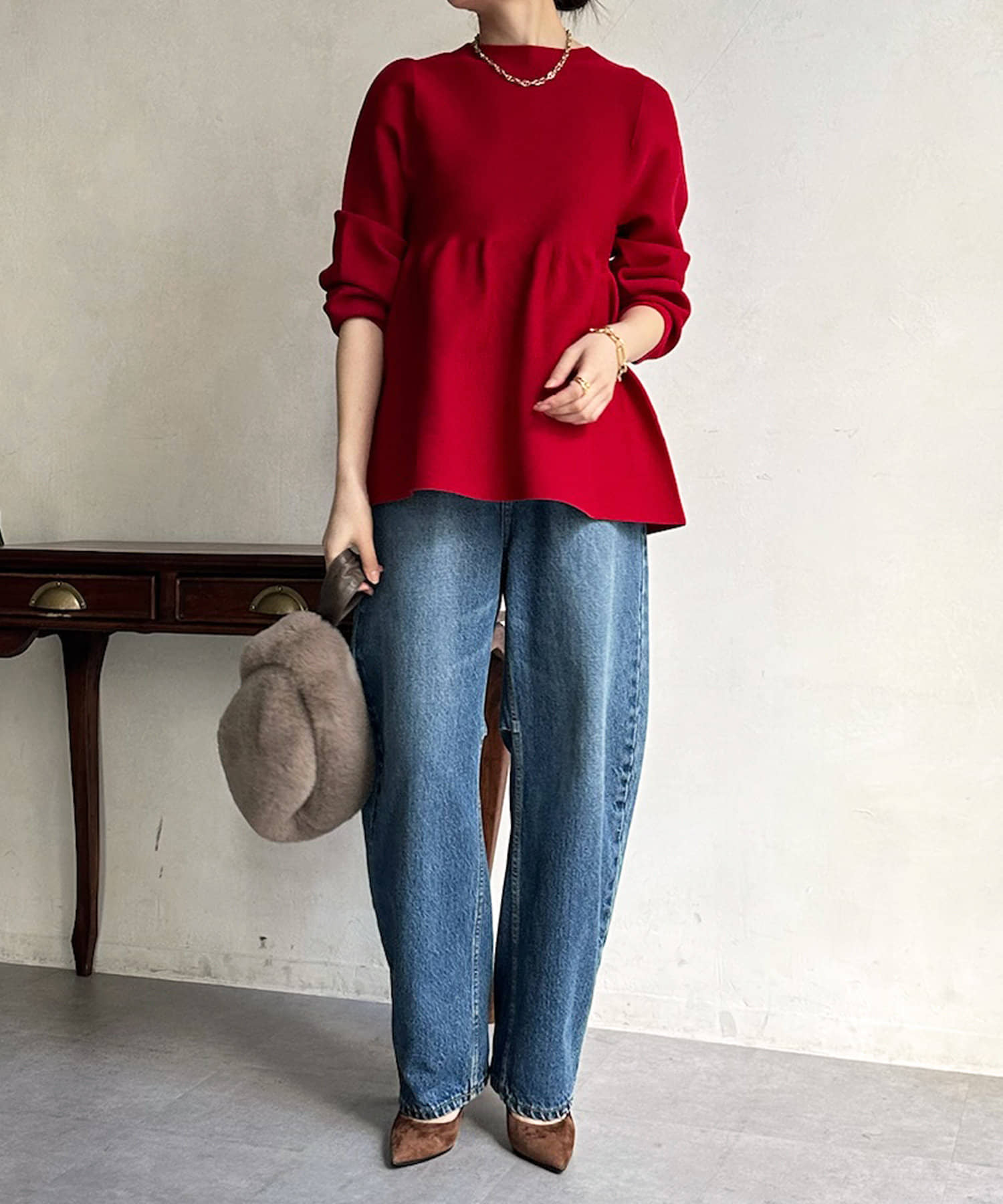 トレンドライクなペプラムシルエットは気になるおなか回りをふんわりとカバー。首元はクルーネックでカジュアルな印象をプラス。