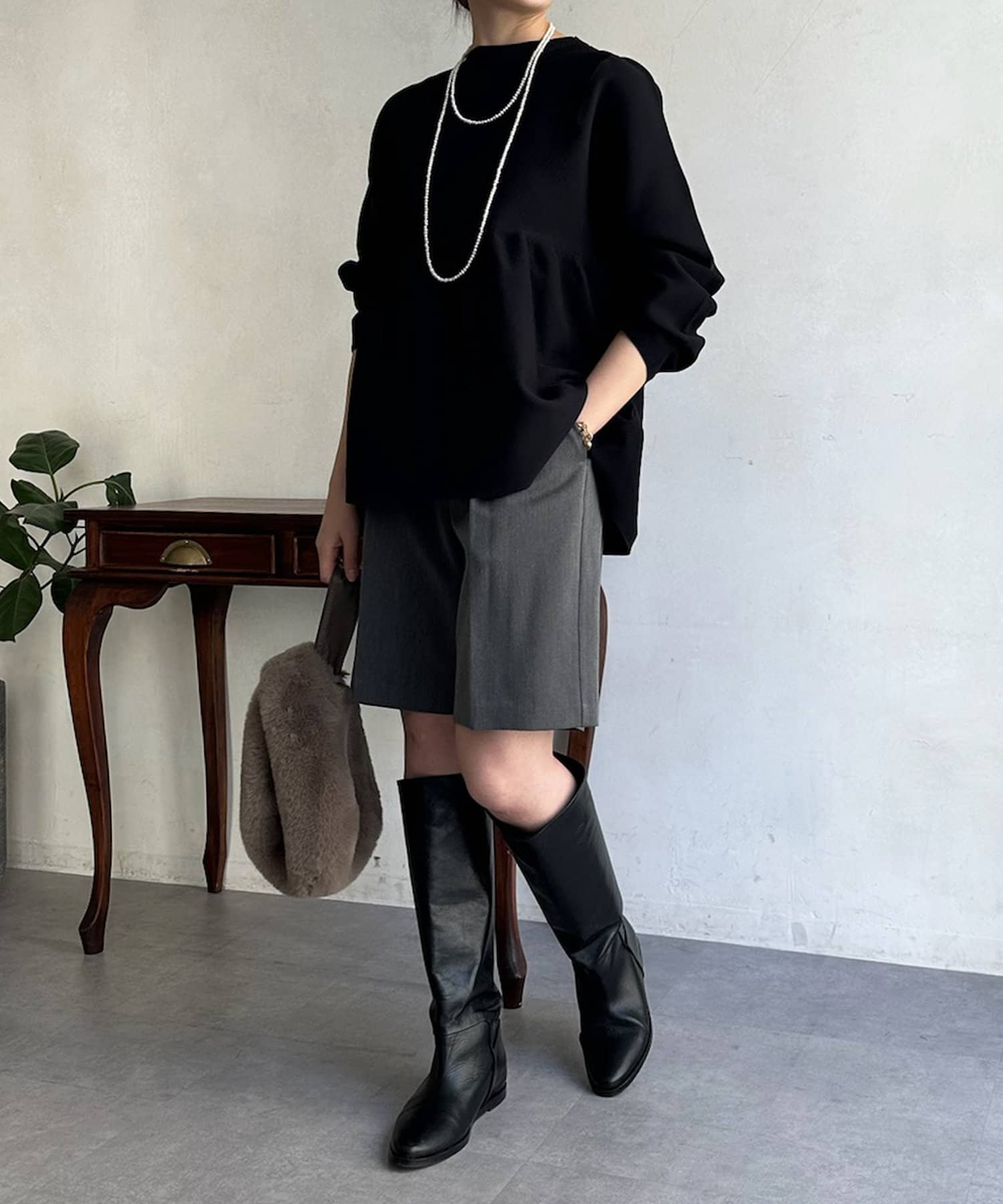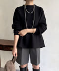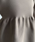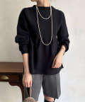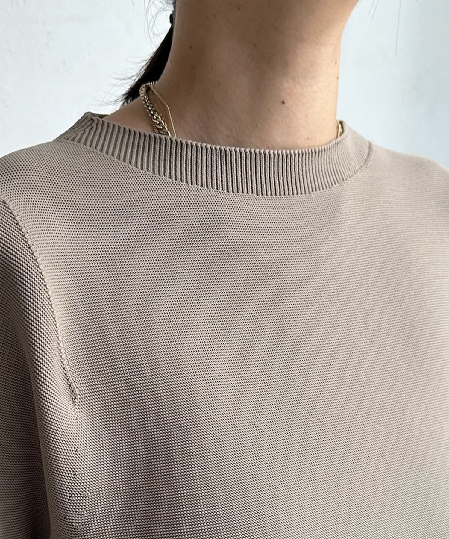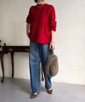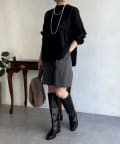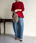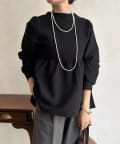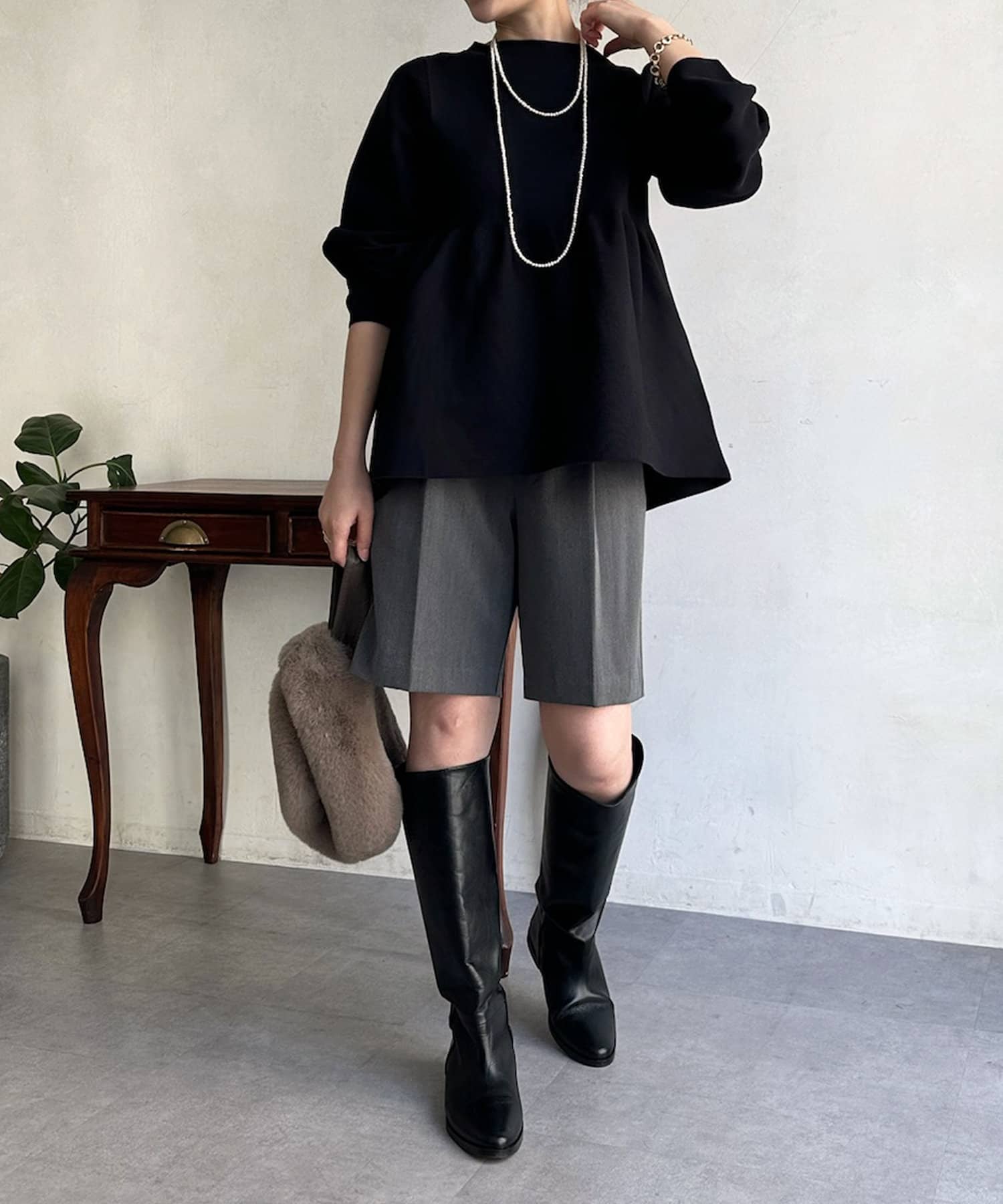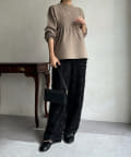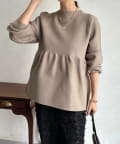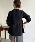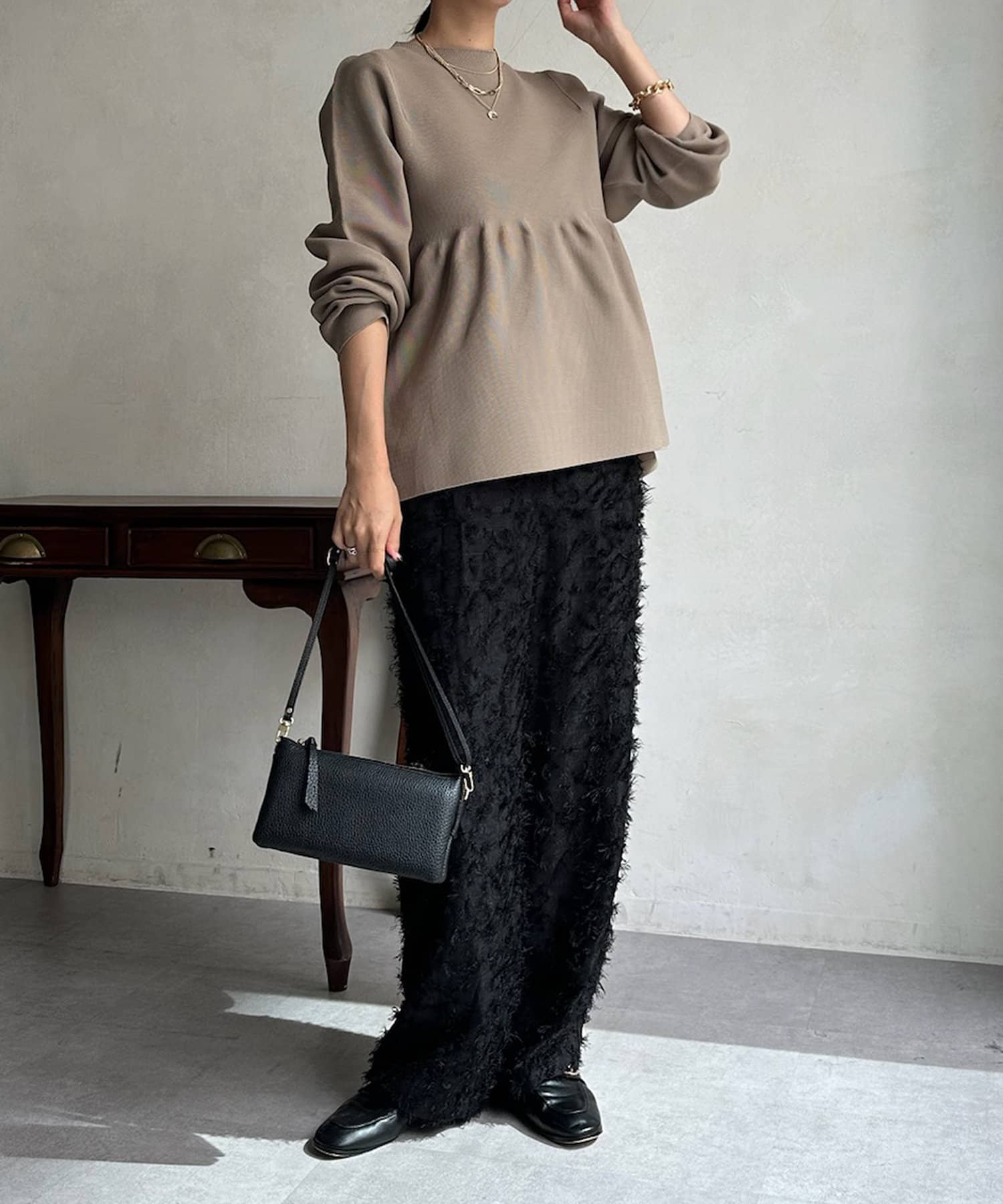 トレンドライクなペプラムシルエットは気になるおなか回りをふんわりとカバー。首元はクルーネックでカジュアルな印象をプラス。