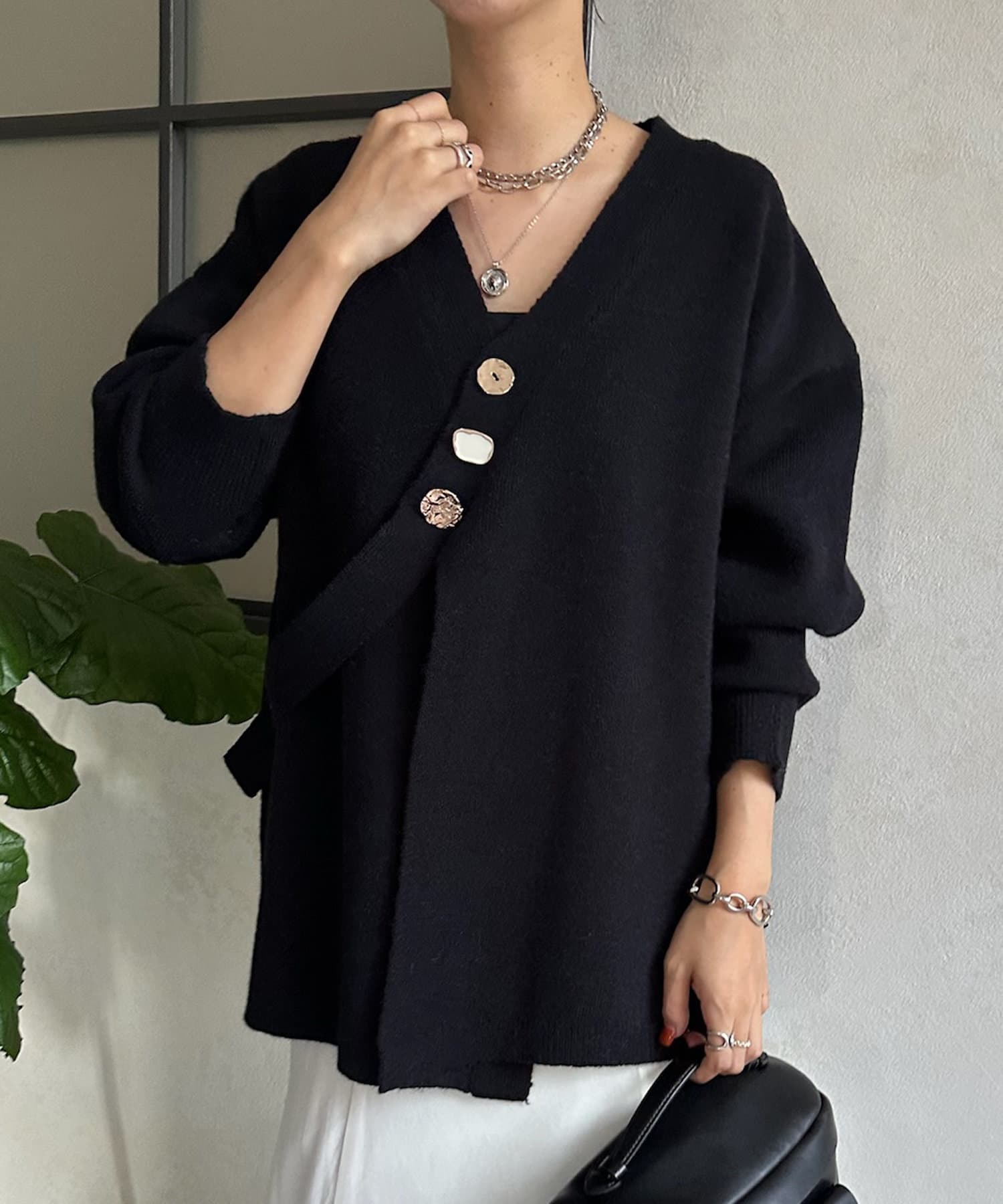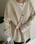 種類の違うアソートボタンとクロスデザインがポイントのカーディガン!