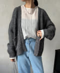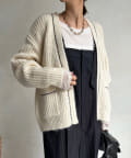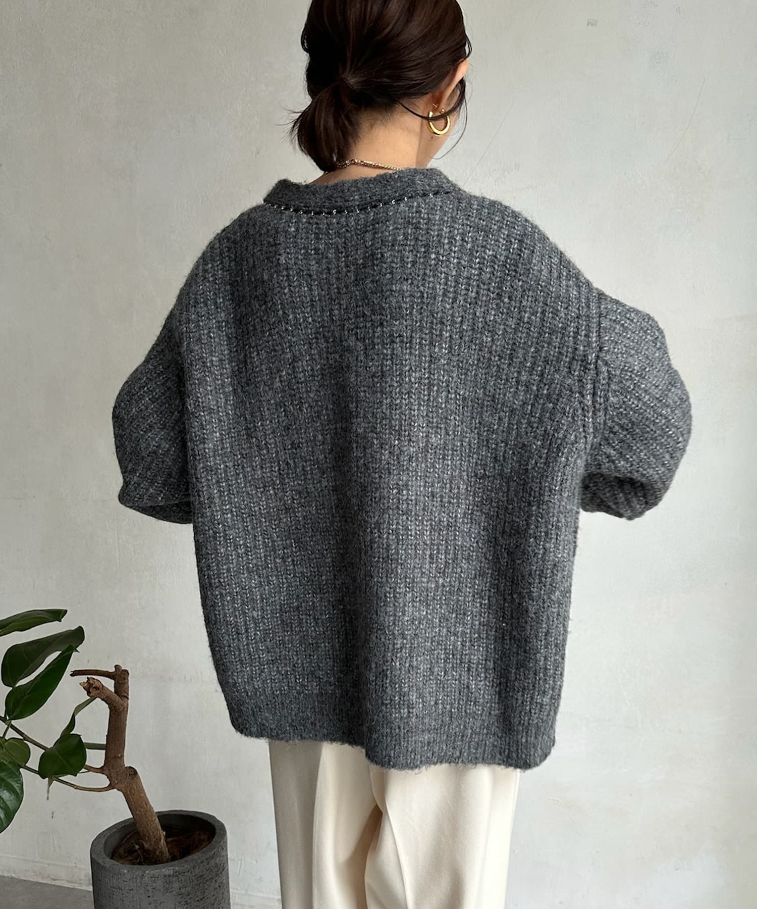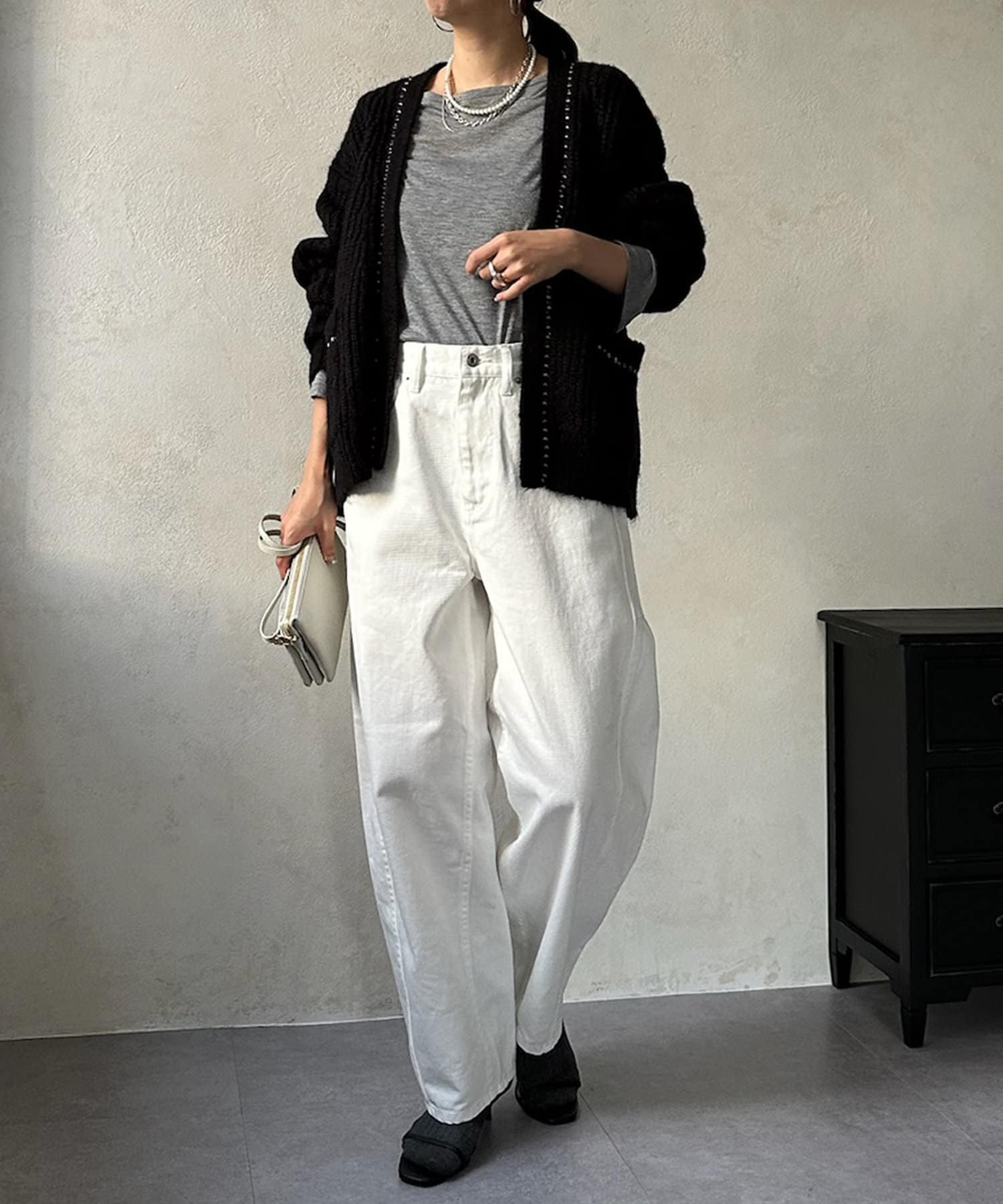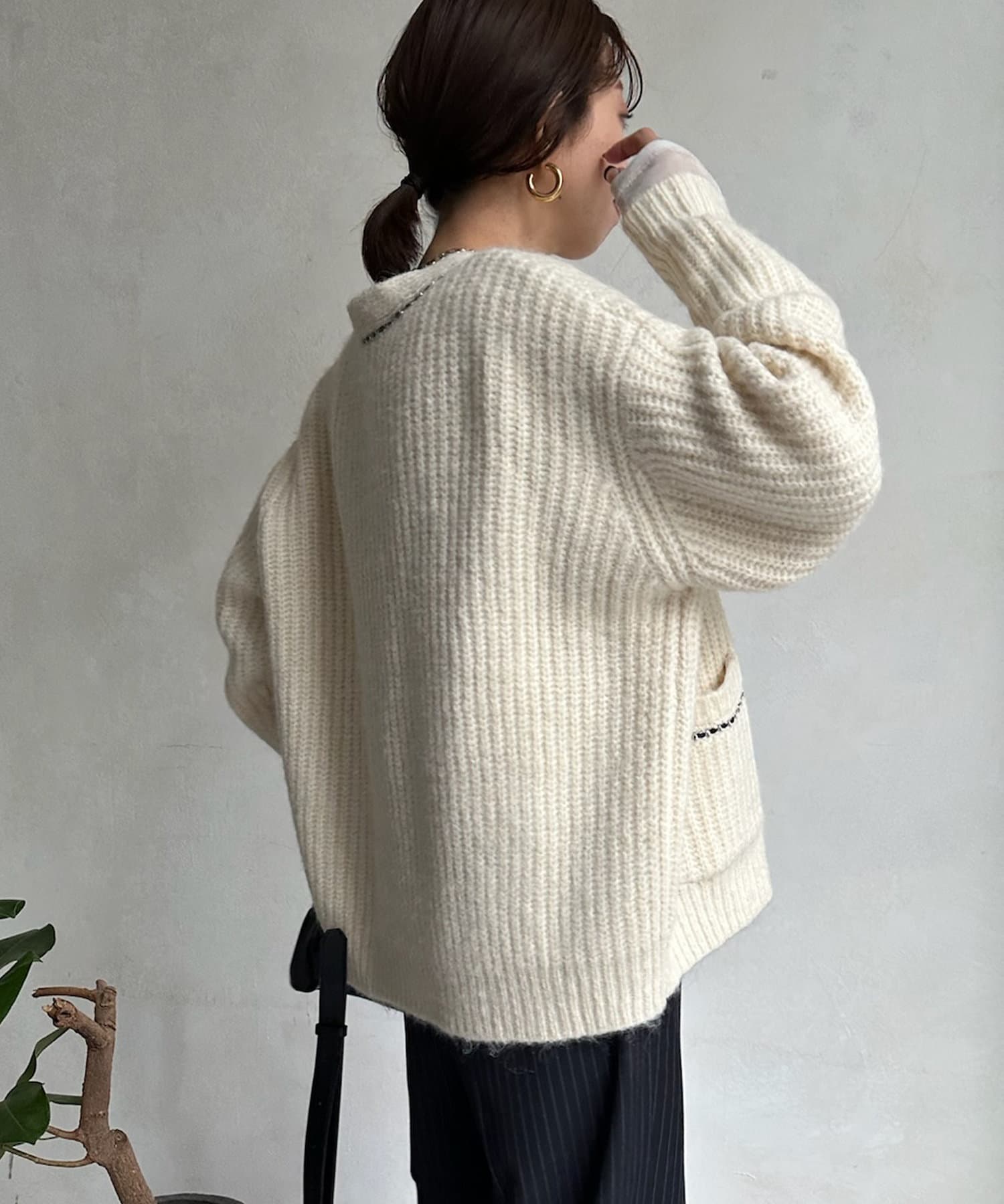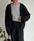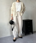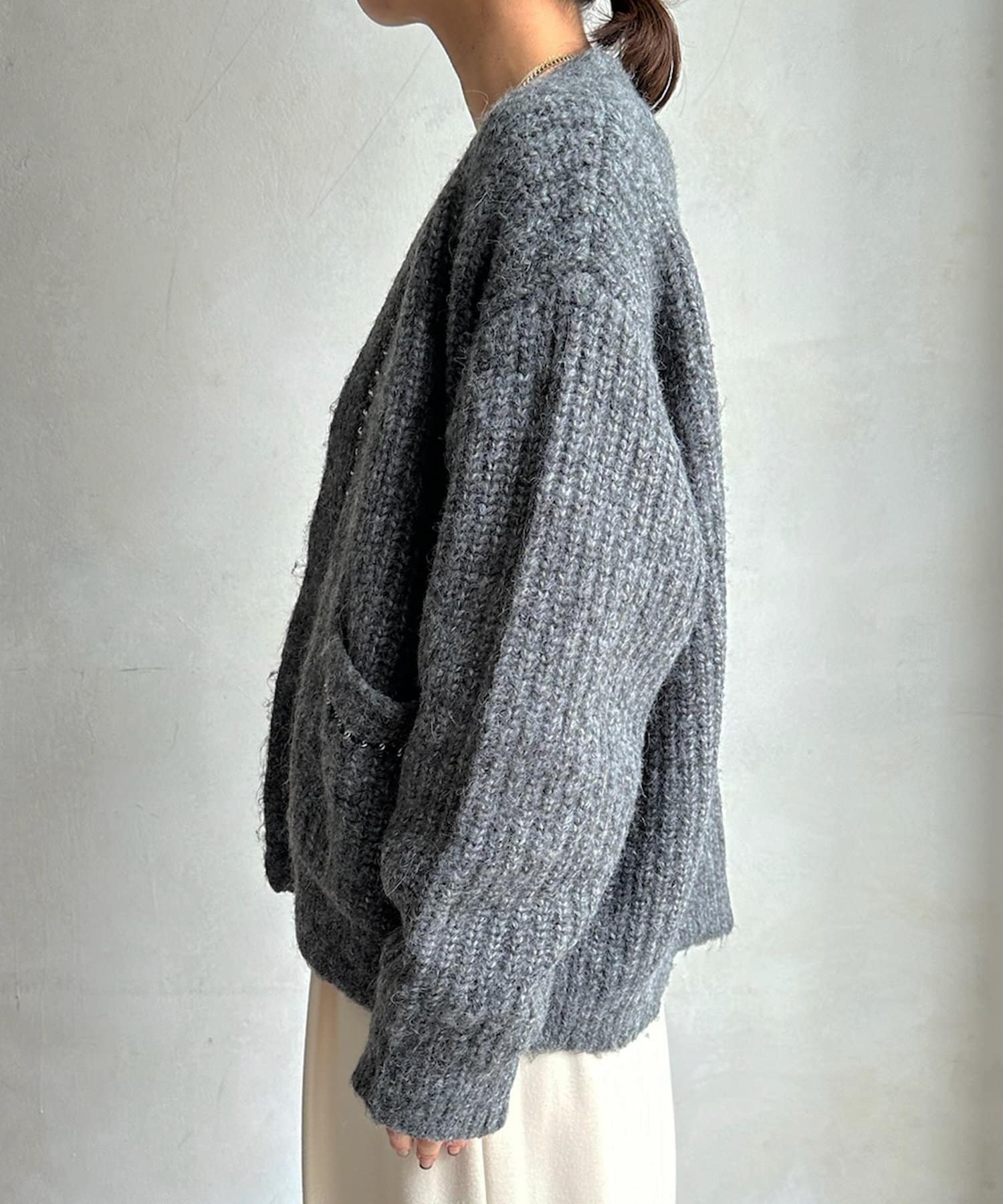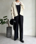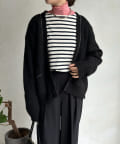長すぎない丈感と、ボタンレスでさっと羽織りやすいのがうれしいポイントです。