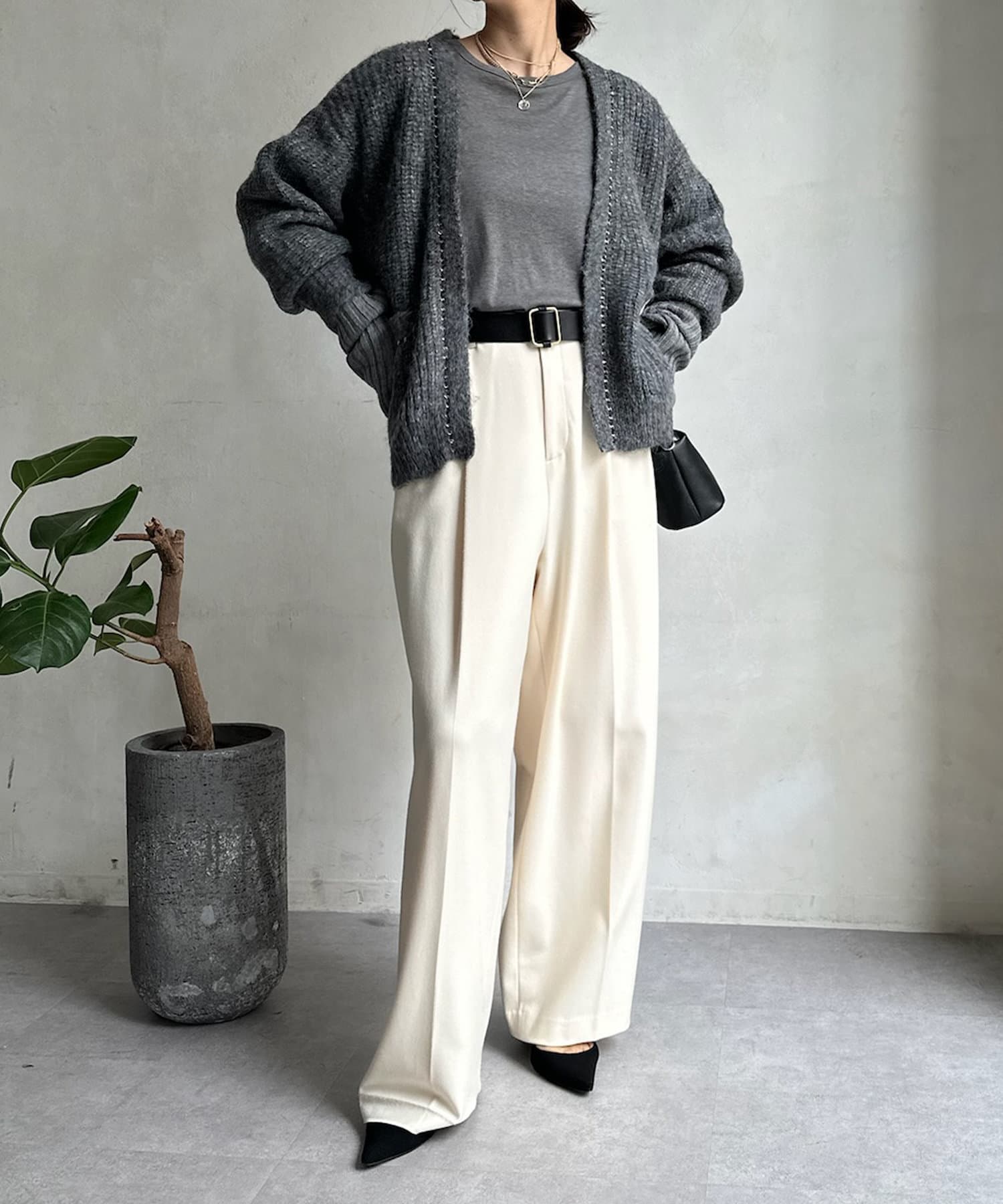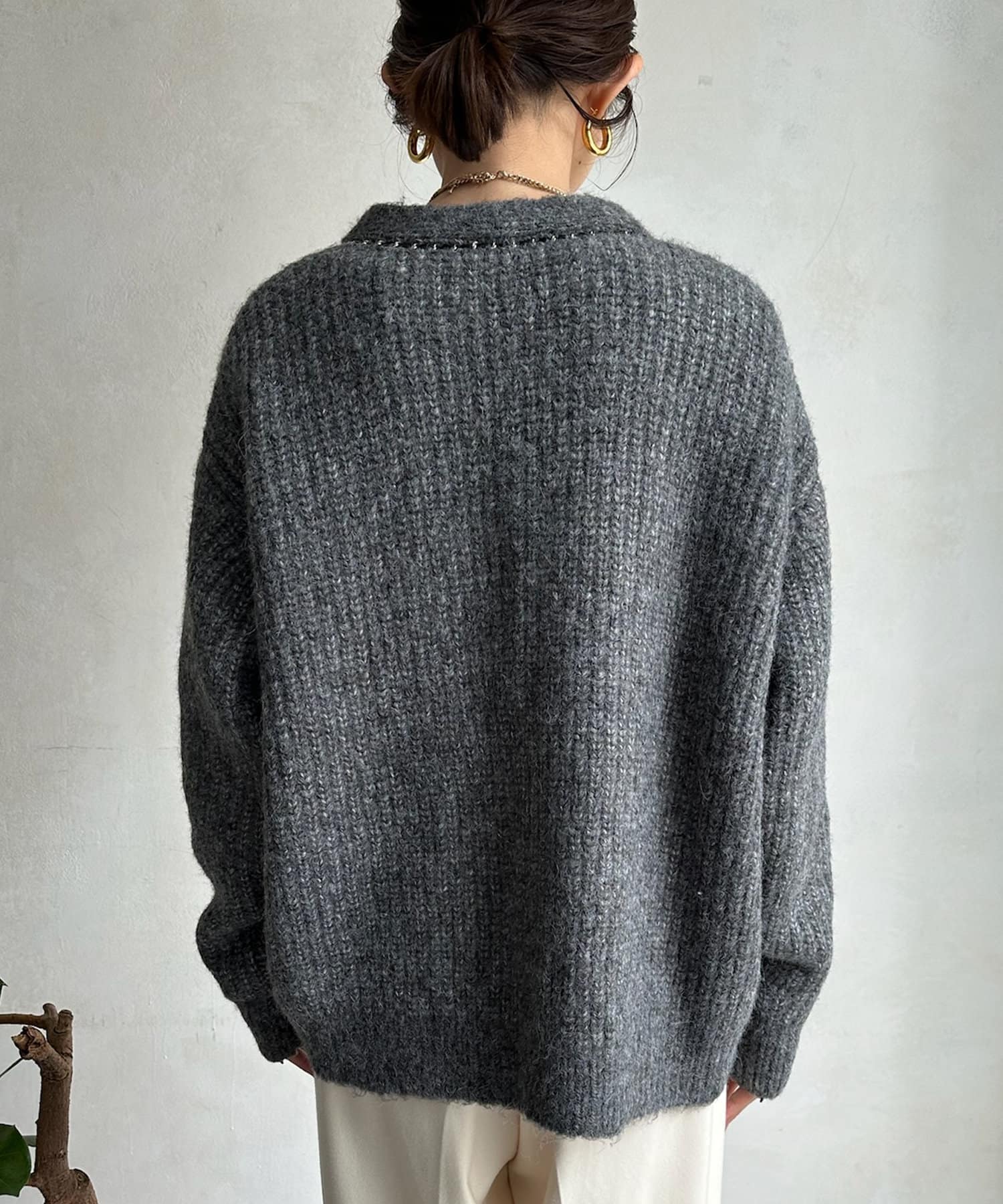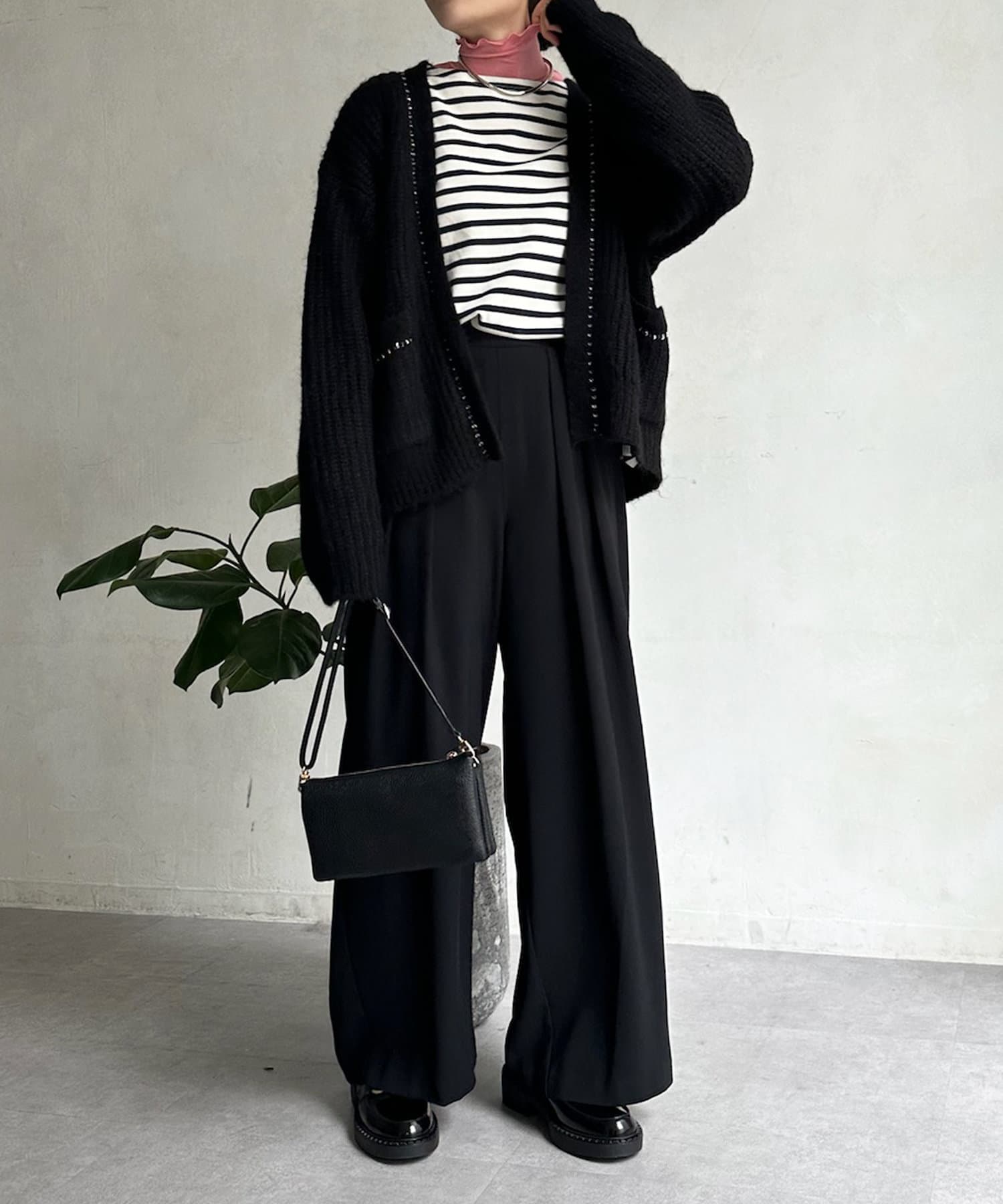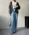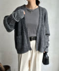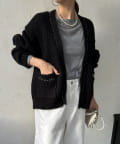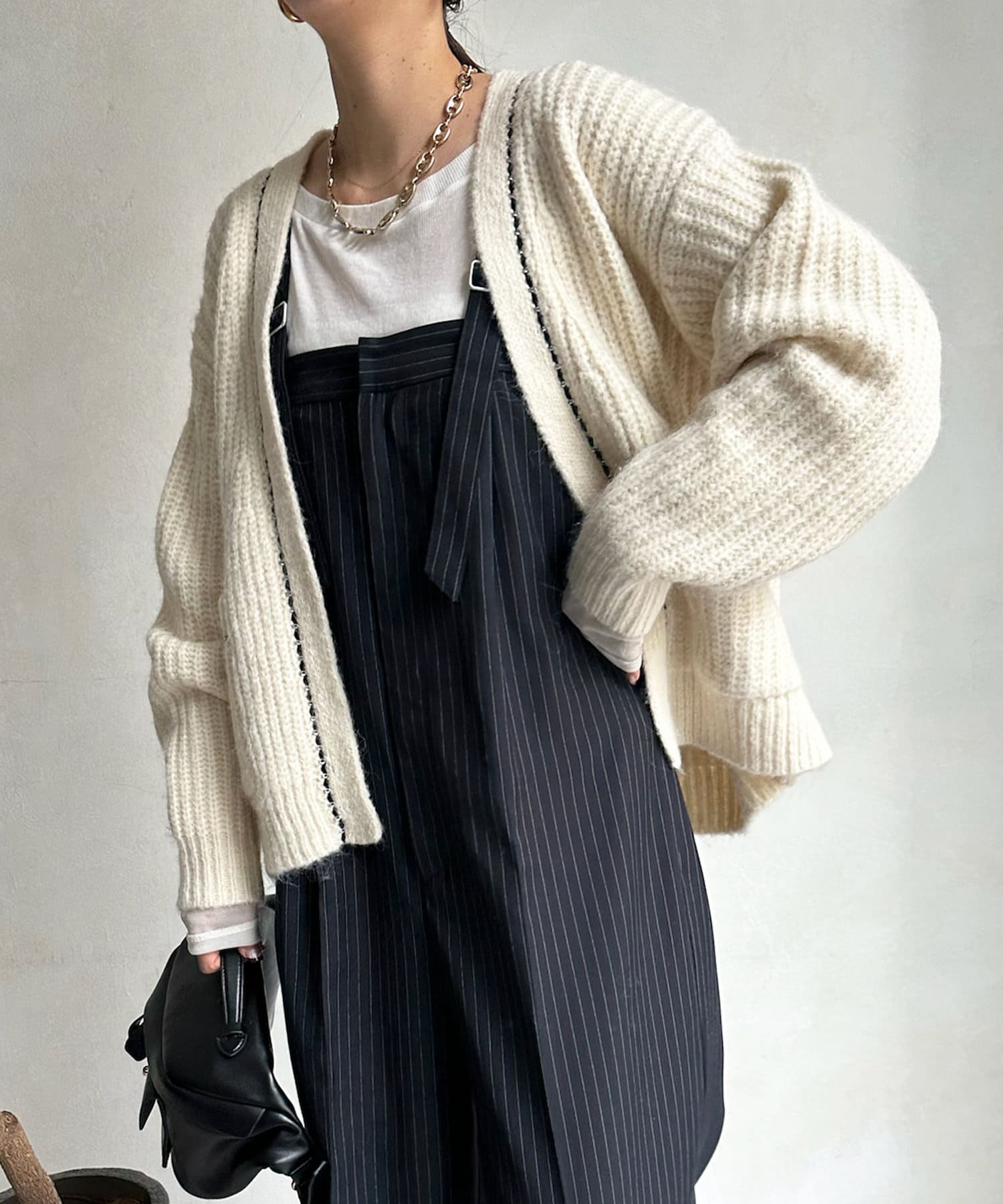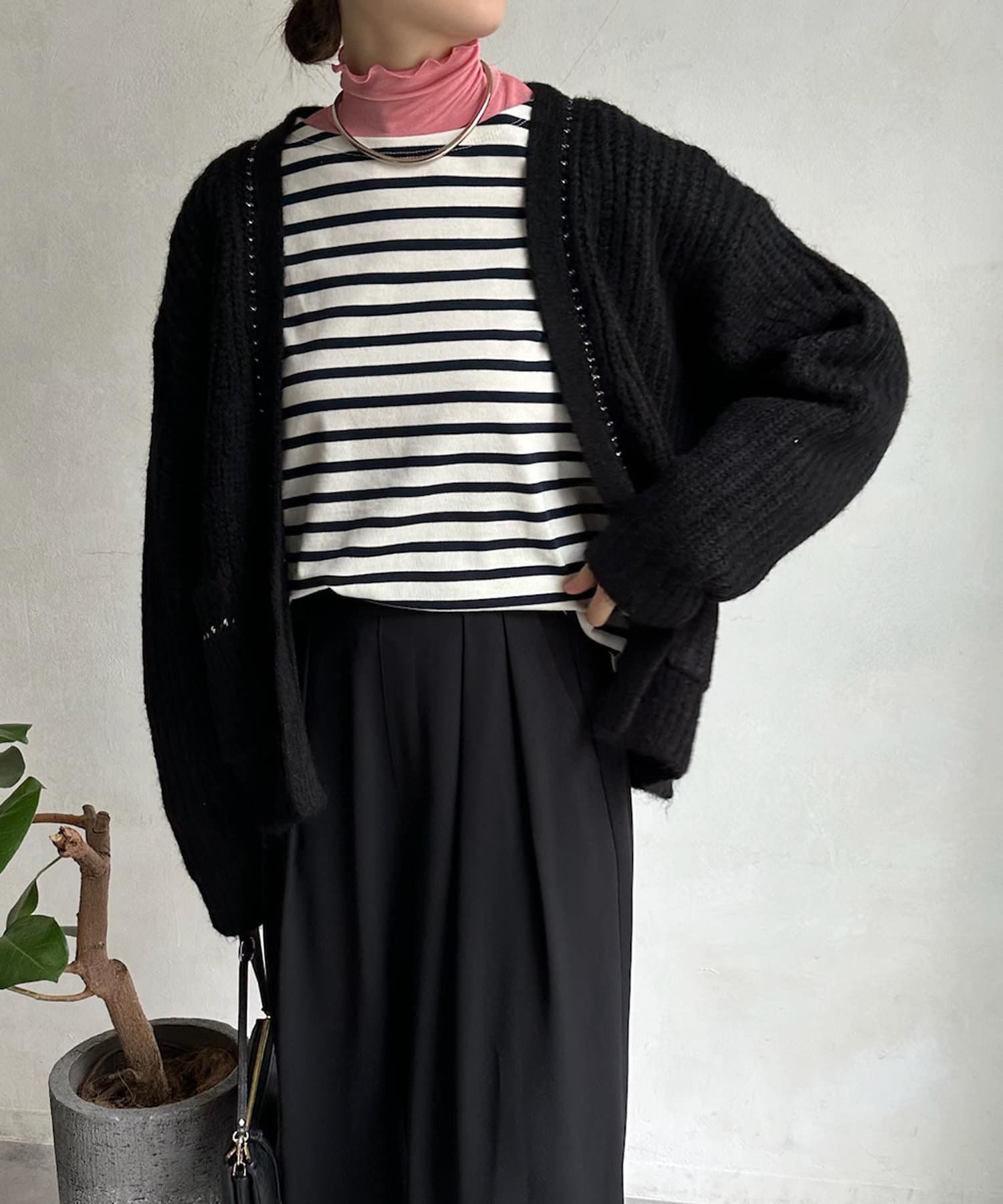 長すぎない丈感と、ボタンレスでさっと羽織りやすいのがうれしいポイントです。