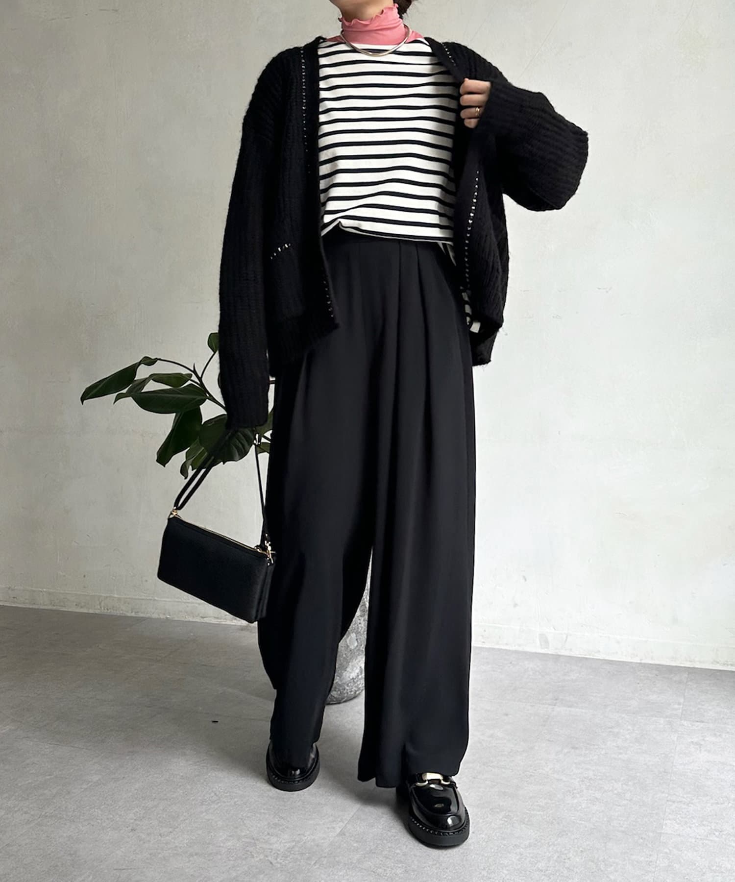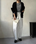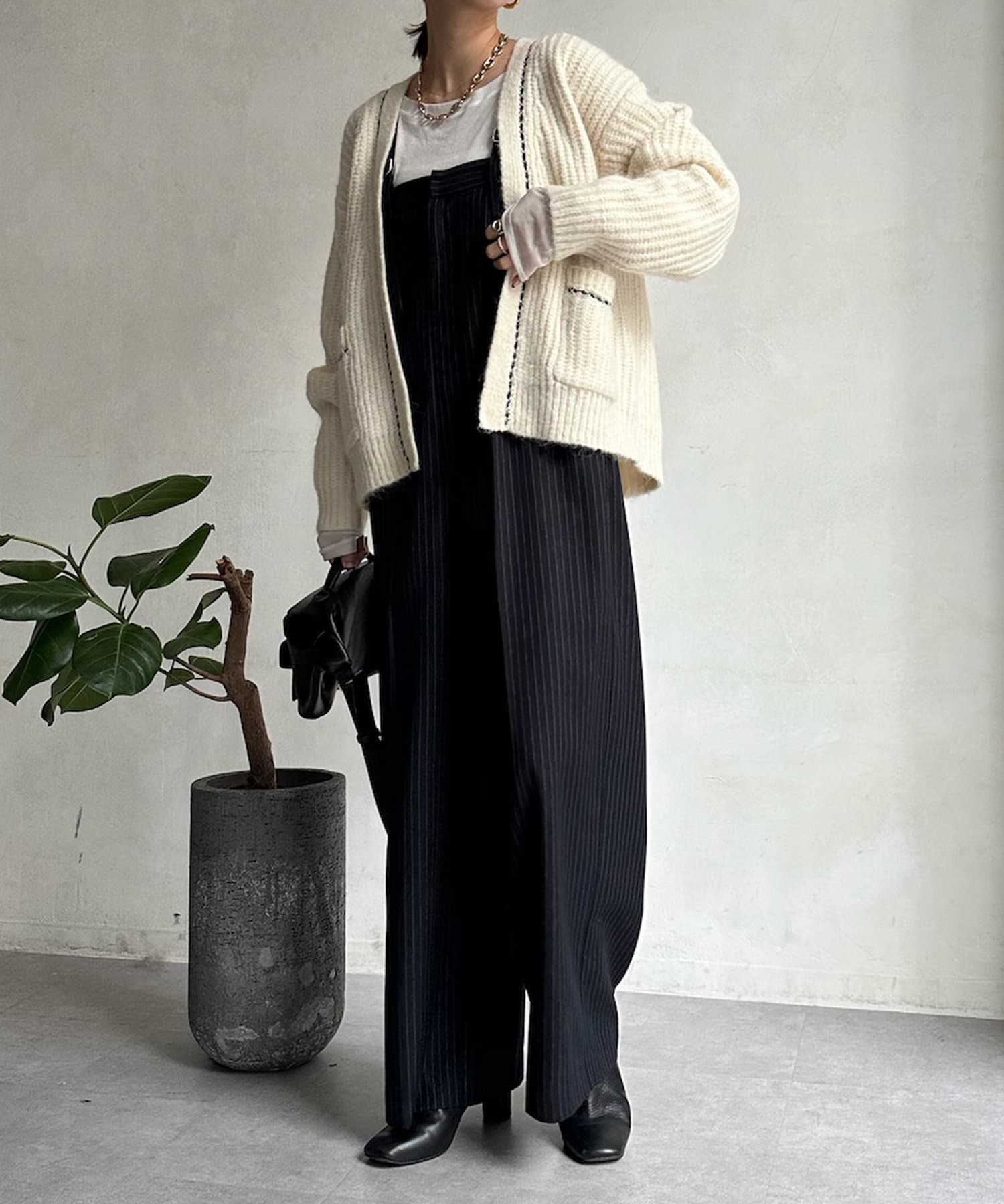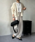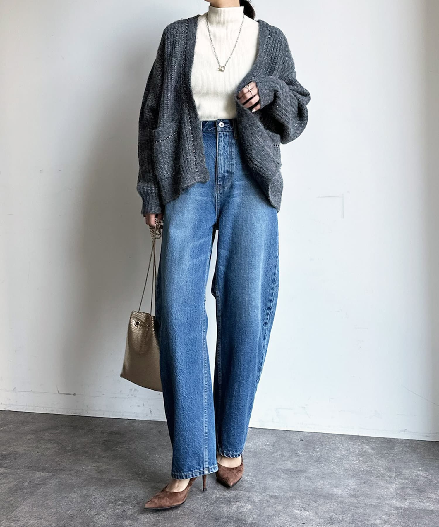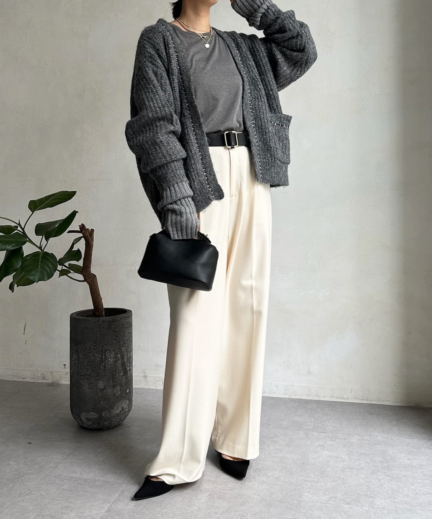 長すぎない丈感と、ボタンレスでさっと羽織りやすいのがうれしいポイントです。