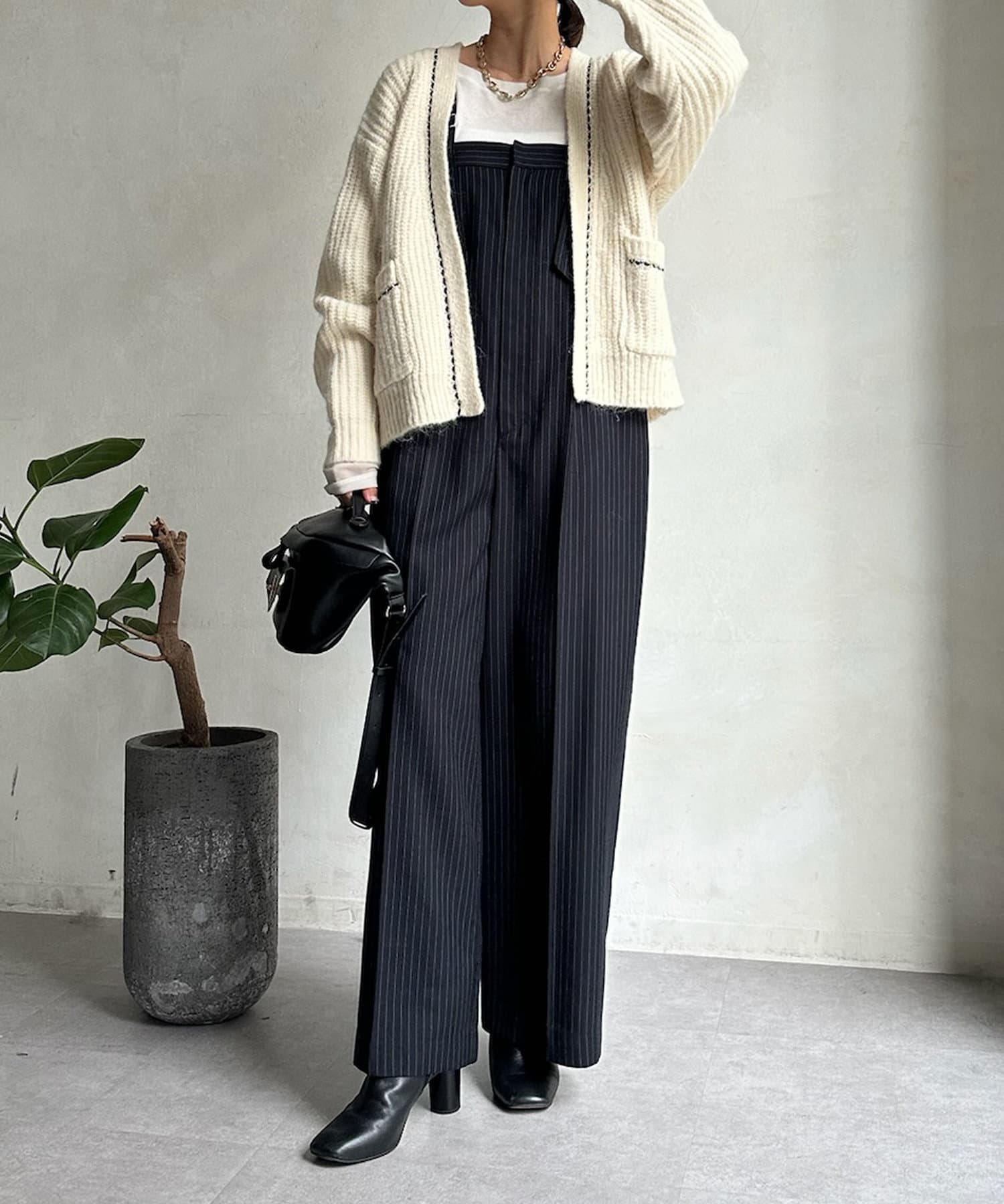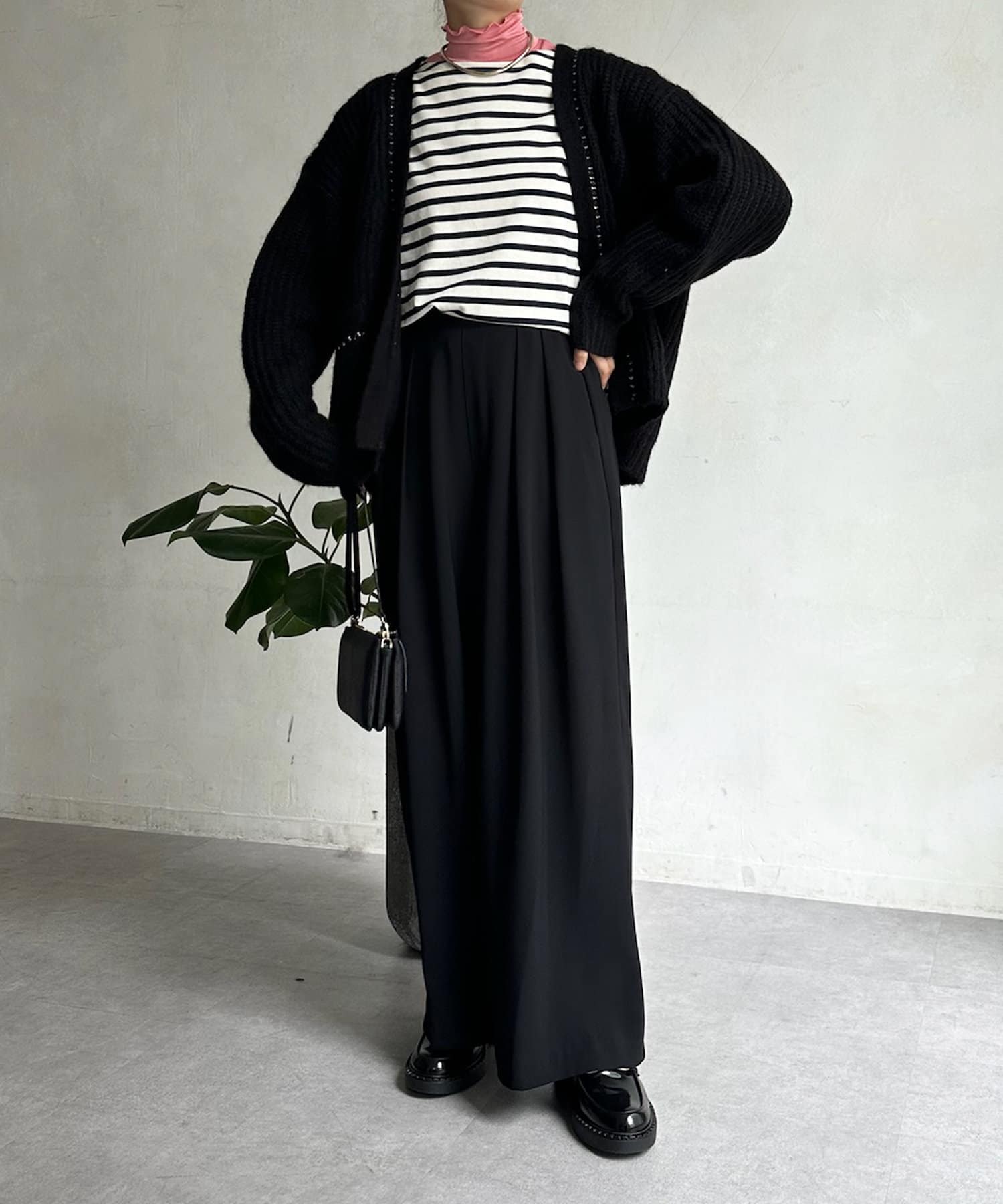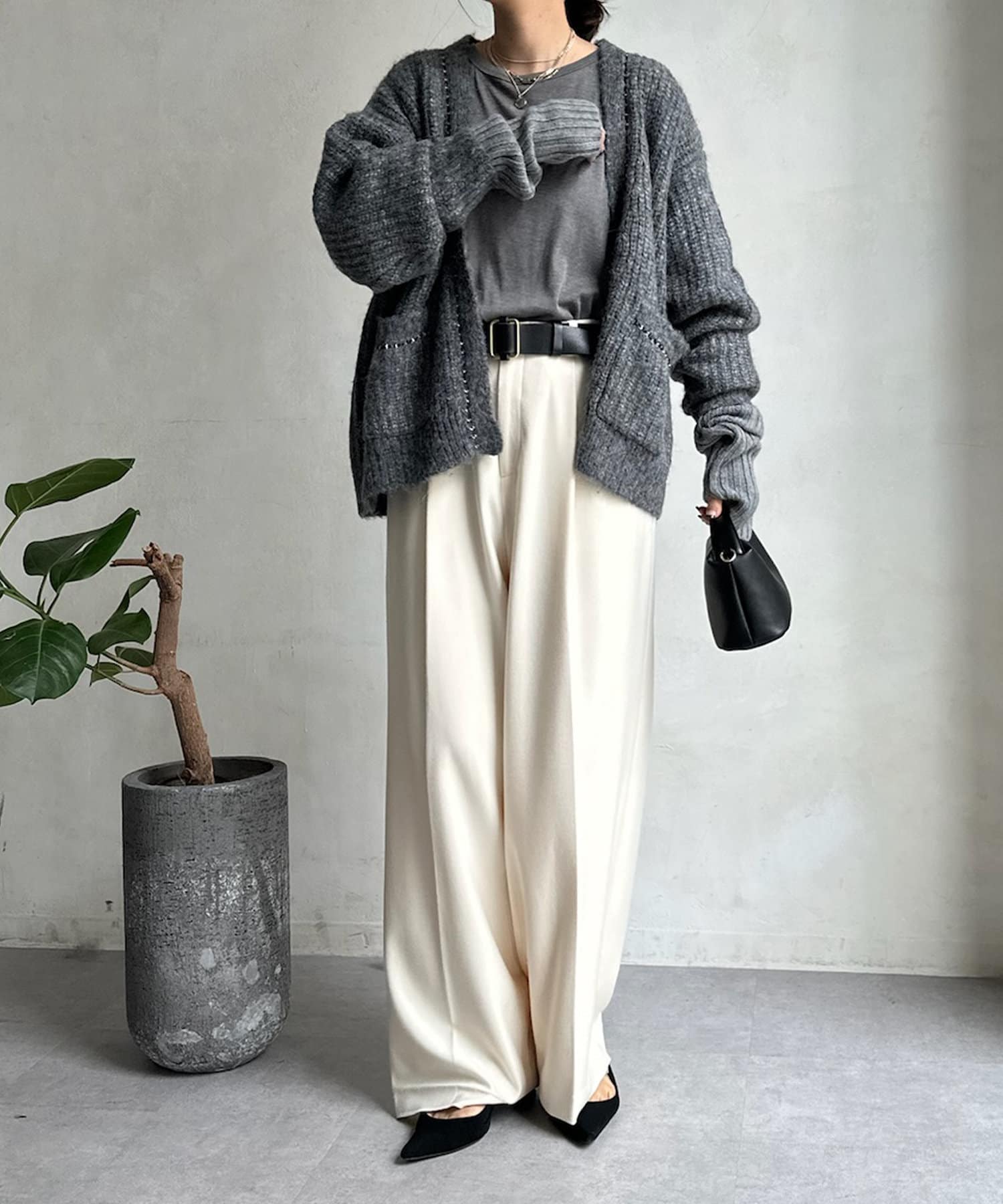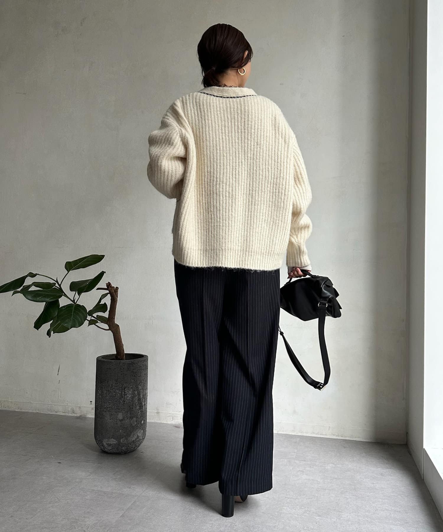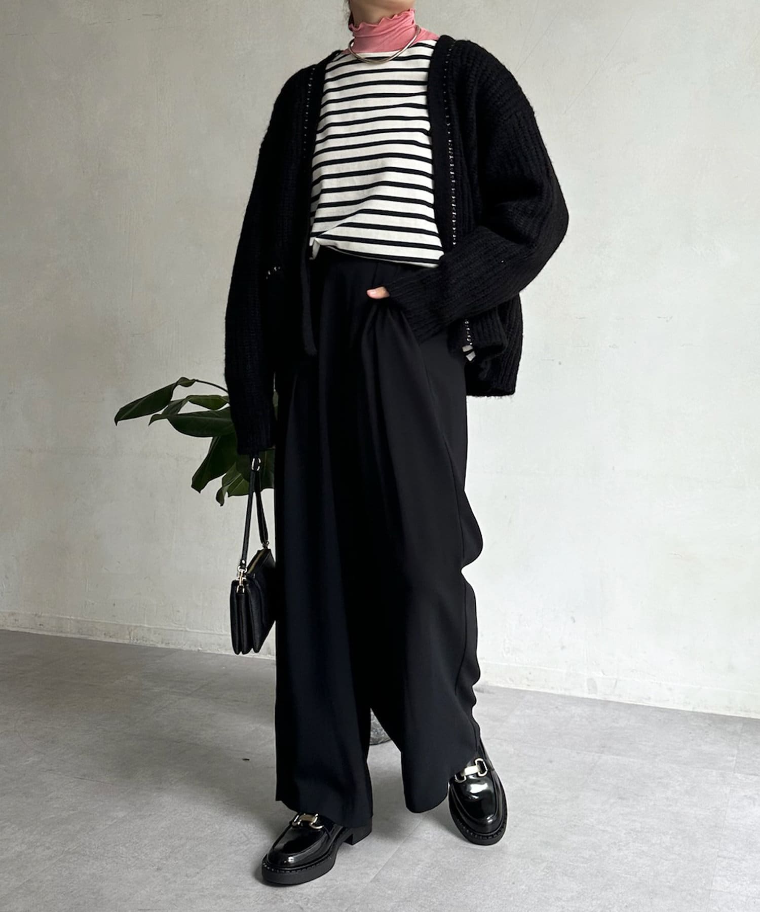 長すぎない丈感と、ボタンレスでさっと羽織りやすいのがうれしいポイントです。