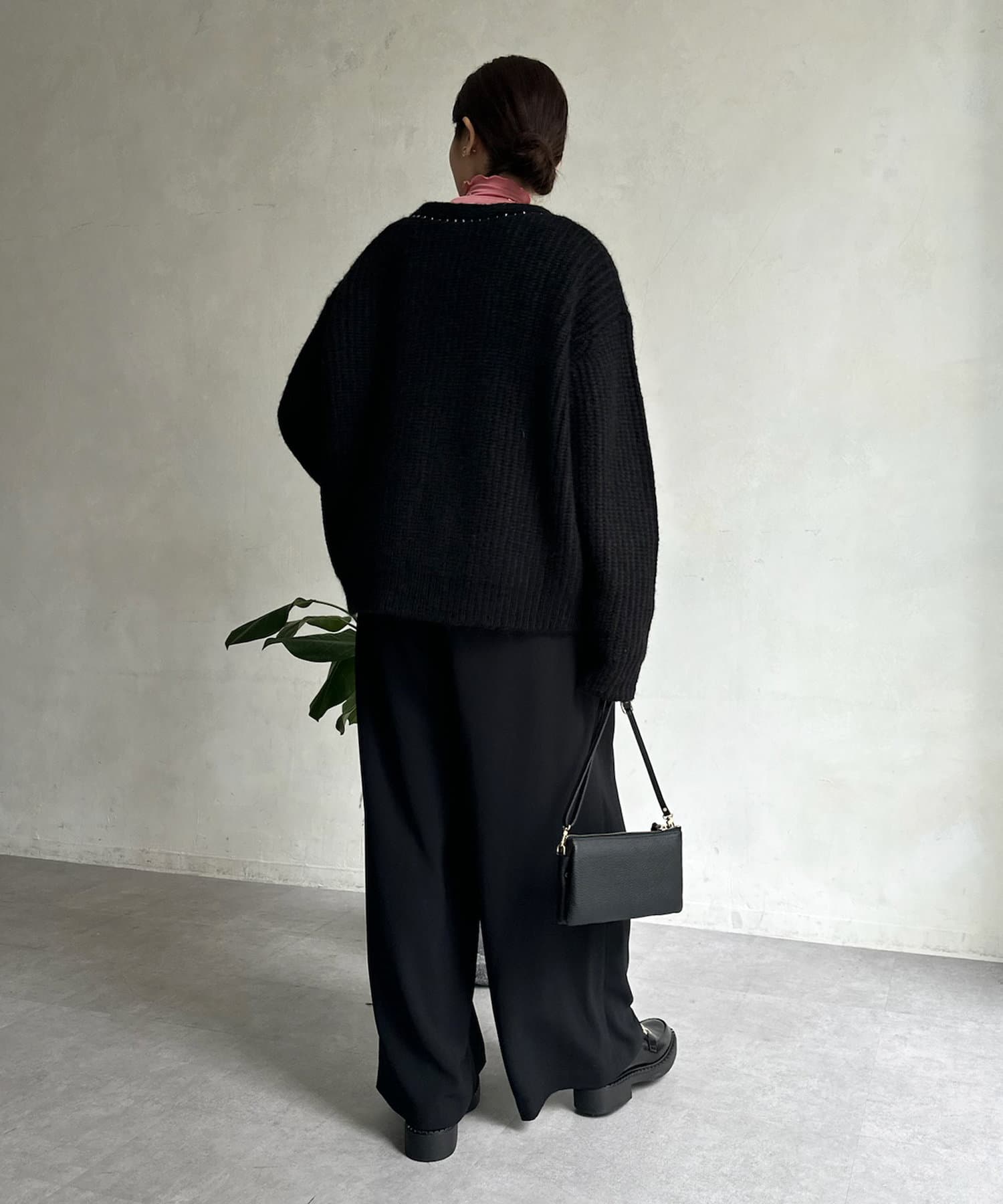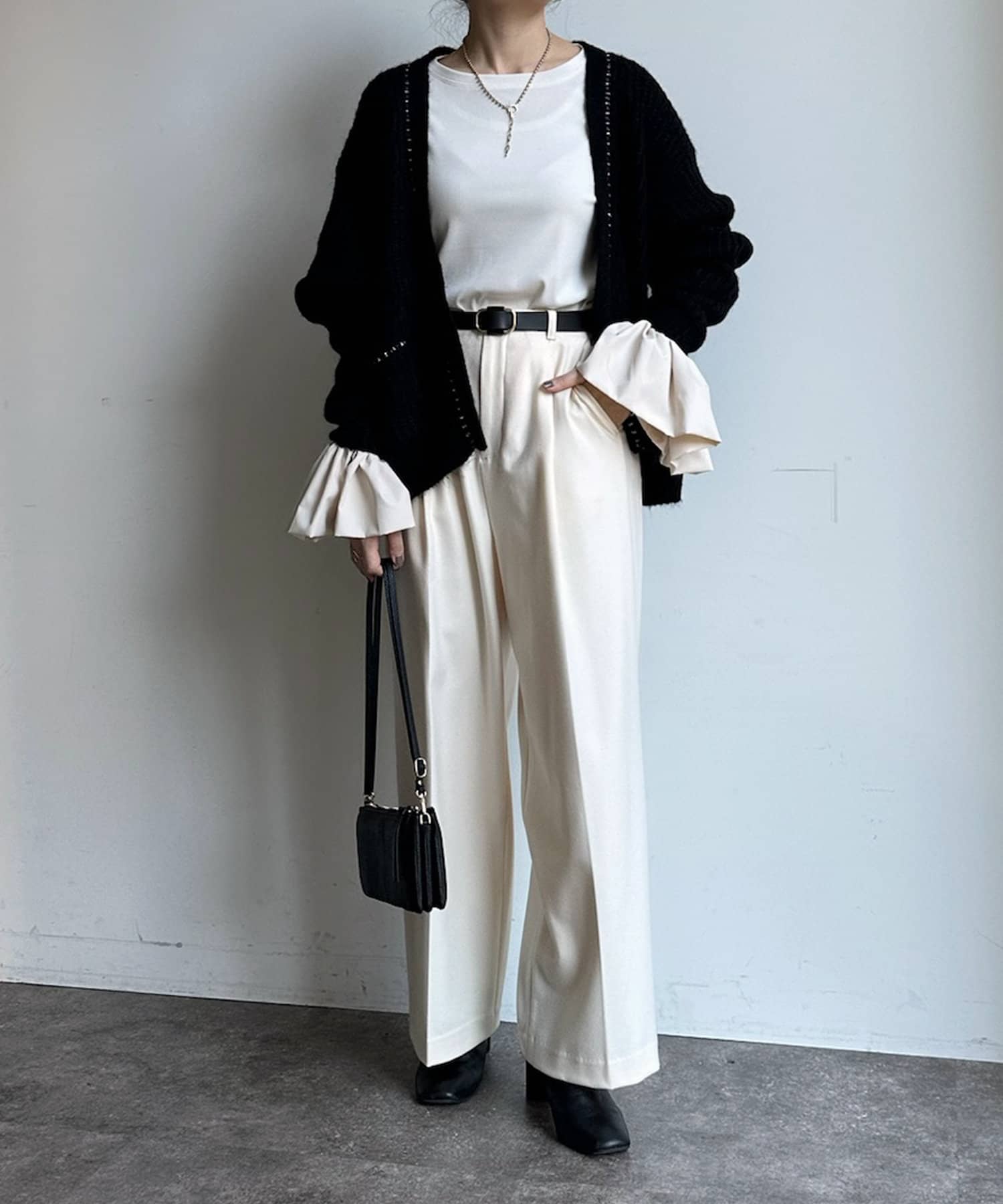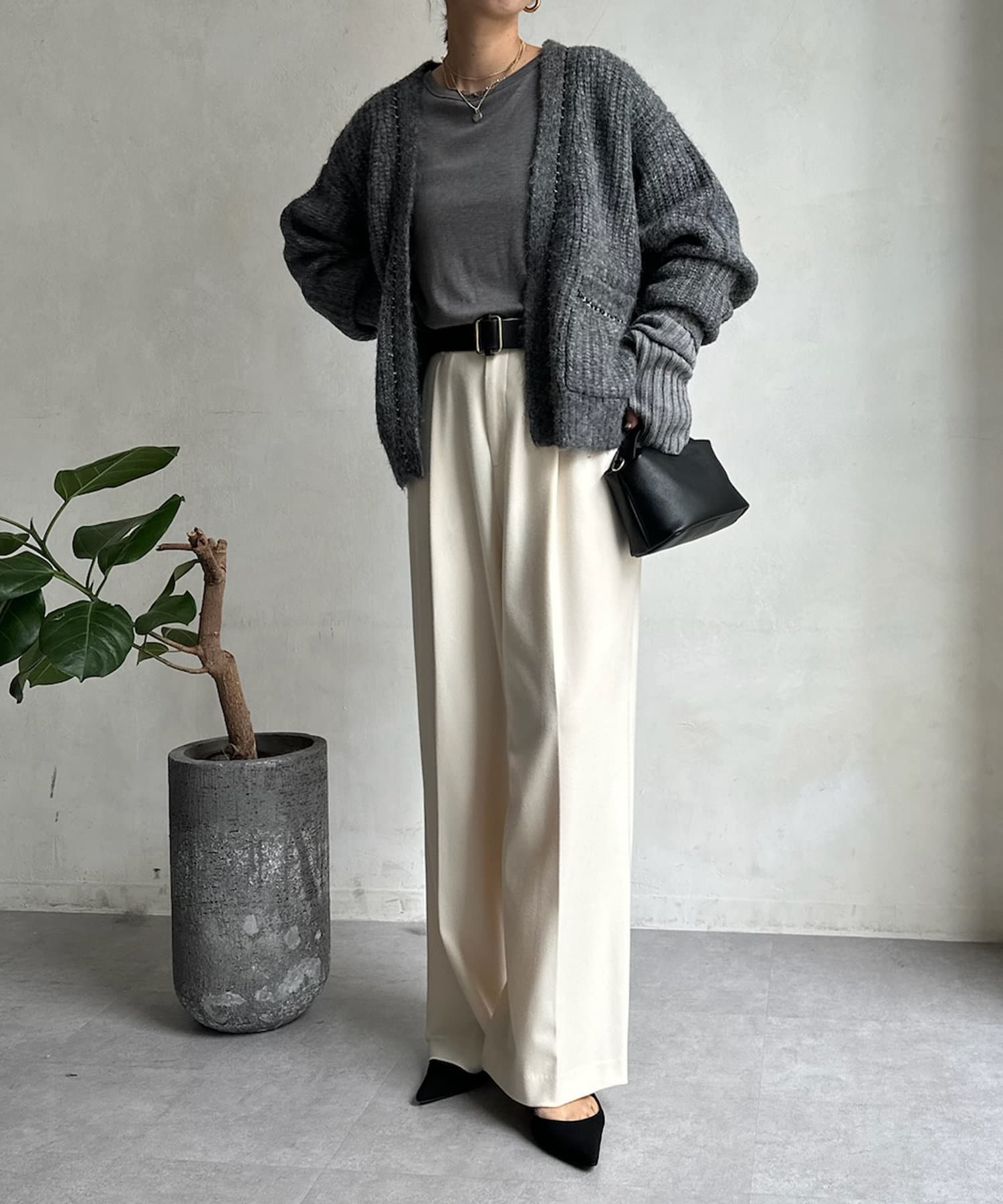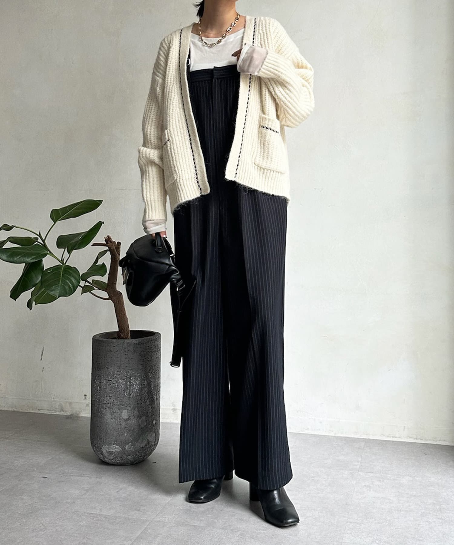 長すぎない丈感と、ボタンレスでさっと羽織りやすいのがうれしいポイントです。
