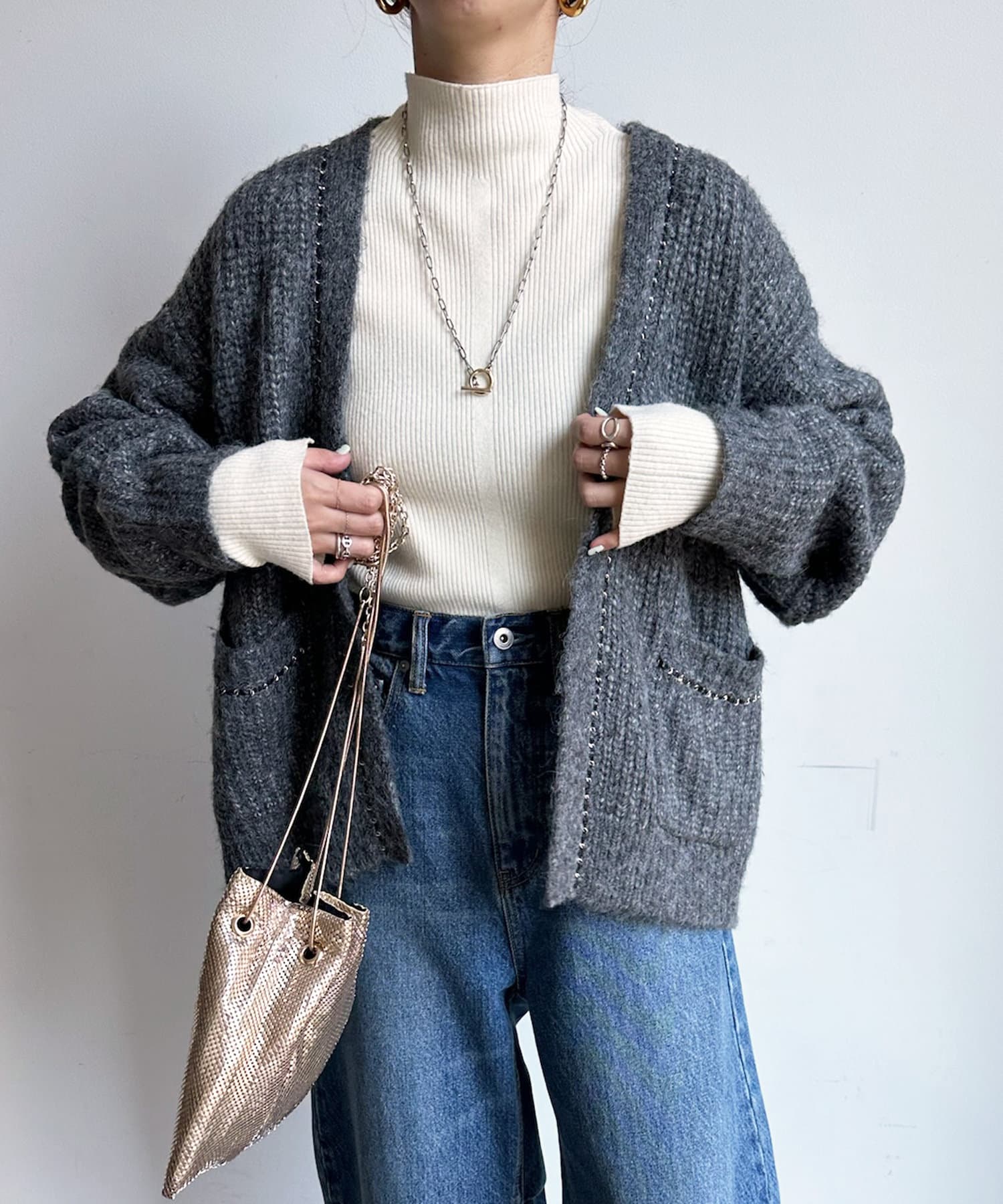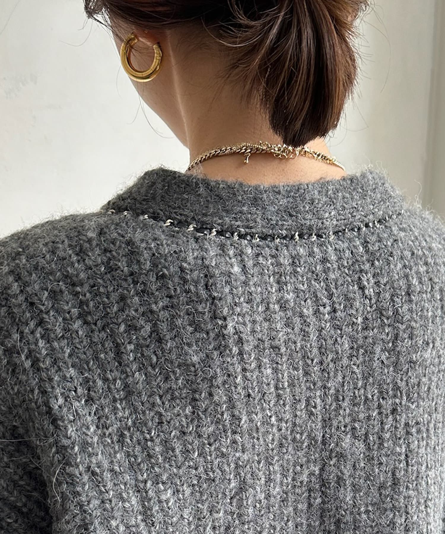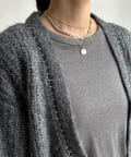 首元からフロントにかけて連なったチェーンのデザインがポイントのカーディガン。