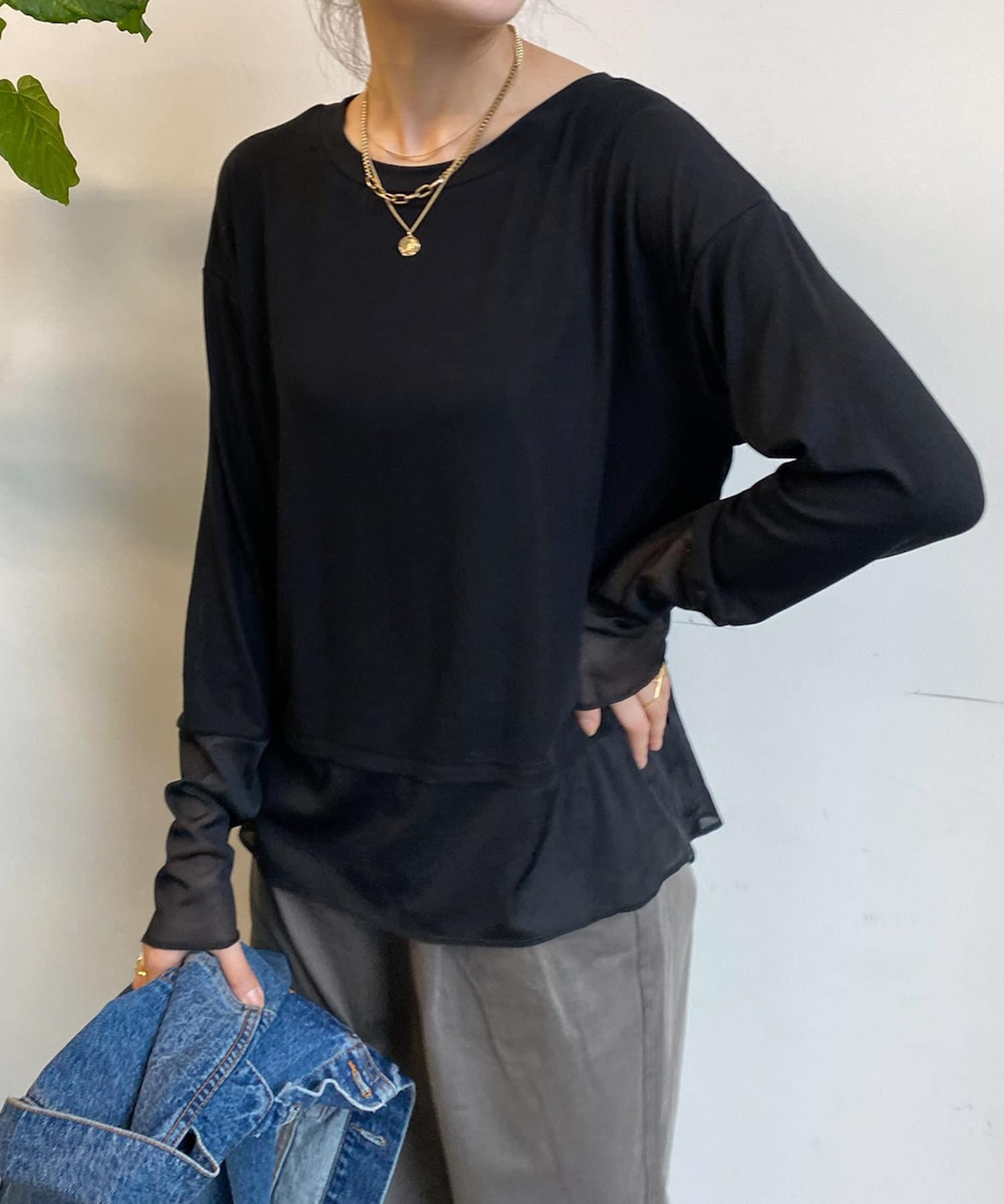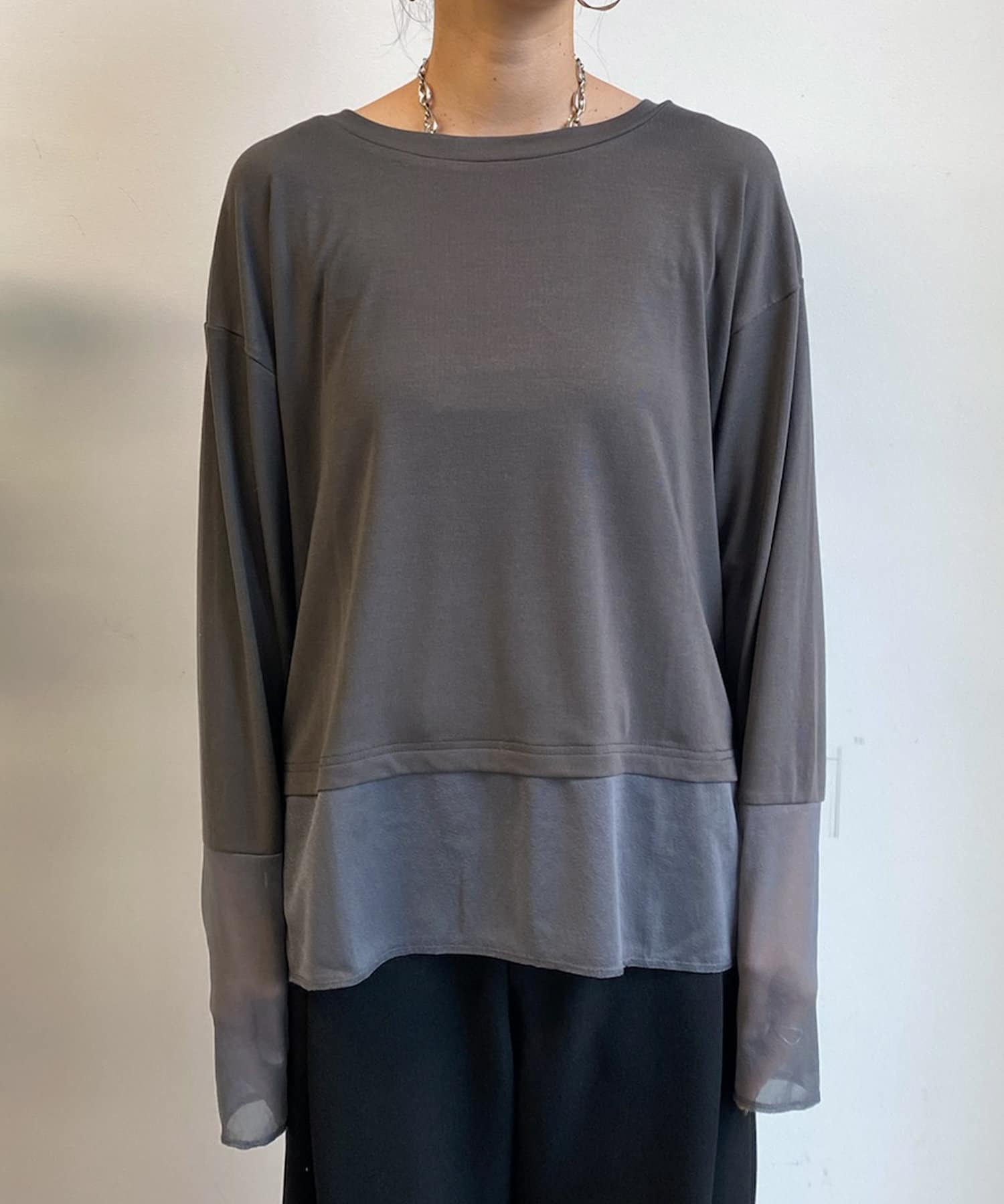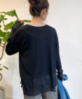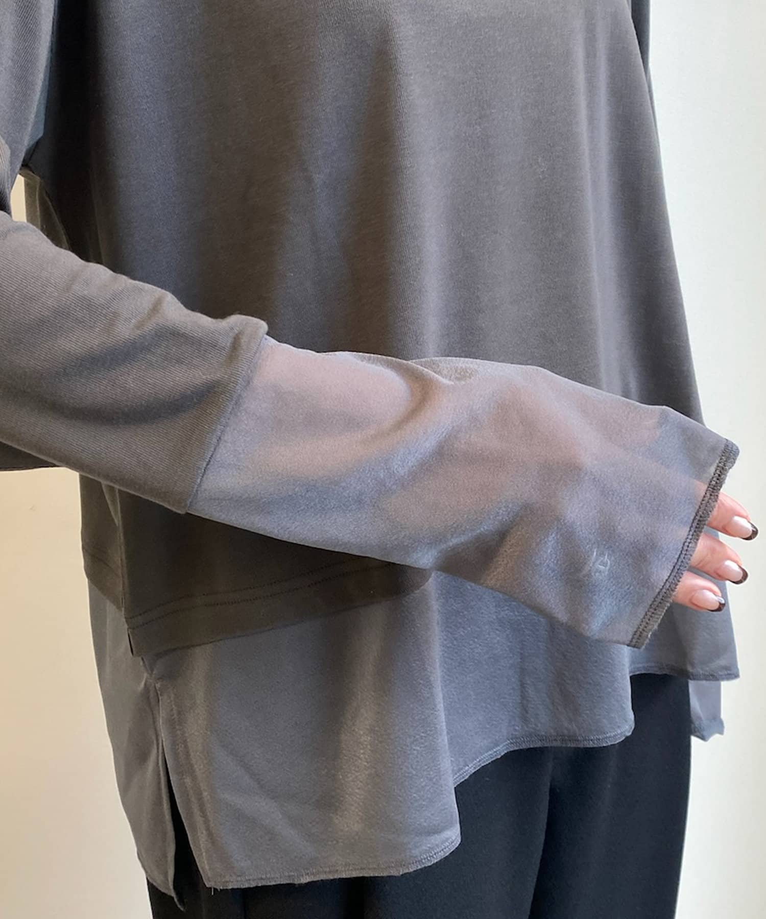 柔らかく肌触りの良い生地感で、お袖と裾はトレンド感のあるシアー素材に切り替え。