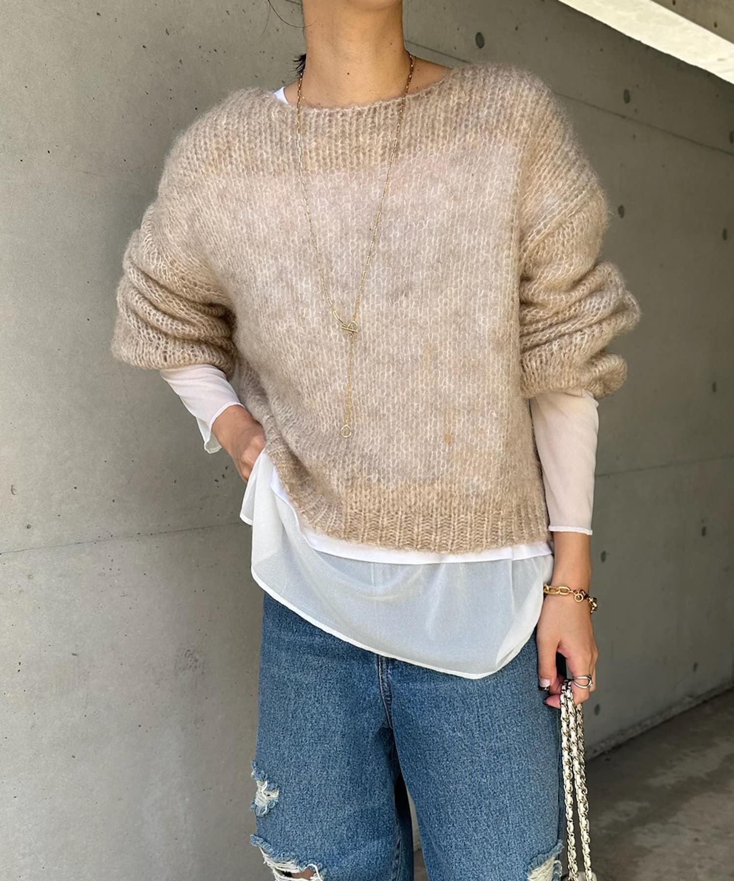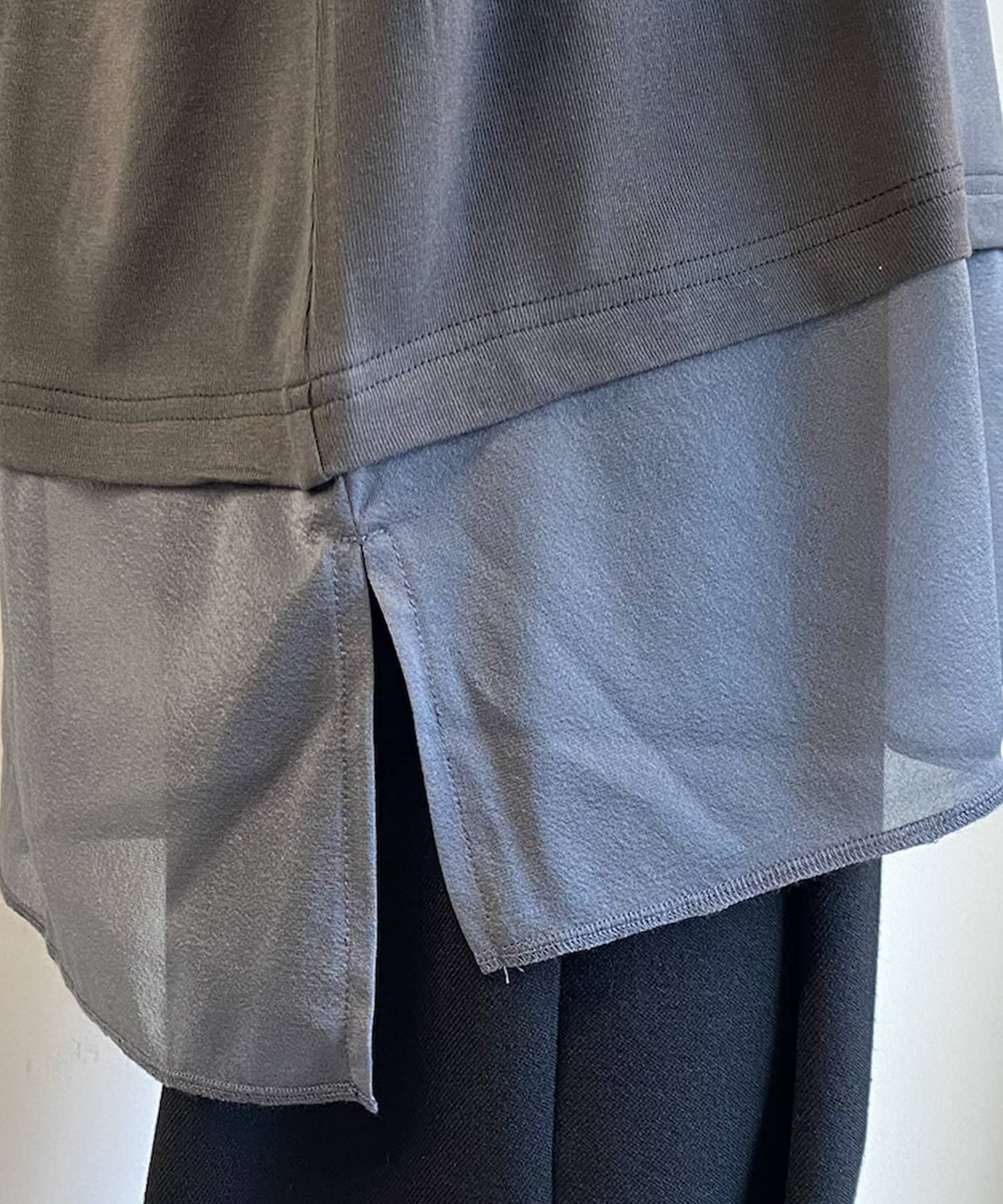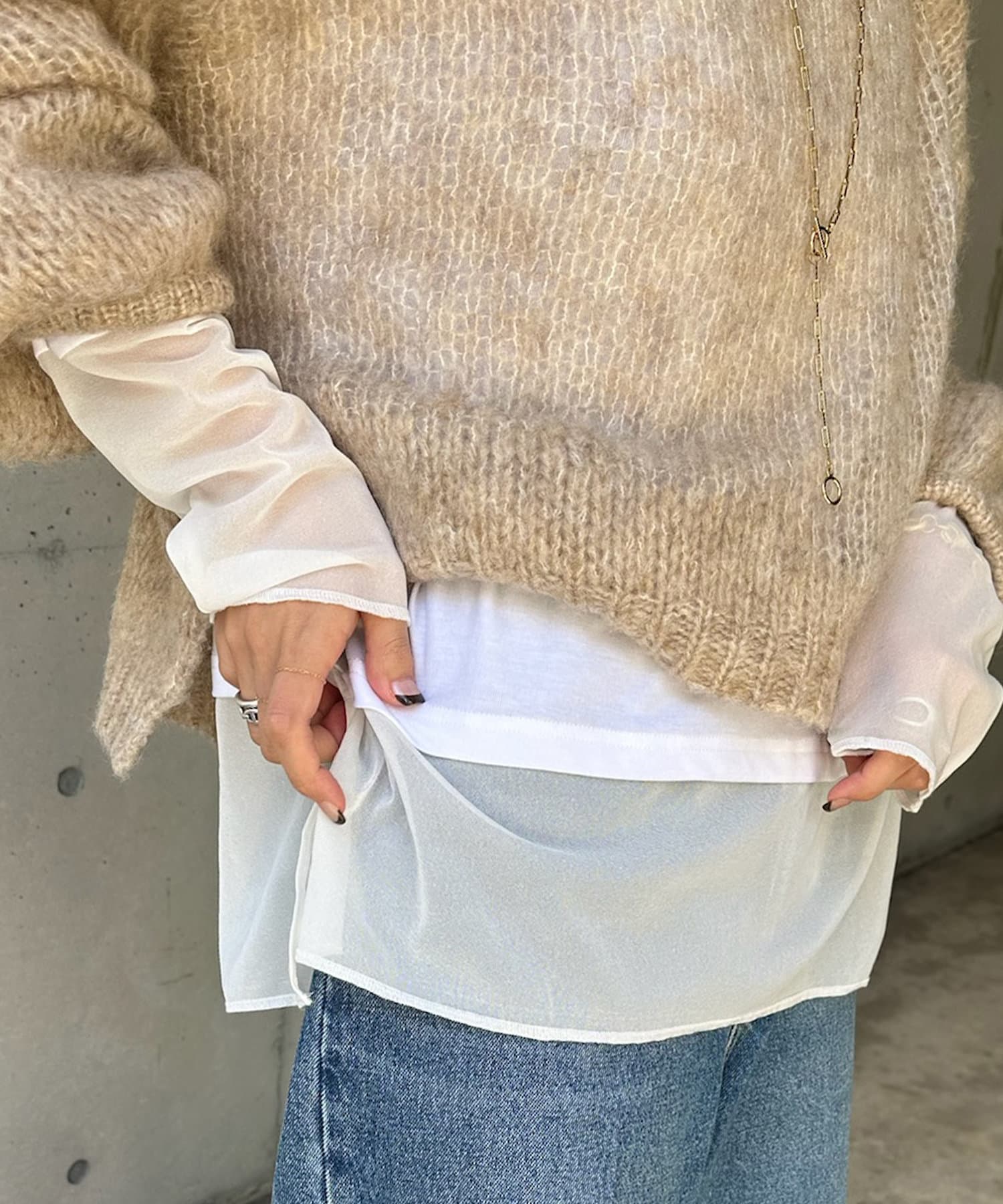 柔らかく肌触りの良い生地感で、お袖と裾はトレンド感のあるシアー素材に切り替え。