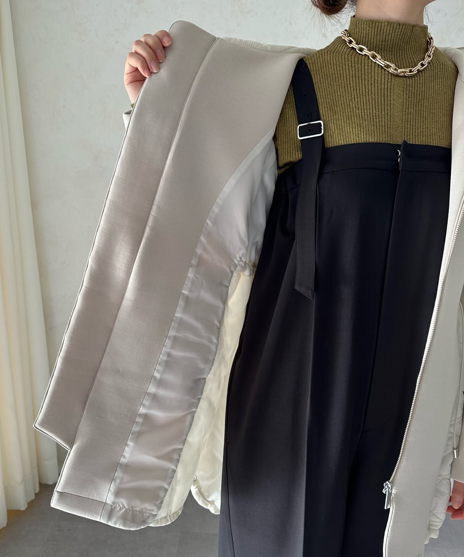 ウエスト付近に施されたドロストによって出来るシルエットが
