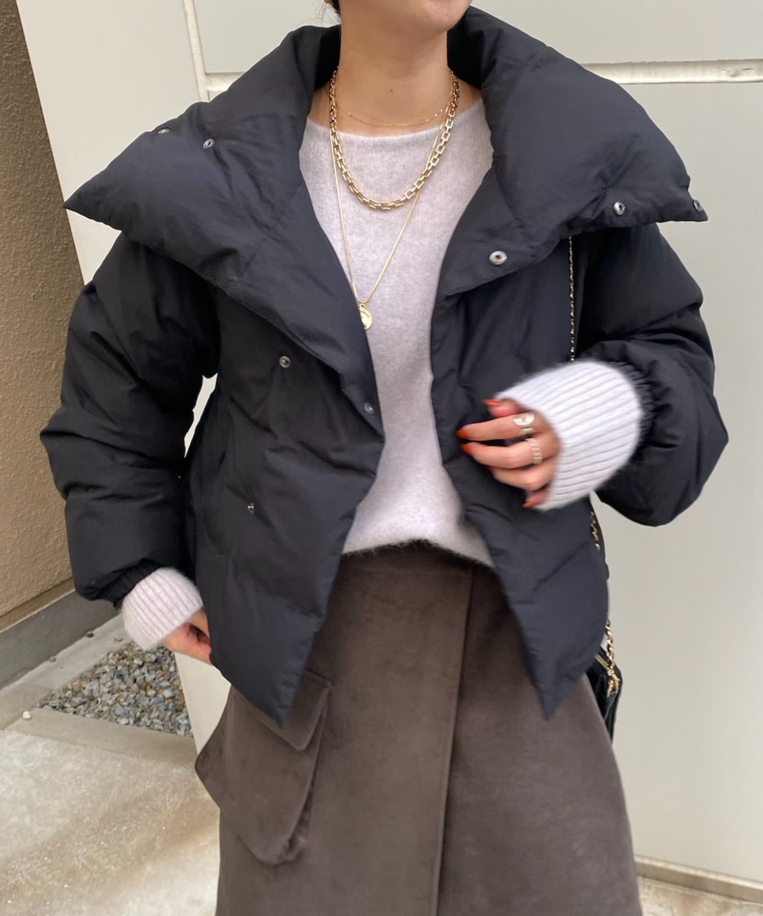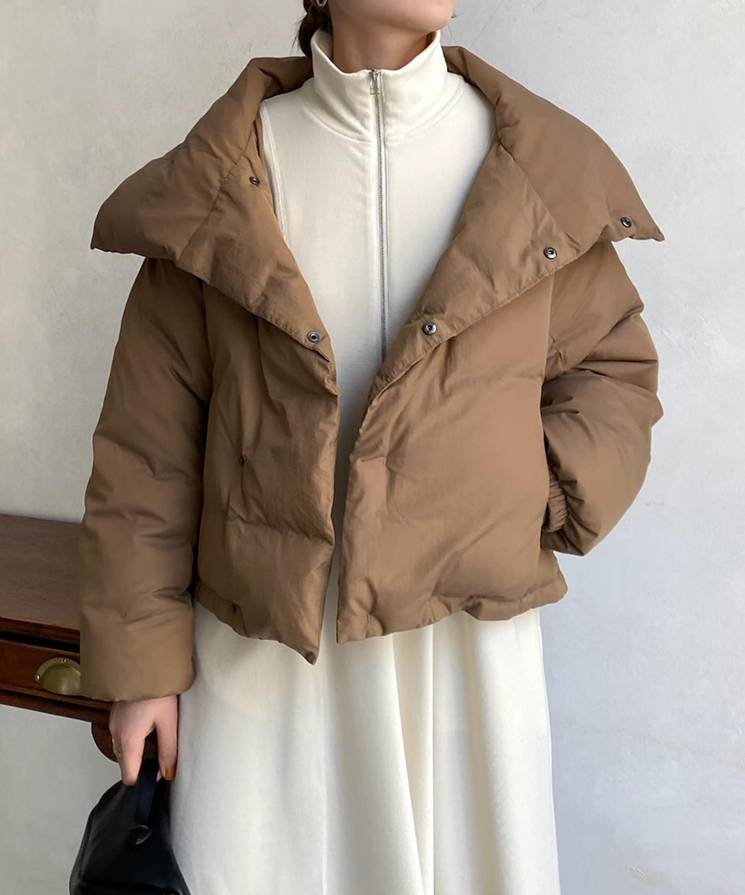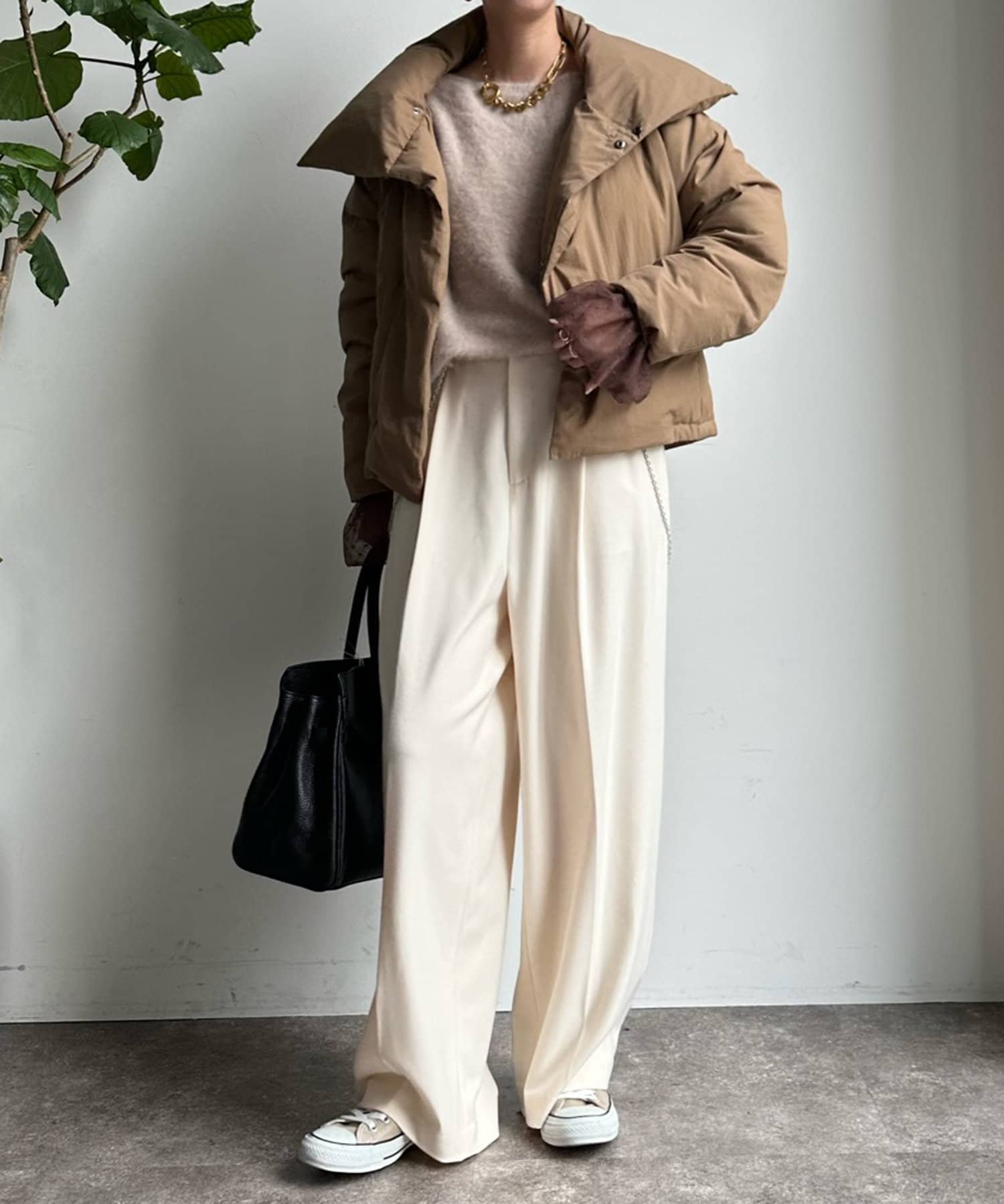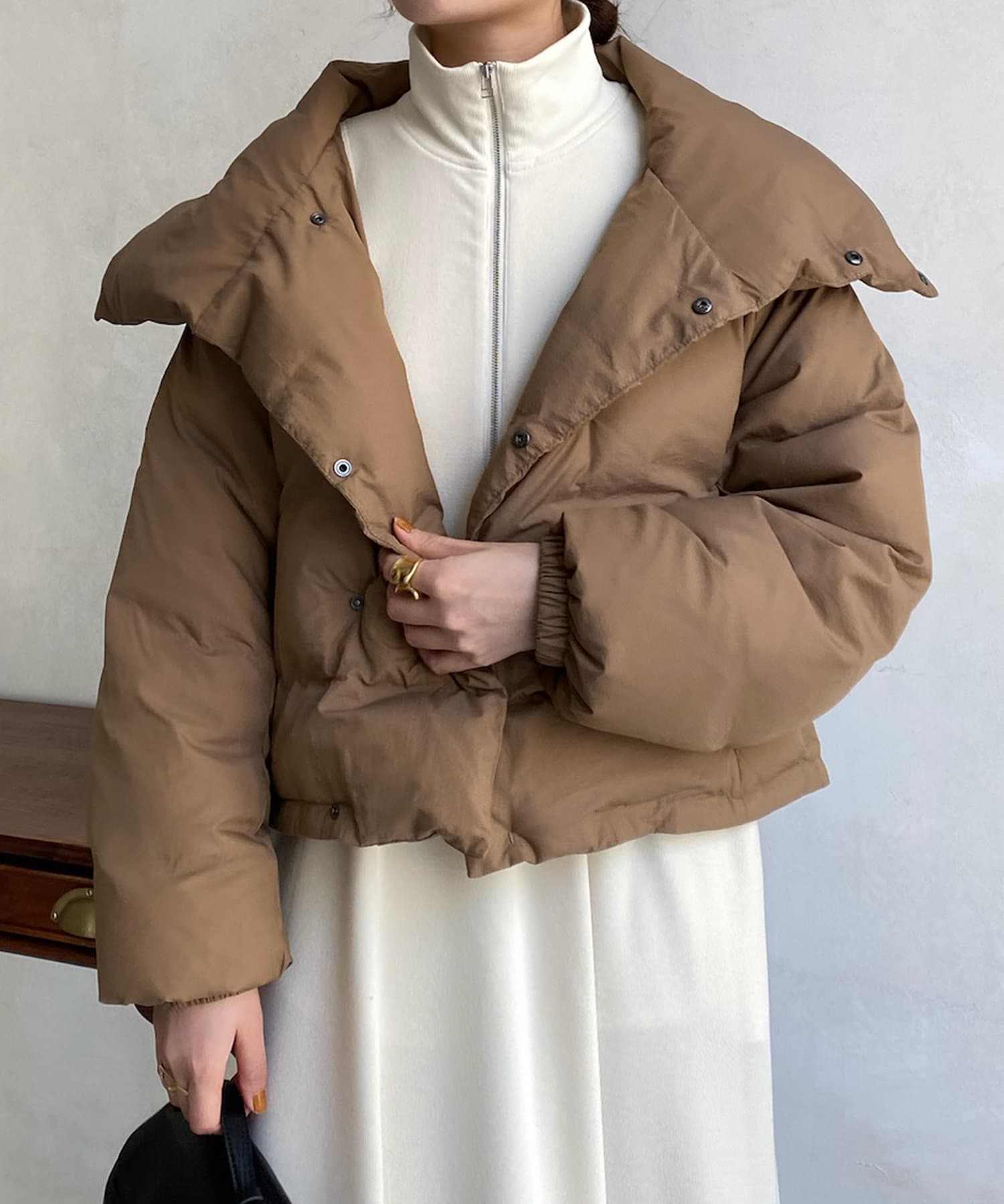 大き目の襟が映えるダウンジャケットとショート丈がトレンド感をプラスしてくれ、