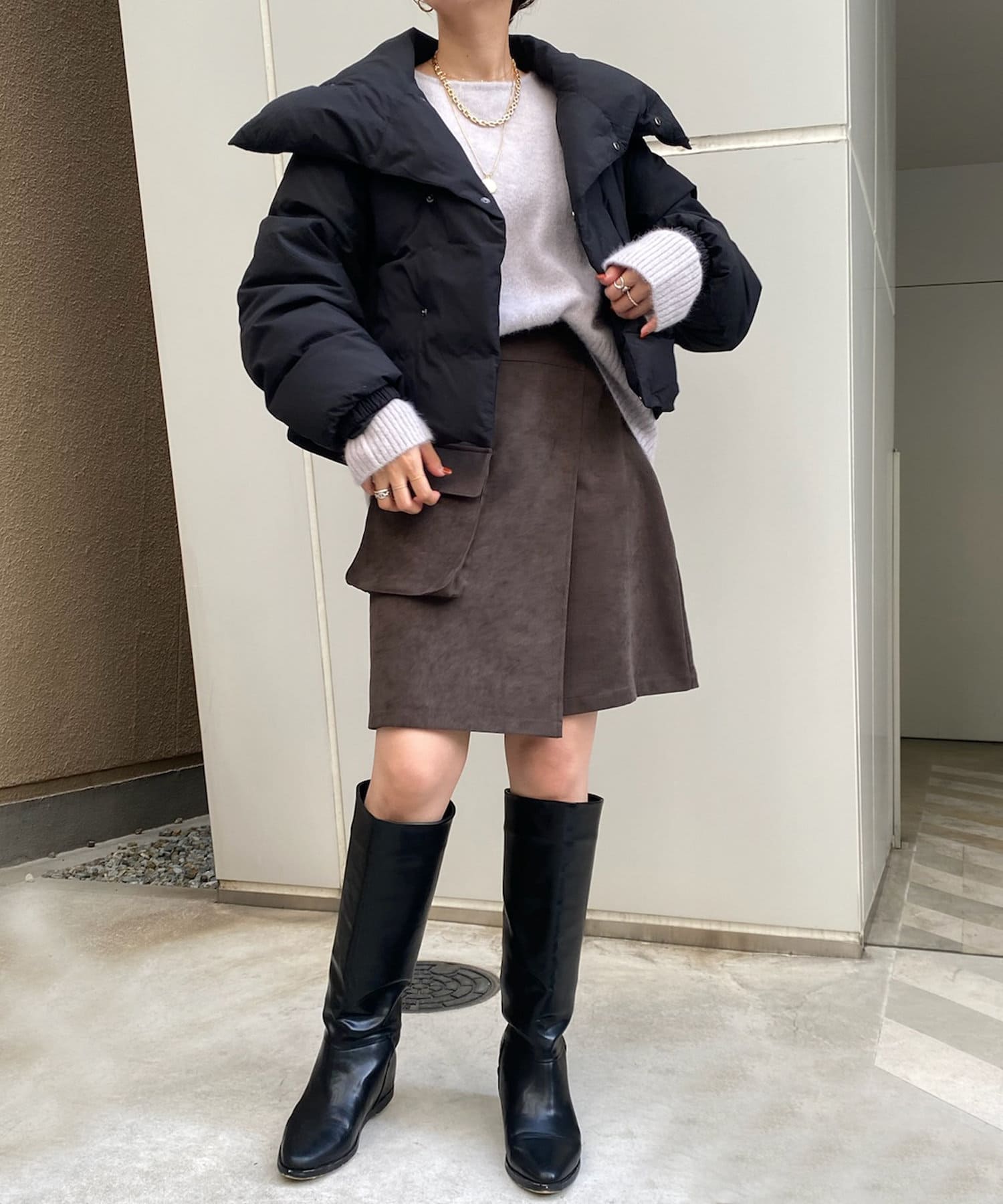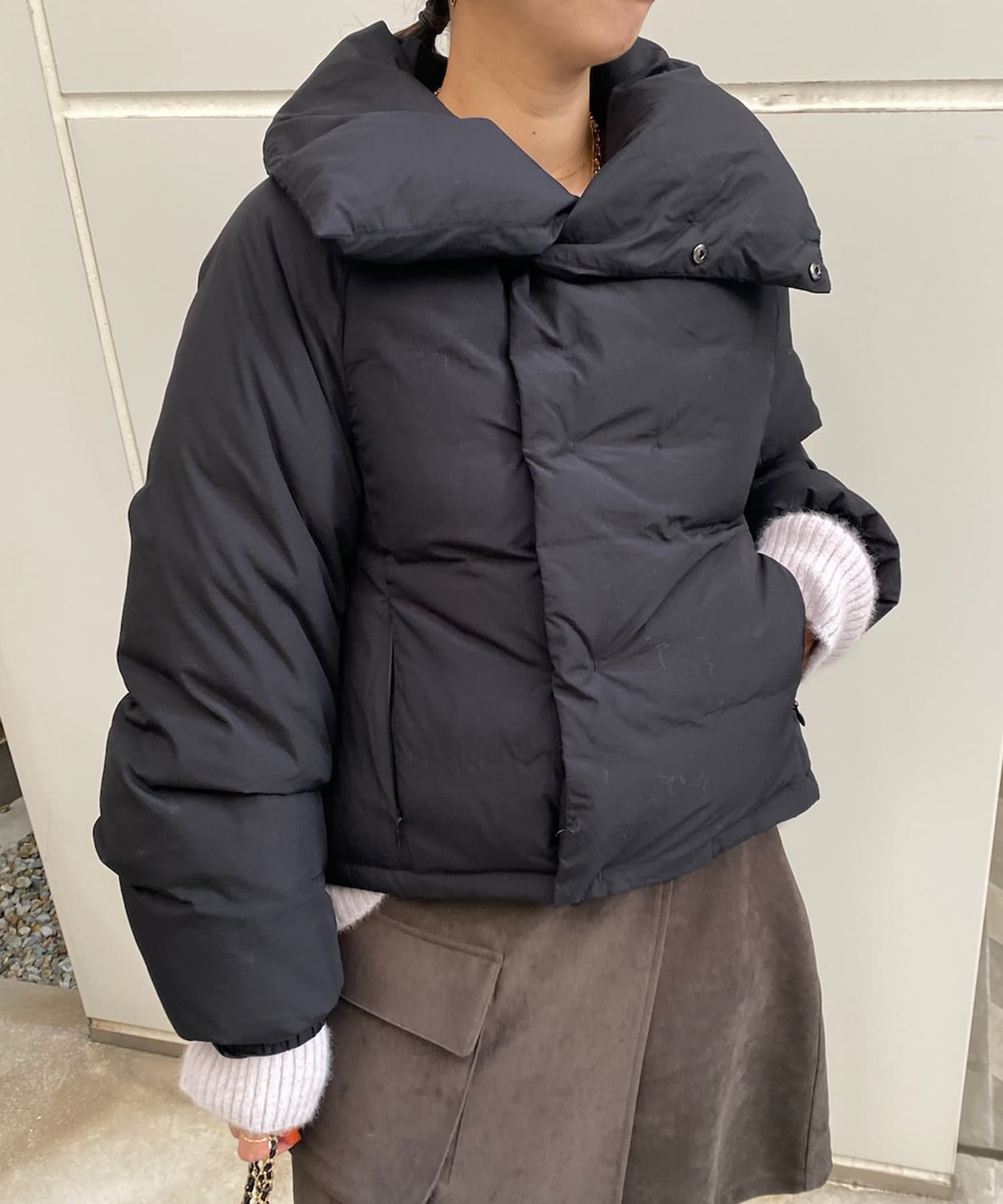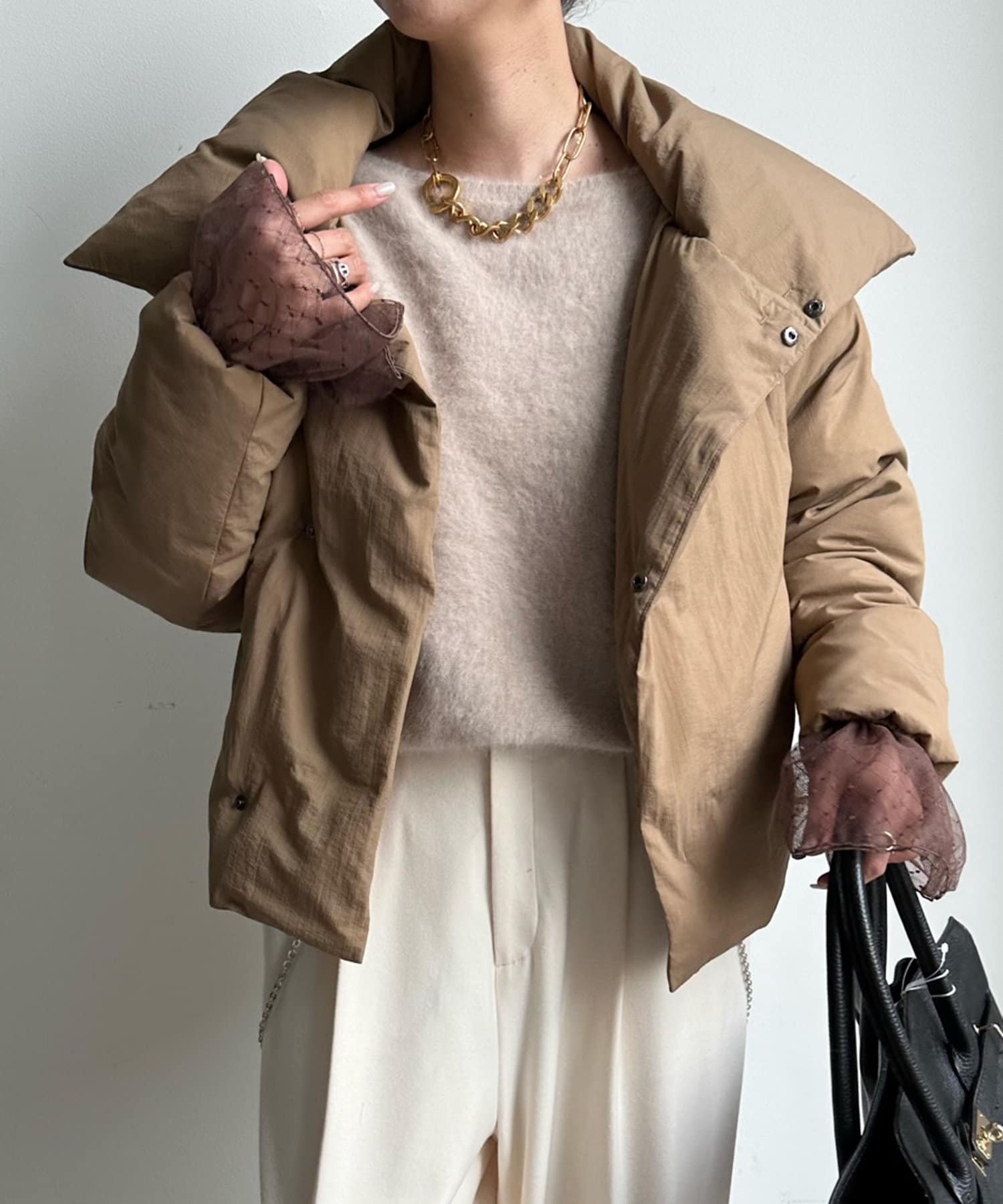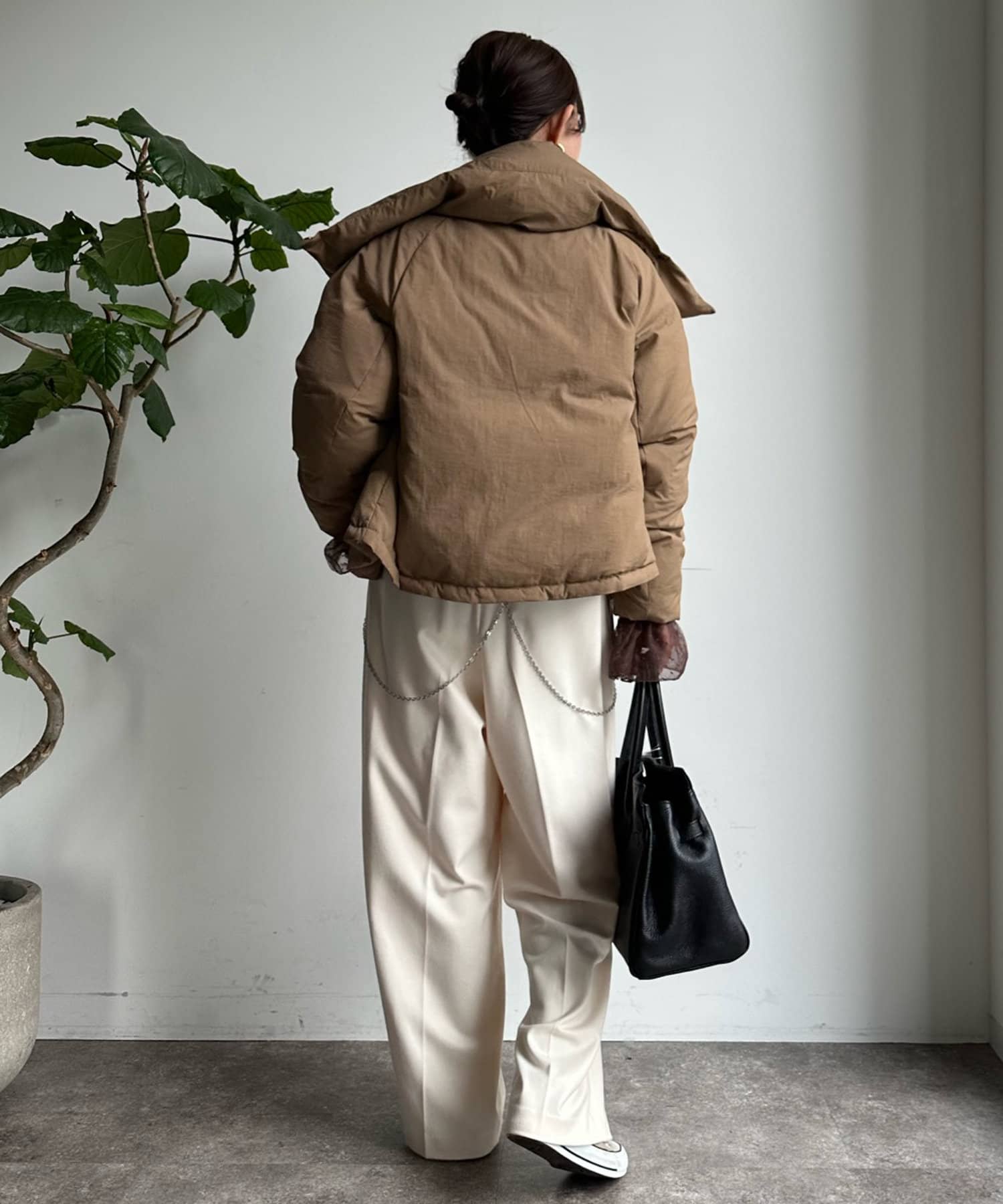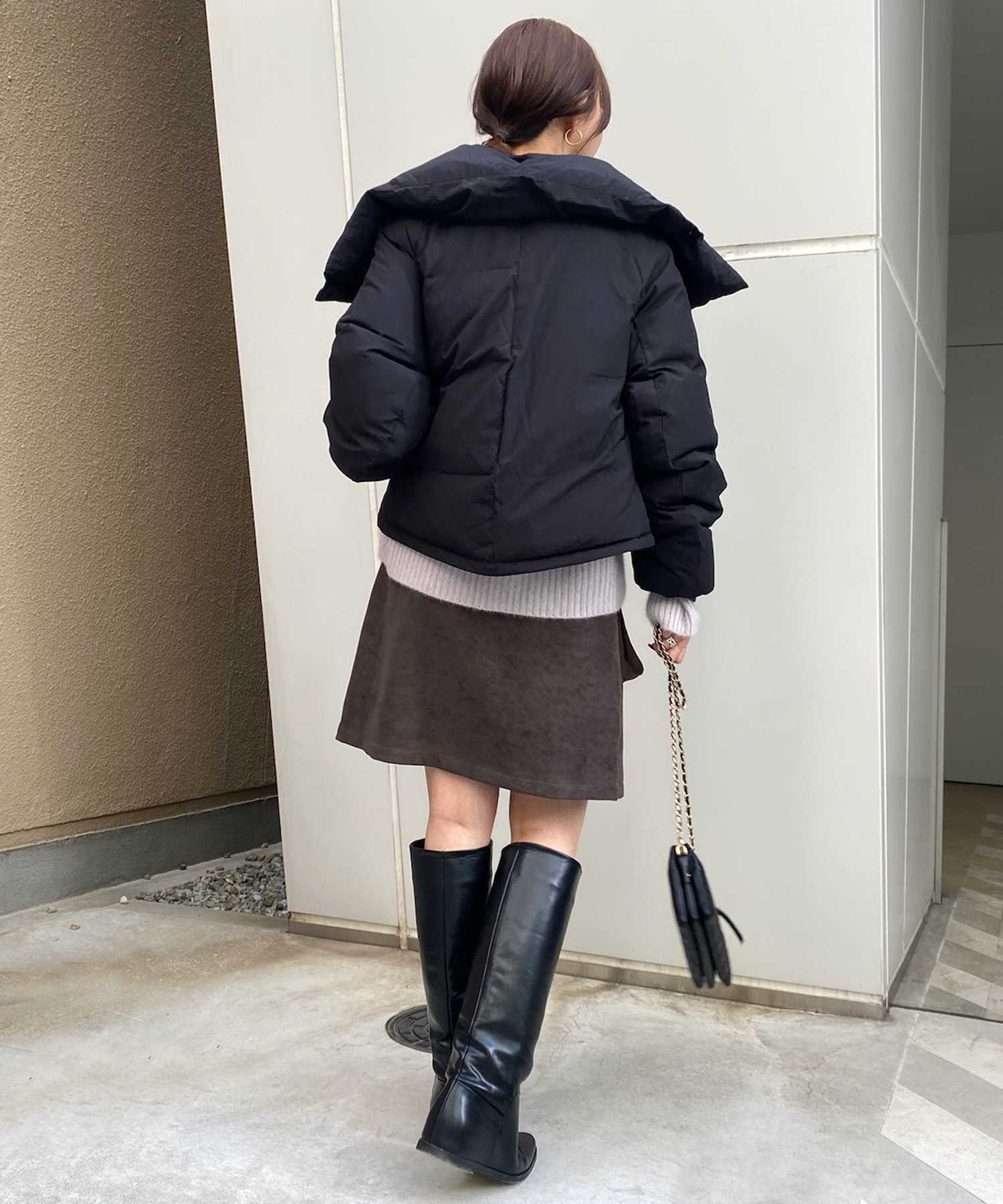 大き目の襟が映えるダウンジャケットとショート丈がトレンド感をプラスしてくれ、