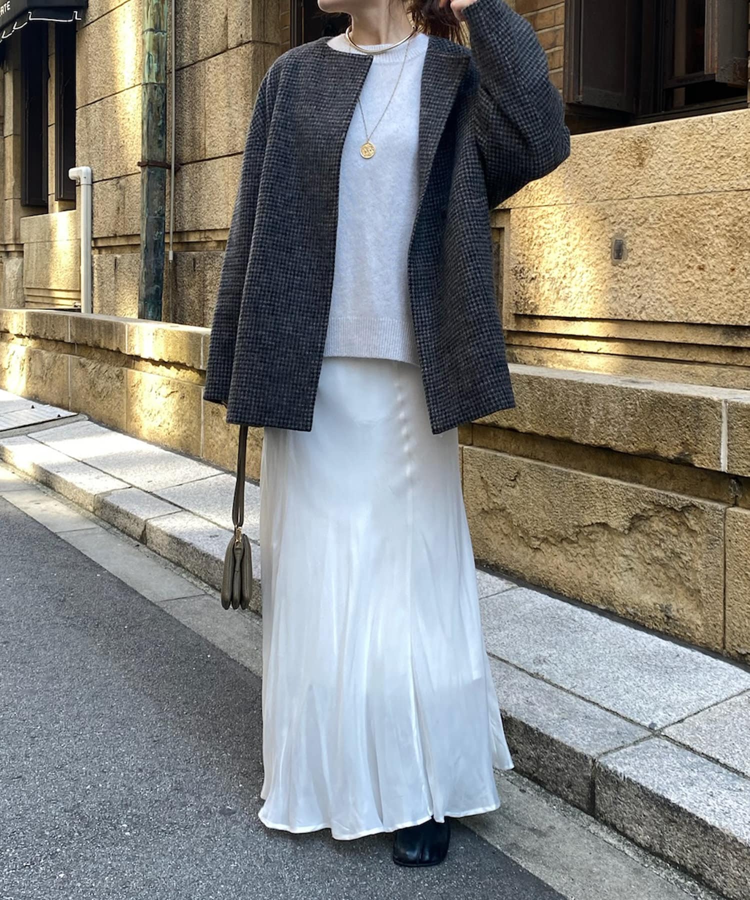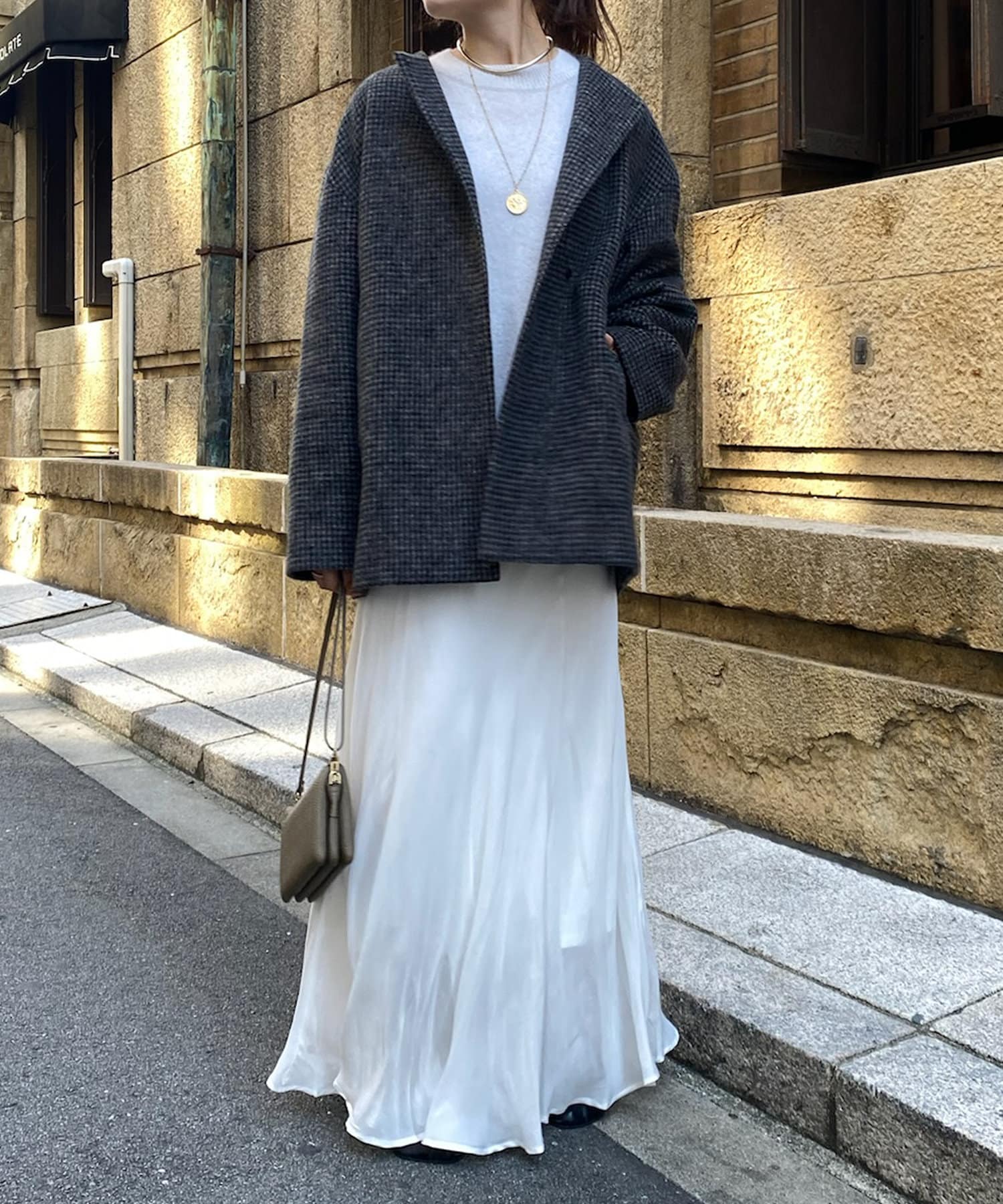 余裕感のあるサイジングでありながら、装飾の少ないデザインですっきりと決まる1着。