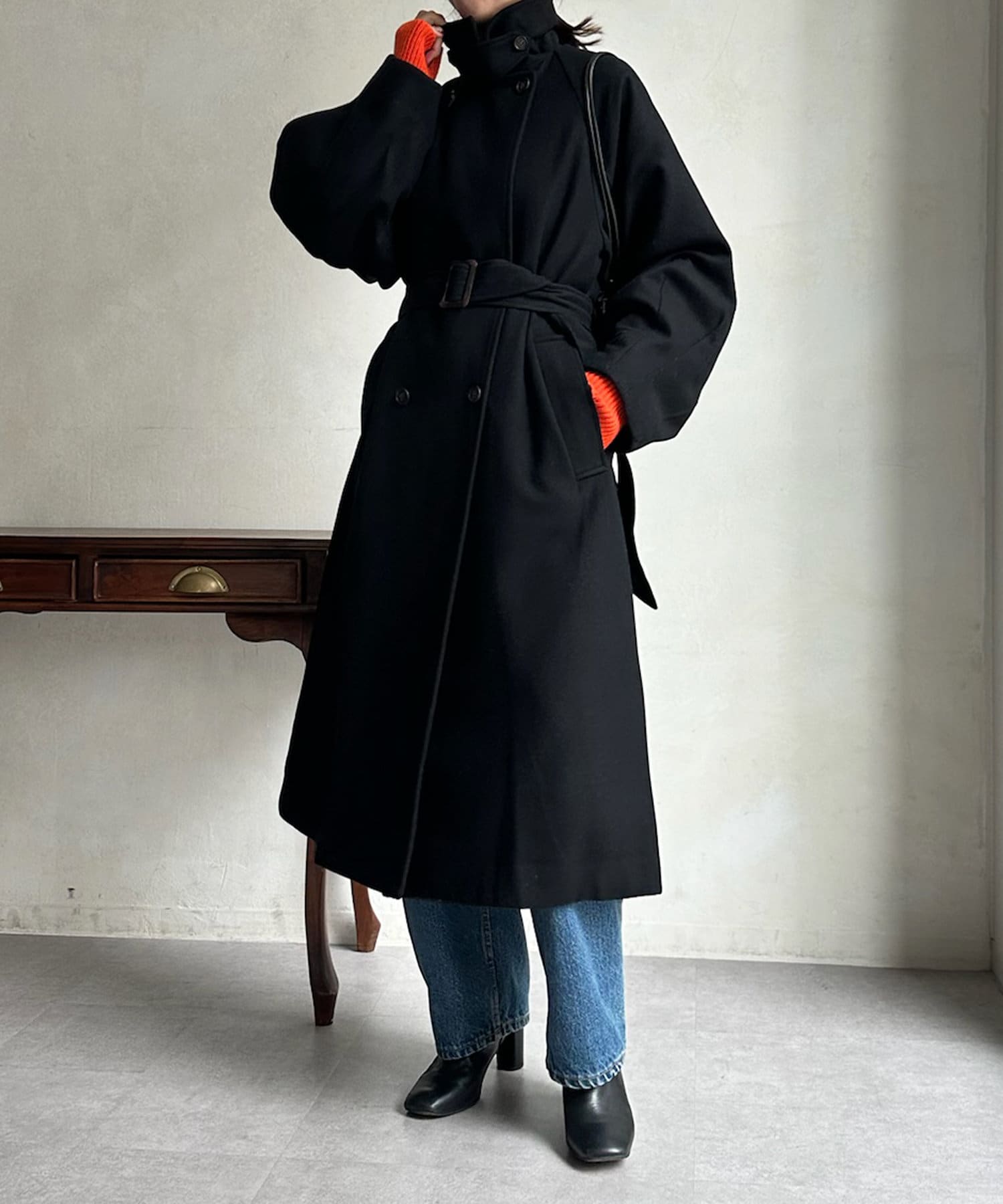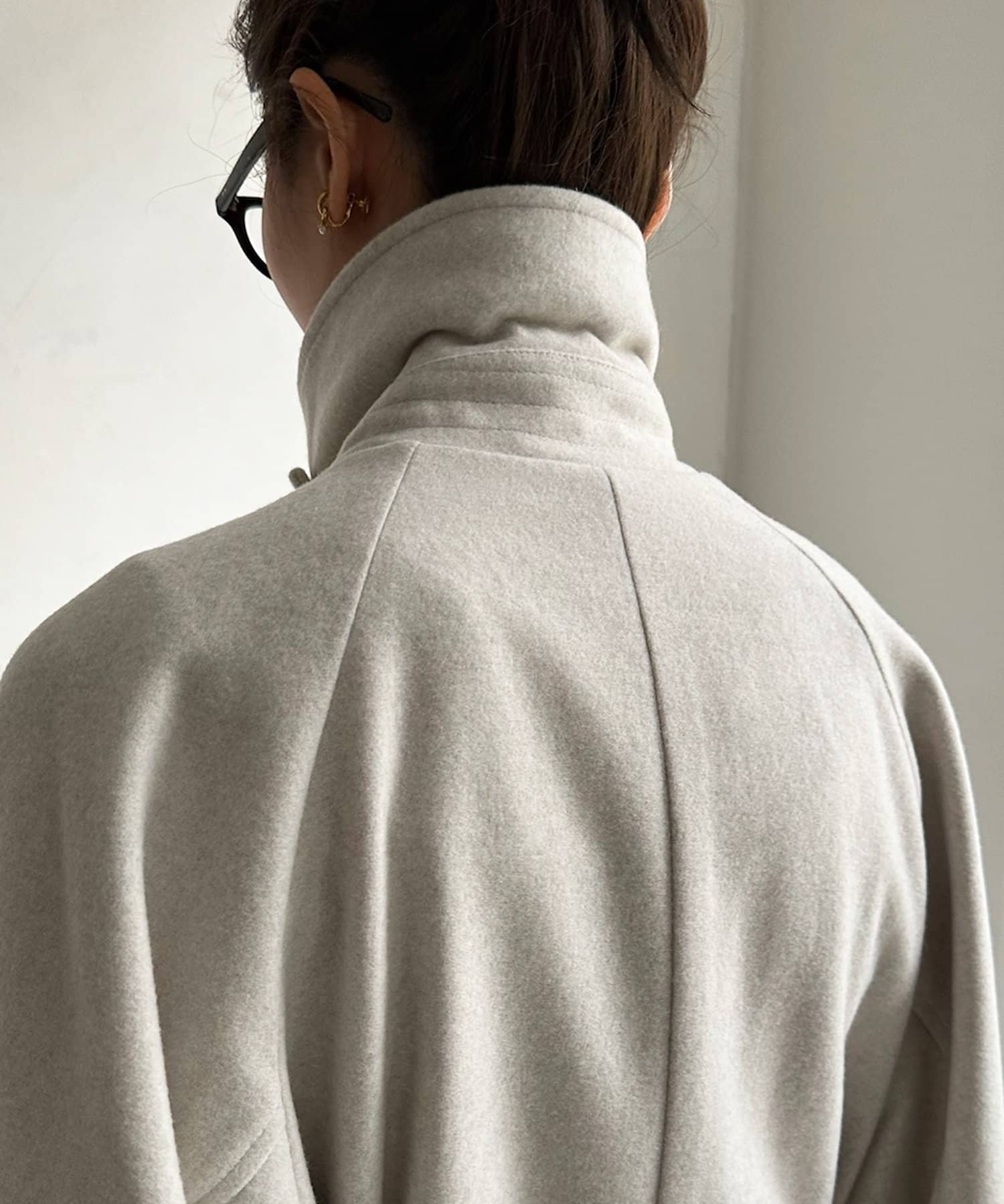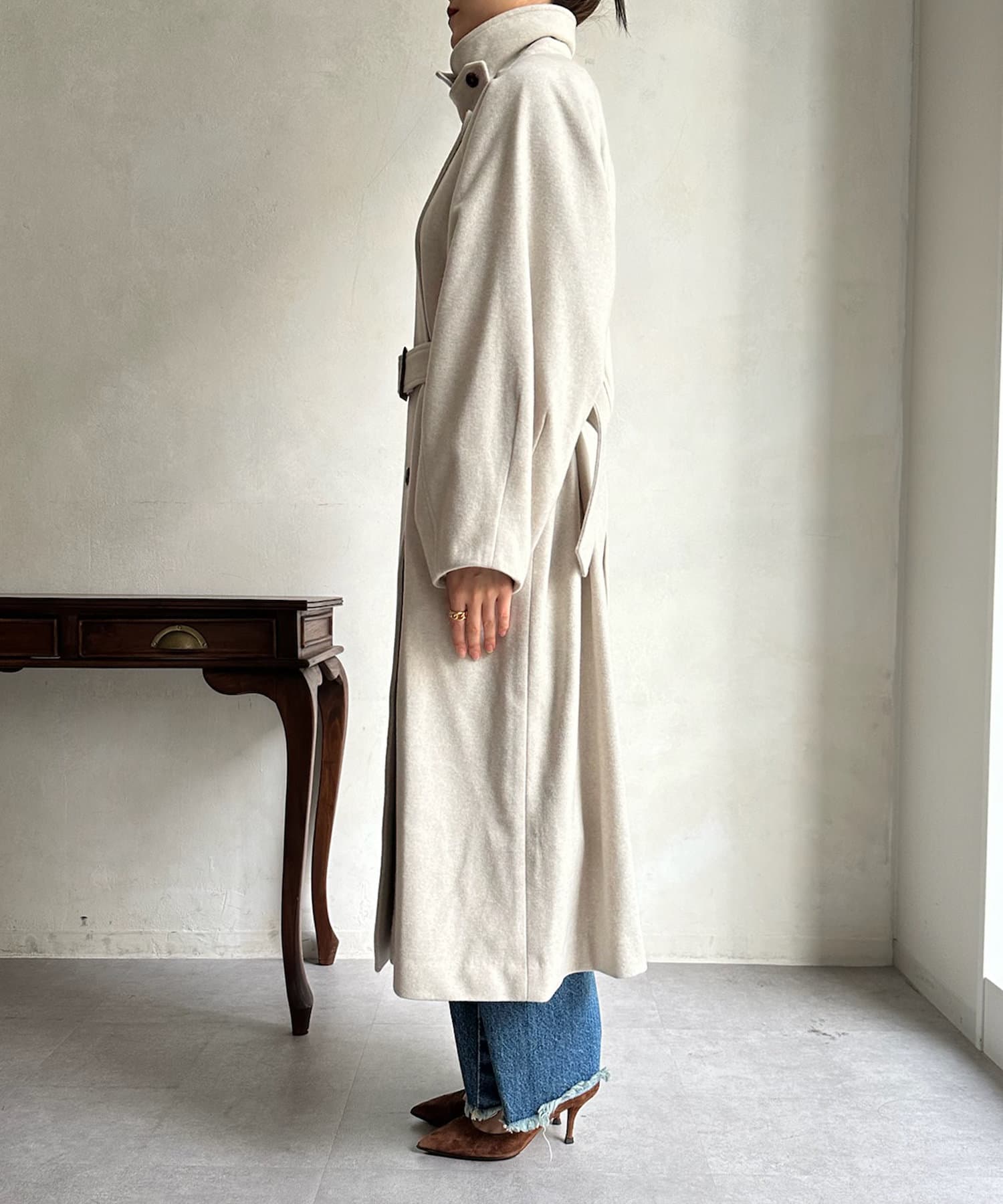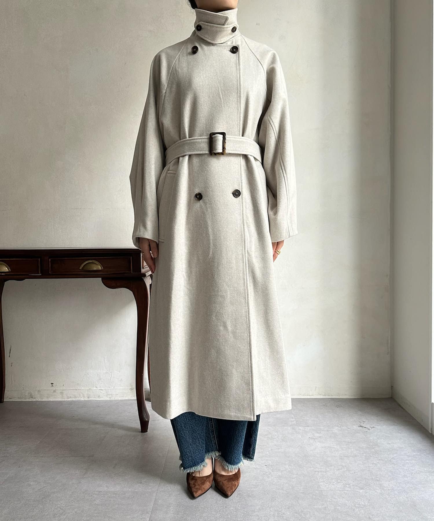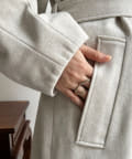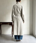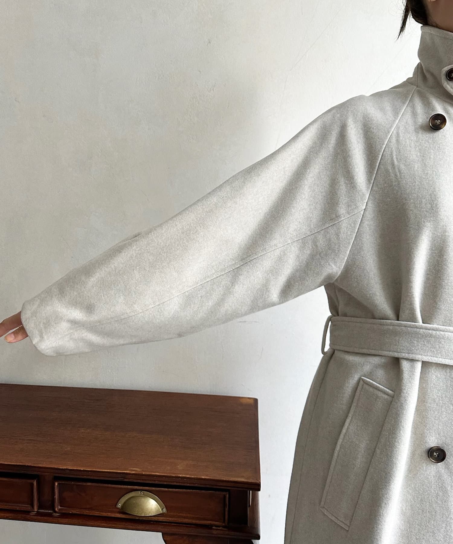 共布のベルトを軽やかに締めてウエストマークをするスタイルや、スタンドカラーとしても着用が出来るため、様々な着こなしで楽しんでいただけますよ。