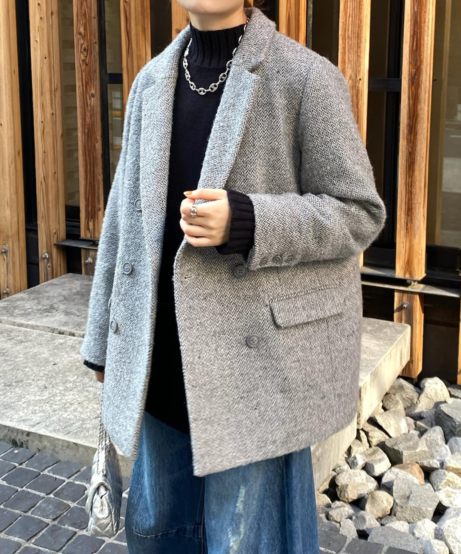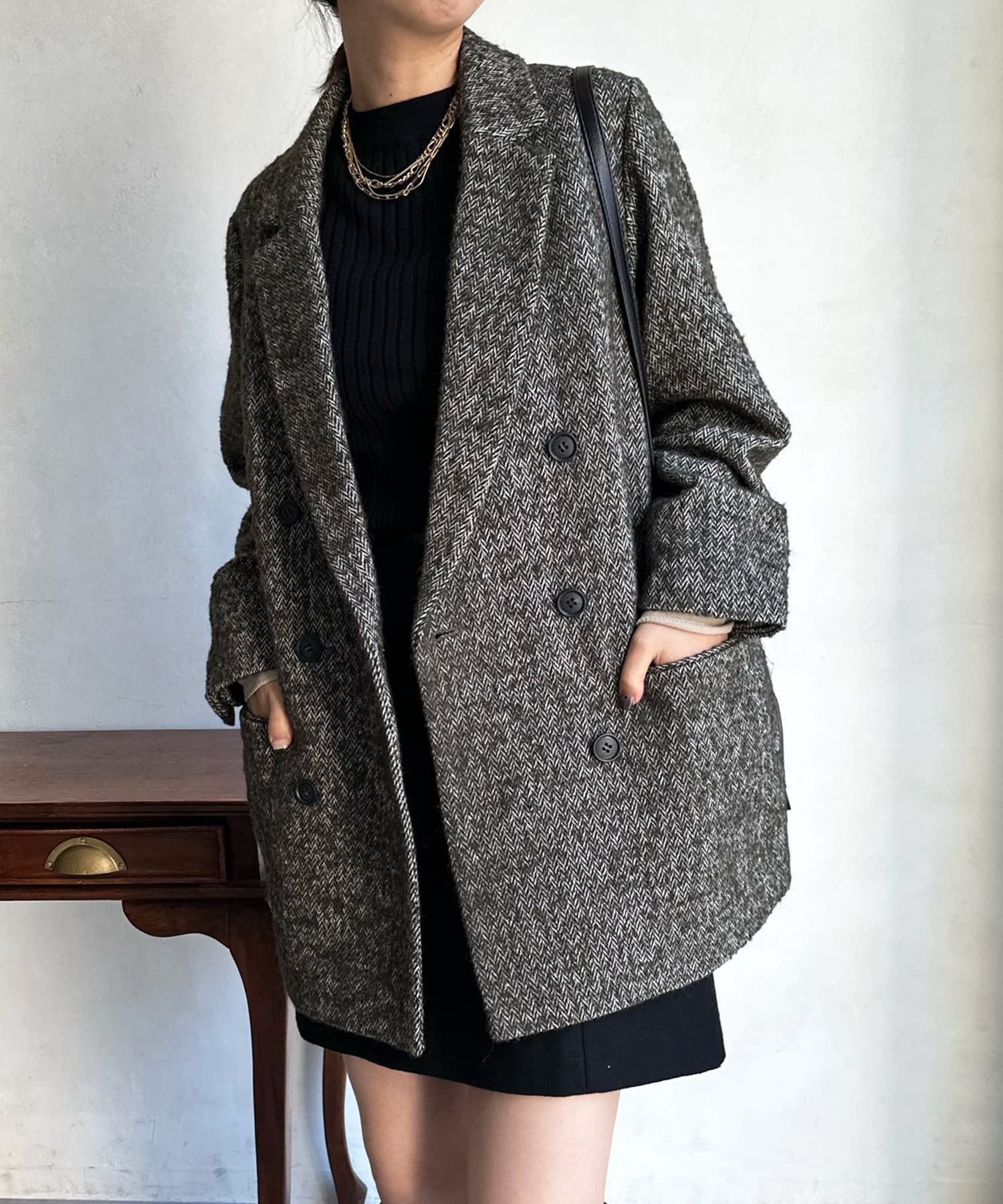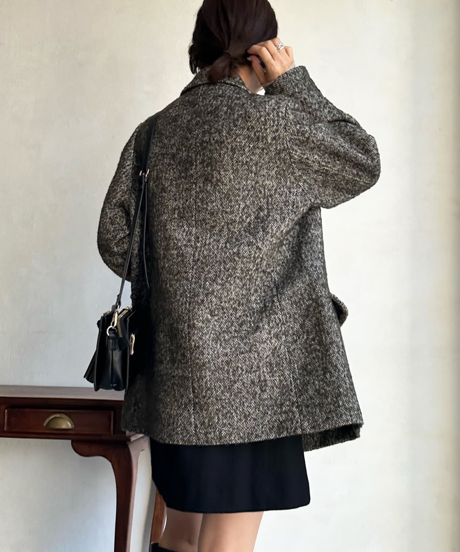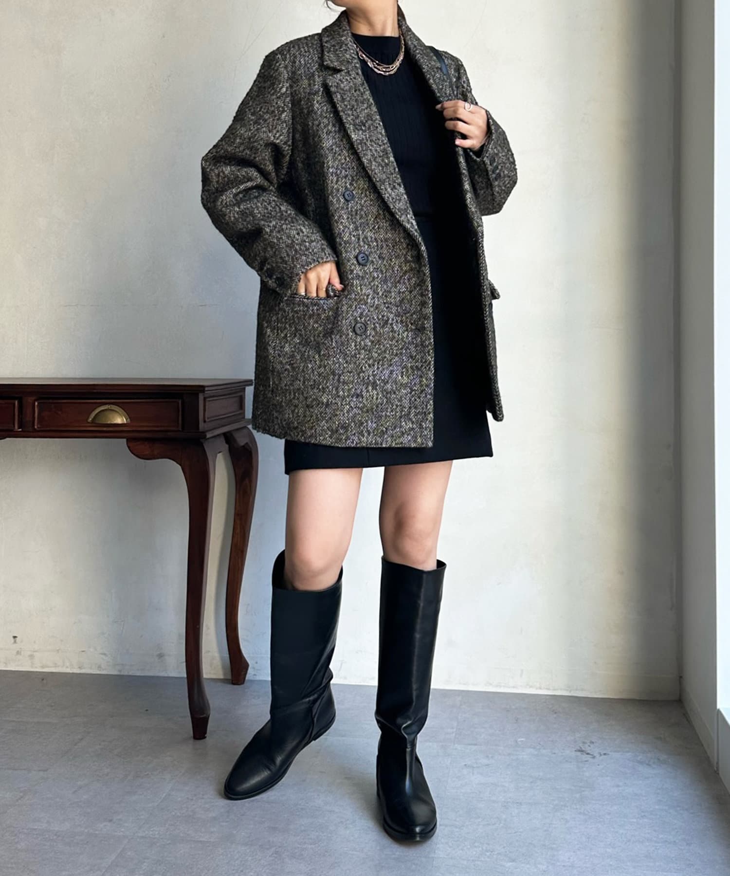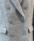 ヘリンボーン柄+ダブルジャケットのディティールが上品な印象に。