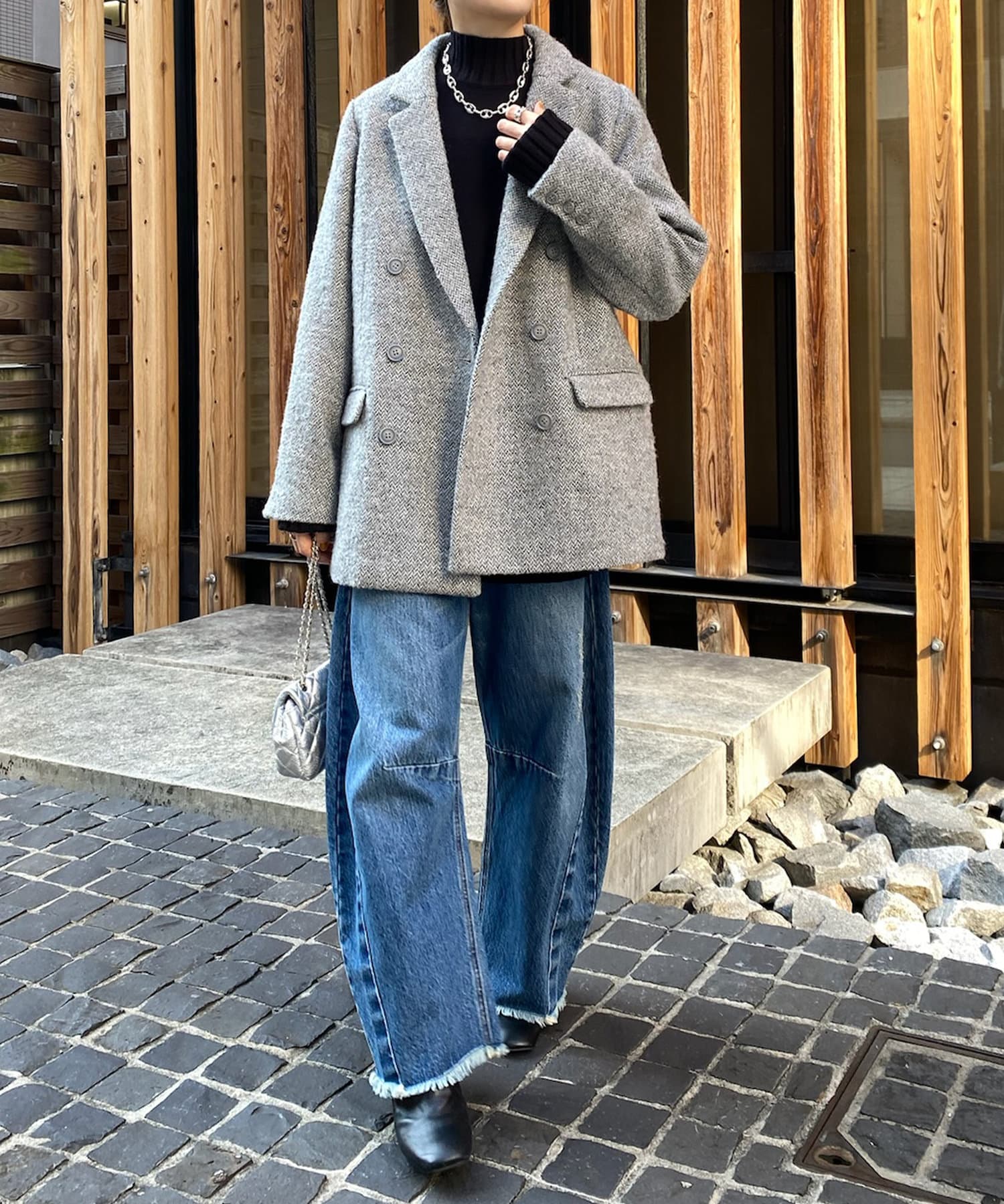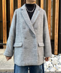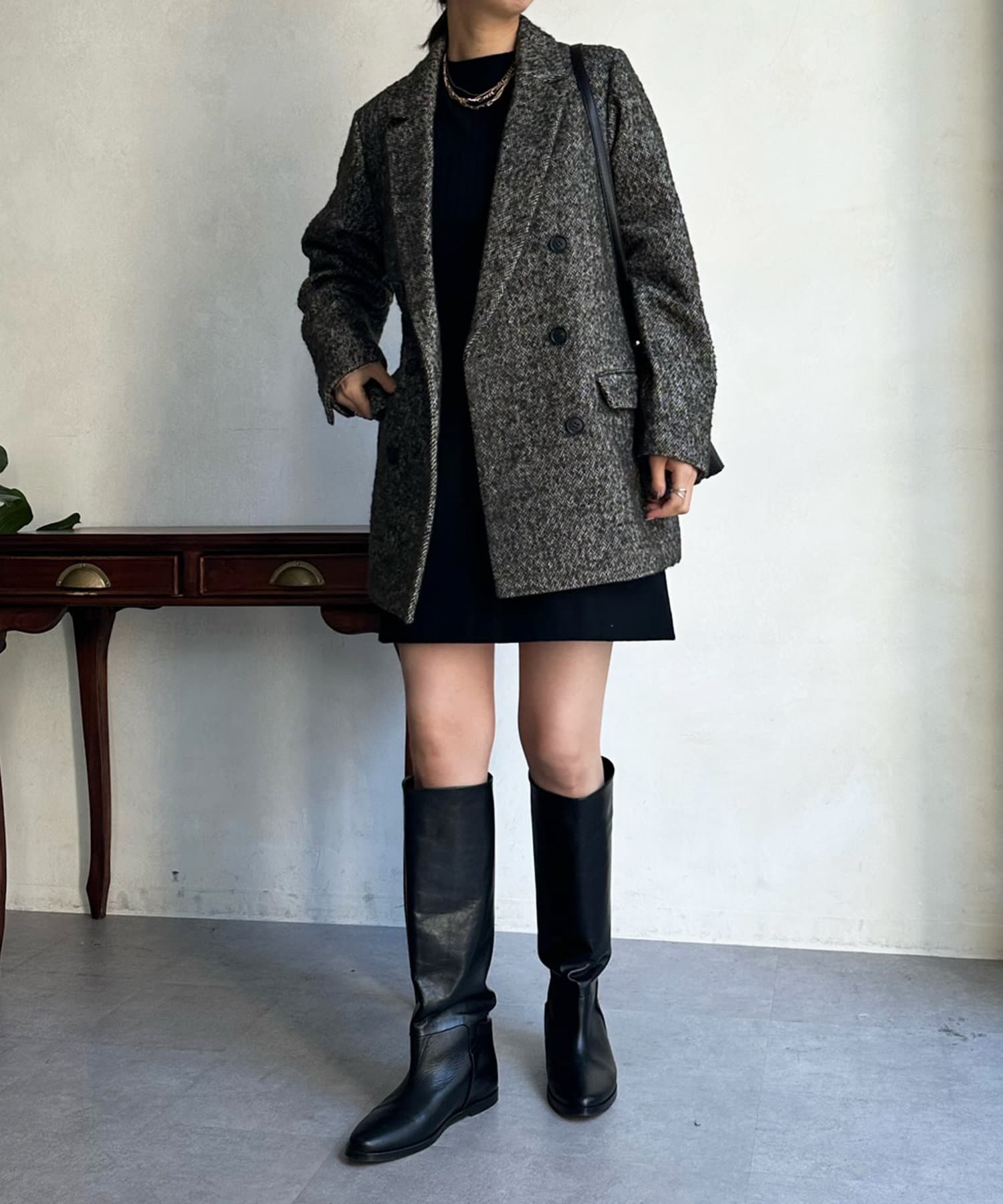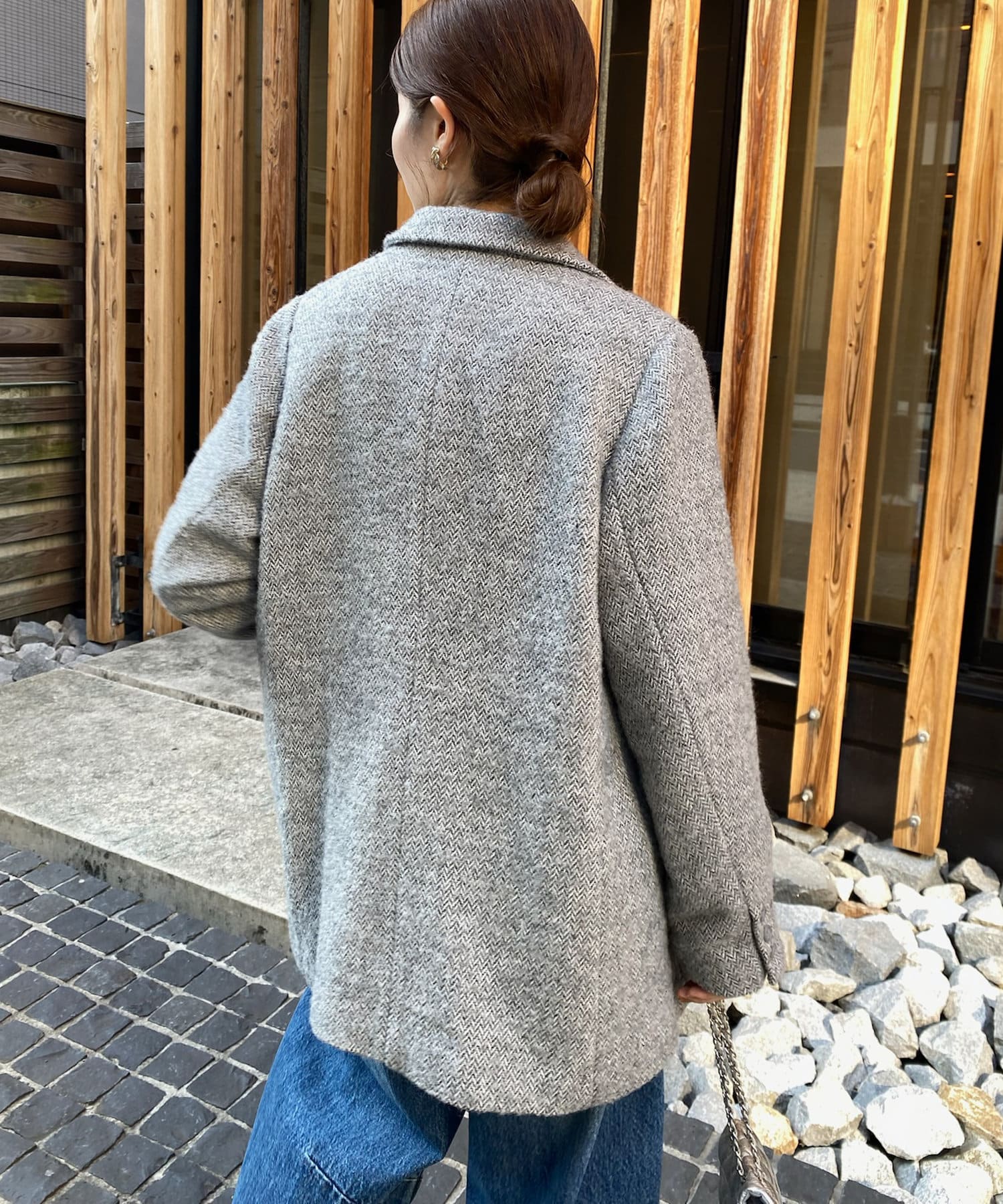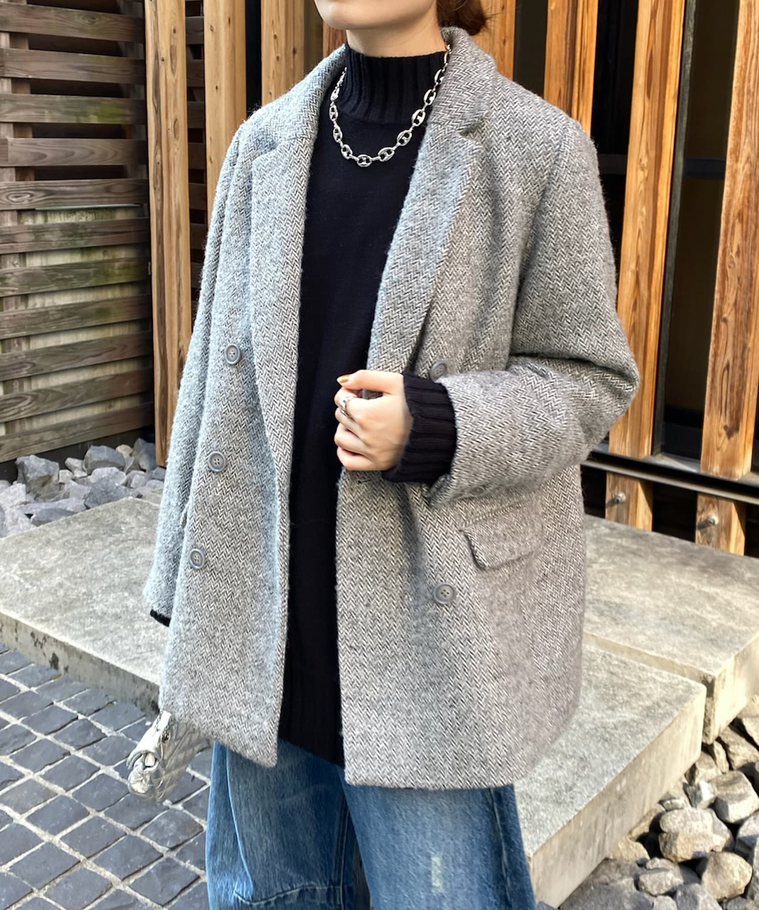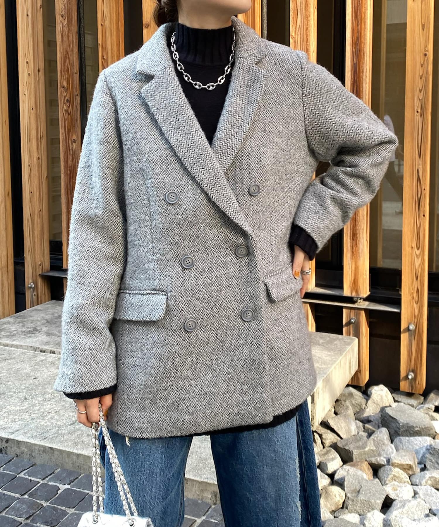 ヘリンボーン柄+ダブルジャケットのディティールが上品な印象に。