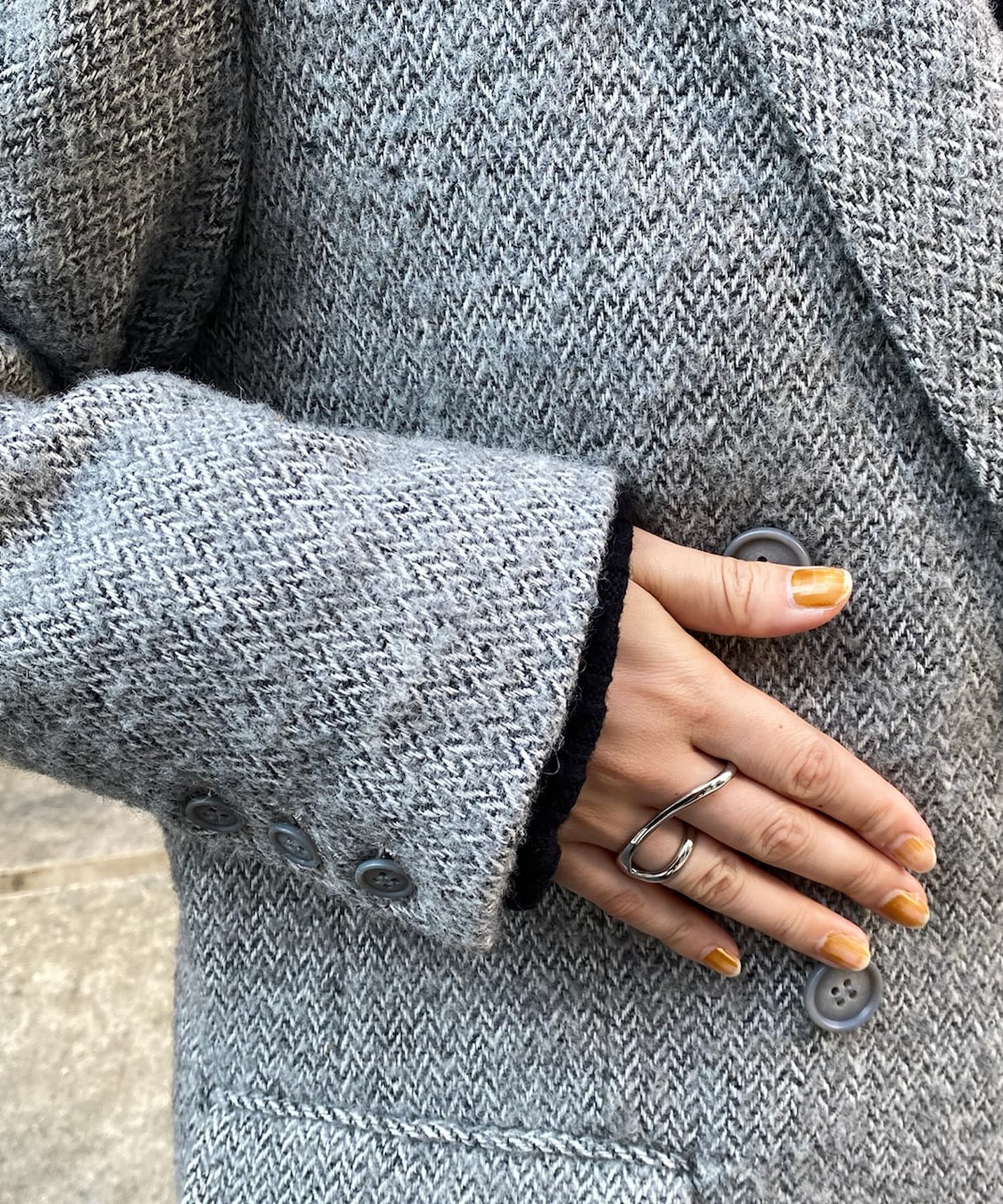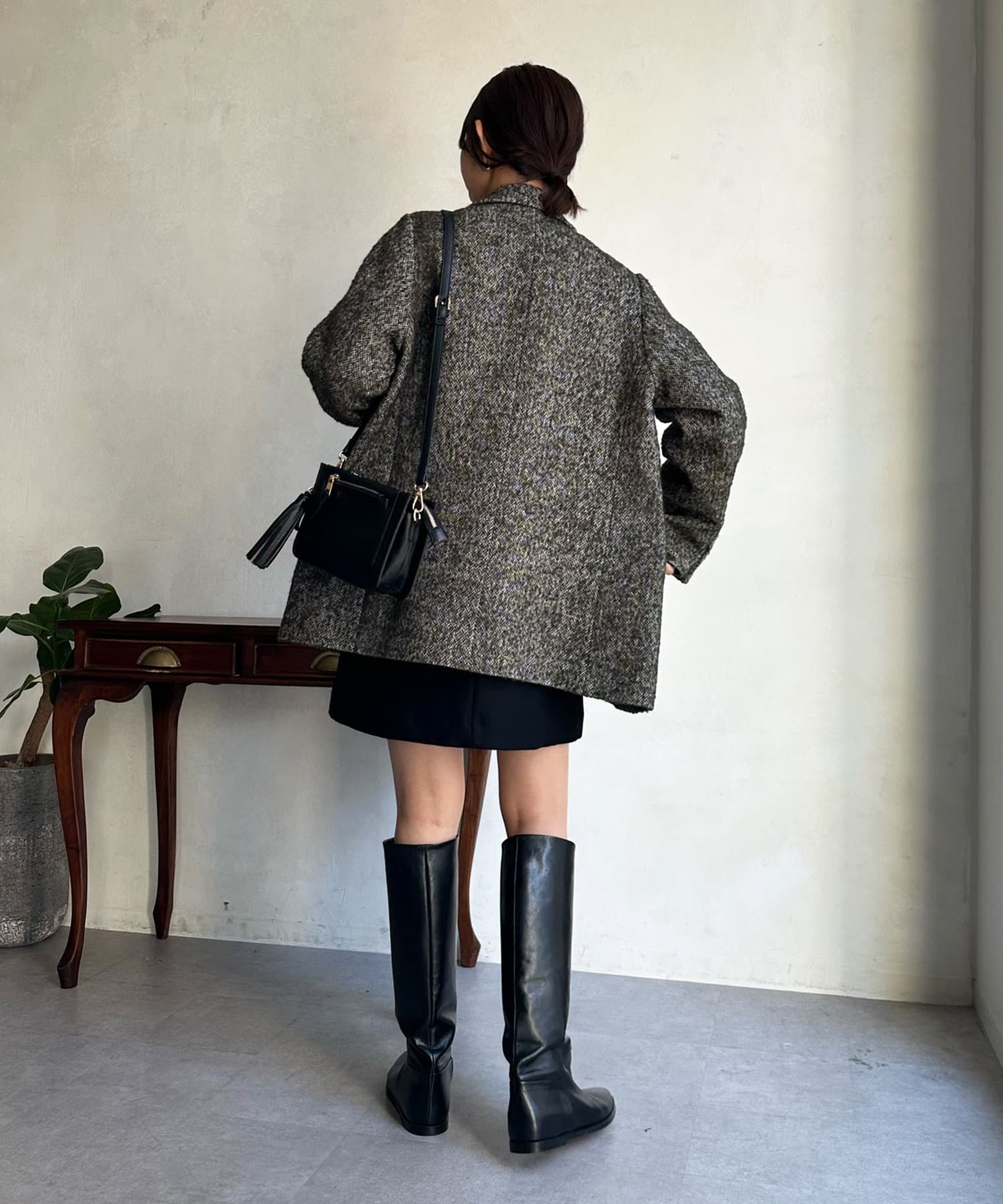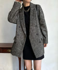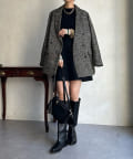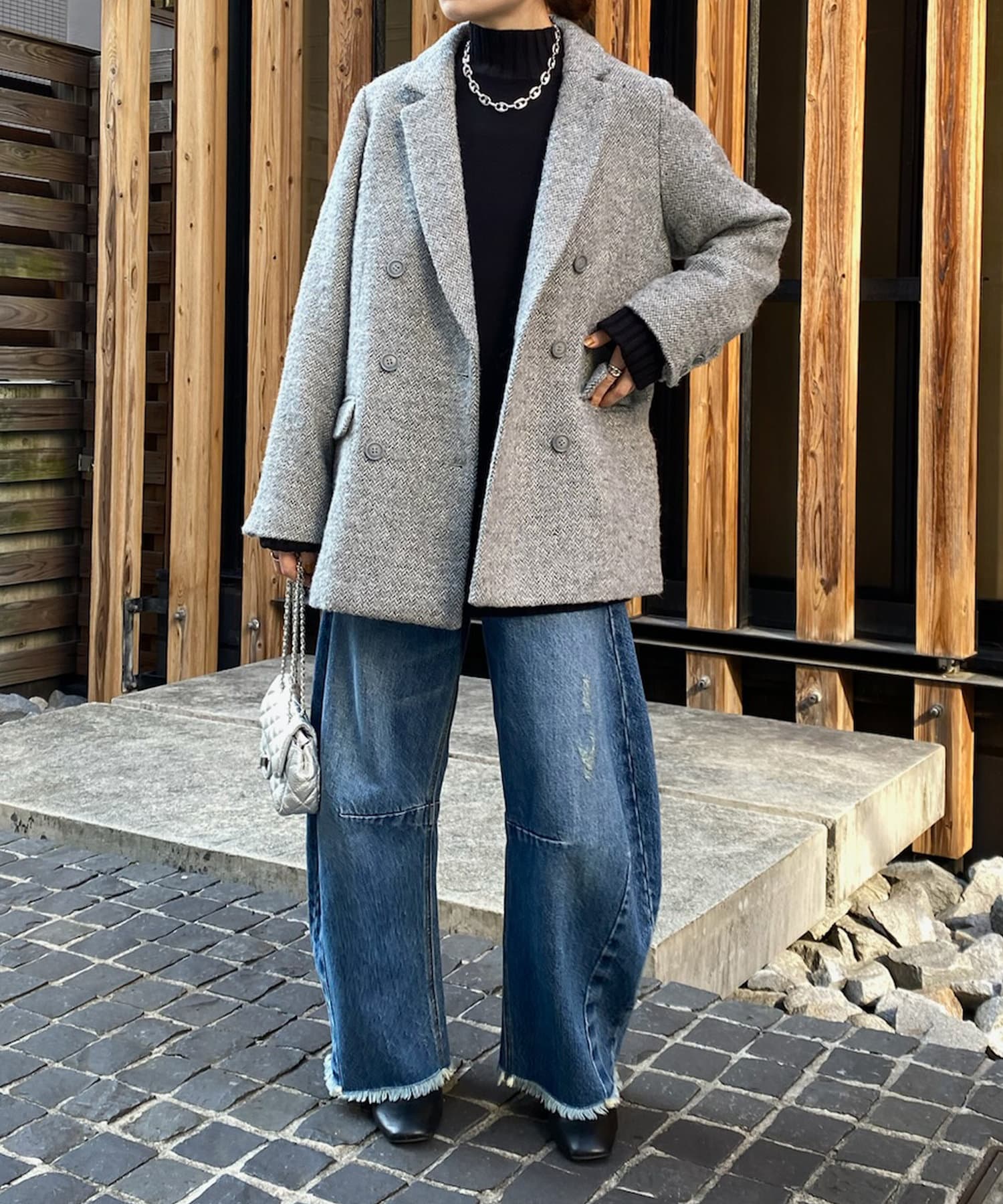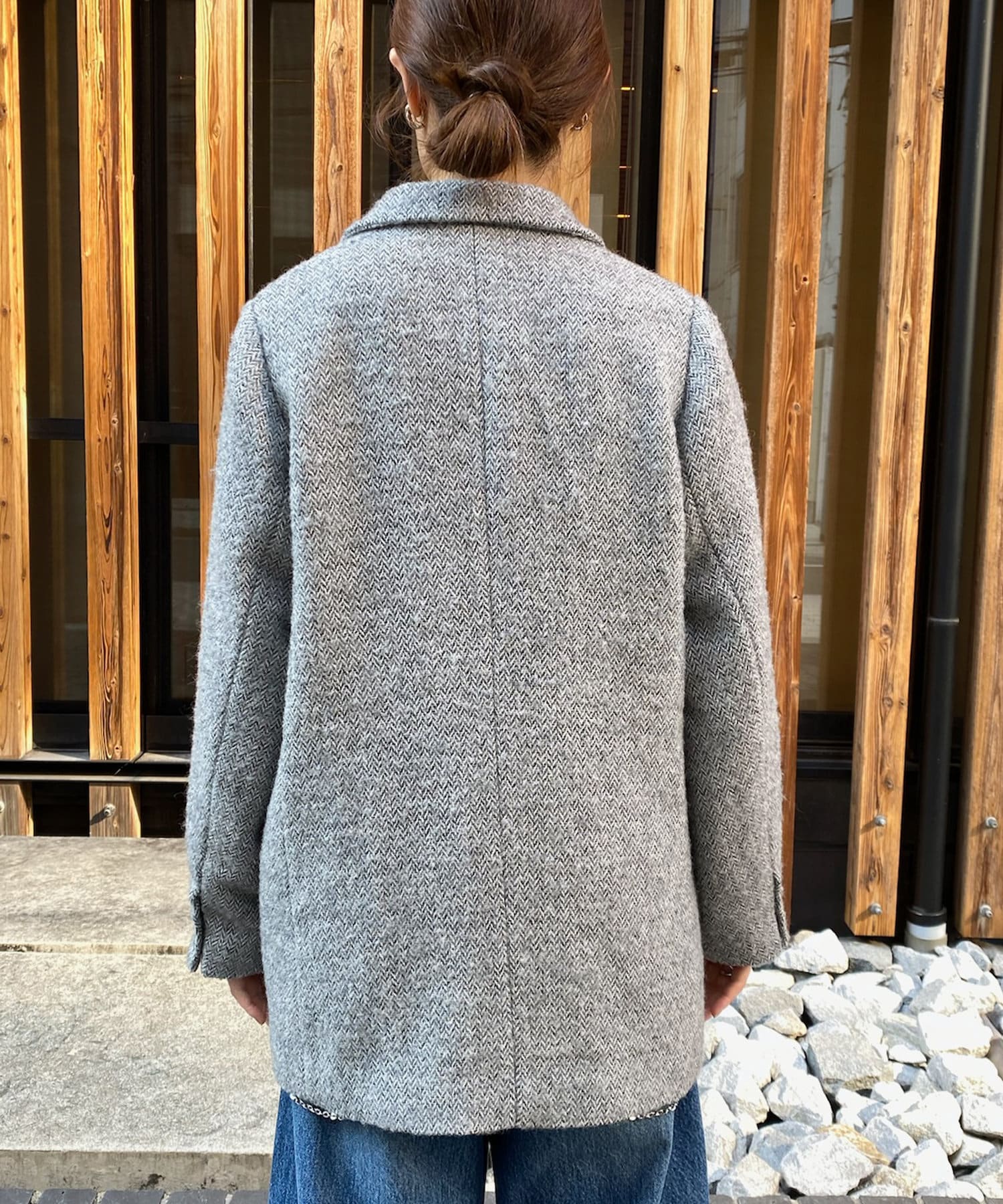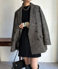 ヘリンボーン柄+ダブルジャケットのディティールが上品な印象に。