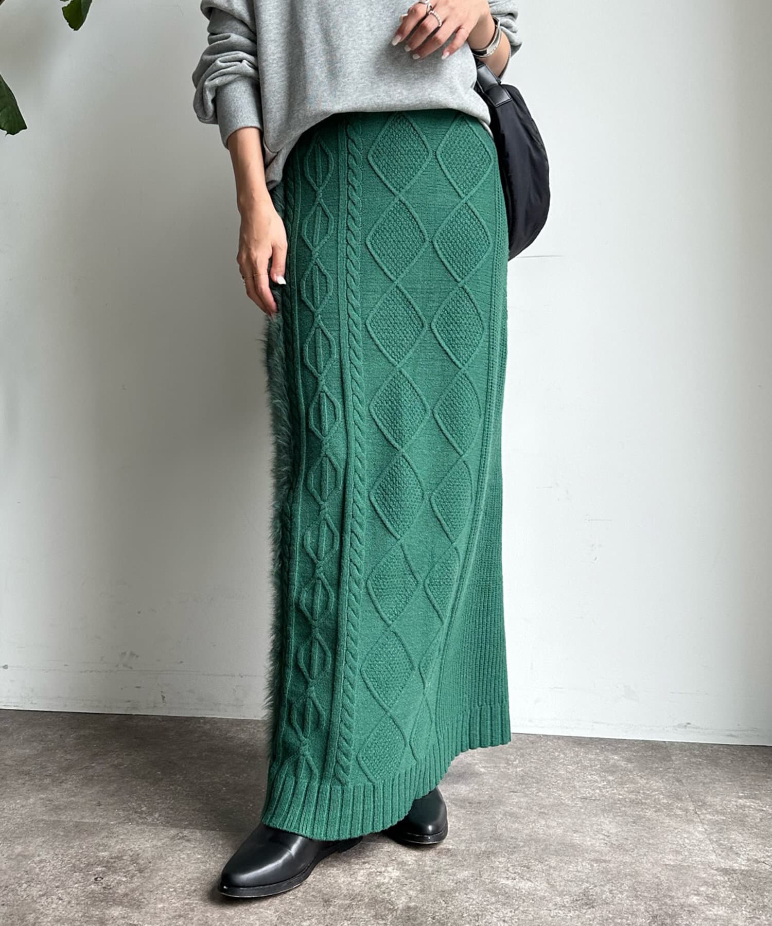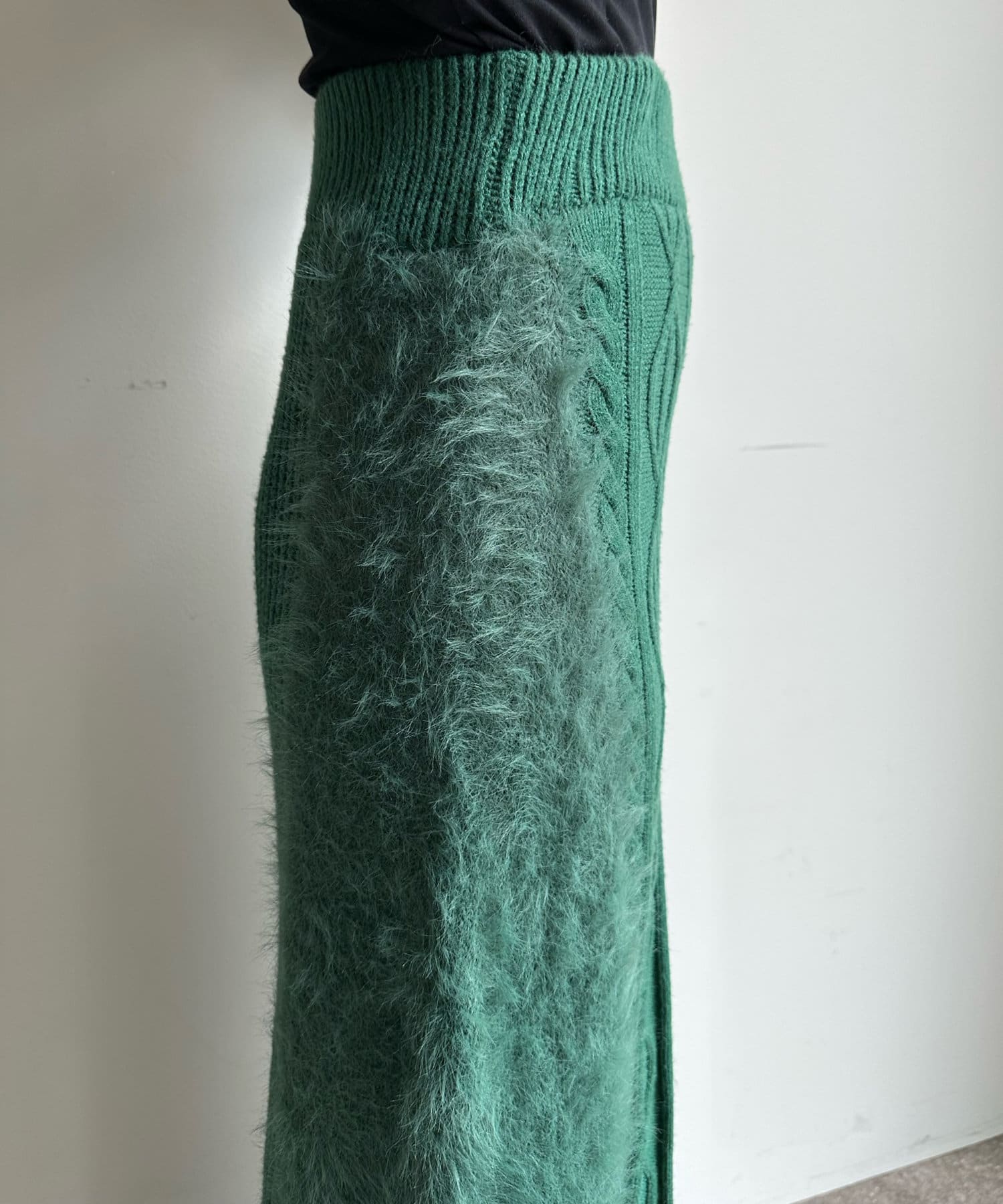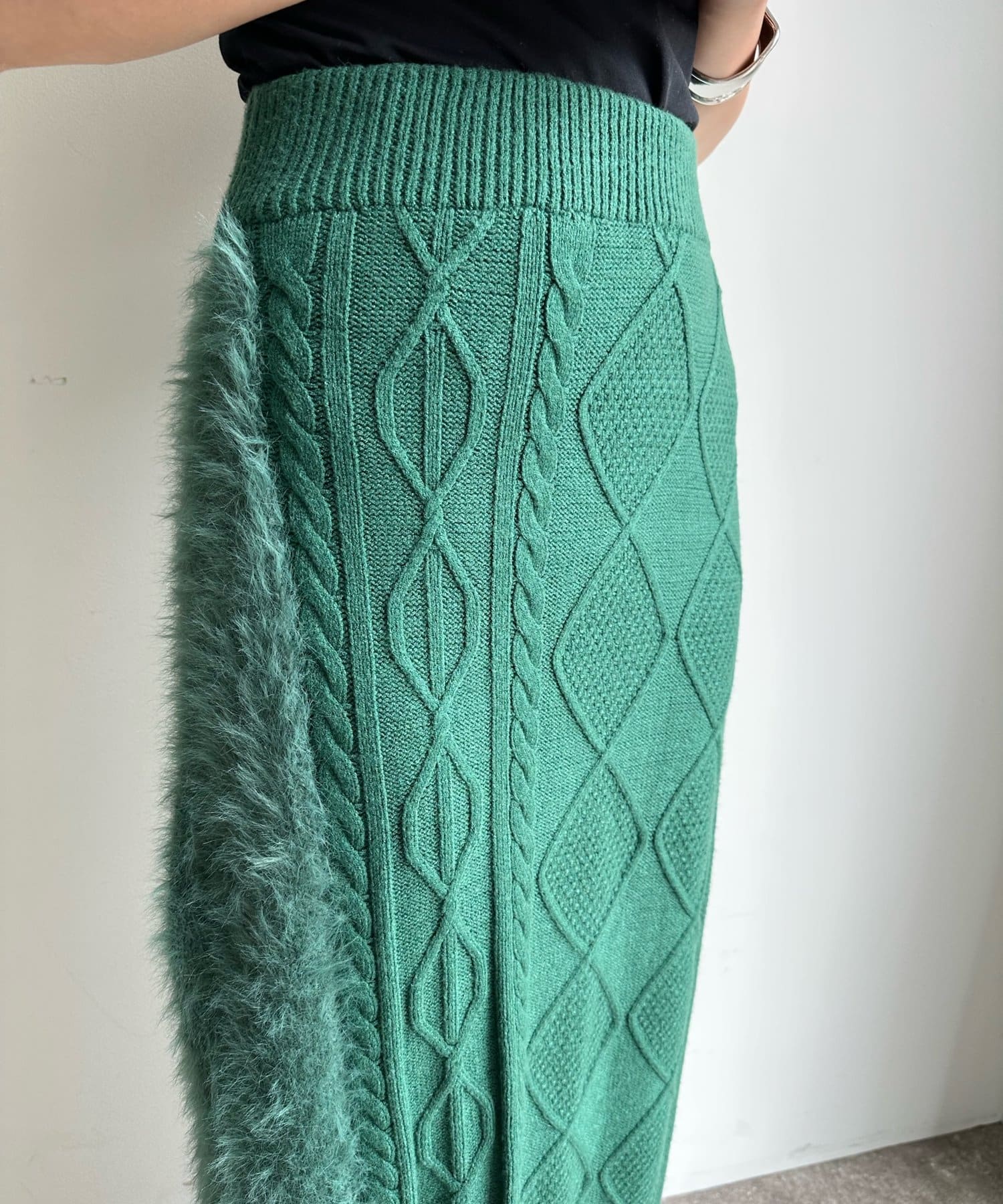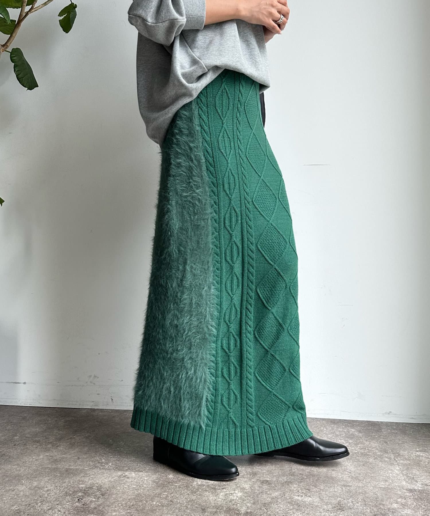 ケーブルのデザインにドッキングされたフェザーが映えるニットスカート!