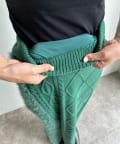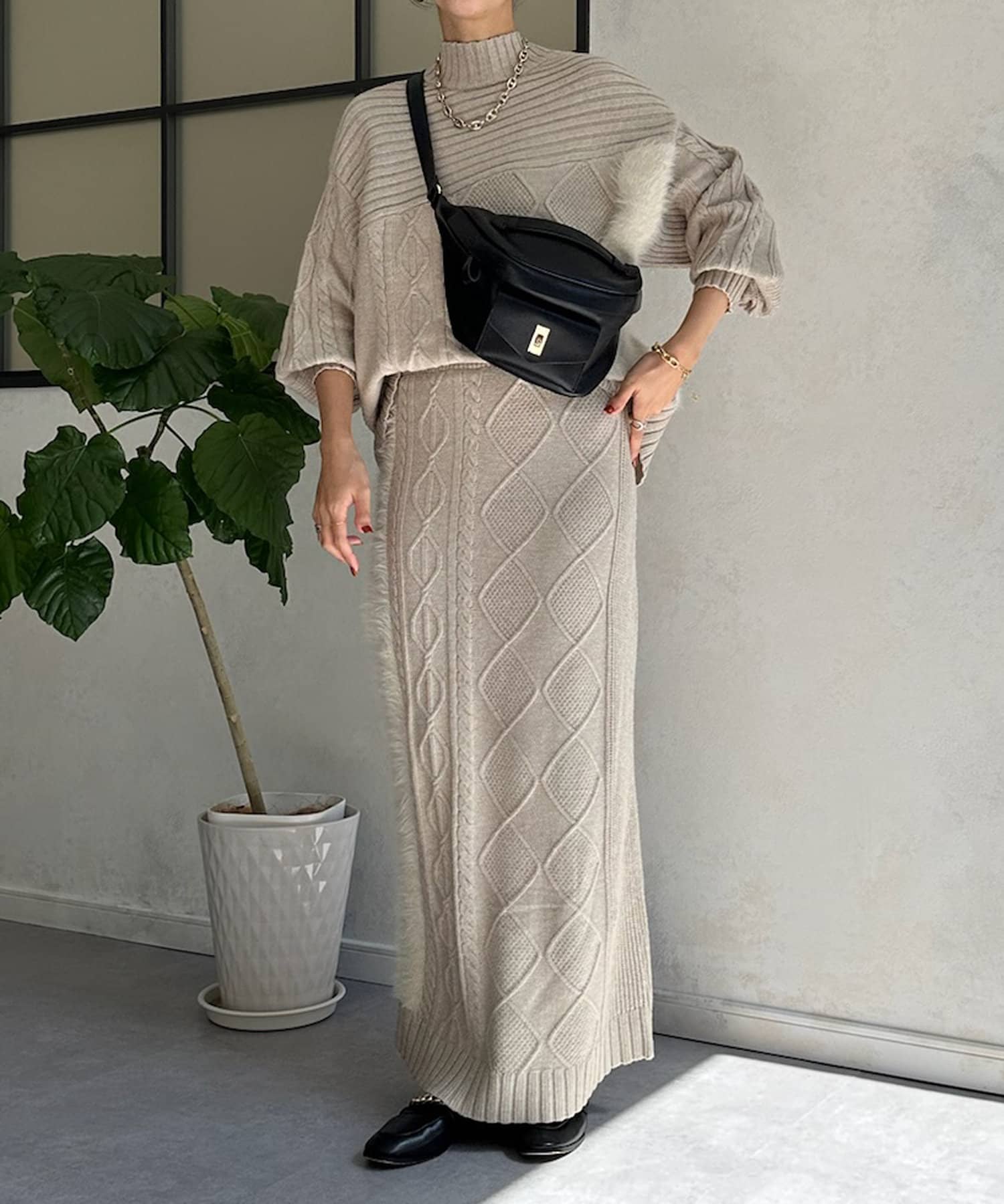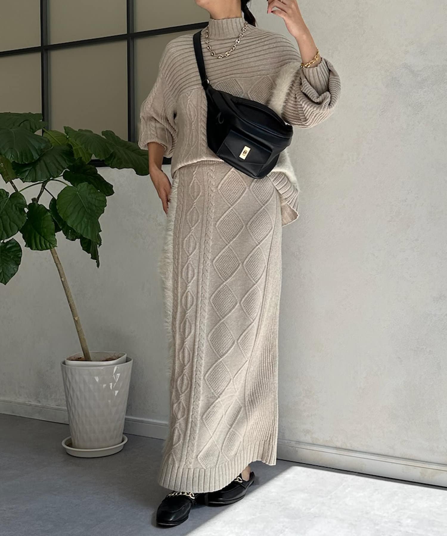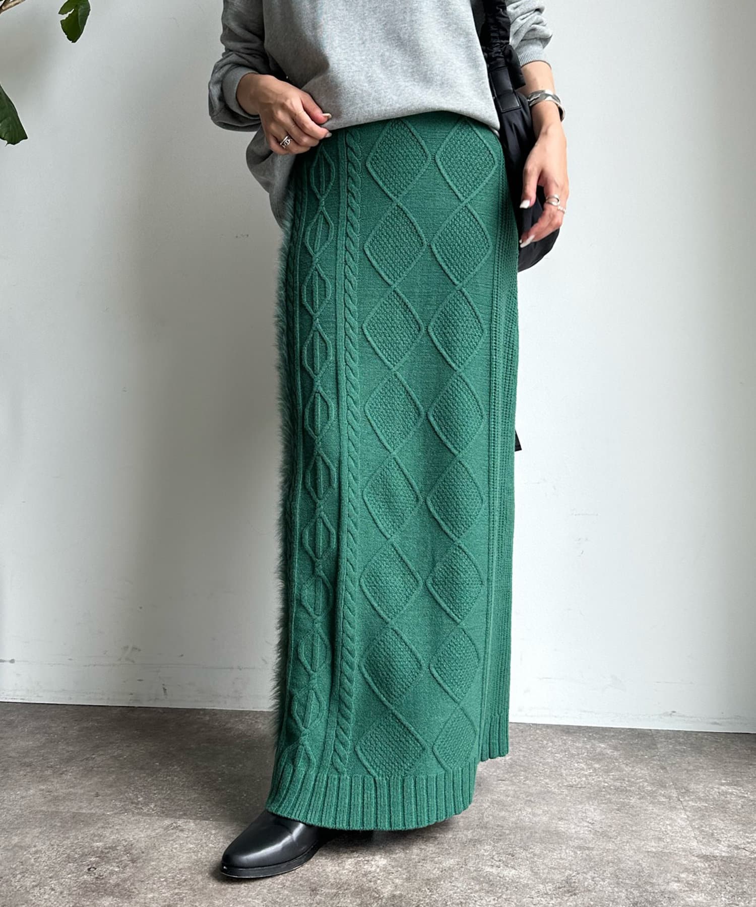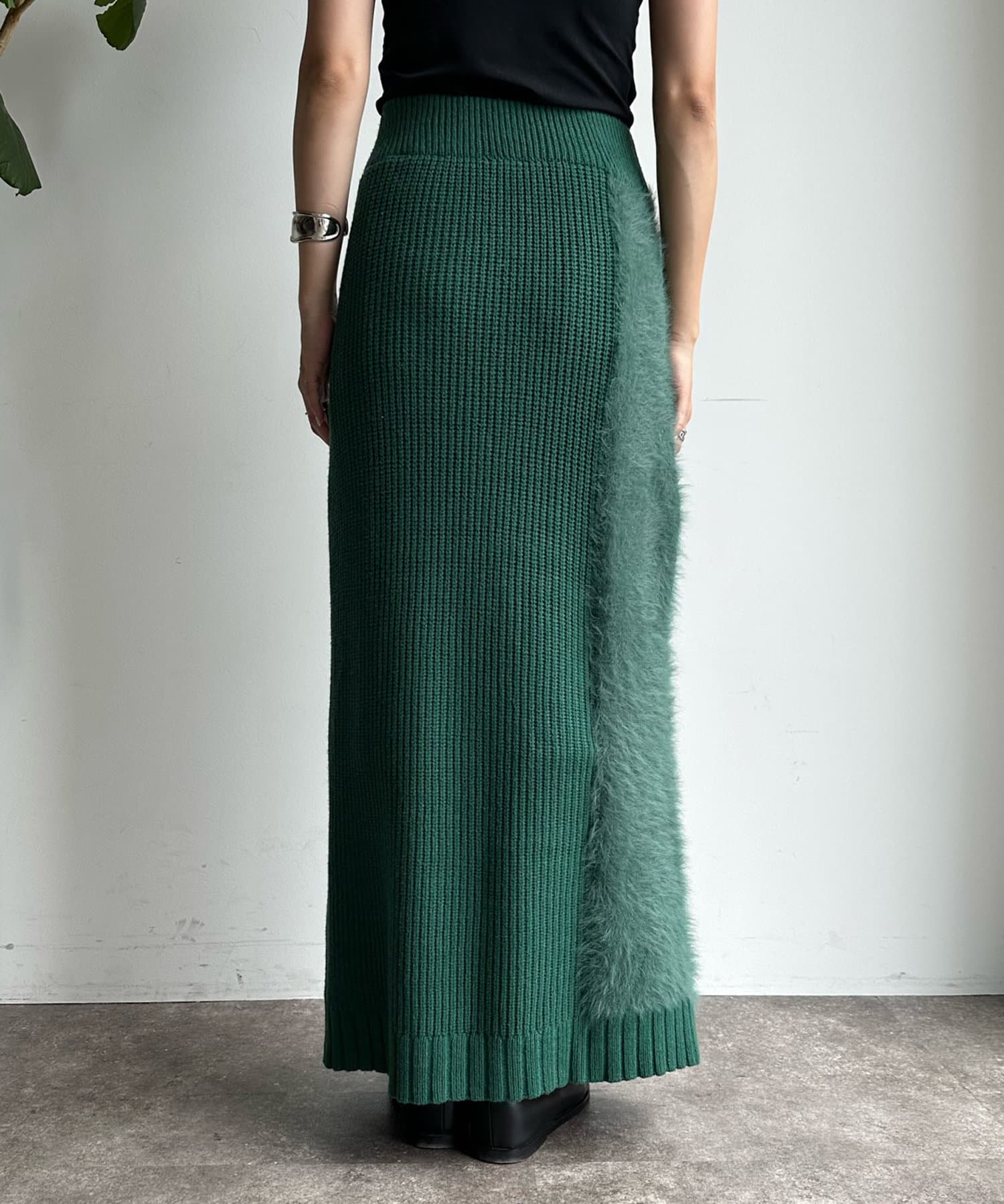 ケーブルのデザインにドッキングされたフェザーが映えるニットスカート!