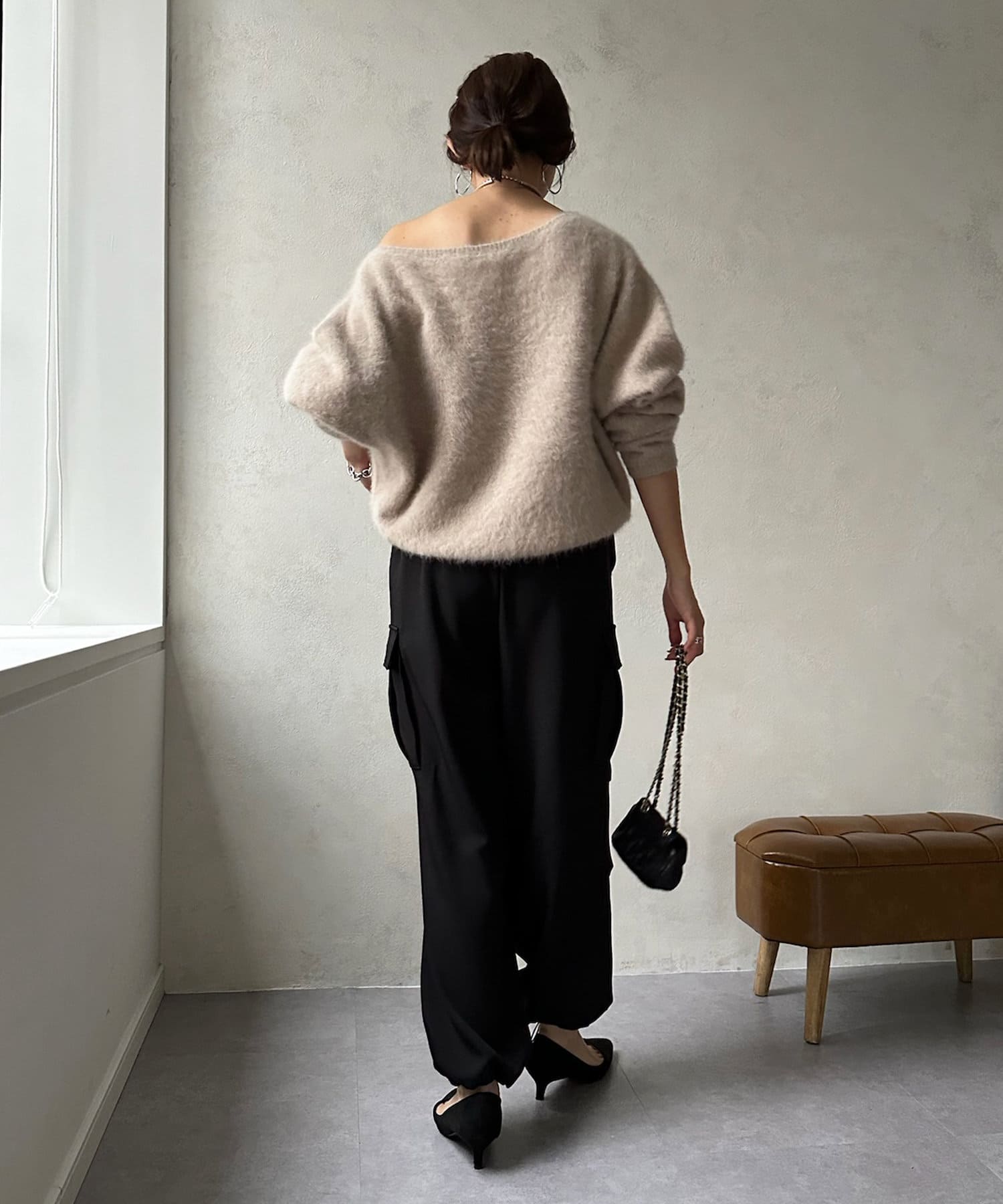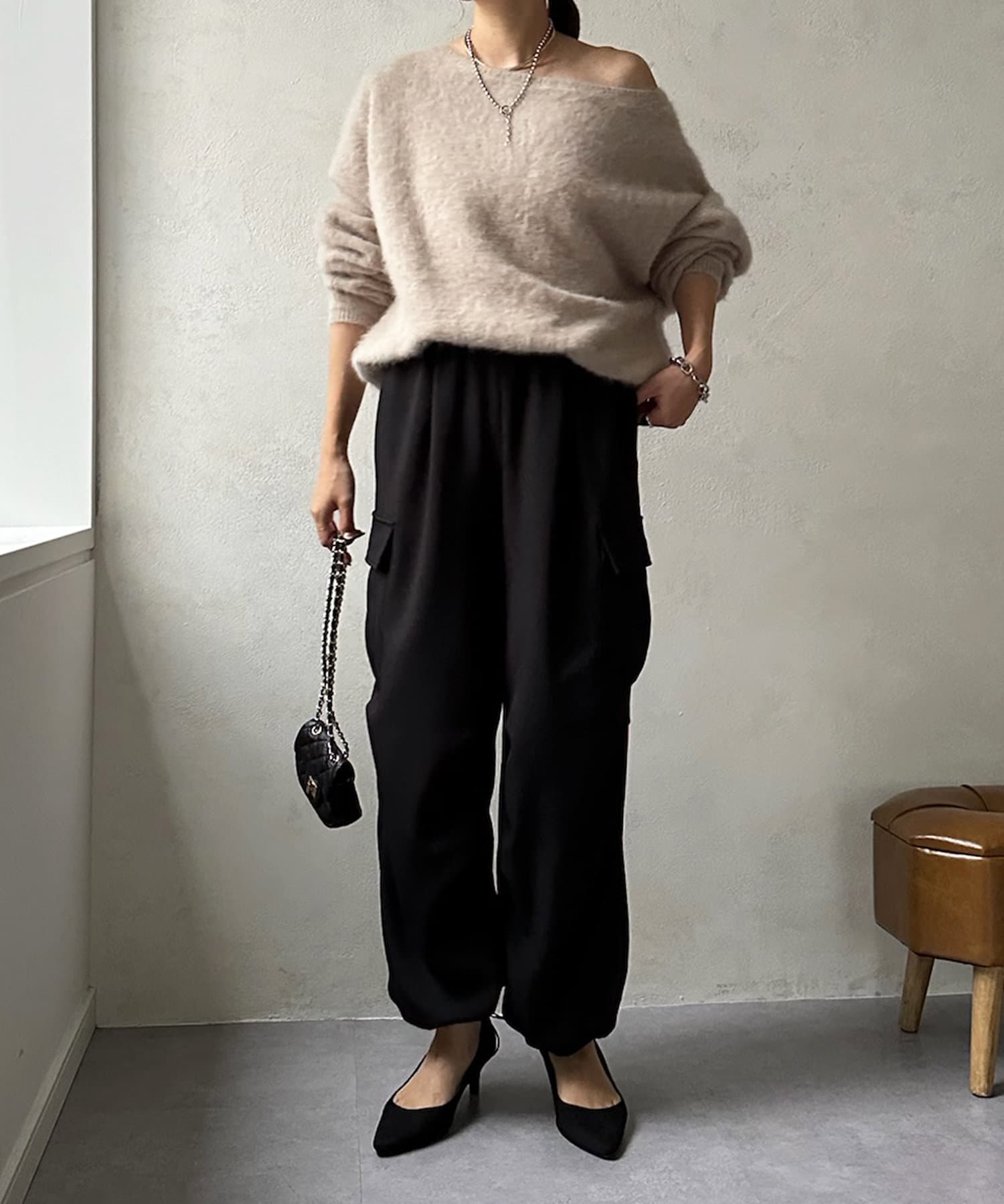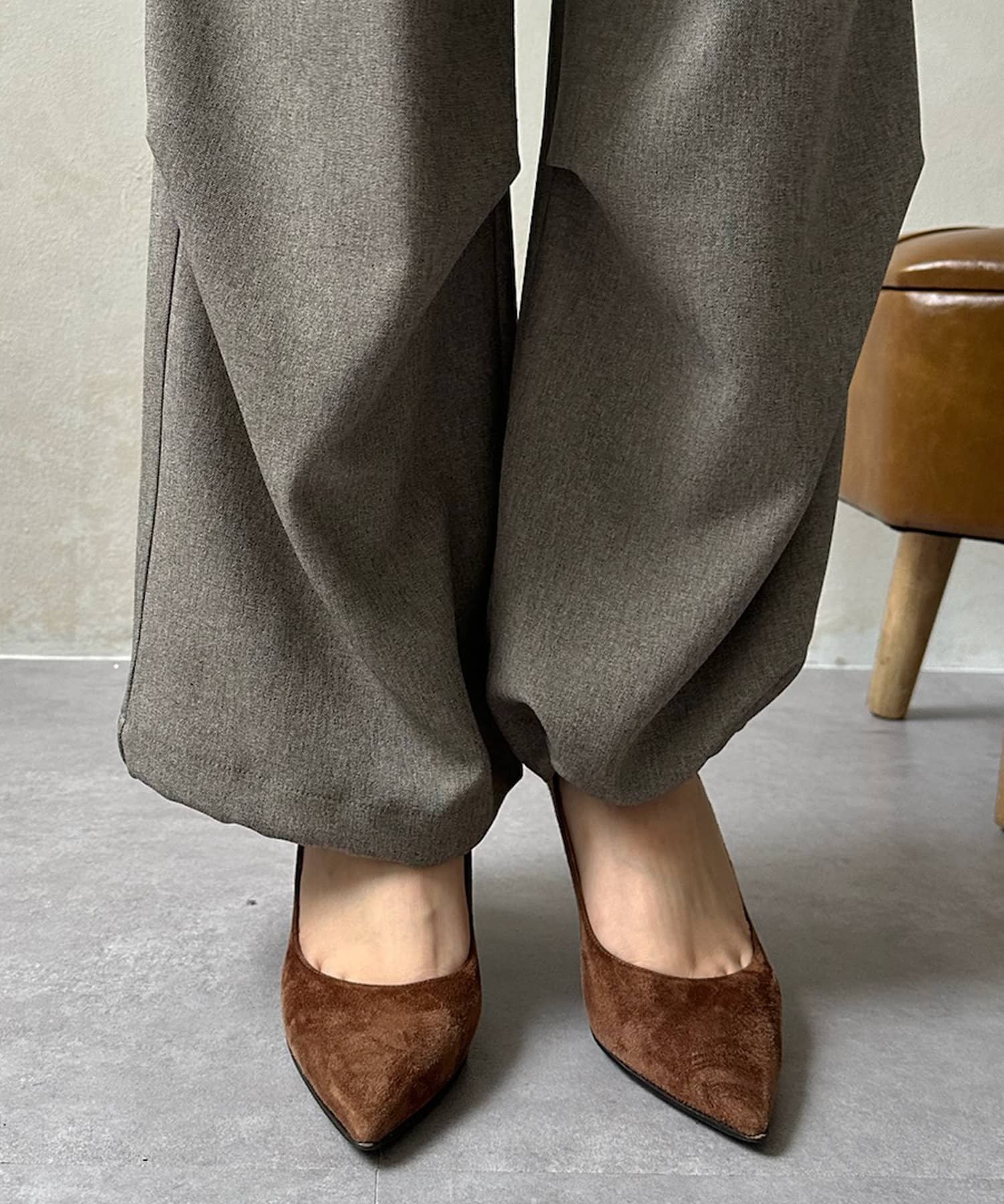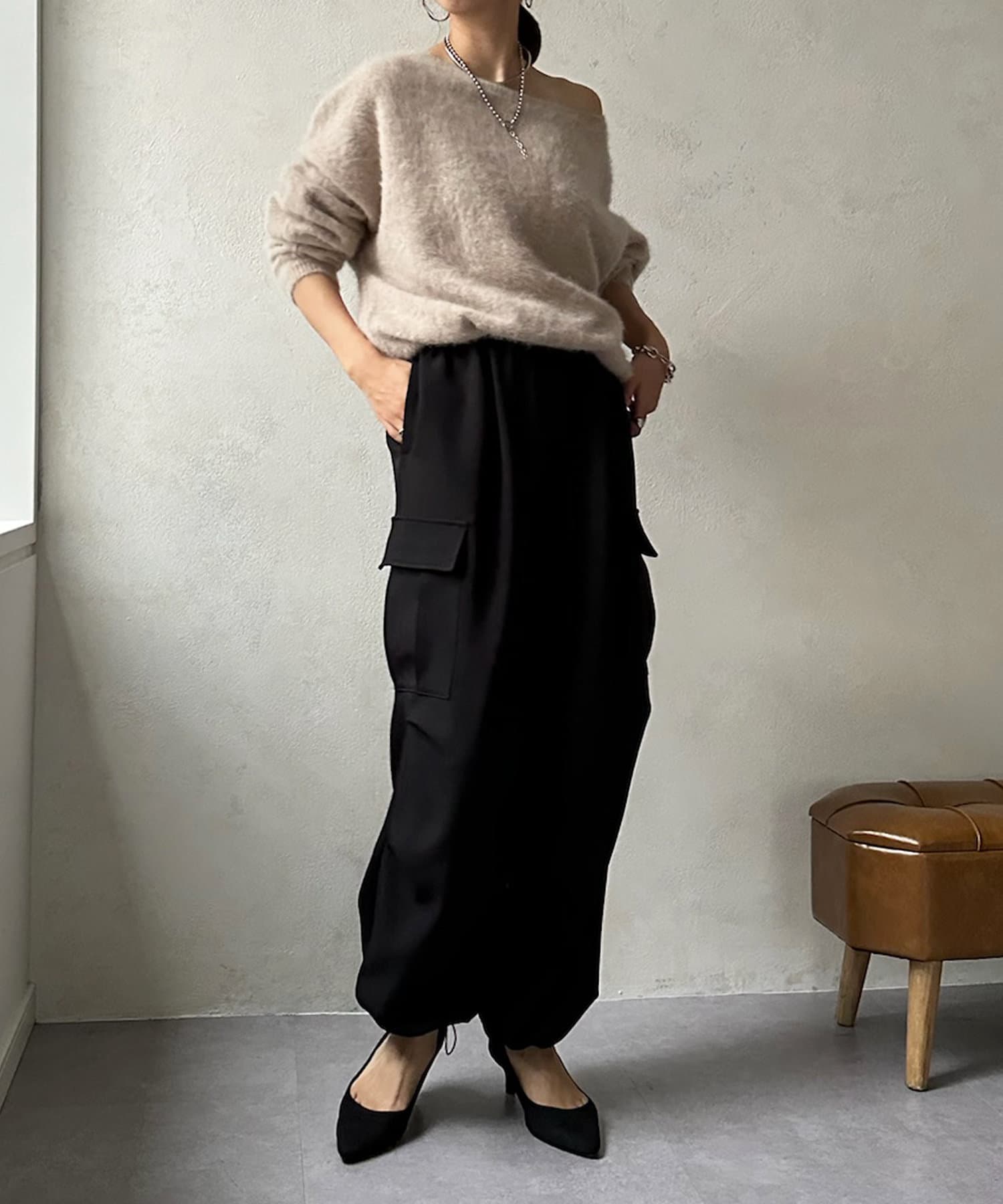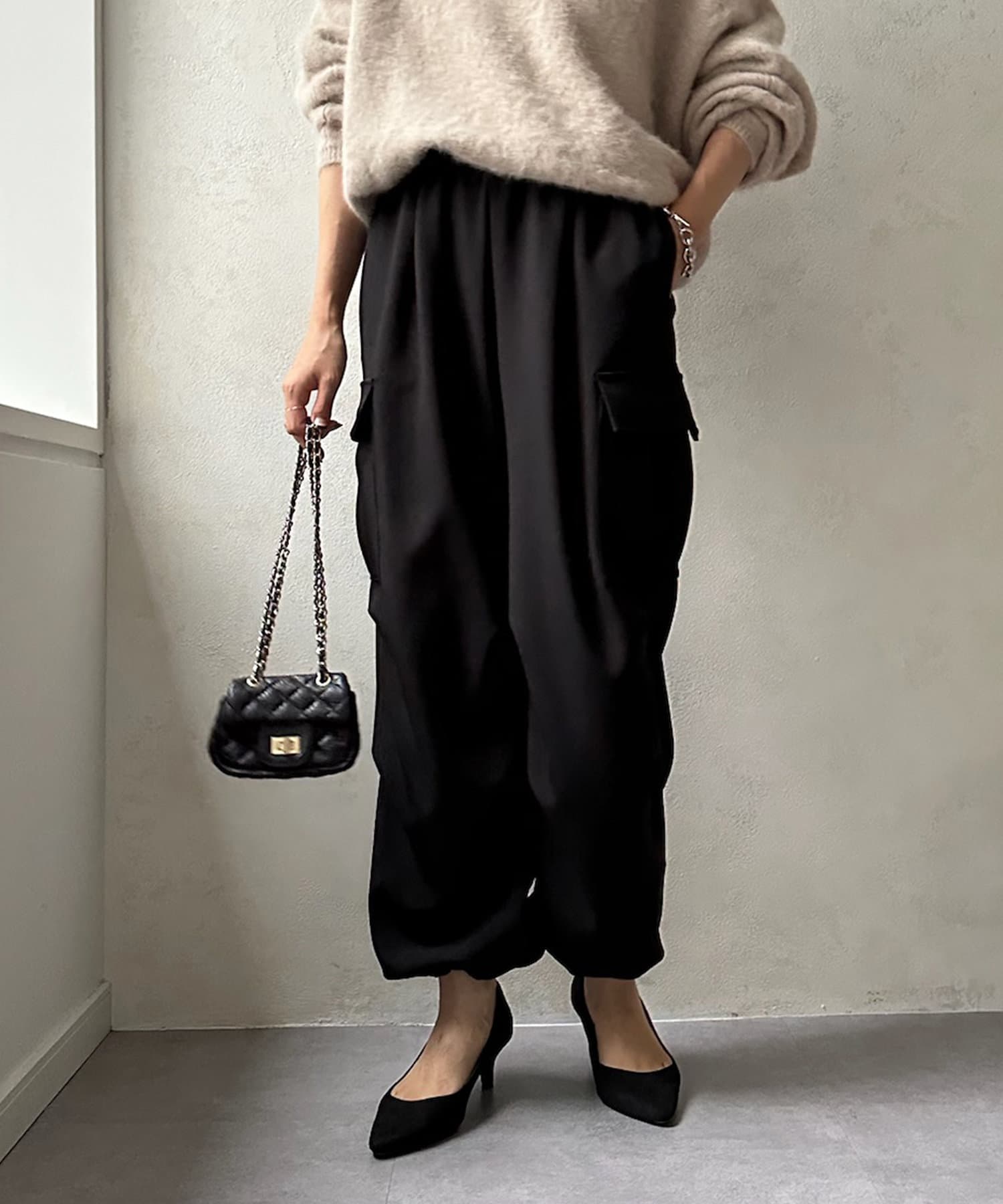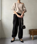 裾はドロストコードをつけているため、お好みの絞り具合で調節していただけます。そして、ウエストはオールゴム仕様のため、とっても楽々!