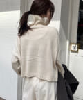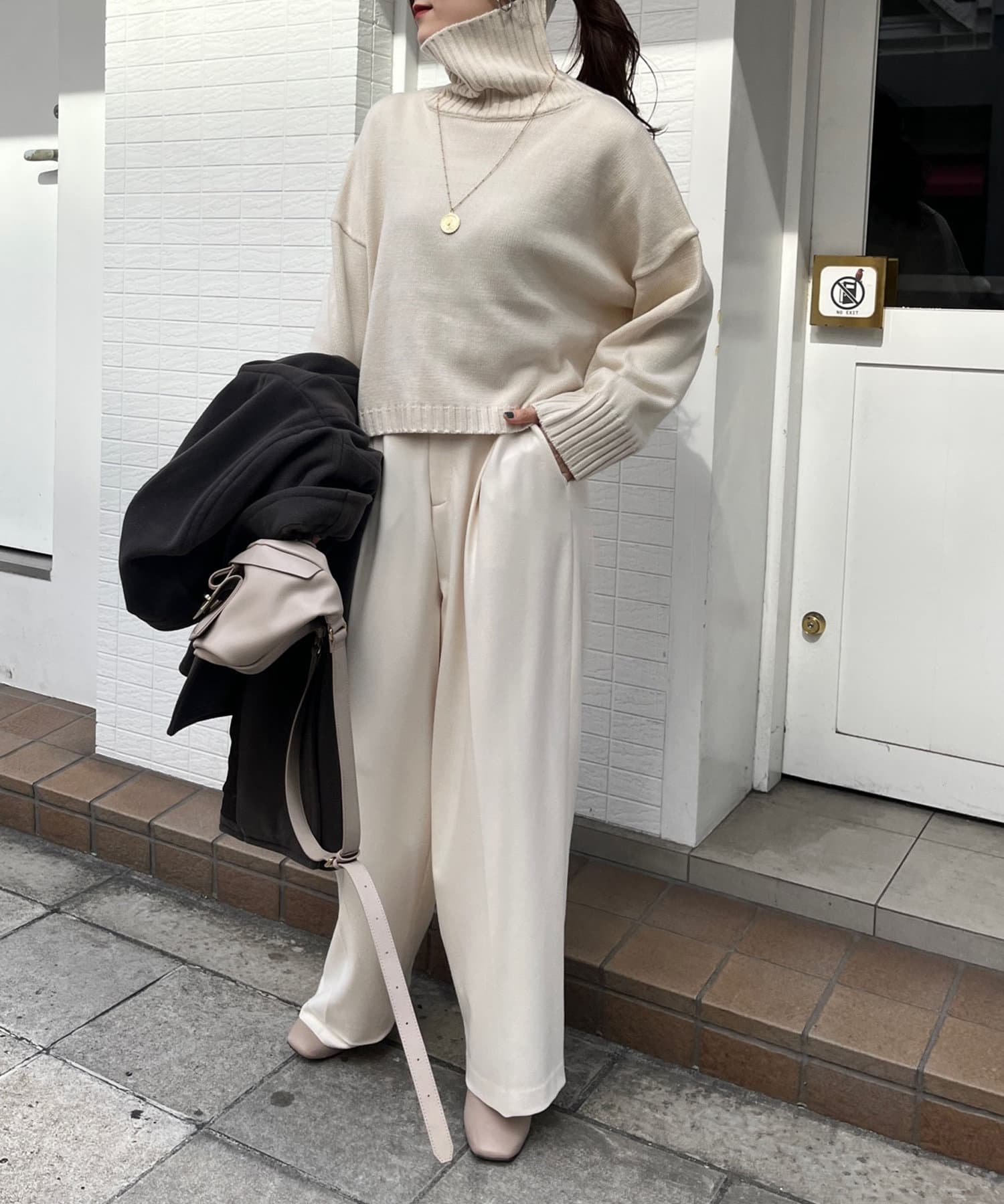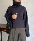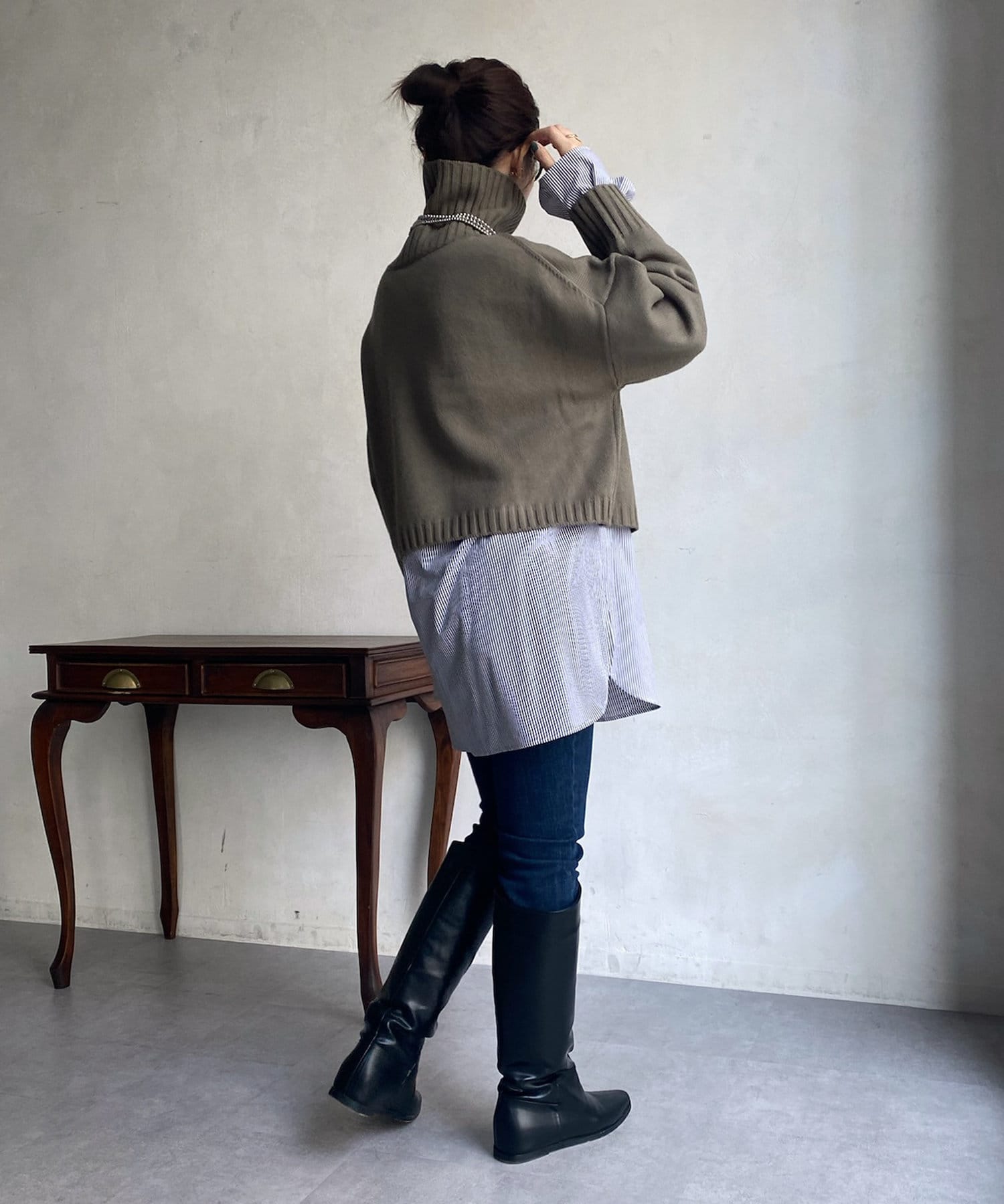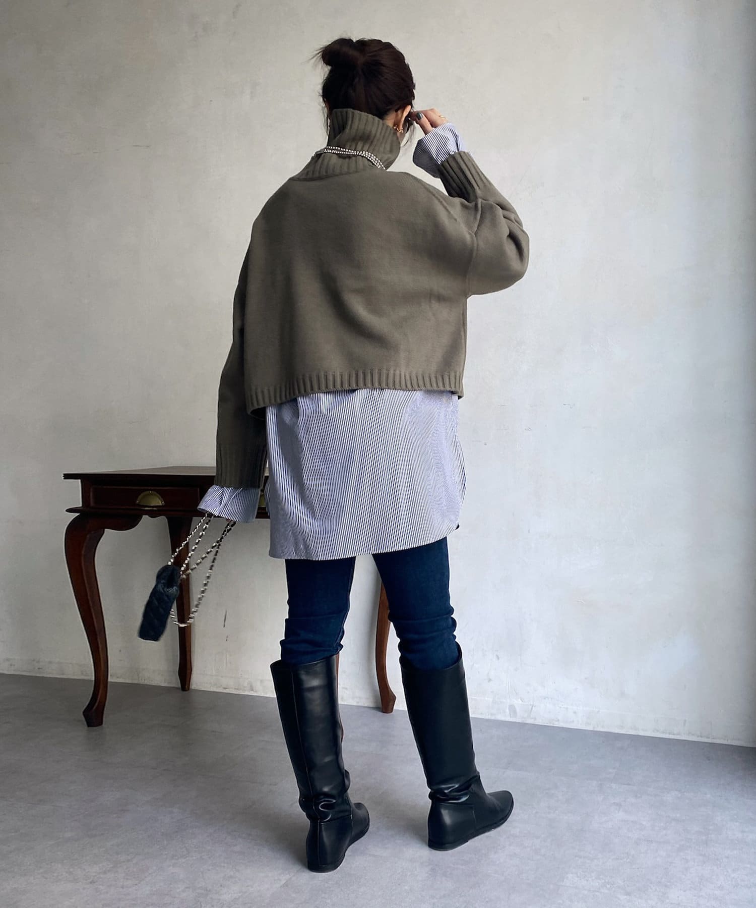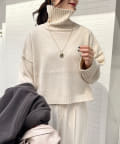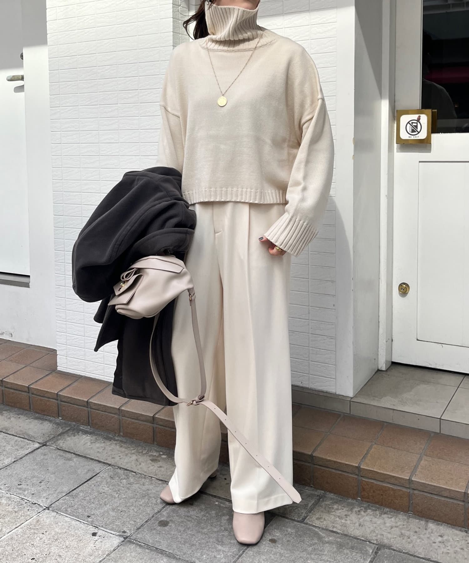 程よく身体から離れる余裕感あるサイジングがこなれ感たっぷりな上、ぴったりとし過ぎないタートルが小顔効果をサポート。