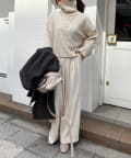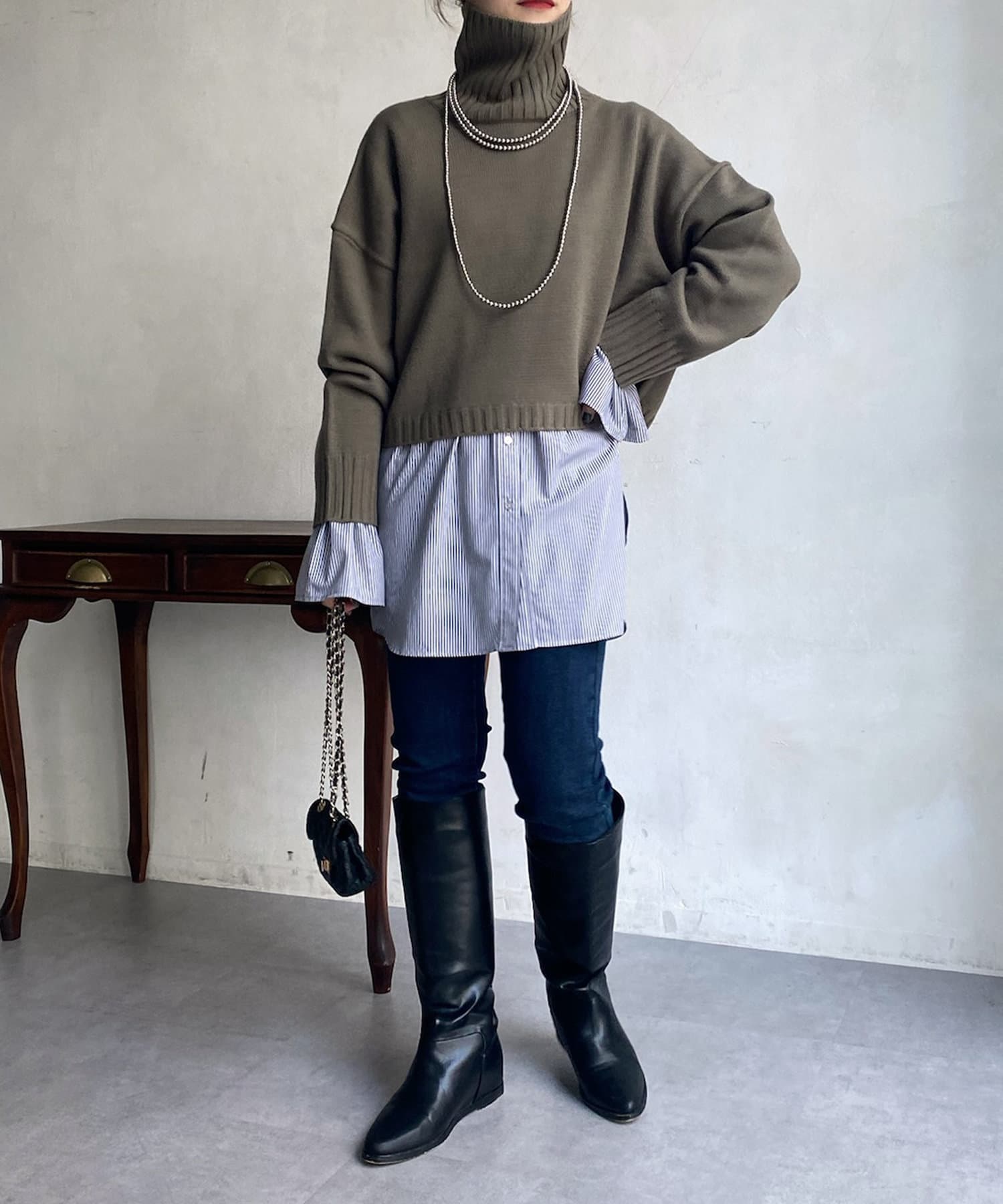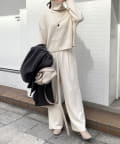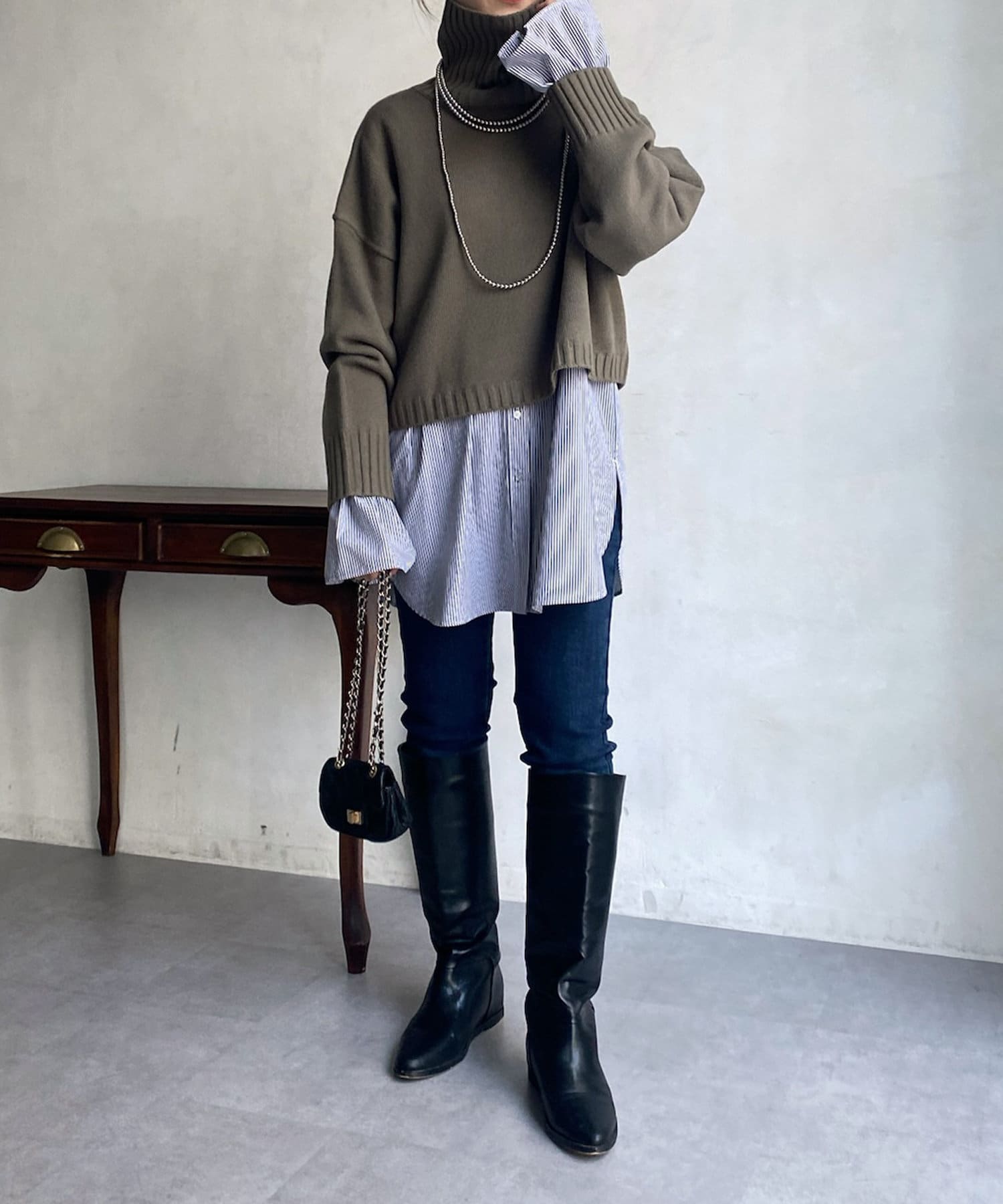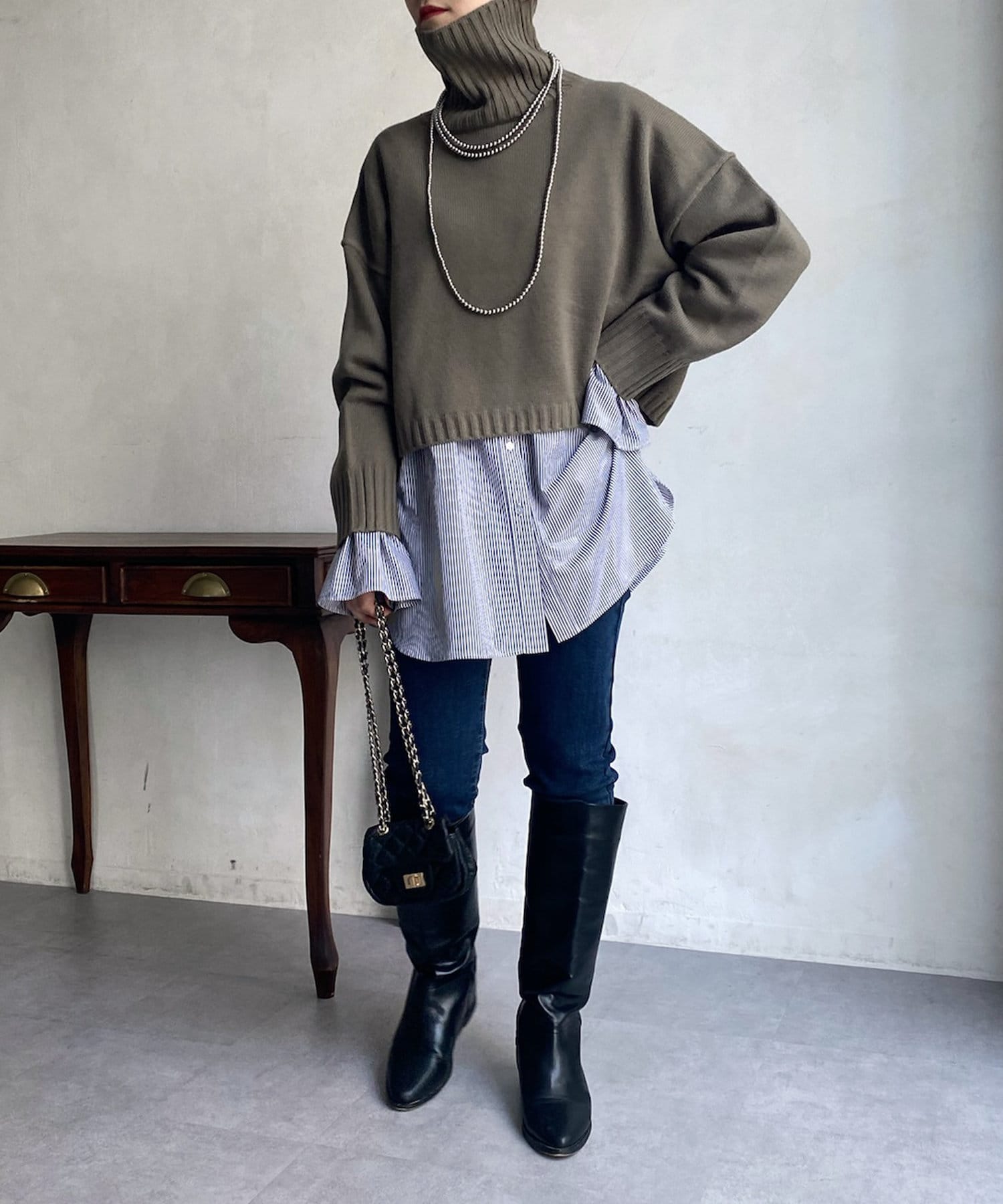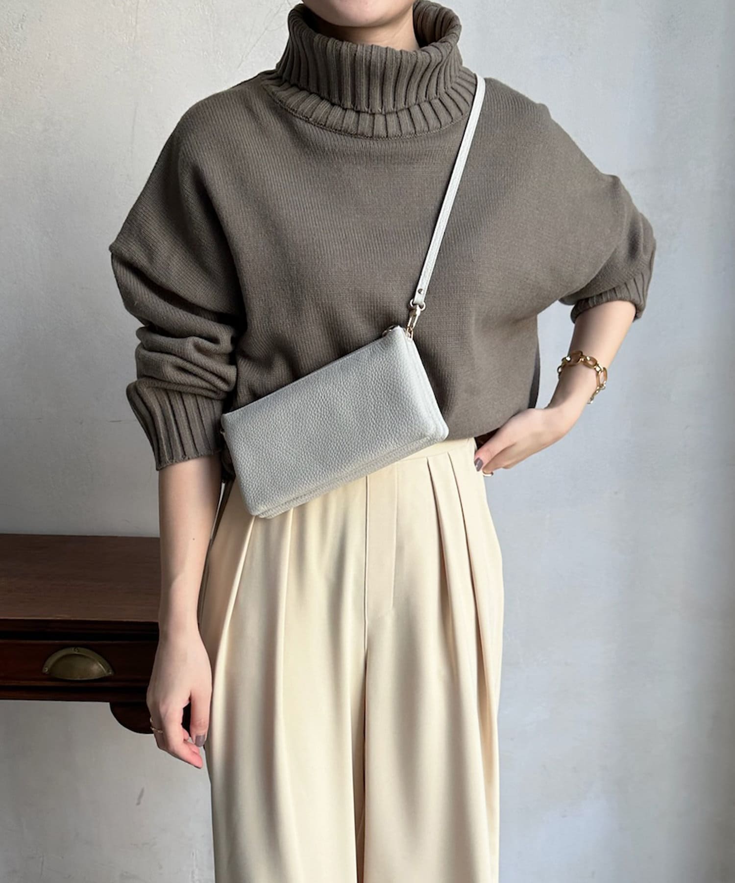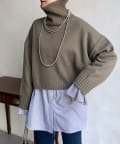 程よく身体から離れる余裕感あるサイジングがこなれ感たっぷりな上、ぴったりとし過ぎないタートルが小顔効果をサポート。