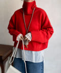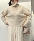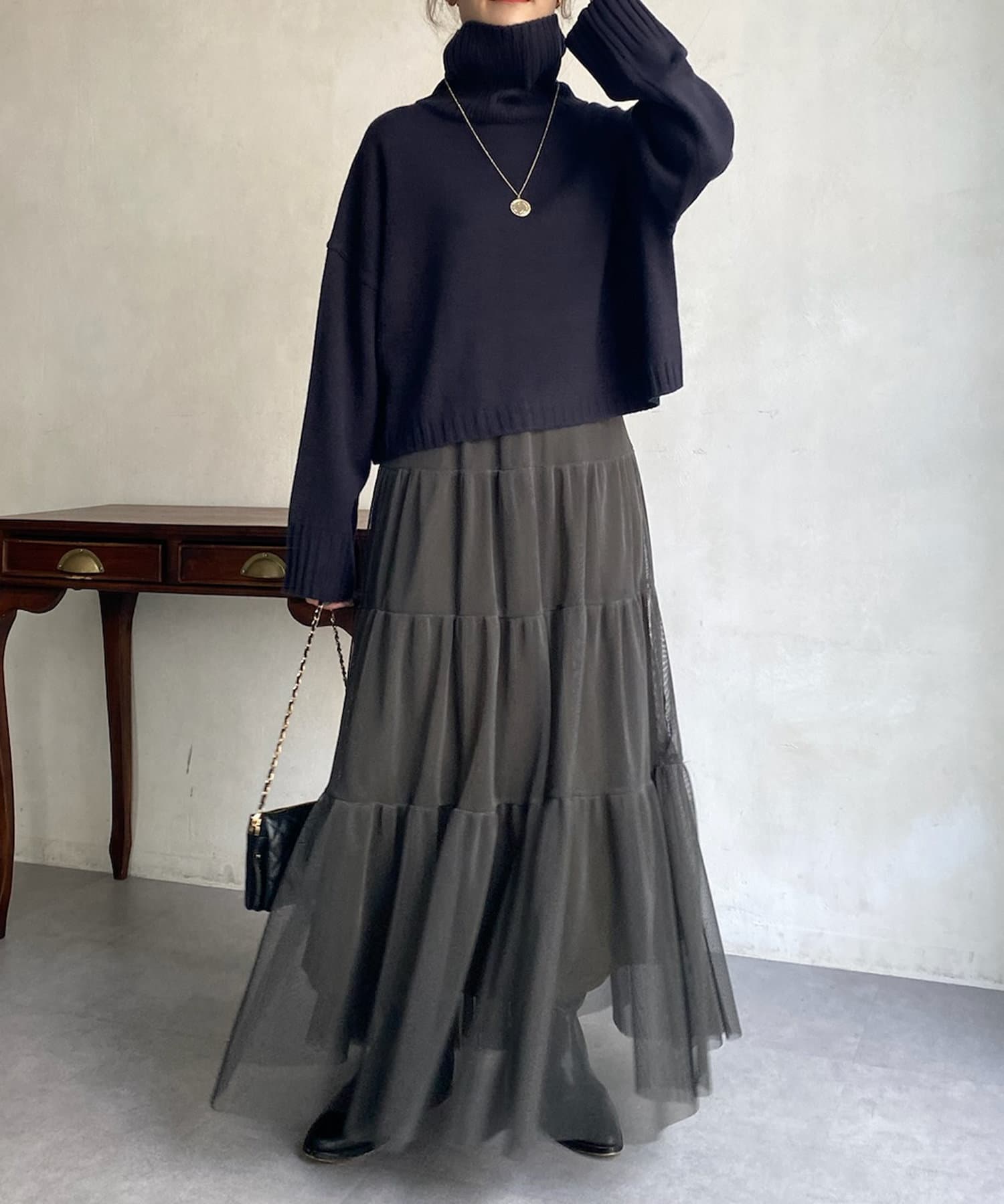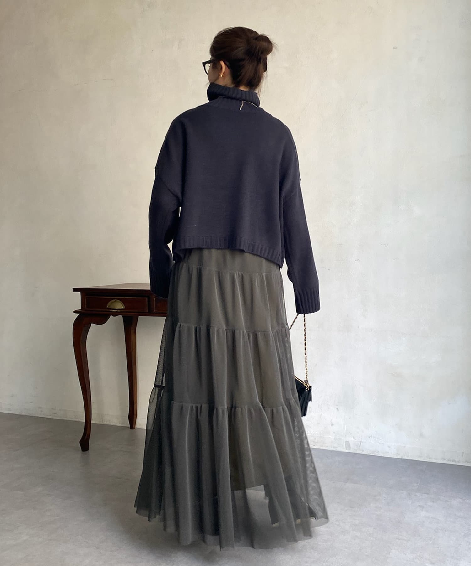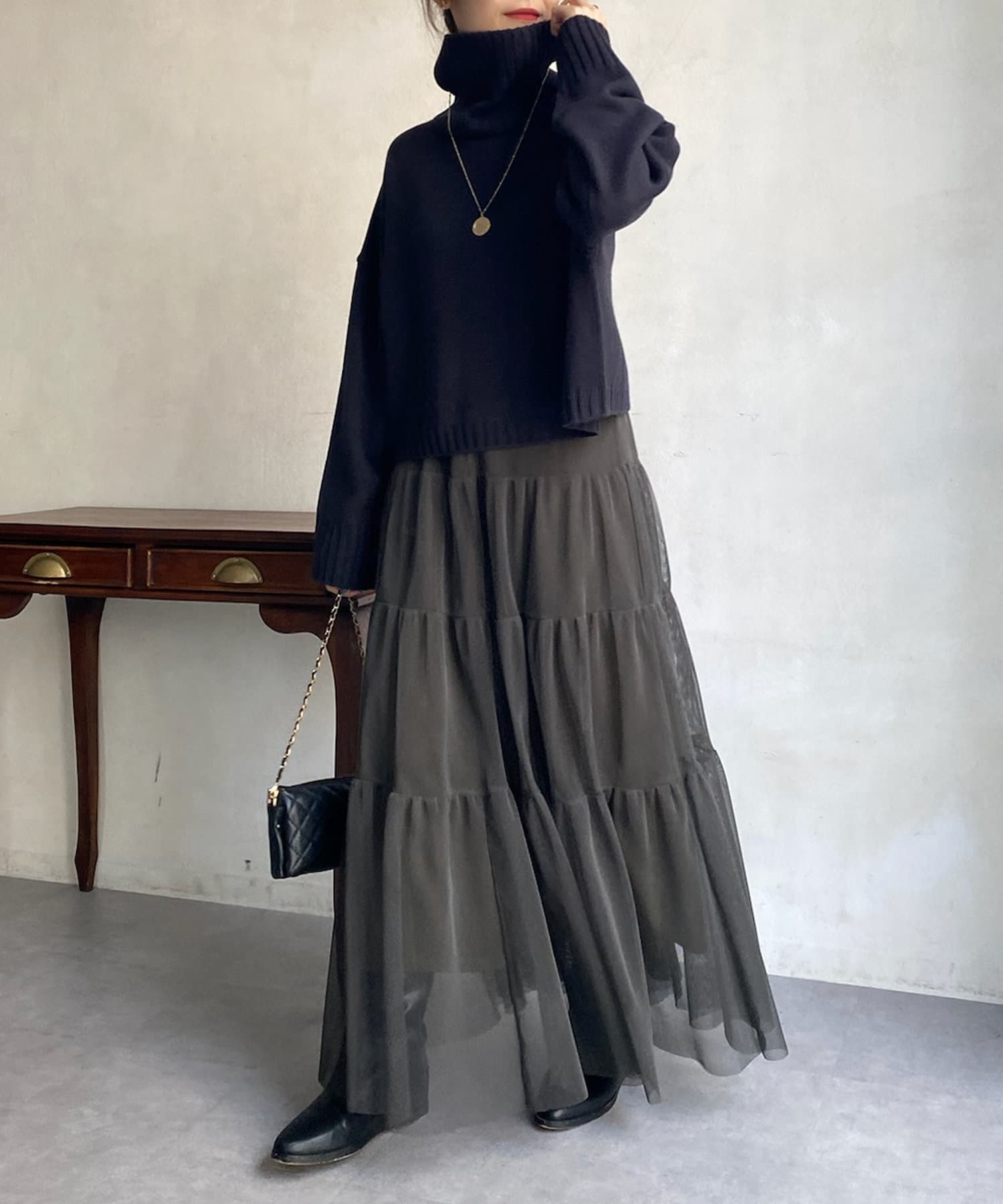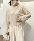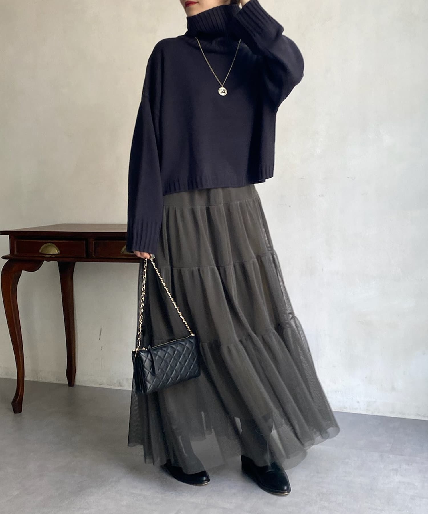 程よく身体から離れる余裕感あるサイジングがこなれ感たっぷりな上、ぴったりとし過ぎないタートルが小顔効果をサポート。