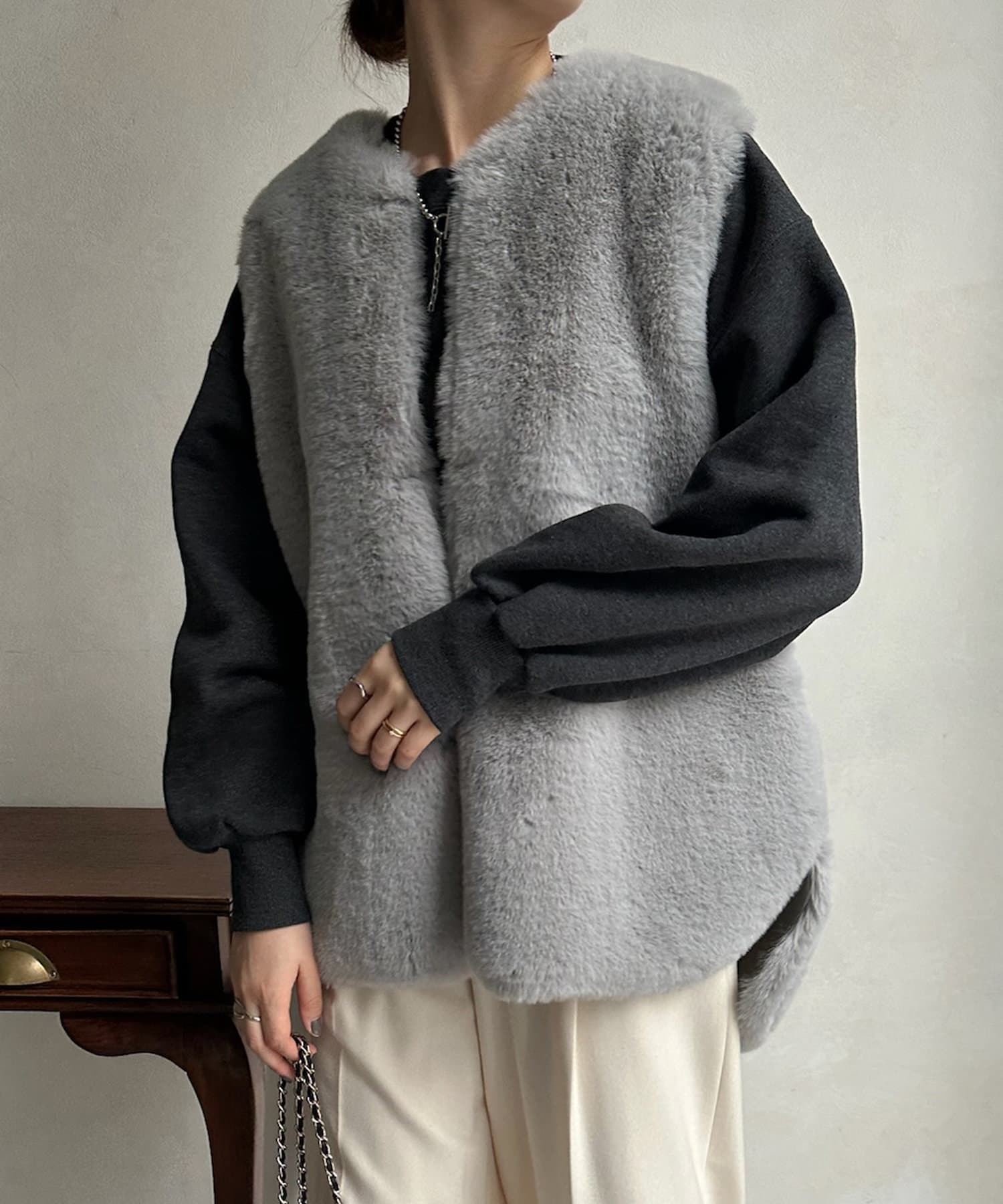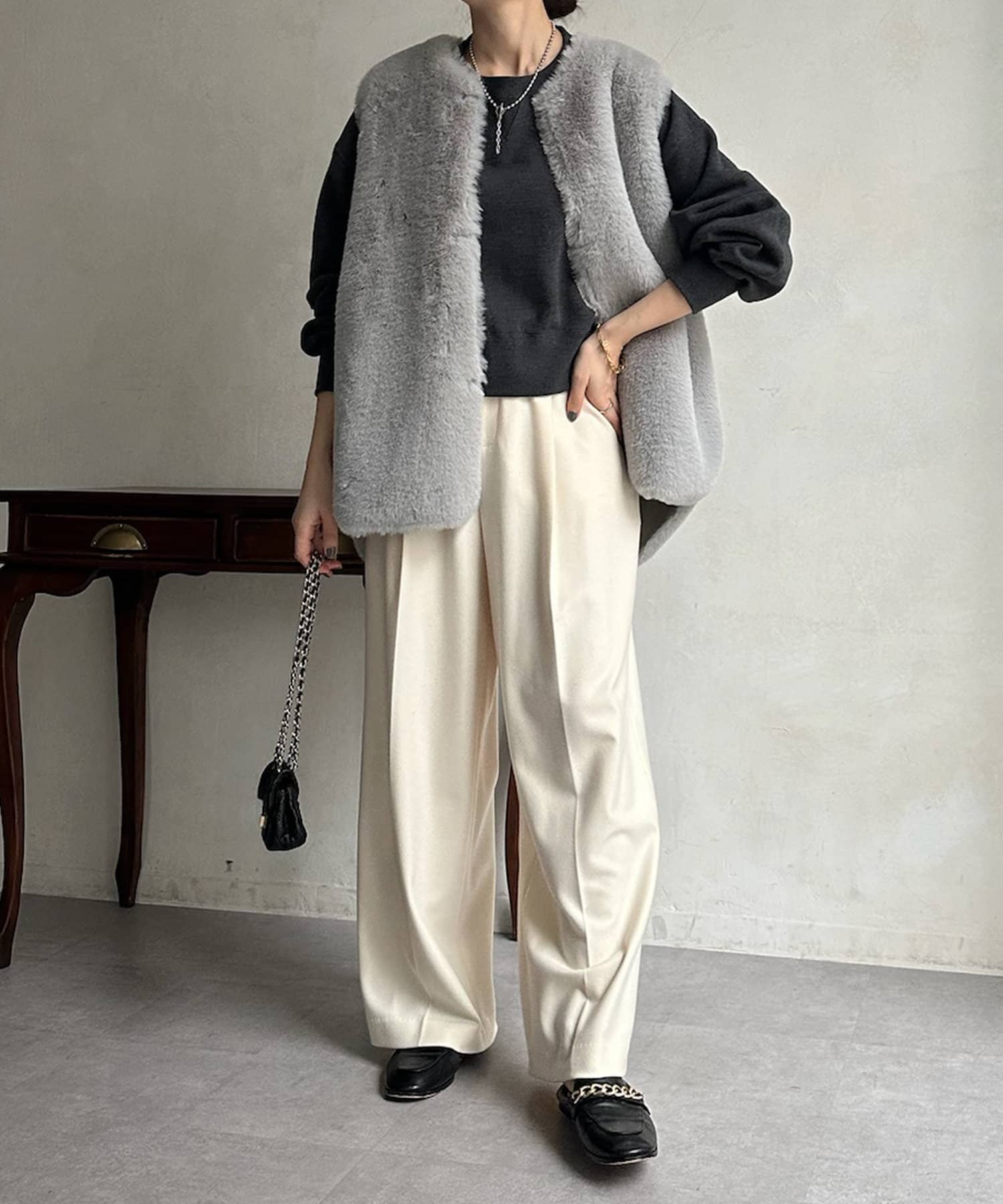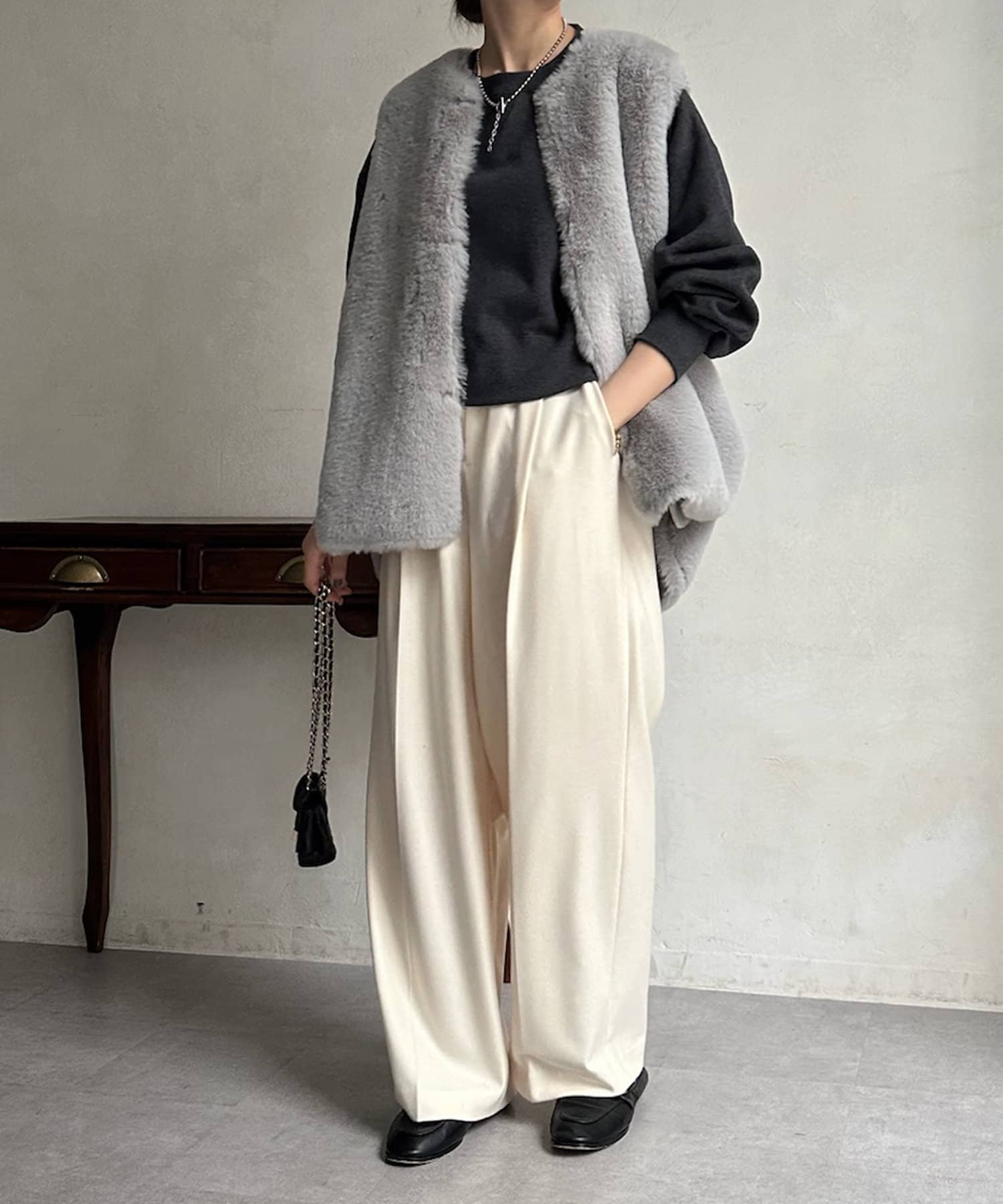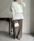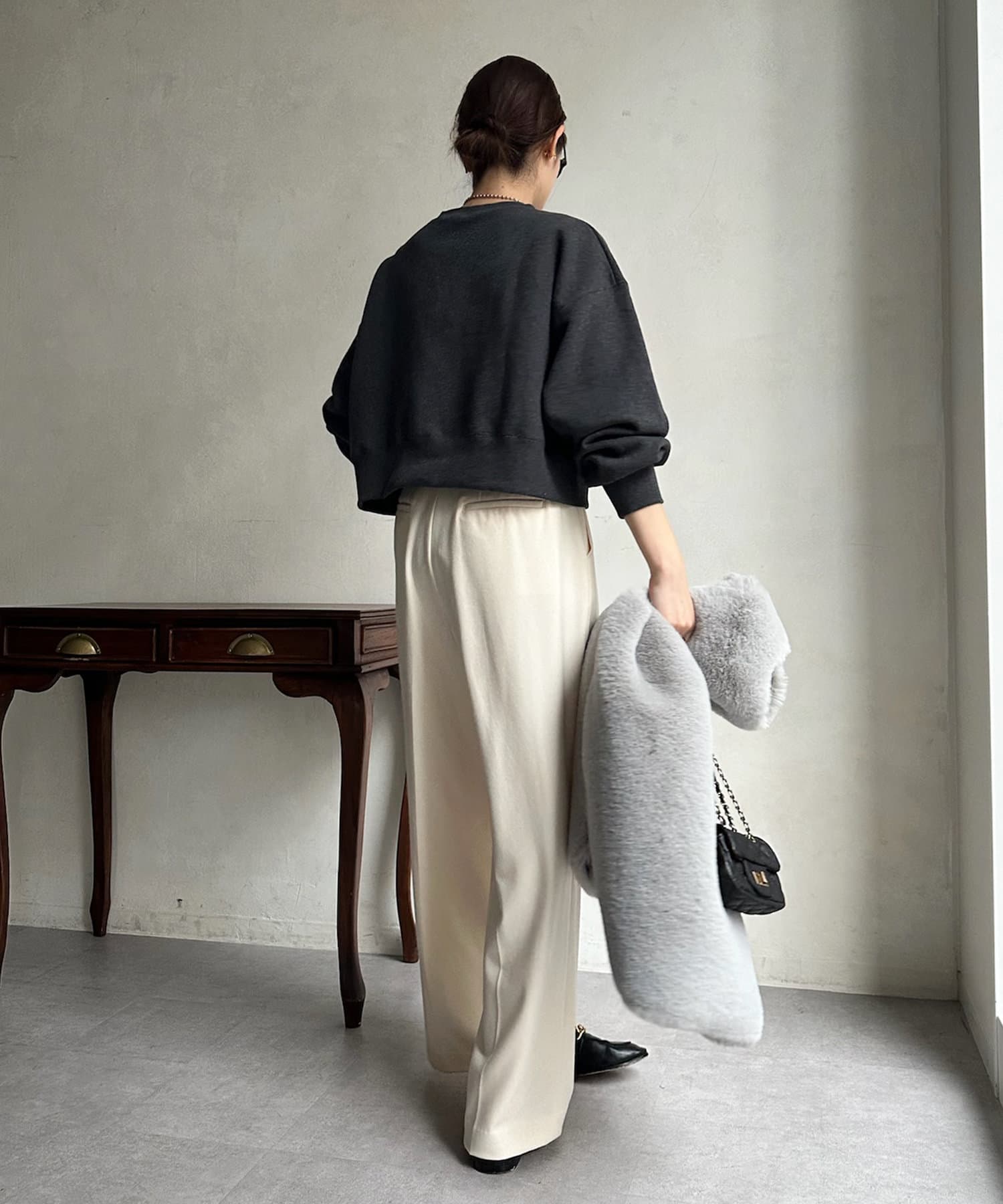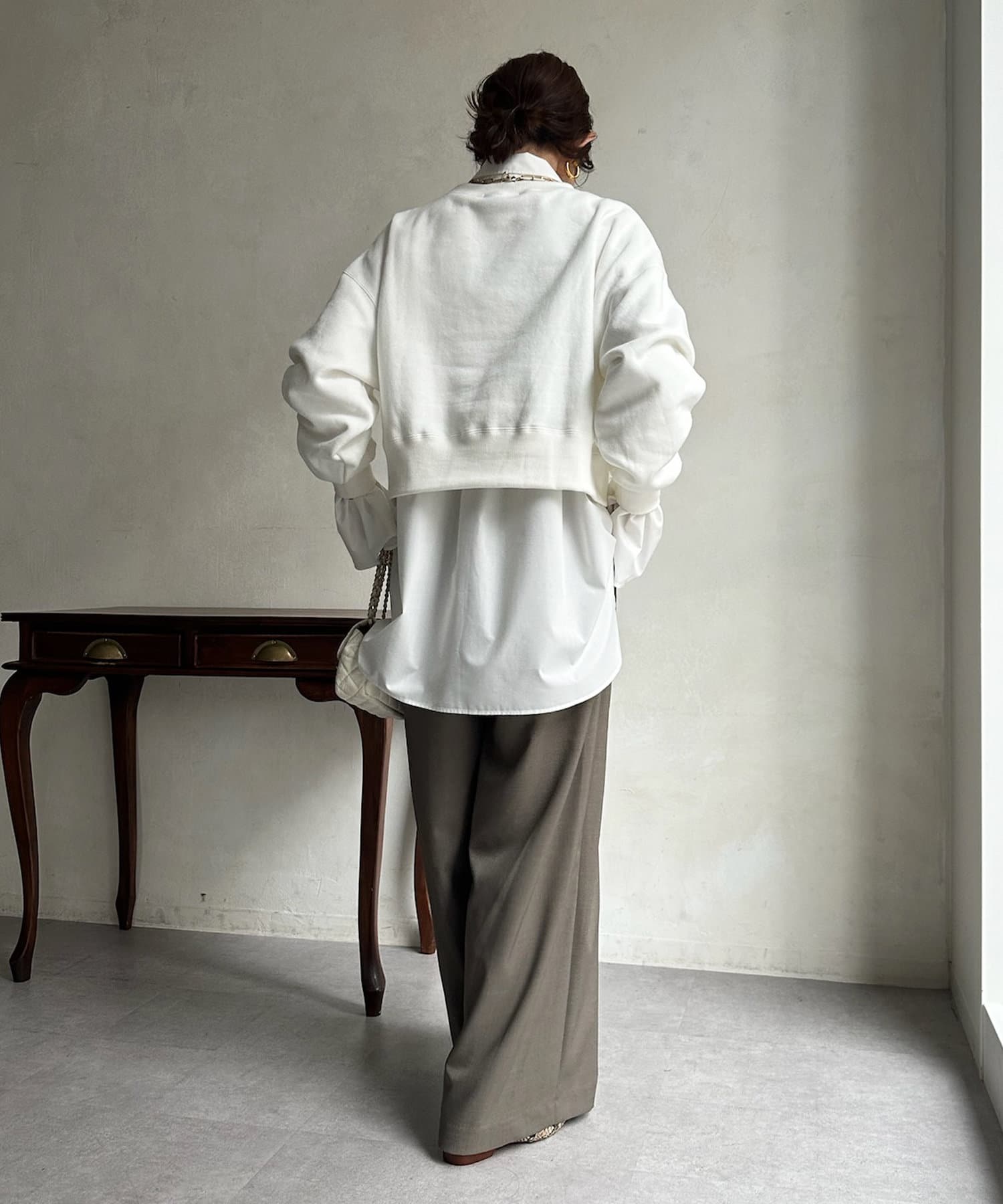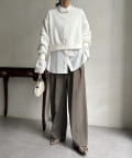 ワイドな身幅と短めの着丈のバランスがこなれ感を演出。