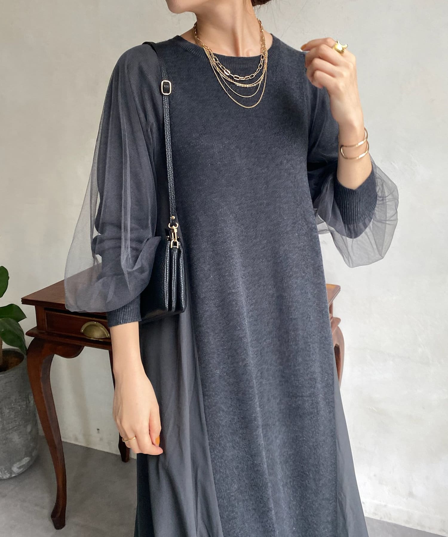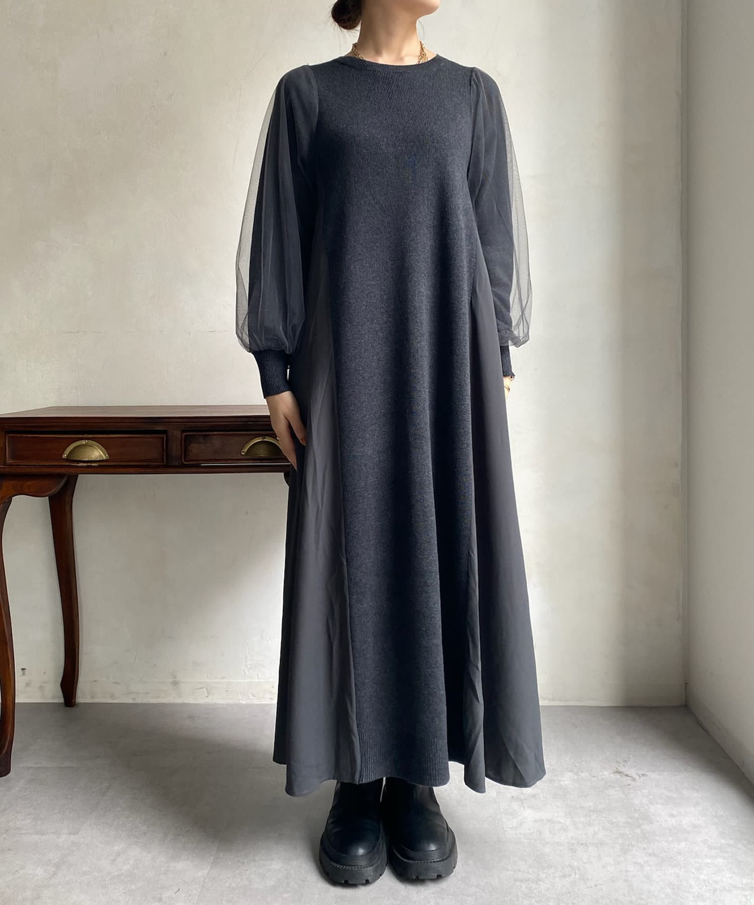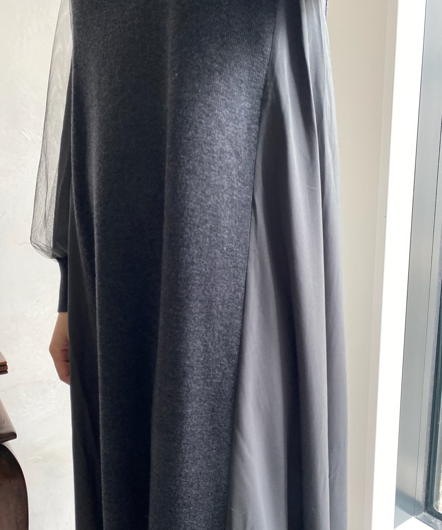 【WEB限定】袖チュール切替ニットワンピース