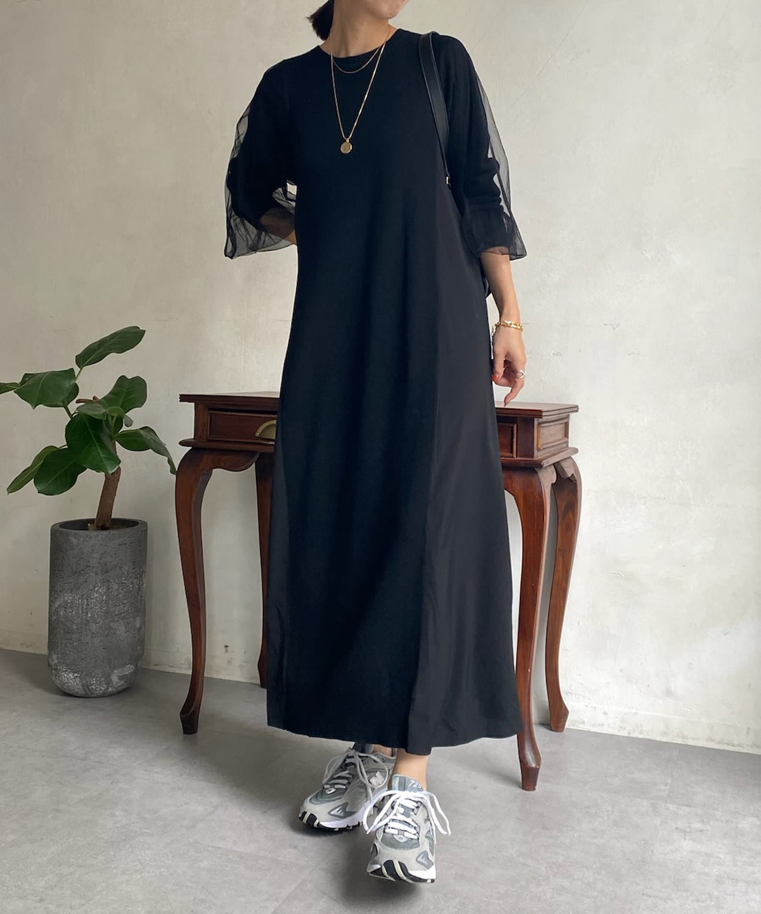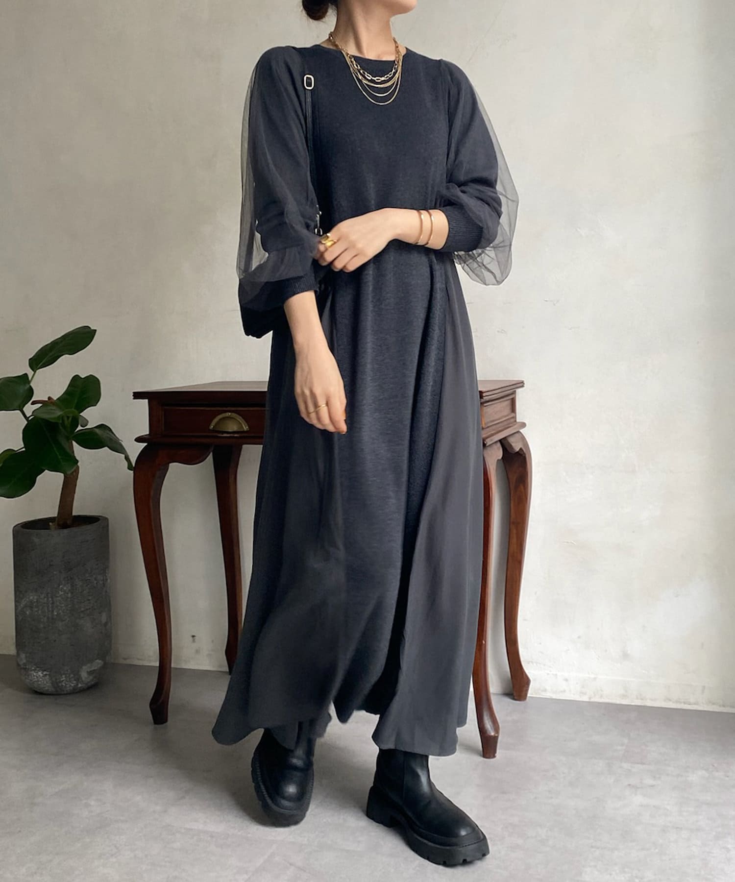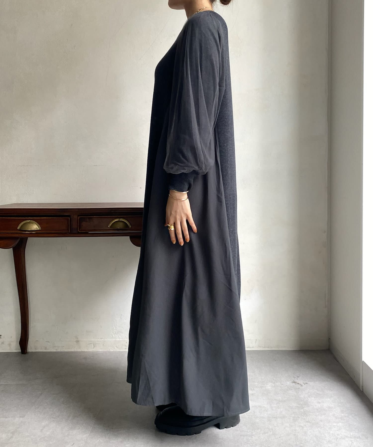 【WEB限定】袖チュール切替ニットワンピース