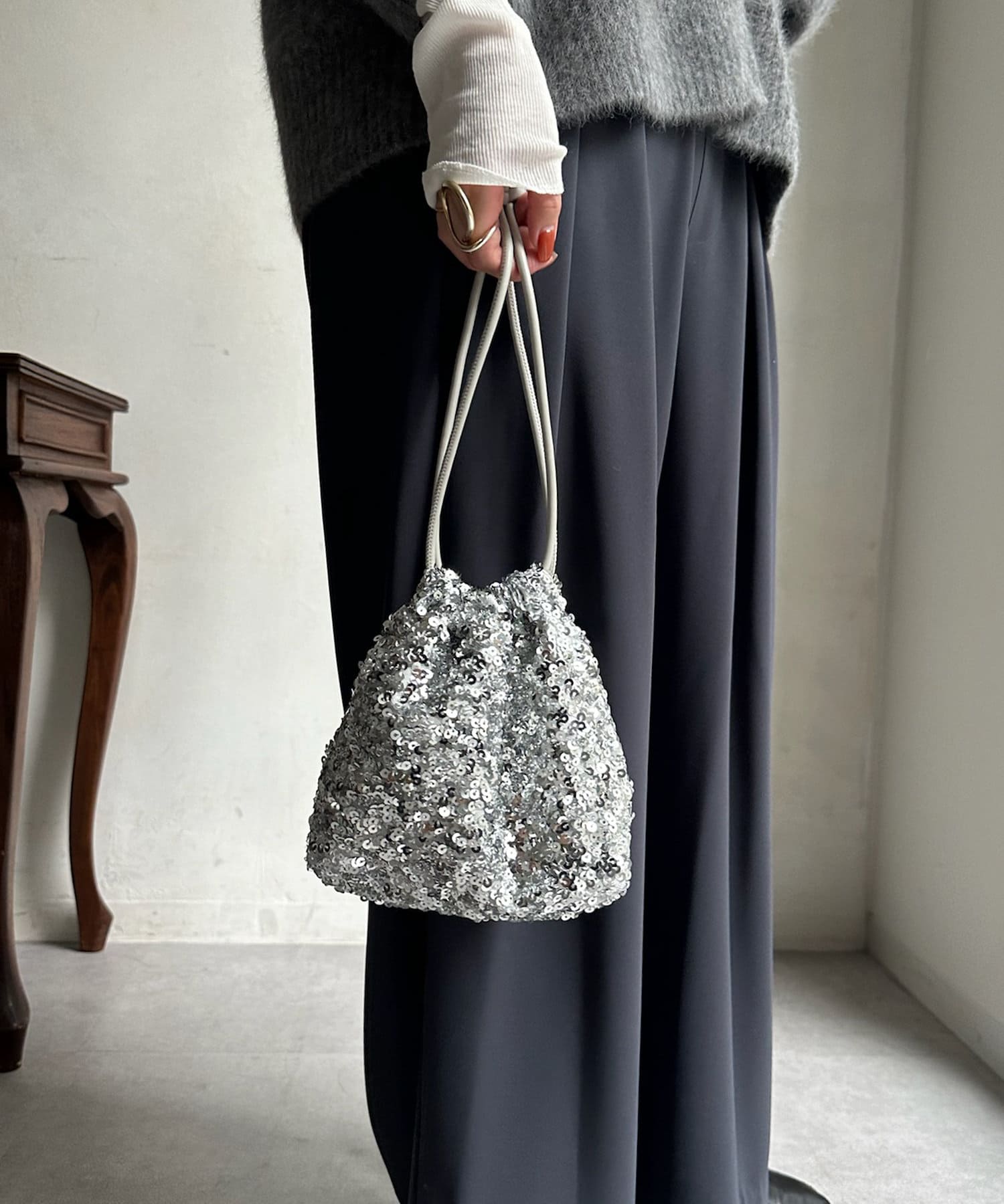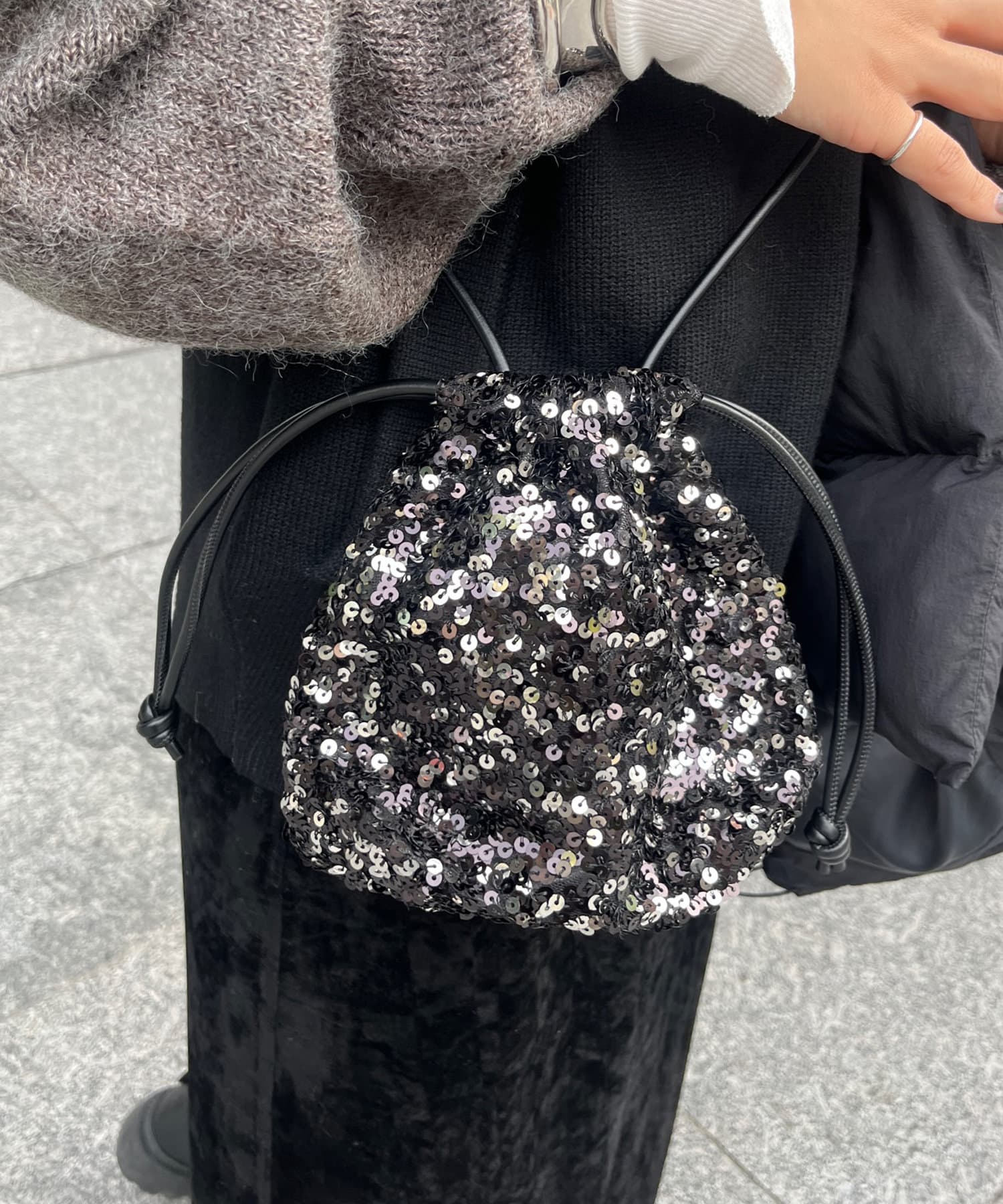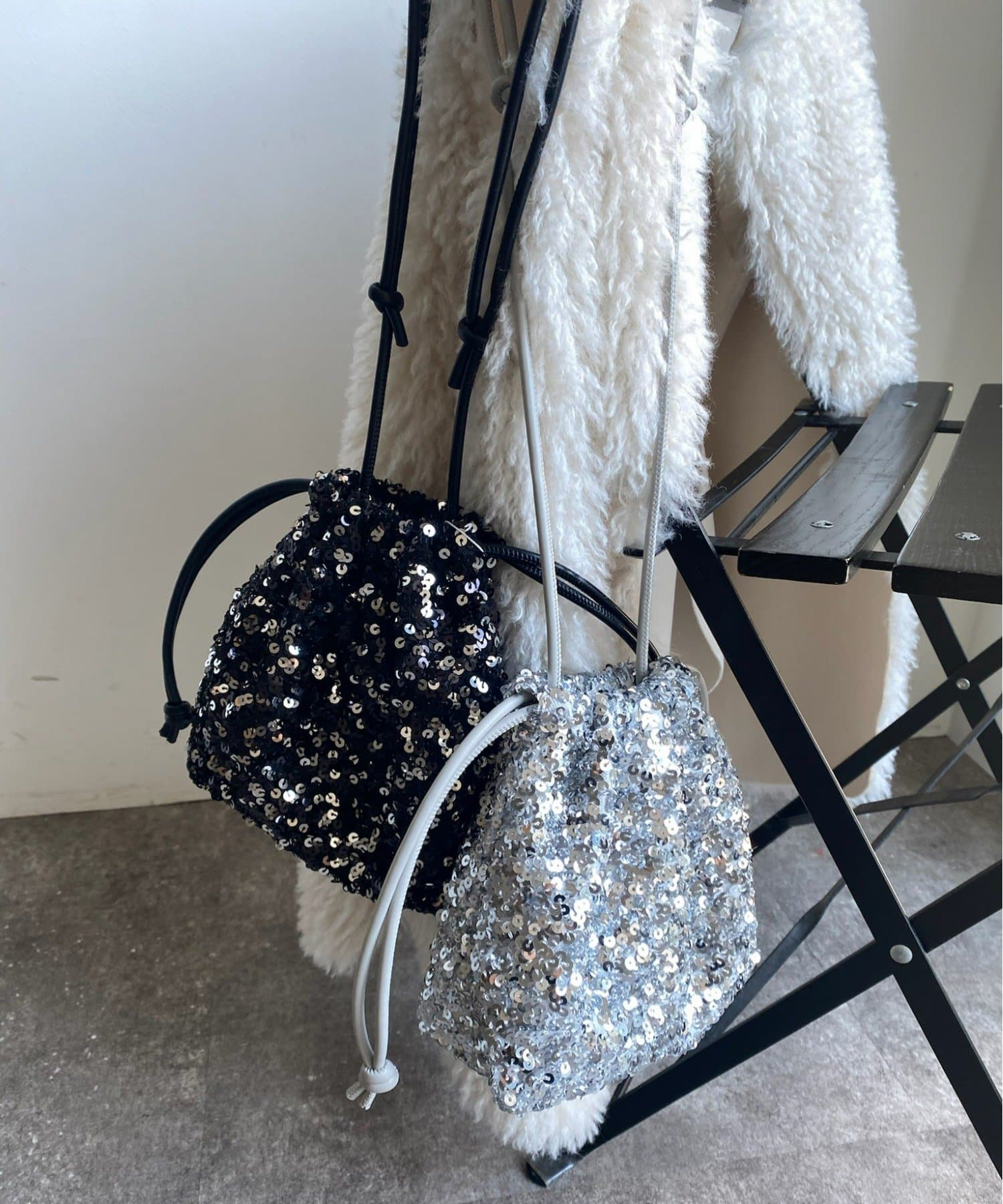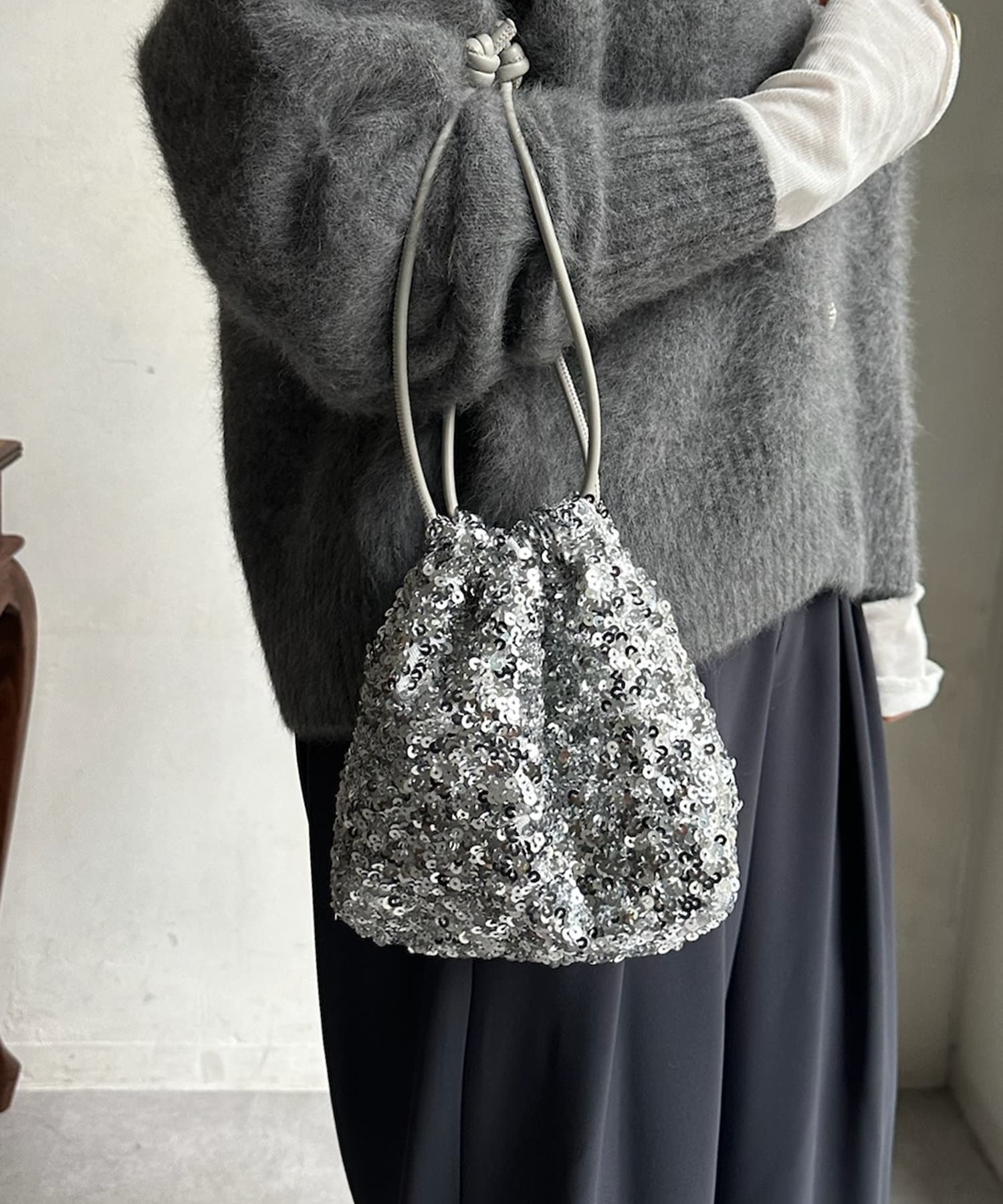 コーディネートを華やかに彩るスパンコール巾着!