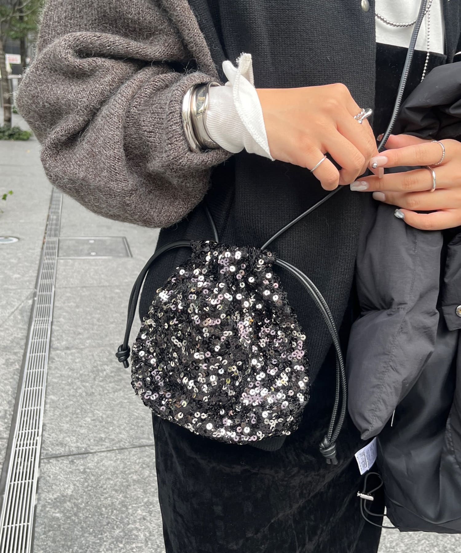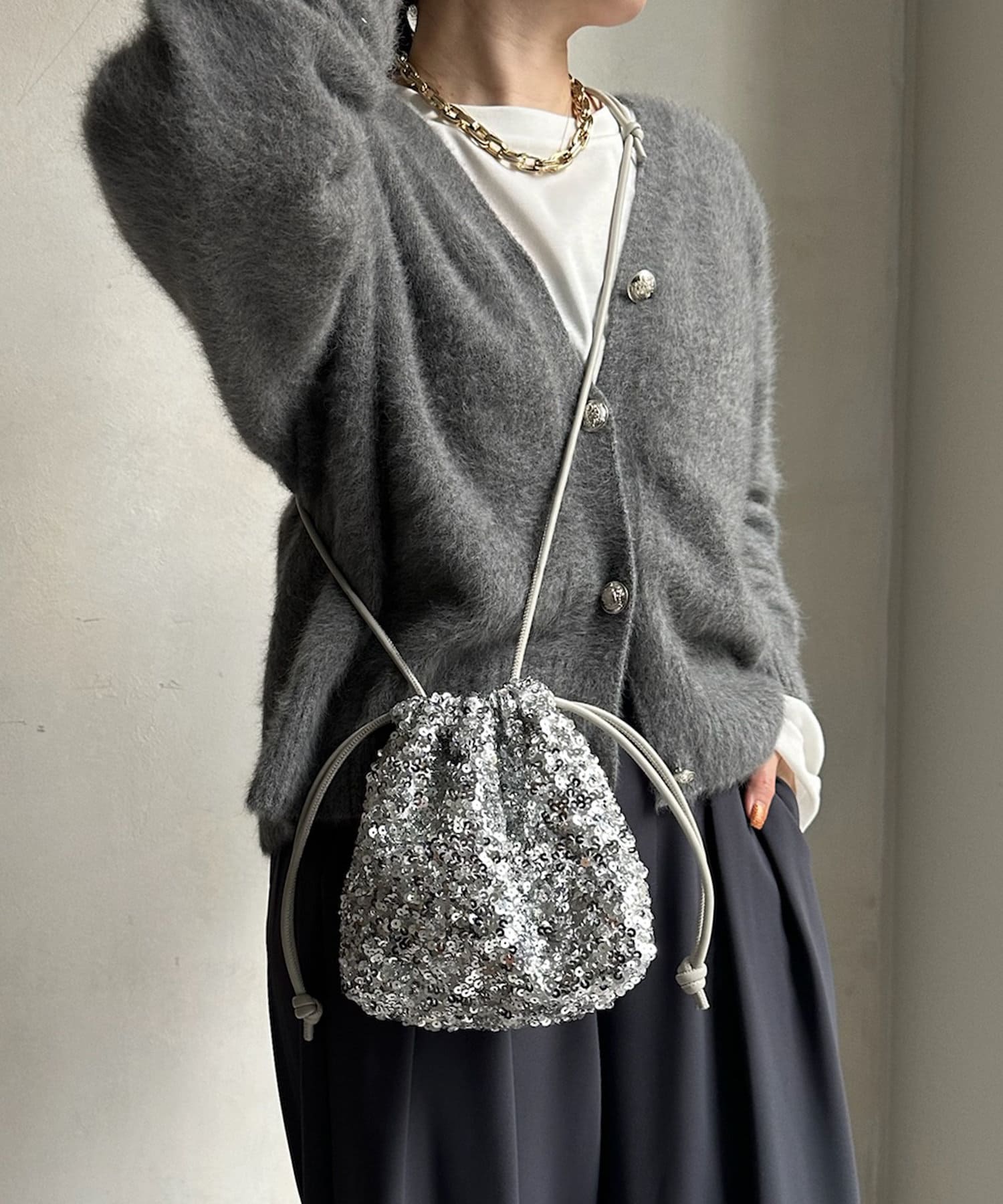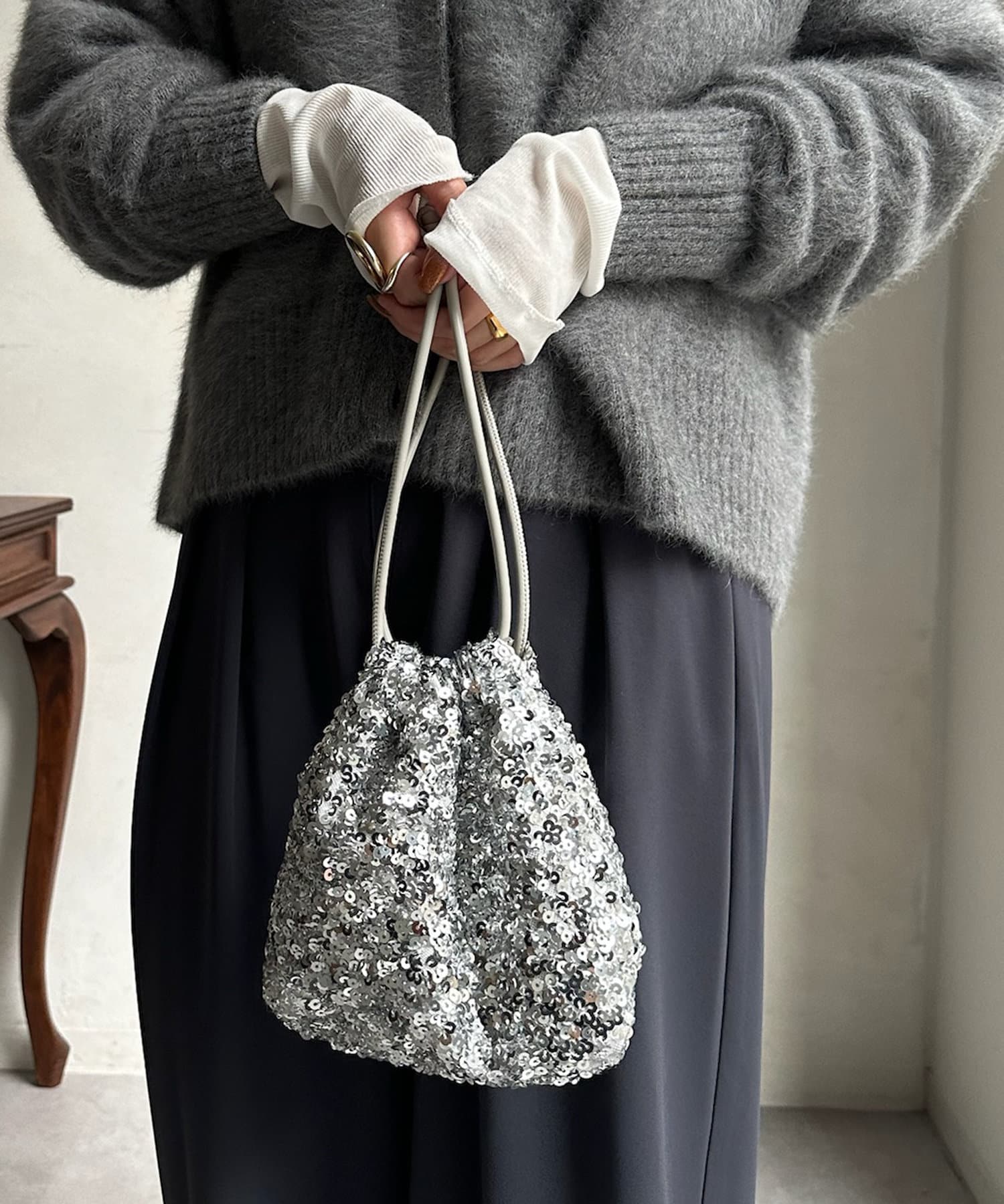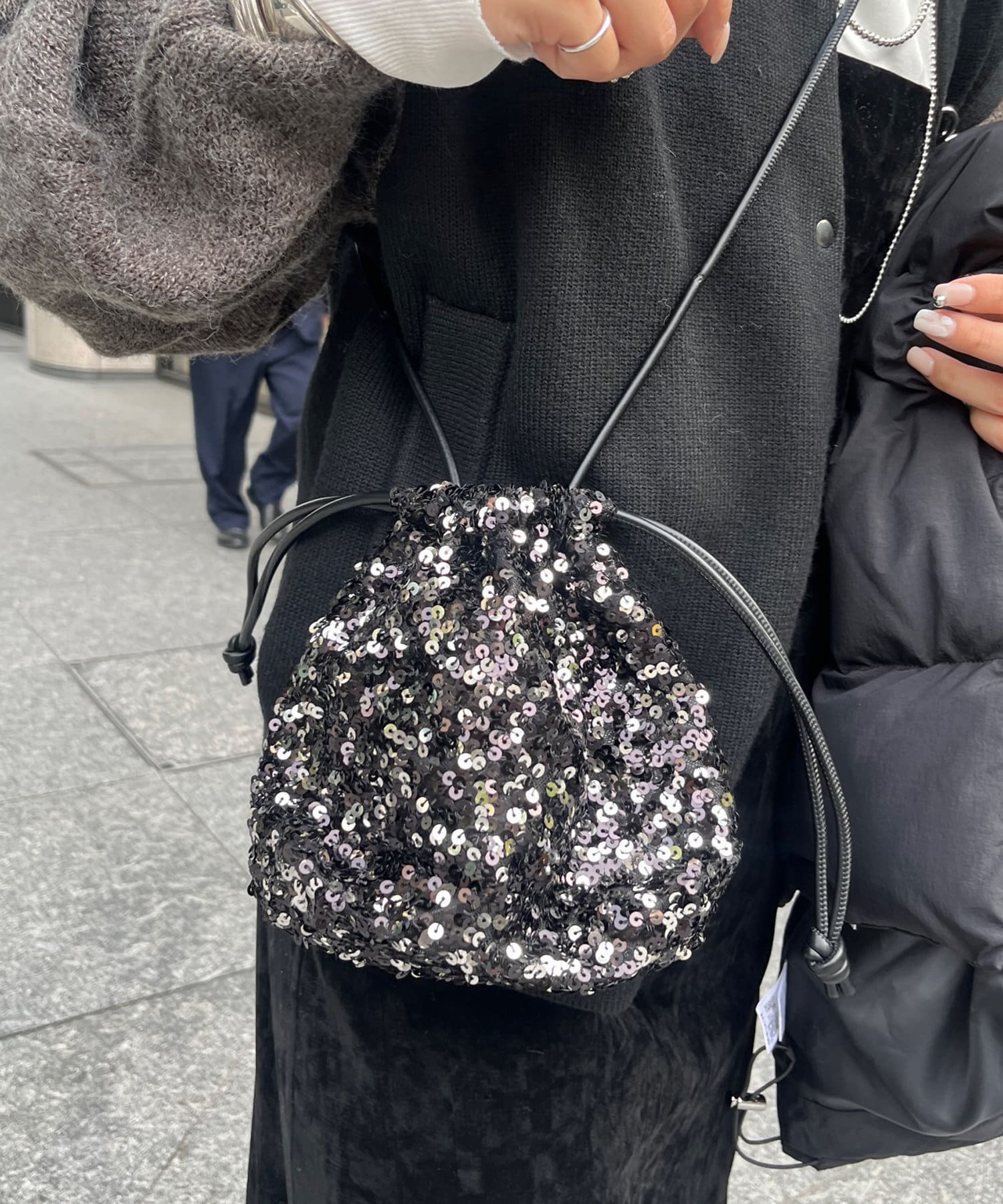 コーディネートを華やかに彩るスパンコール巾着!